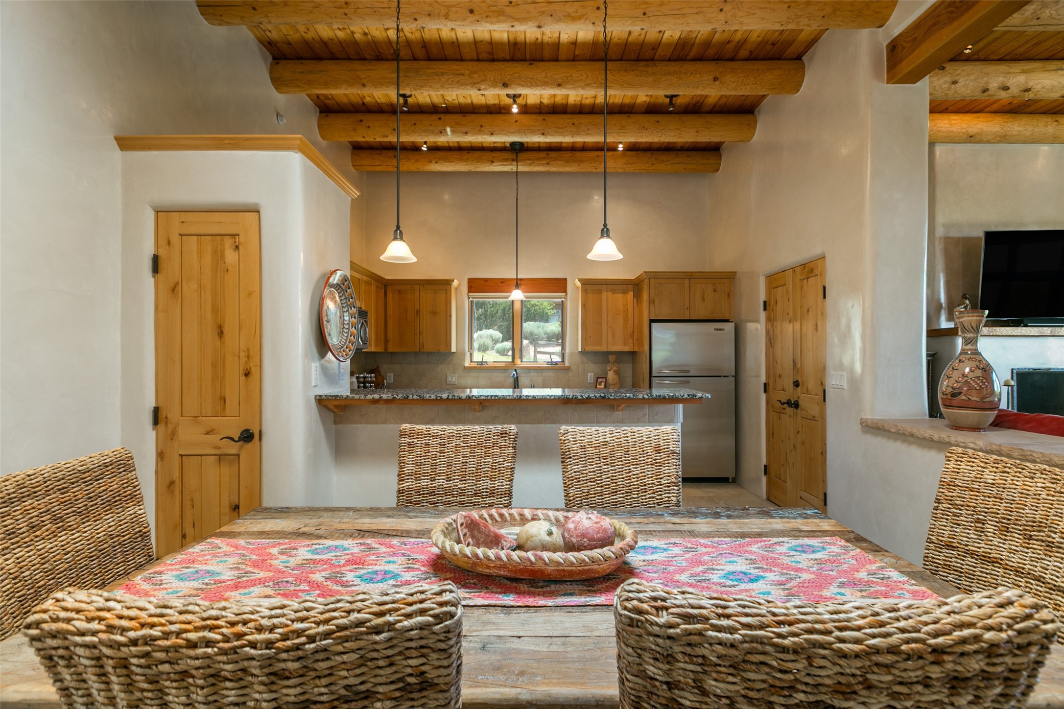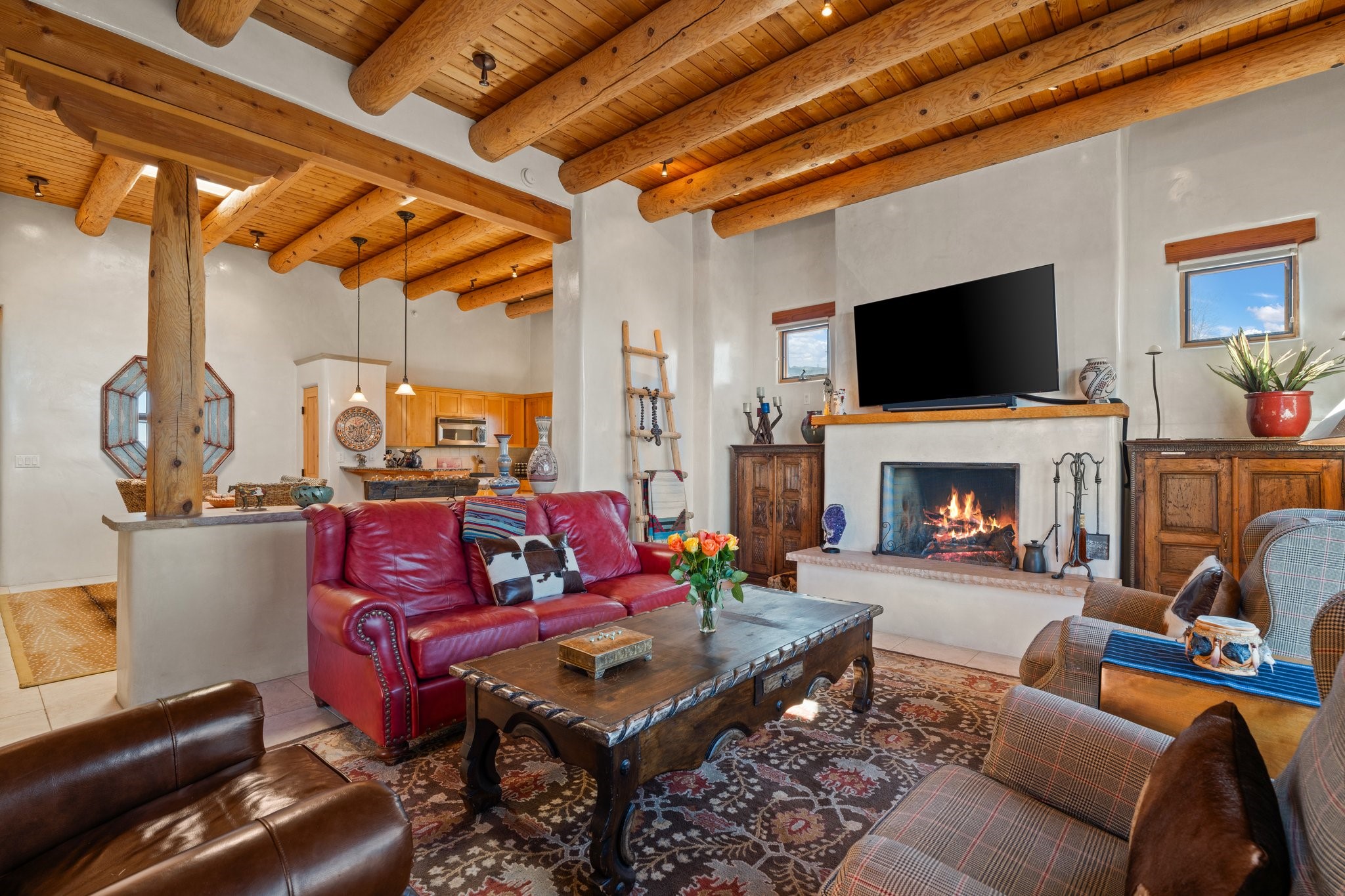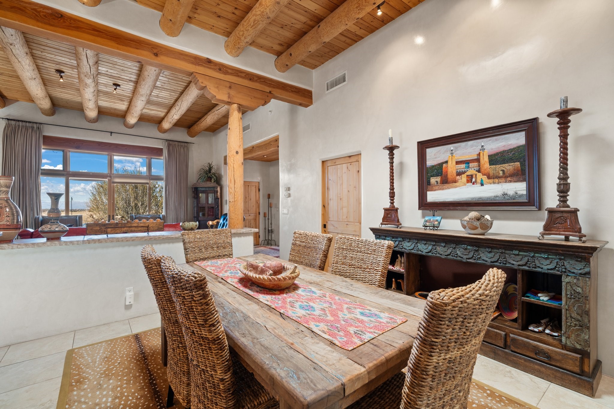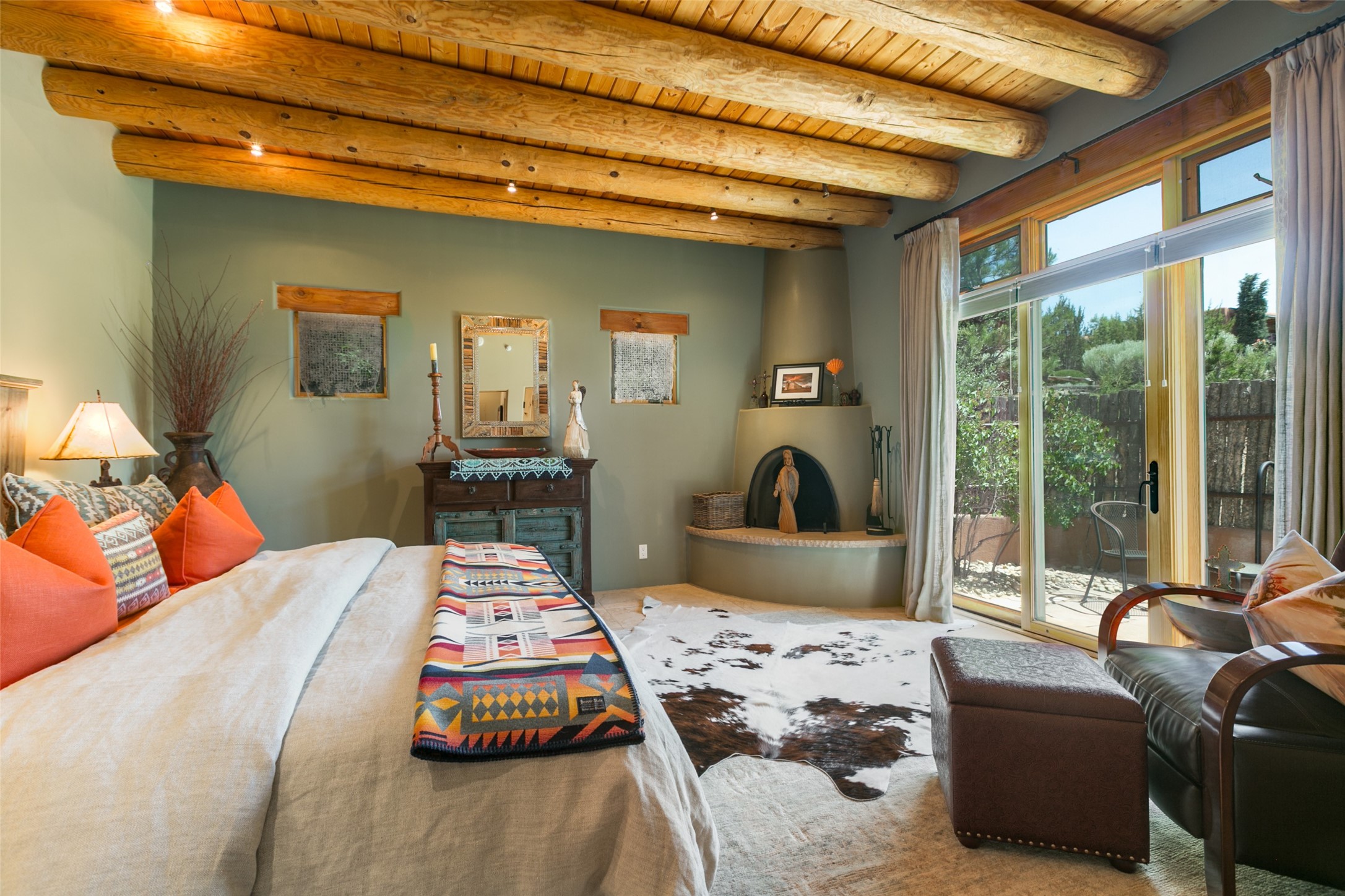 Experience breathtaking vistas of the Jemez mountains and stunning sunsets from this freestanding, 2 bedroom, 2 bath, single level villa. Just a few short minutes north of the historic Santa Fe Plaza, fine art galleries, museums, and world-class dining. Nestled at the base of the Sangre de Cristo Mountains in the exclusive Bishops Lodge Villas gated community, adjacent to the Santa Fe National Forest, offering abundant hiking, biking and walking trails and endless other four-season recreational activities. Featuring an open concept floor plan with high ceilings, traditional vigas, hand-troweled plaster walls, and central a/c, the villa includes two spacious suites, each with a kiva fireplace and private outdoor patio. One of the suites also has a steam shower and jetted tub. Meticulously maintained including new stucco and a 9-year roof warranty. Residents enjoy access to two shared villas pools and can make arrangements to utilize the unparalleled amenities of the world-renowned Bishops Lodge Resort by Auberge, making it an ideal retreat to entertain family and friends. Furnishings package is available.