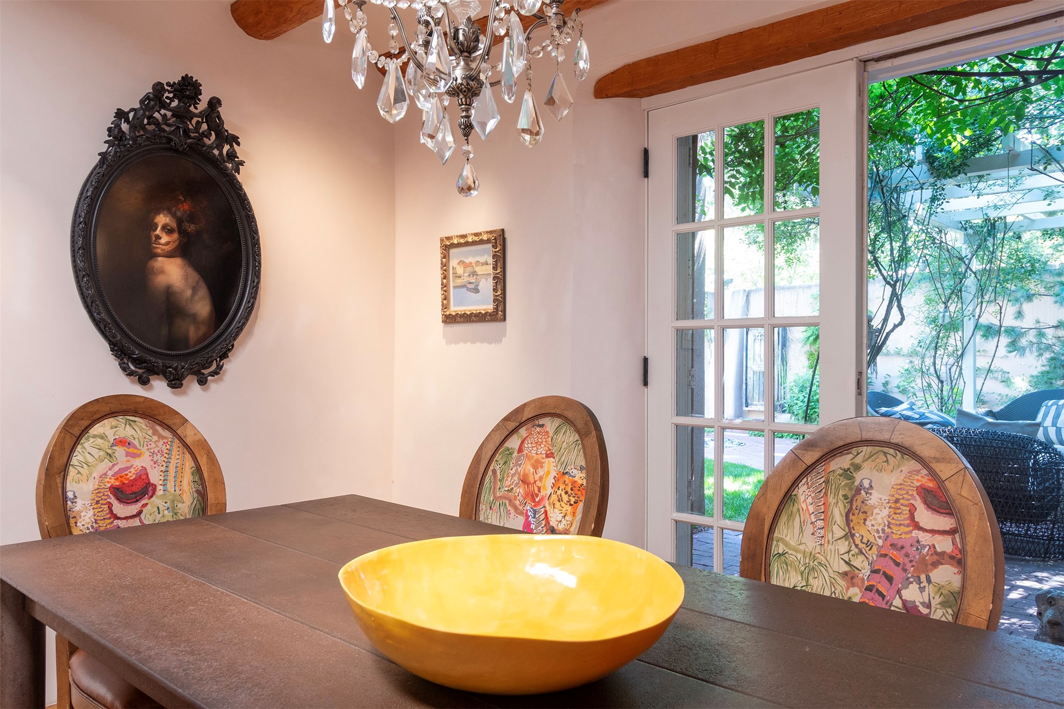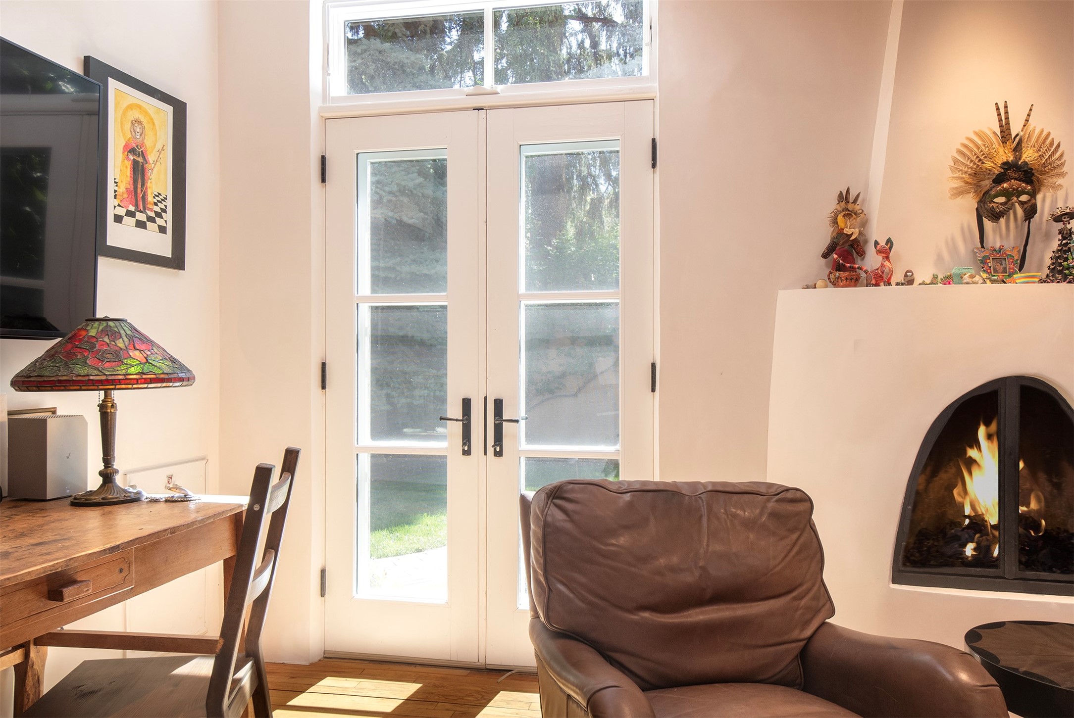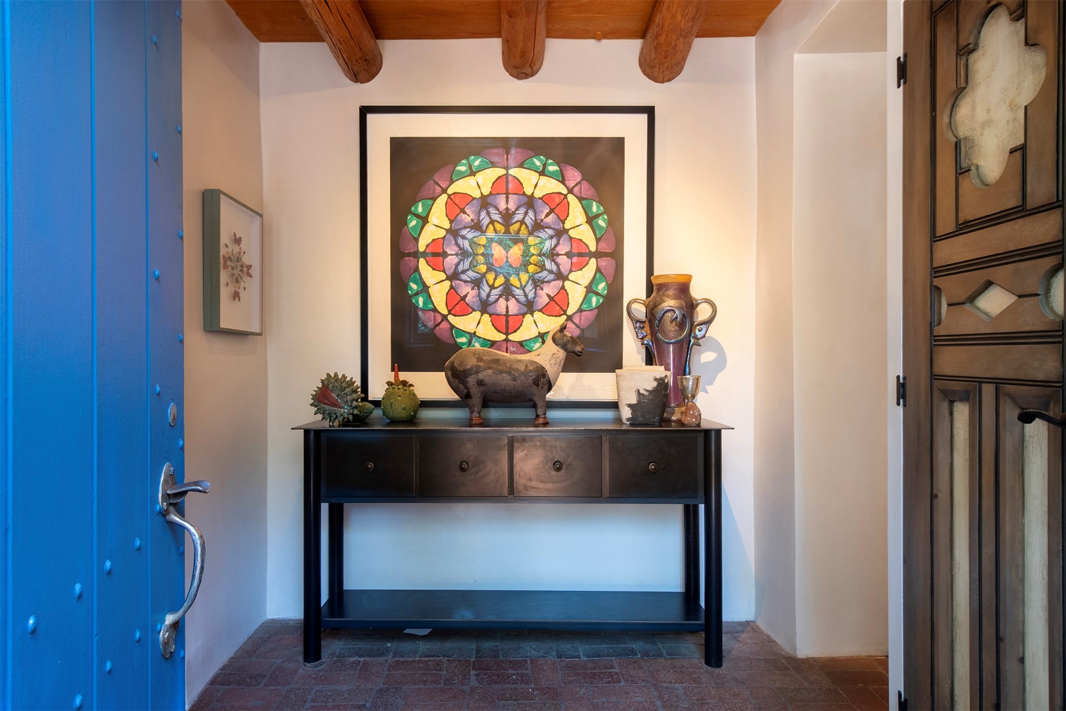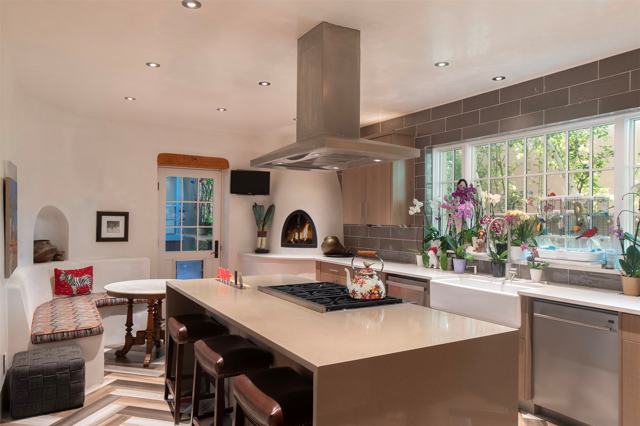 3 BED, 3 BATH ADOBE CASA W/ GUEST CASITA | 2,699 SQFT | 1 CARG | HISTORIC EASTSIDE -As Santa Fe authentic as it gets! Award winning Prull Construction & Hoopes Architects Historic 'Remodel of the Year 2015' with finishes brought to life by David Naylor Interiors. Be transported through the vine wrapped oldworld iron tacked door into a secret garden behind private adobe walls, off the famous 'Street of Souls.' Enter the welcoming foyer and into the Double Parlor with gracious Living and Drawing Rooms, featuring Vigas, Beams, Skylights, Original Restored Hardwood Floors, Diamond FinishedHard Troweled Plaster, & Solid Core Doors. Beautiful Mullion Windows & French Doors let in the bounty of the garden. This 2 Bedroom 2 Bath Adobe Home with 1 Bed, 1 Bath Guest Casita is surrounded by history, and is lovingly restored and updated for the most comfortable of pied-a-terre living.Near the Plaza, Canyon Road, and Museum Hill, and a gentle walk or ride to Kaunes, Downtown Subscription, or local shops and restaurants. The completely enclosed yard has anenchantingwrap-around garden including 2 wonderful fountains, a rose trellised pergola perfect for lounging or eating al fresco, mature landscaping with multiplevarietals, 100 year old growth trees, and lovely pathwaysand respites. The Cooks Kitchen is wonderfully appointed and boasts a Breakfast Nook & Central Island seating, Wolf Gas Range, Dual Wolf Ovens, Subzero Refrigerator, Quartzite Countertops, Solid Wood Soft Close Cabinetry, Dual Dishwashers, and a Countertop Kiva Fireplace.A Formal Dining Room enhances daily meals as well as entertaining. Chic Ancient meets Modern bathrooms are given rich character with beautiful ChocolateWalnut Travertine Tile, Petroglyphinspired inset designs, Beautiful Faux Bois Bronze Hardware, Robern Illuminating Medicine cabinets and great storage. Painted decorative Peasco Streebe doors pepper the home, amplifying the cultural richness of this classic adobe pueblo with a twist.