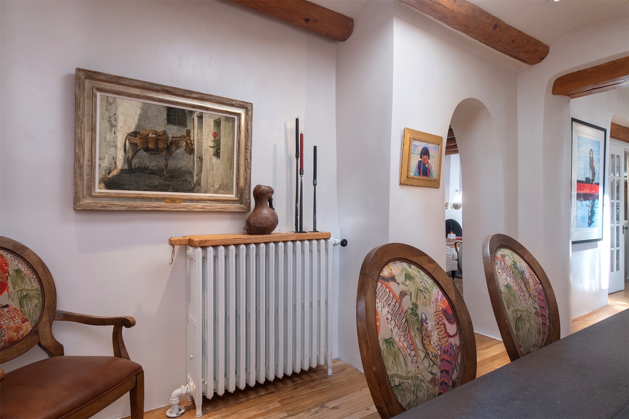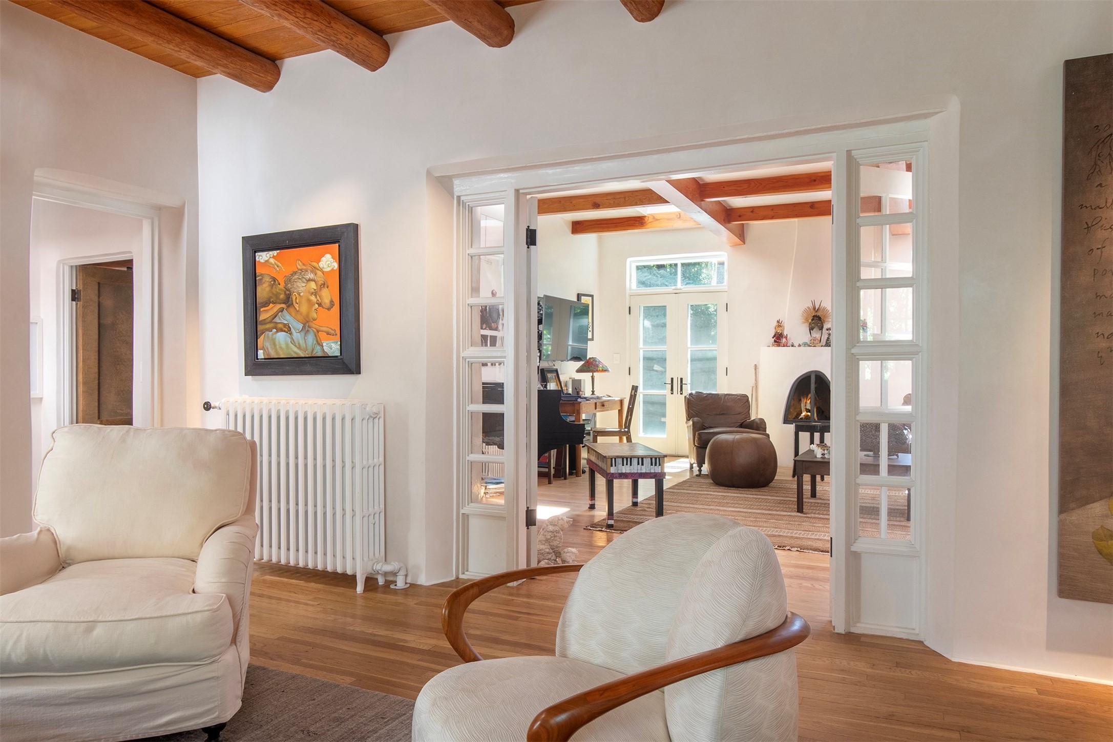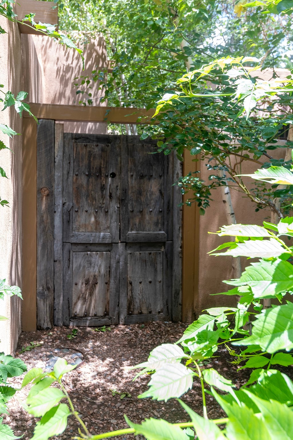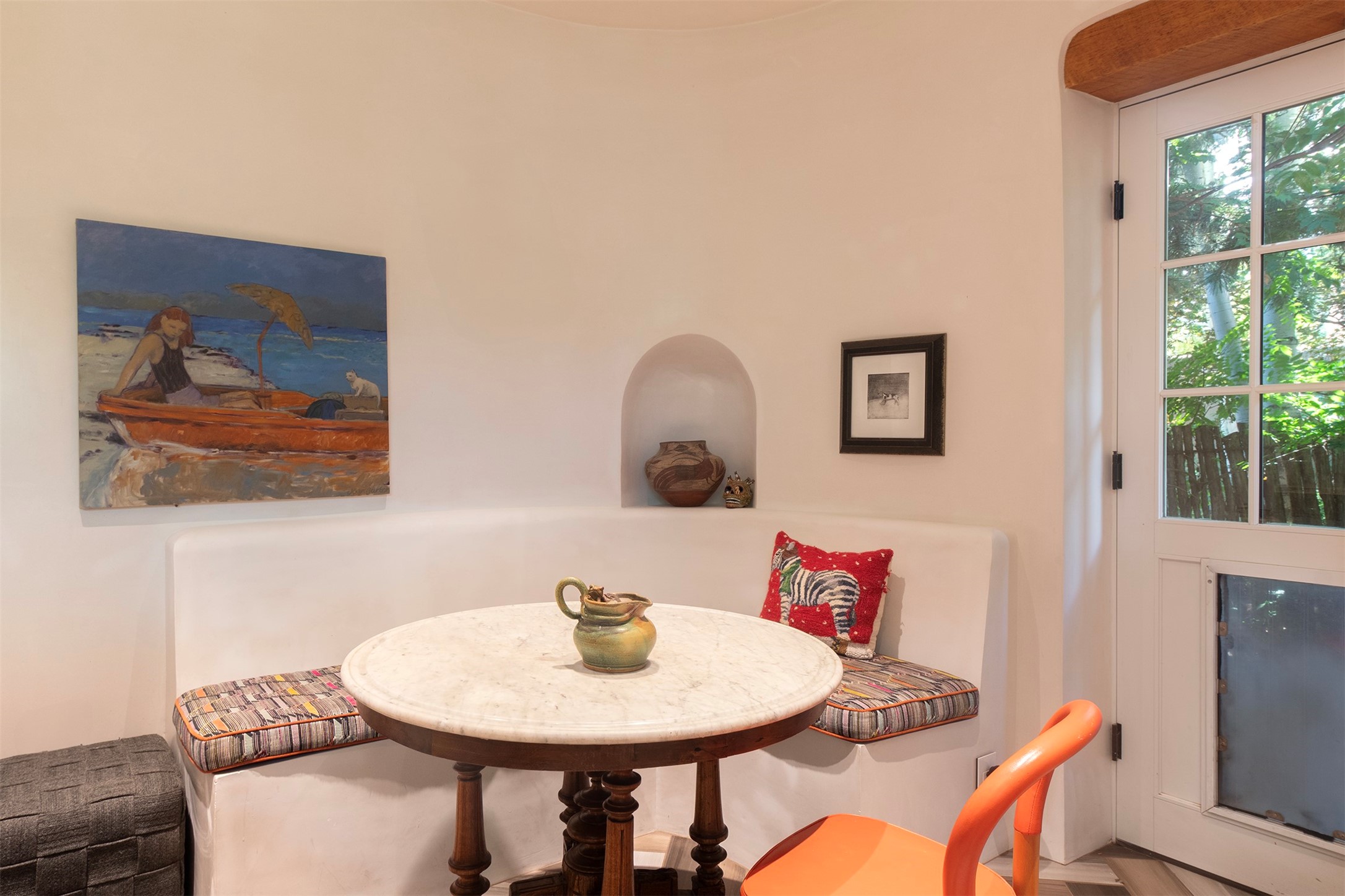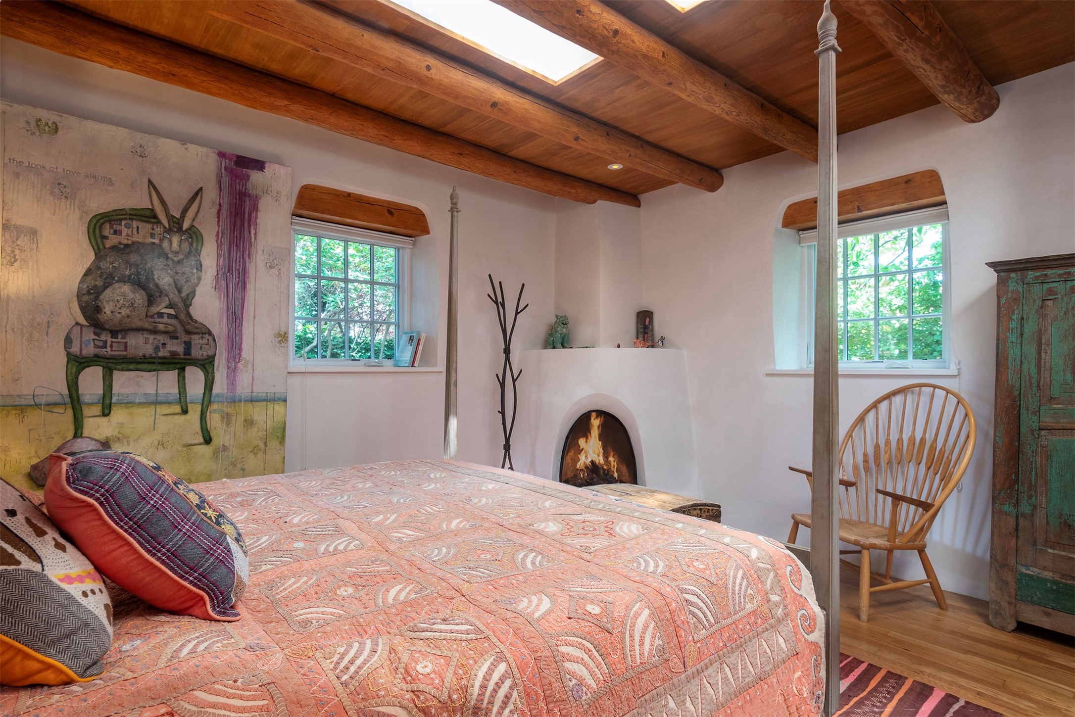 3 BED, 3 BATH ADOBE CASA W/ GUEST CASITA | 2,699 SQFT | 1 CARG | HISTORIC EASTSIDE -As Santa Fe authentic as it gets! Award winning Prull Construction & Hoopes Architects Historic 'Remodel of the Year 2015' with finishes brought to life by David Naylor Interiors. Be transported through the vine wrapped oldworld iron tacked door into a secret garden behind private adobe walls, off the famous 'Street of Souls.' Enter the welcoming foyer and into the Double Parlor with gracious Living and Drawing Rooms, featuring Vigas, Beams, Skylights, Original Restored Hardwood Floors, Diamond FinishedHard Troweled Plaster, & Solid Core Doors. Beautiful Mullion Windows & French Doors let in the bounty of the garden. This 2 Bedroom 2 Bath Adobe Home with 1 Bed, 1 Bath Guest Casita is surrounded by history, and is lovingly restored and updated for the most comfortable of pied-a-terre living.Near the Plaza, Canyon Road, and Museum Hill, and a gentle walk or ride to Kaunes, Downtown Subscription, or local shops and restaurants. The completely enclosed yard has anenchantingwrap-around garden including 2 wonderful fountains, a rose trellised pergola perfect for lounging or eating al fresco, mature landscaping with multiplevarietals, 100 year old growth trees, and lovely pathwaysand respites. The Cooks Kitchen is wonderfully appointed and boasts a Breakfast Nook & Central Island seating, Wolf Gas Range, Dual Wolf Ovens, Subzero Refrigerator, Quartzite Countertops, Solid Wood Soft Close Cabinetry, Dual Dishwashers, and a Countertop Kiva Fireplace.A Formal Dining Room enhances daily meals as well as entertaining. Chic Ancient meets Modern bathrooms are given rich character with beautiful ChocolateWalnut Travertine Tile, Petroglyphinspired inset designs, Beautiful Faux Bois Bronze Hardware, Robern Illuminating Medicine cabinets and great storage. Painted decorative Peasco Streebe doors pepper the home, amplifying the cultural richness of this classic adobe pueblo with a twist.