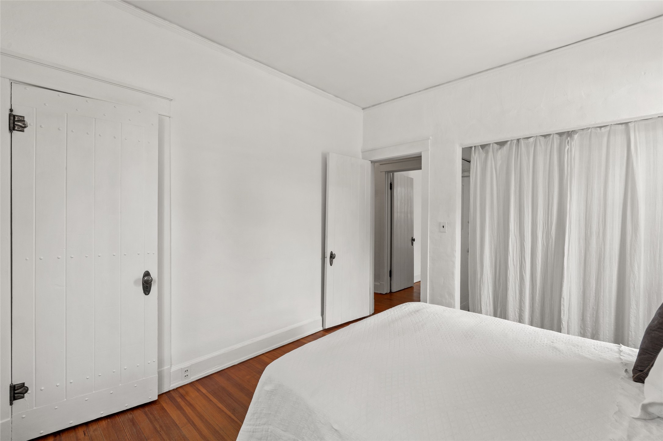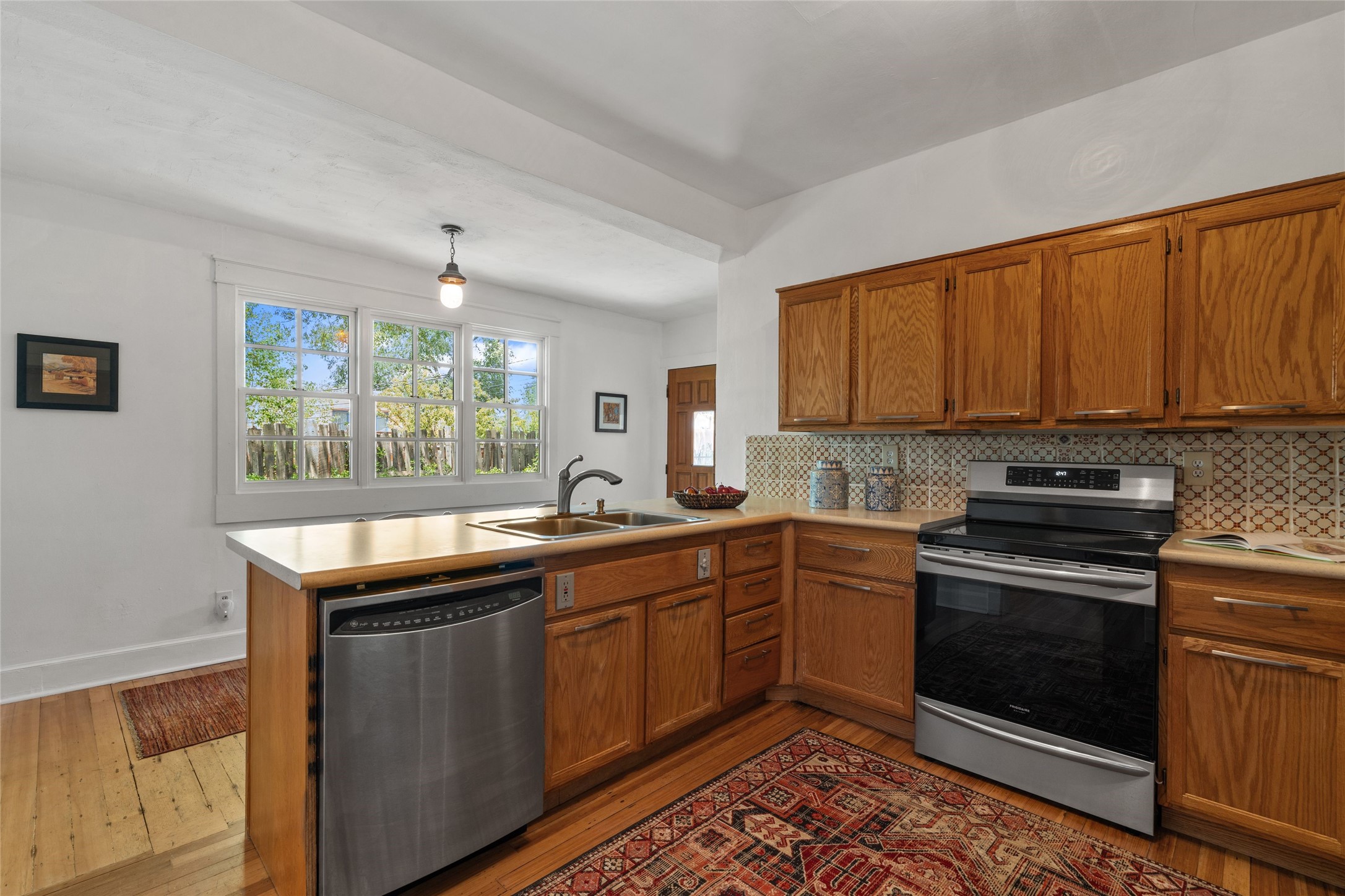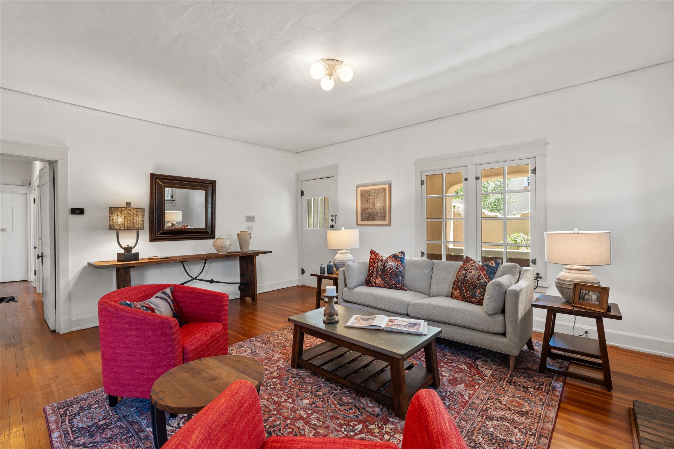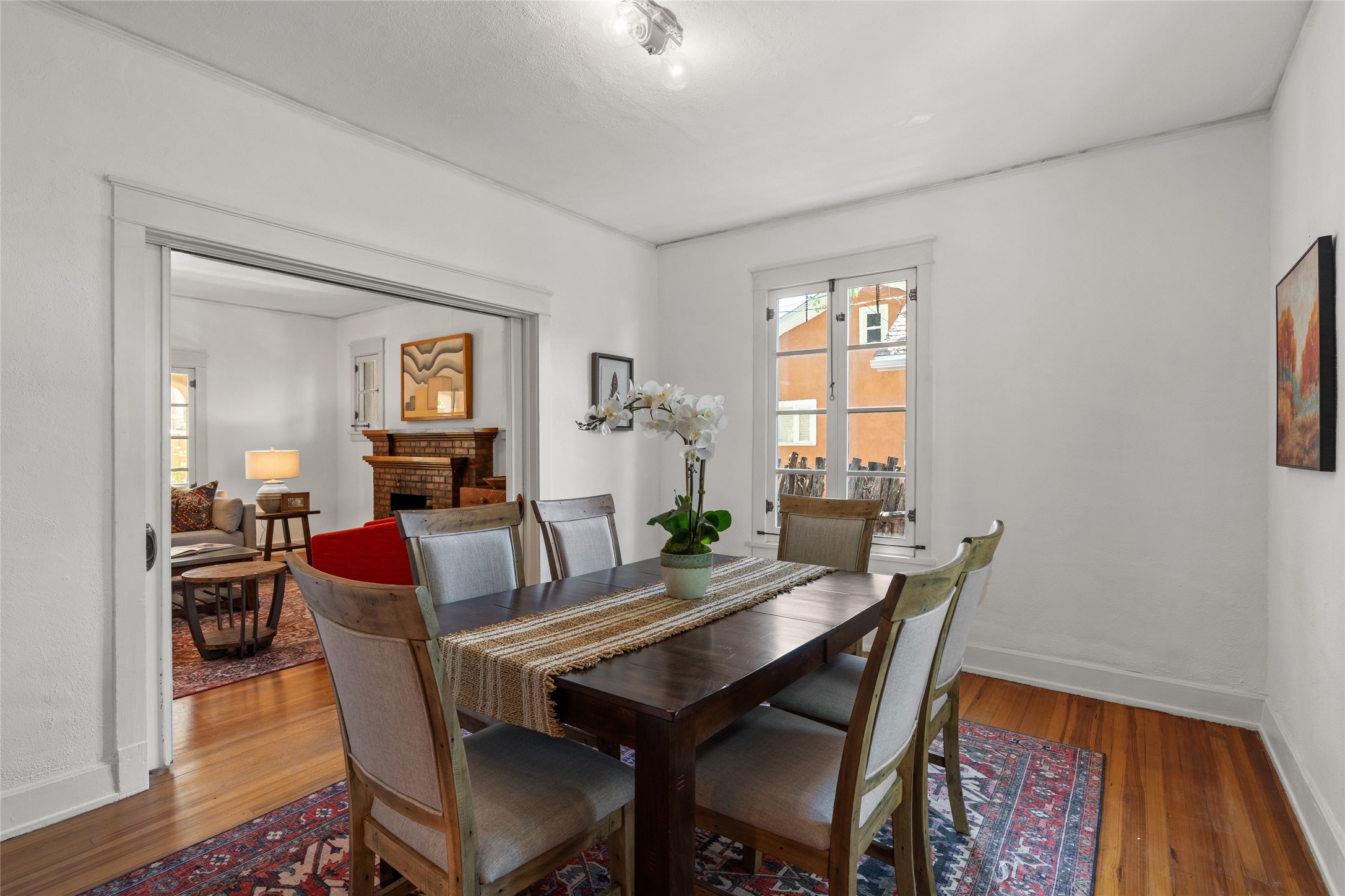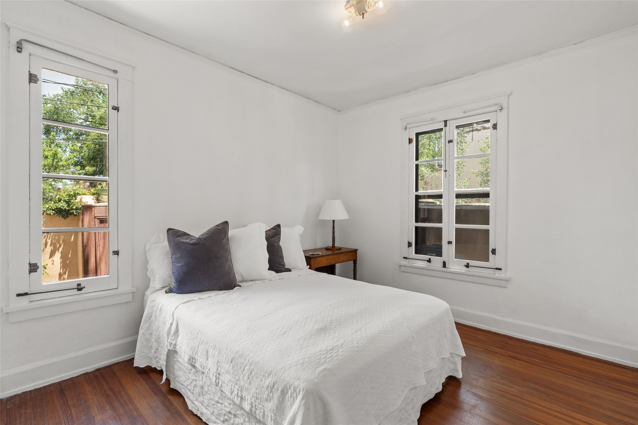 Be in the middle of it all! Iconic Santa Fe home in the Guadalupe District. A few easy blocks from the Historic Santa Fe Plaza and even closer to the Santa Fe Railyard Arts District and Farmer's Market. Seventy-five steps to the nearest coffee shop, 50 steps to the nearest restaurant. The house is light and airy with beautiful windows in every room still sporting their original 1930's brass hardware. The home has an open living and dining area with pocket doors, and a fireplace with Vermont Castings wood stove insert. The spacious kitchen looks out on the peaceful back yard and large, partially shaded redwood deck. There are two bedrooms and a large bathroom with both a shower and an elegant claw footed tub. Throughout the house there are wood floors including the kitchen and bathroom. The property is private, surrounded by a gated partial adobe wall and coyote fences with two covered off street parking spaces within the walled area. This super location is verry walkable, close to art galleries, shopping grocery stores museums, parks and access to Santa Fe's trail system--the best of Santa Fe is right out your front door from this lovely home, such a rare opportunity.