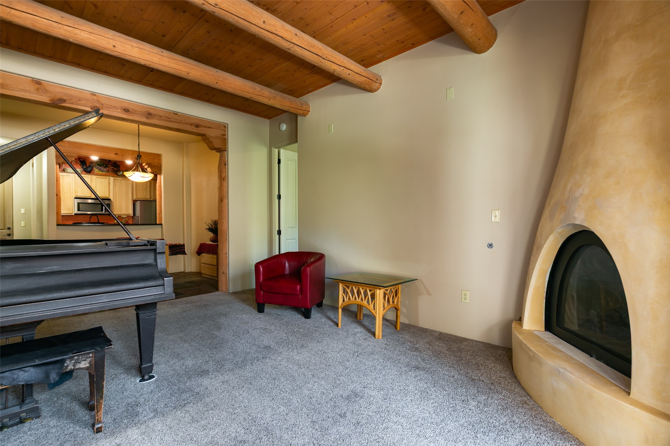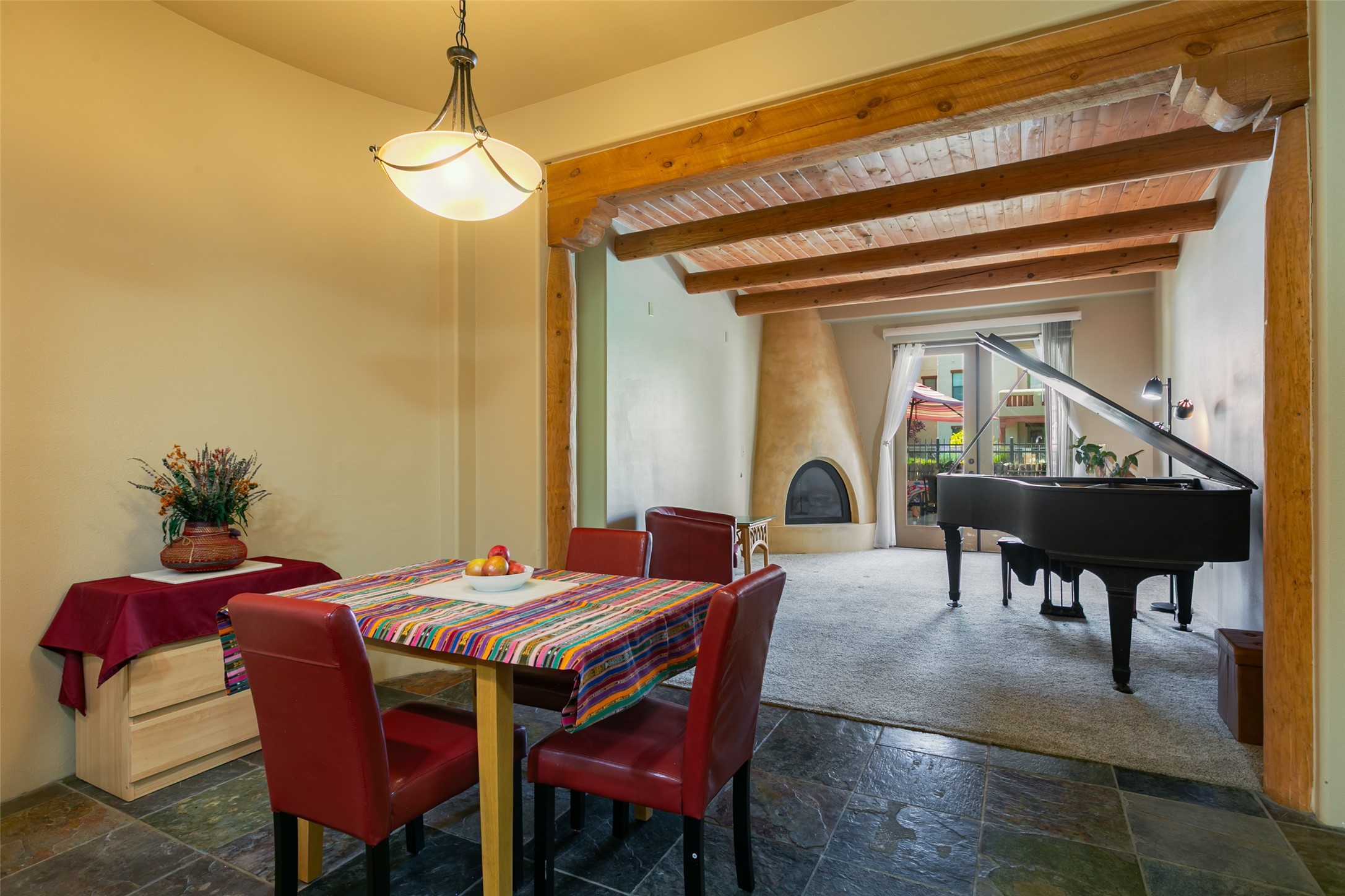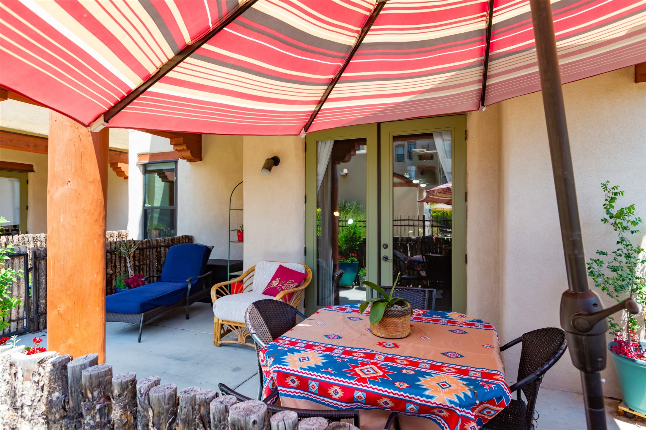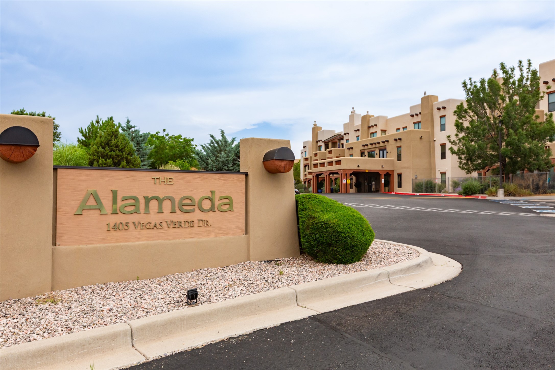 Ground Floor Gem Next to the Pool in Alameda Condos!Welcome to Santa Fe living at its finest in this stunning ground-floor condo in the sought-after Alameda Condominiums perfectly situated right next to the pool and overlooking beautifully maintained lush grounds.This spacious 2 bedroom, 2 bath unit is one of the largest in the community and blends luxury with classic Santa Fe charm. Inside, you'll find soaring ceilings, traditional vigas, a cozy kiva fireplace, and slate flooring. The gourmet kitchen and baths are appointed with granite countertops, and the luxurious primary suite boasts a spa like bath, huge walk-in closet, and private access to the covered portal patio ideal for enjoying the peaceful outdoor setting.Additional feature include in-unit washer/dryer that reflects pride of ownership from its owner.The gated Alameda complex offers premier amenities including an outdoor pool, fitness center, two elegant community living rooms with full kitchens, a conference room, and on-site management all within a secured building. Enjoy direct access to the Arroyo Chamisa trail for hiking or biking, and a prime central location just minutes from shopping, dining, entertainment, and I-25. This is resort-style living in the heart of Santa Fe.