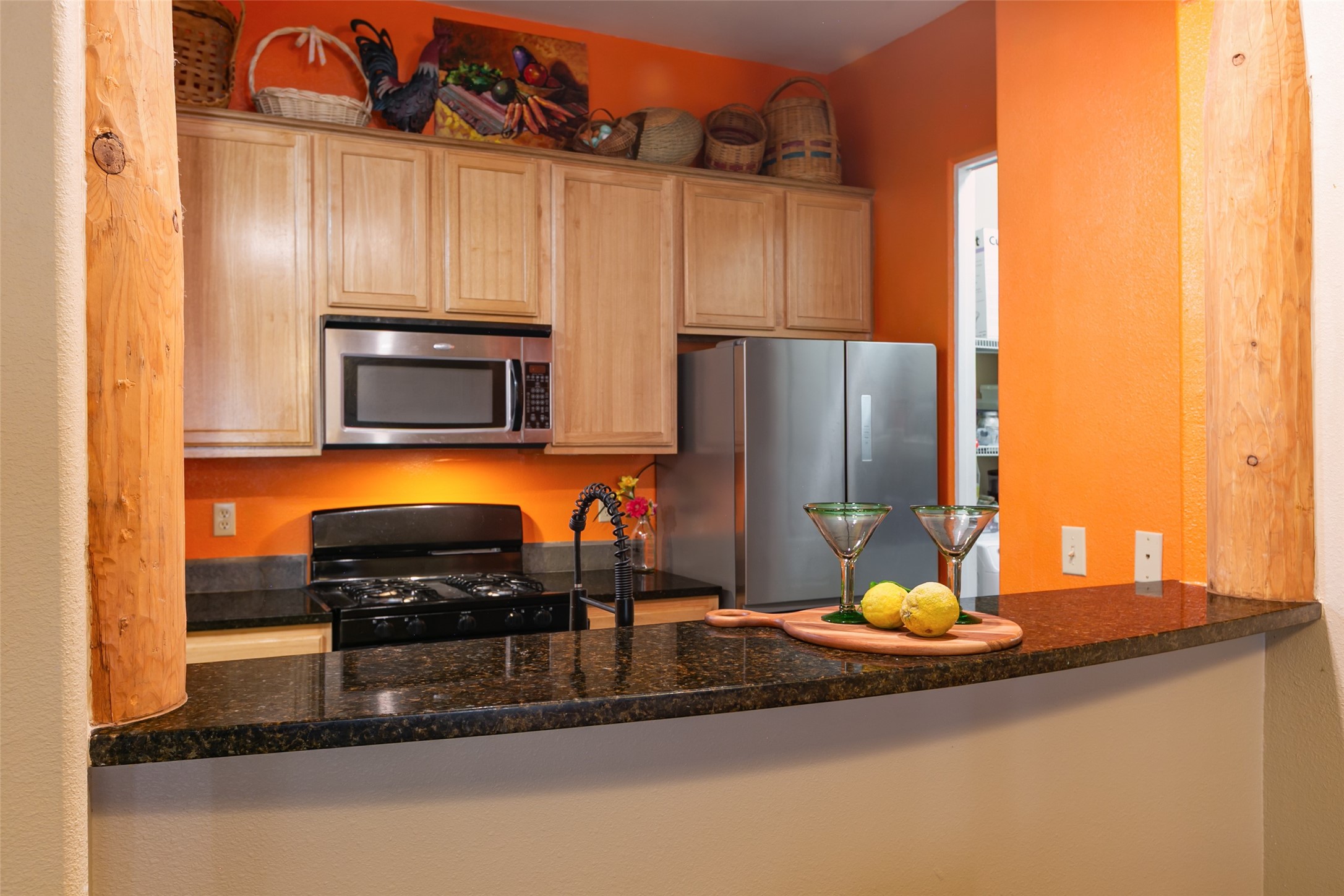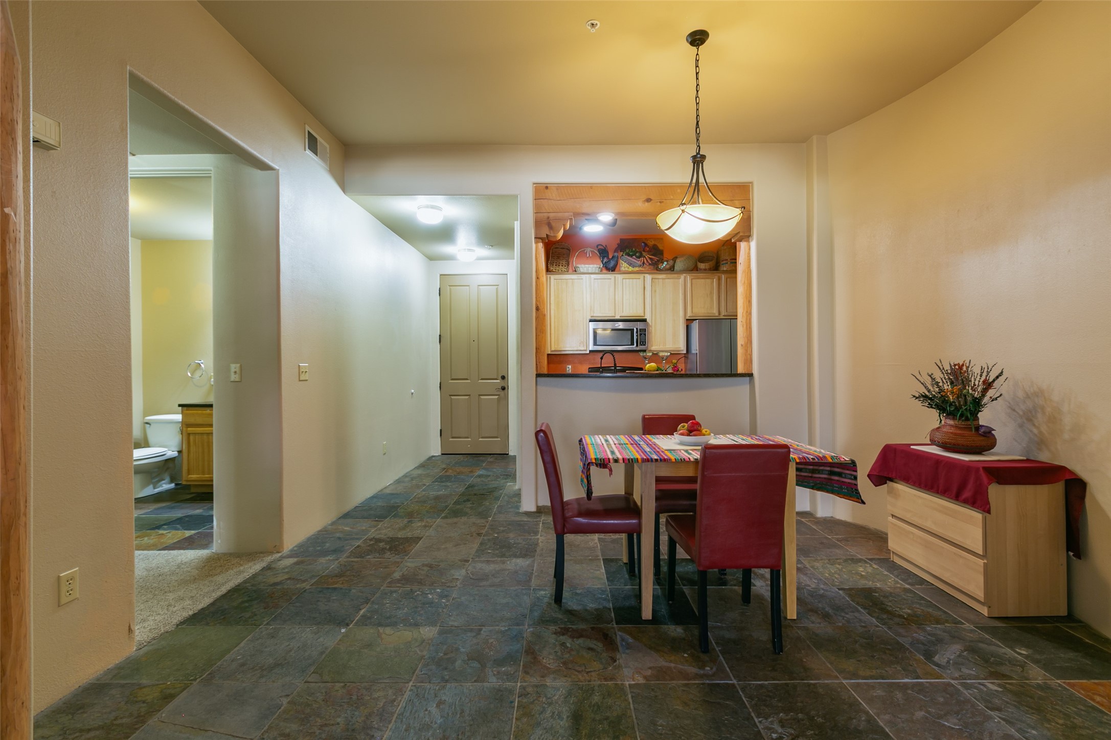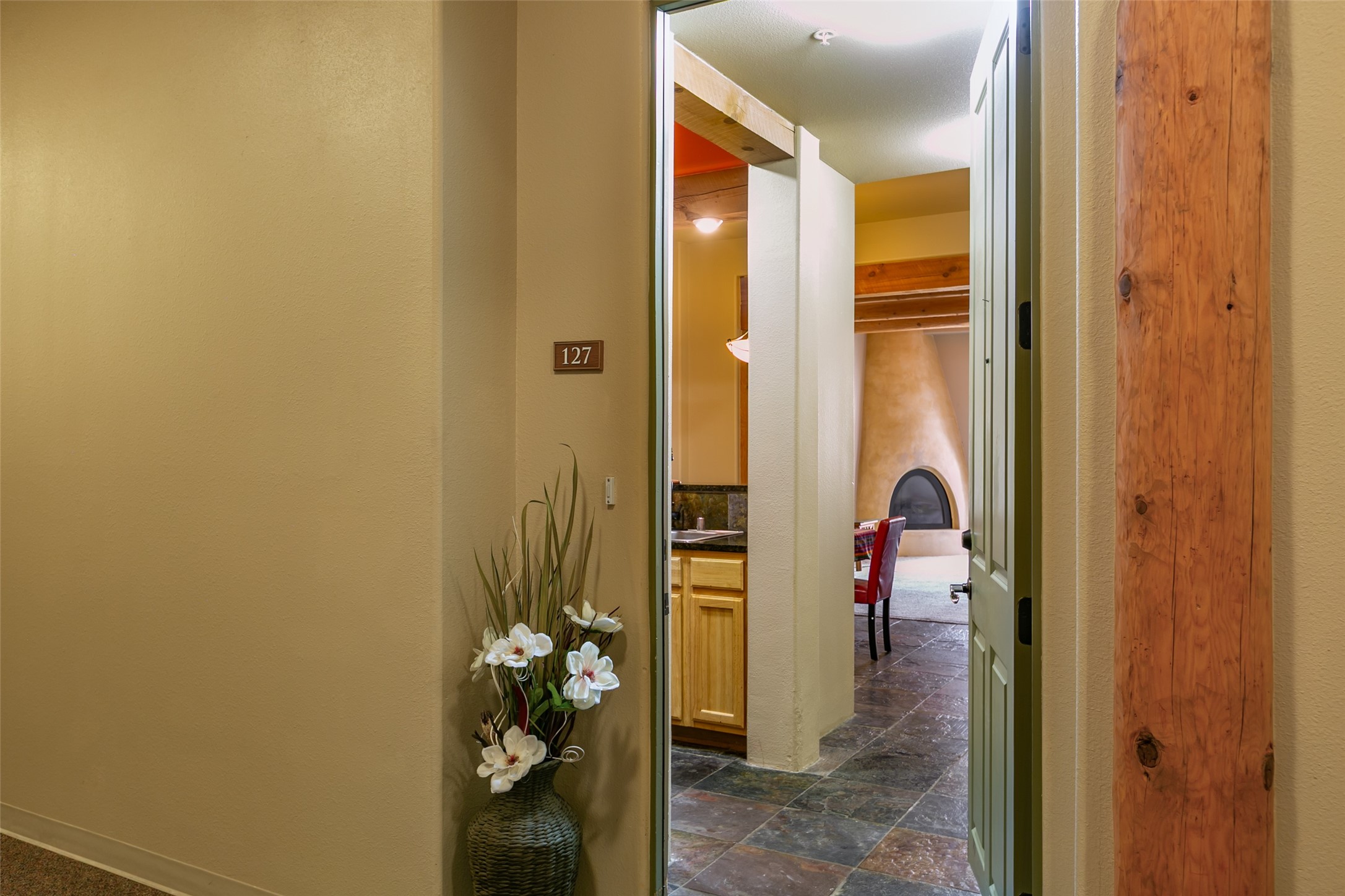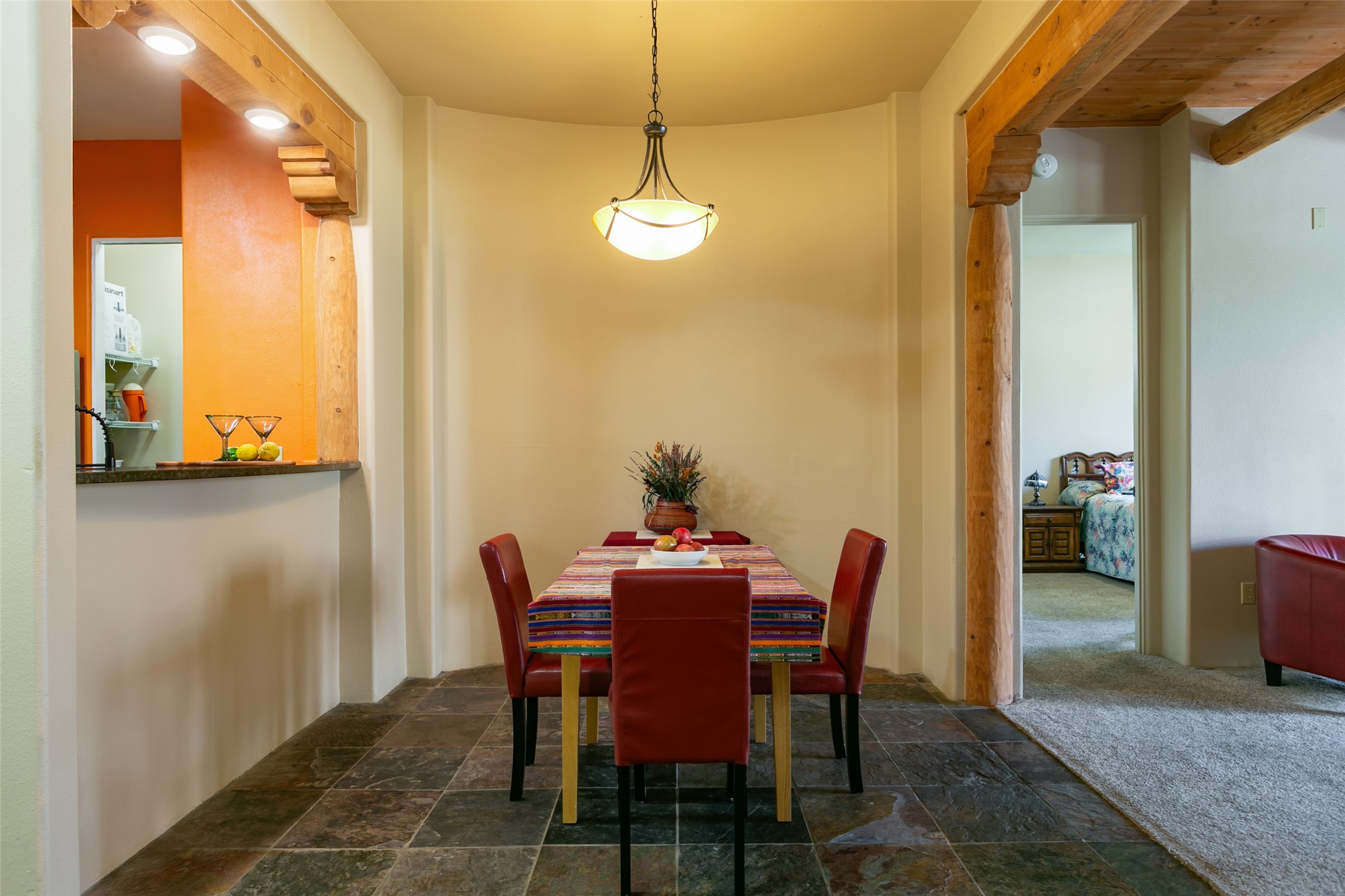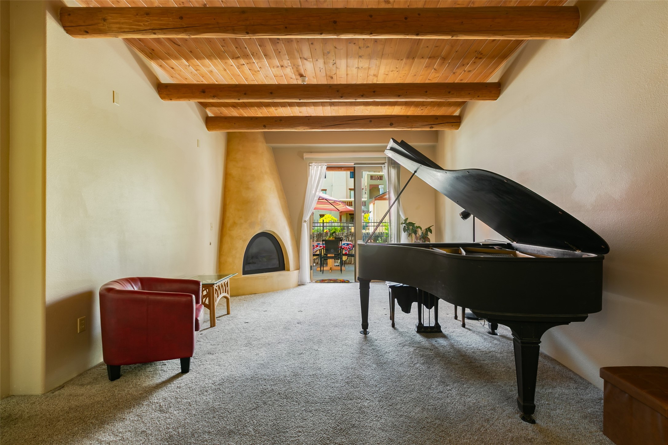 Ground Floor Gem Next to the Pool in Alameda Condos!Welcome to Santa Fe living at its finest in this stunning ground-floor condo in the sought-after Alameda Condominiums perfectly situated right next to the pool and overlooking beautifully maintained lush grounds.This spacious 2 bedroom, 2 bath unit is one of the largest in the community and blends luxury with classic Santa Fe charm. Inside, you'll find soaring ceilings, traditional vigas, a cozy kiva fireplace, and slate flooring. The gourmet kitchen and baths are appointed with granite countertops, and the luxurious primary suite boasts a spa like bath, huge walk-in closet, and private access to the covered portal patio ideal for enjoying the peaceful outdoor setting.Additional feature include in-unit washer/dryer that reflects pride of ownership from its owner.The gated Alameda complex offers premier amenities including an outdoor pool, fitness center, two elegant community living rooms with full kitchens, a conference room, and on-site management all within a secured building. Enjoy direct access to the Arroyo Chamisa trail for hiking or biking, and a prime central location just minutes from shopping, dining, entertainment, and I-25. This is resort-style living in the heart of Santa Fe.