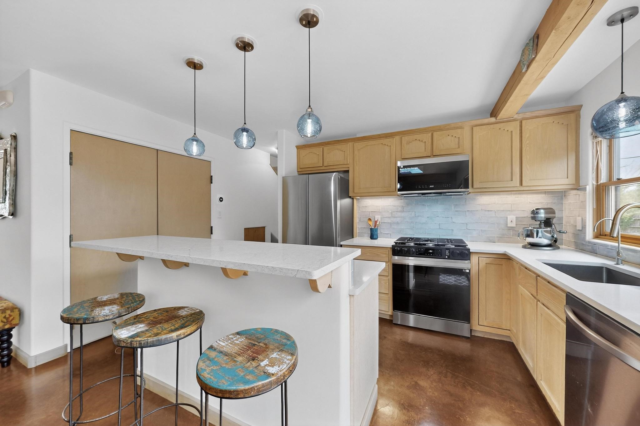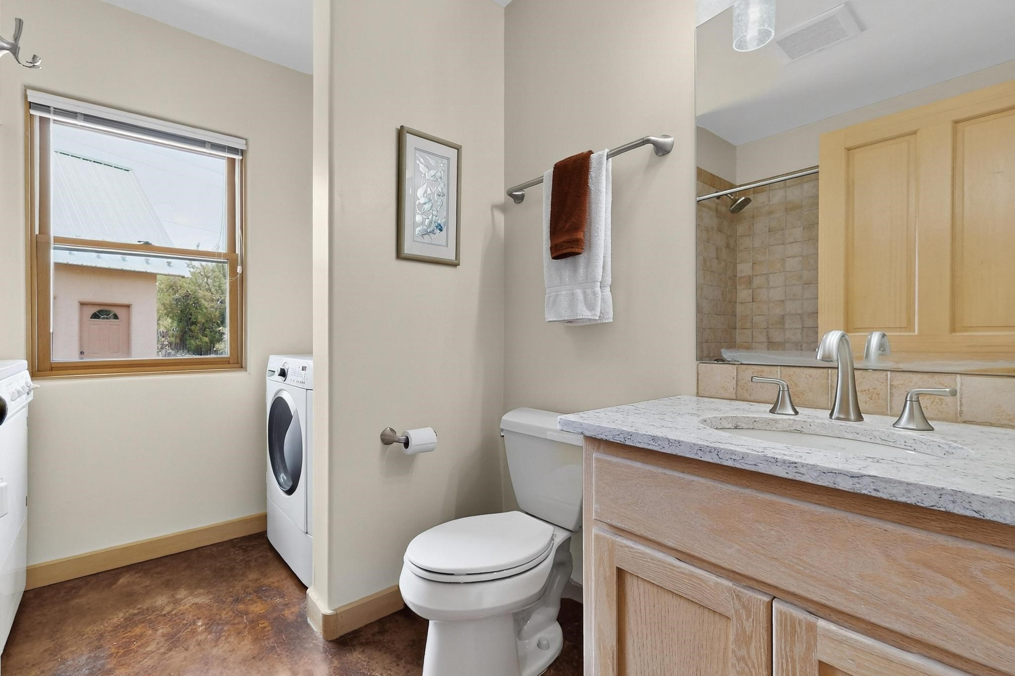 Smartly updated, Northern New Mexico Style, passive solar home. First Energy Starhome in New Mexico featuring high quality construction and outstanding efficiency!Inside you will find stained concrete radiant floors, new high-quality carpet upstairs andan abundance of beautiful natural light throughout the home. Tasteful finishes havebeen newly added to the kitchen and baths including new quartz countertops, sinks,matching faucets, lighting accents as well as brand new Wi-Fi ready Samsung StainlessSteel appliances. Other recent updates include a Lutron wireless automated lightingsystem, new smart smoke/CO detectors and thermostats, Moen Flow water leakdetection system and a filtered drinking water system. Feel at ease with brand newradiant heat boiler and control system as well as new domestic hot water heater. Thehome enjoys lovely Sangre de Cristo Mountain views from the primary upstairsbedroom with walk in closet. Outside you will find copious parking for guests and toys.The extensive low maintenance landscaping surrounding the property brings a pastoralfeeling with blue grama, Aspen trees and flowers amongst artful custom stone walls allautomatically watered with a Wi-Fi controlled irrigation and drip system. The detached580 sq/ft heated, insulated and finished garage could easily serve as an excellentworkshop, studio, or guest house. The garage also boasts a full, equally sized attic forextra storage or the option to finish. This would be a great location for the LANL commuter or someone looking for an ultra-convenient location just minutes from Plaza, the Railyard, and the Montanita Co-op. Enjoy a very short walk to the river trail, Frank Ortiz dog park and city open space trails, or a quick mountain bike ride from this hometo La Tierra trails and more. This home offers easy connection to all that Santa Fe has to offer!
