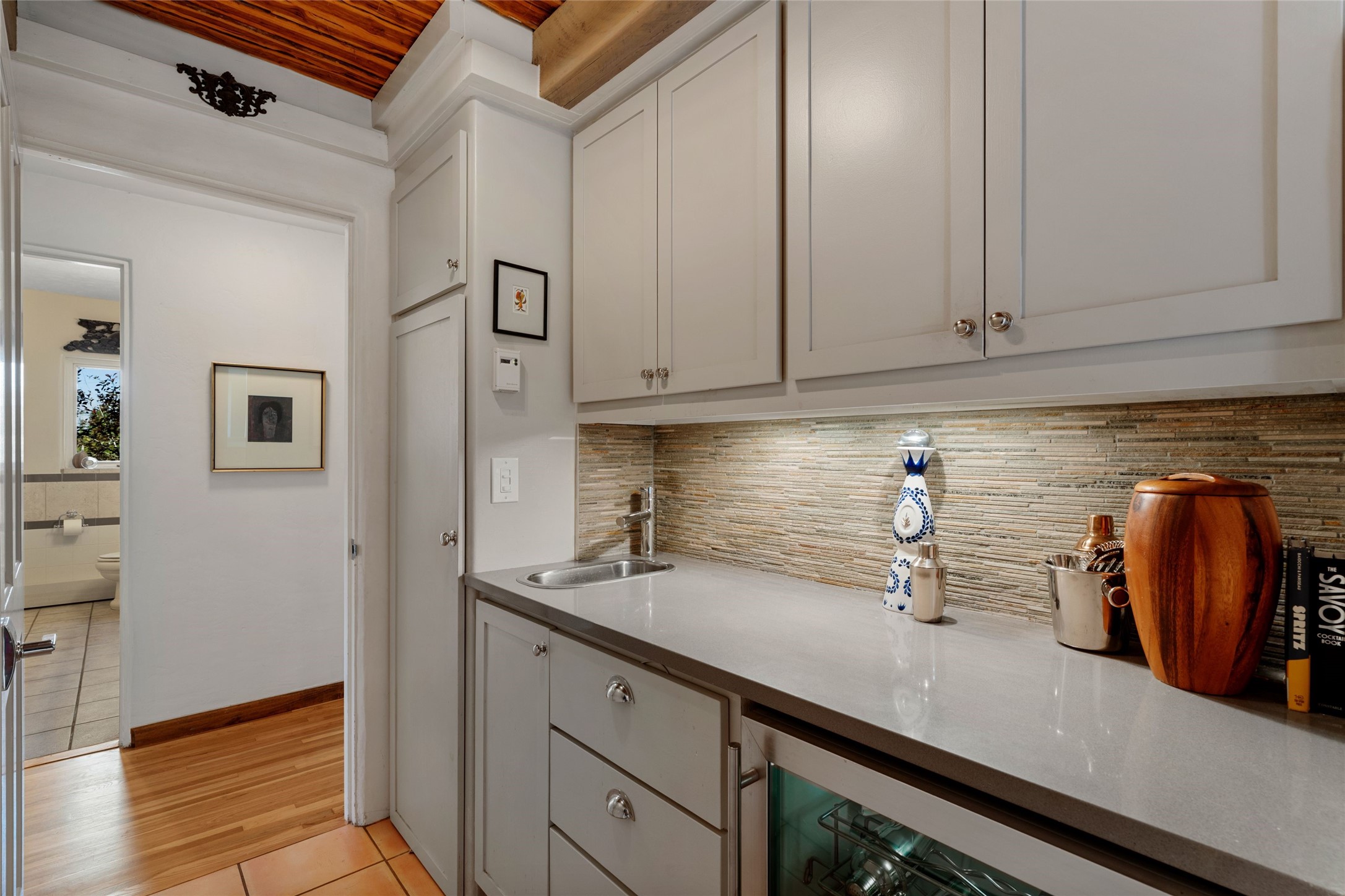 A truly inspired mid-century home like this cannot be found anywhere but Santa Fe and is ideally located where South Capitol meets Museum Hill. Designed & built in 1955, with a dramatic expansion in 1975, this home has evolved into unique & stunning! The mid-century conversation pit, large rooms & soaring ceilings are invigorated with elements of Santa Fe style: an iconic Kiva fireplace, double arrow carved details, customized latilla ceilings, nichos & vigas. Bespoke in so many ways by teams of craftsmen, you will appreciate hand plastered walls, narrow oak flooring that harks back to the 50s but looks brand new, other floors are brick, flagstone, & tile. The full acre property offers 3 distinctive outdoor areas: one is shady, tree-filled and comes alive at dusk with cool vintage lights. Off the studio is a sunny fenced yard with pear tree. Third & largest is a grand gathering space for parties, sit-down dinners, fireplace chats - surrounded by lush gardens. Sprawling across the main floor you will find entertainment-ready public spaces like a lofted great room, sitting, media, dining rooms plus eat-in kitchen. The bedroom wing is set apart with the primary bedroom en-suite plus 2 large bedrooms that share the main bath. The public 1/2 bath & laundry are part of the large media room area. The bonus is upstairs: an attached guest suite with private entrance, OR, second en-suite primary bedroom. Unexpected highlights: a 17' tall glass-walled art studio/gym, a "treasure room" or library, heated 2 car garage wired for 240 + separate workshop OR storage room. This property is flush with flexibility: if you seek a home office retreat there are many options. You will love the practicalty of this "Santa Fe Central" location where the 2 closest grocery stores are Trader Joe's & Whole Foods, the 2 closest restaurants are Museum Hill & Clafoutis. This is a rare opportunity to experience "design magazine modern" with Santa Fe spirit! Virtual tour + Video Link online