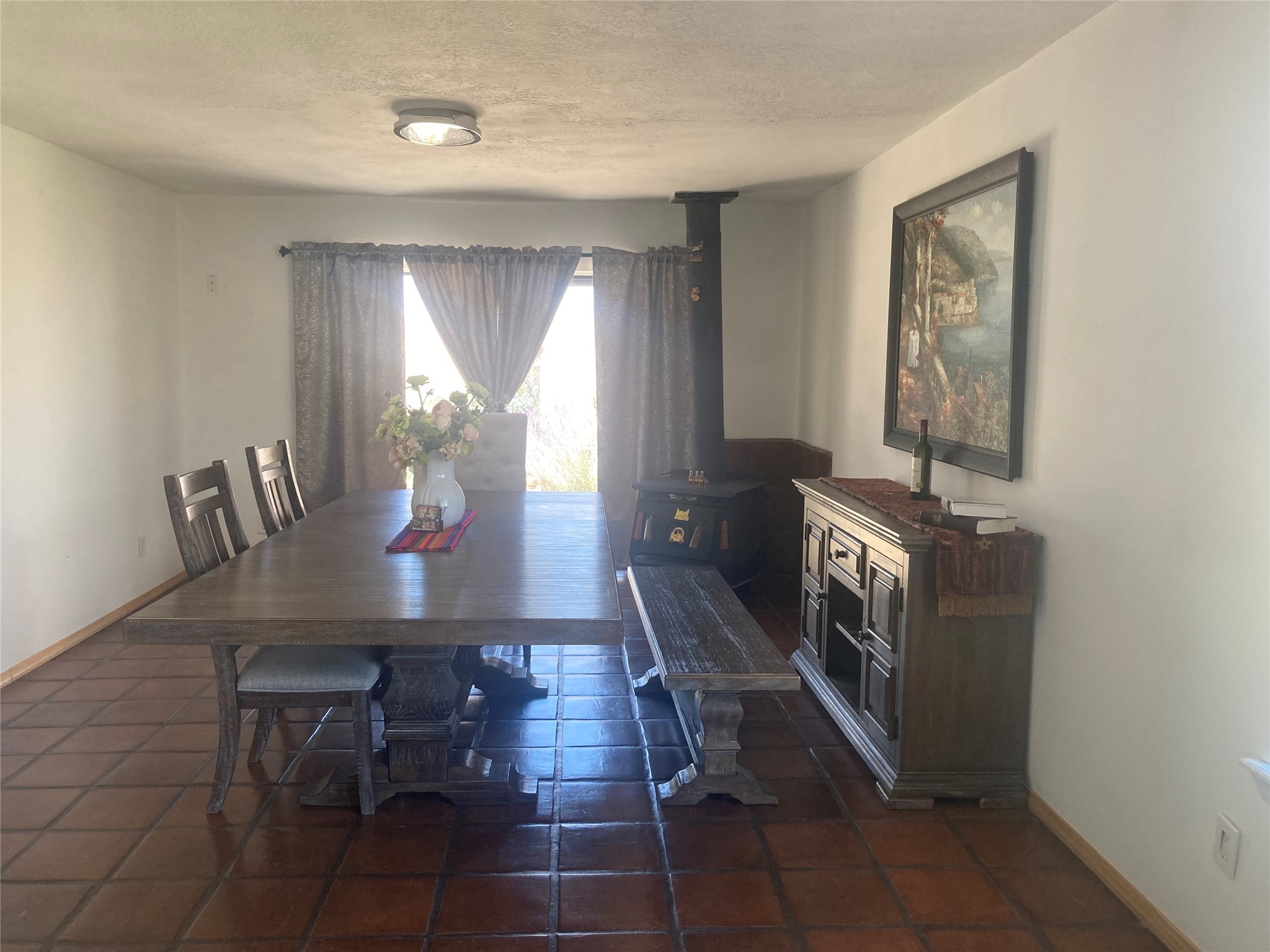 This spacious move-in ready home with 4 bedrooms, 3 bathrooms, a bonus room and horse amenities sits on little over 2 acres and is fully fenced. The home is located in the sprawling southside of Santa Fe close to shopping, schools, dining, hotels and has easy access to the major roads and highways. All of the rooms are generously sized and there is ample natural light throughout the house. Downstairs you will find the kitchen with an adjacent dining area, a large living room, a bathroom, a bedroom and a bonus room, which can be used as another bedroom or office. Upstairs is the master bedroom with two walk-in closets and the attached master bathroom. Also upstairs are two bedrooms and a large bathroom. The living room, dining room, downstairs hallways and downstairs lounge area have Saltillo tile floors. All bedrooms and the living room have newer carpet. There is a fireplace in the living room and a wood stove in the dining room. Off the dining room is a walled-in courtyard with a garden. In the front of the house is a covered porch. The garage is finished and has 3 closets with sliding doors, a shop area and a window. Fences separate the land surrounding the house from the horse area. The horse area has electricity and water available. This one-of-a kind property has a lot to offer!