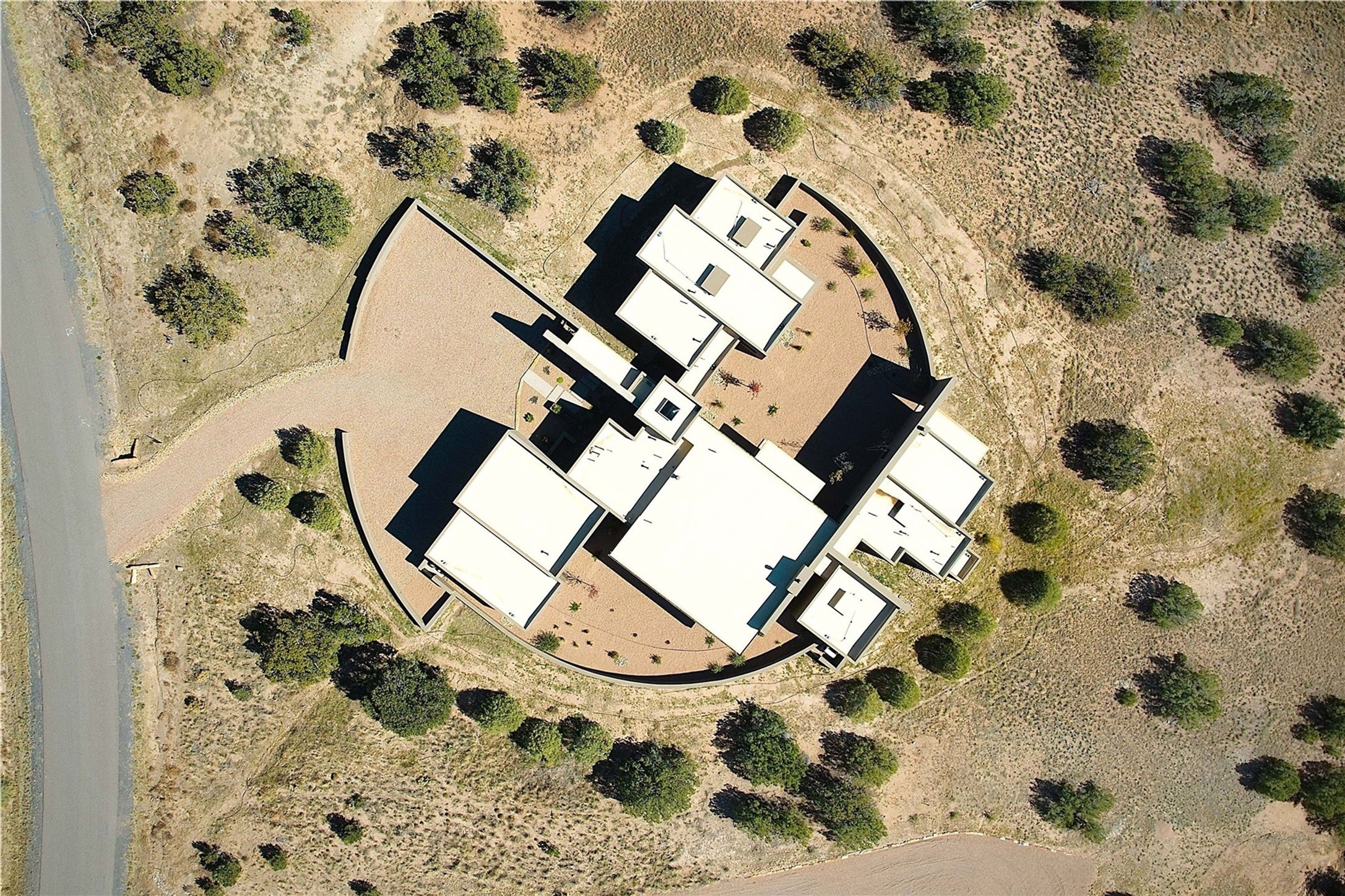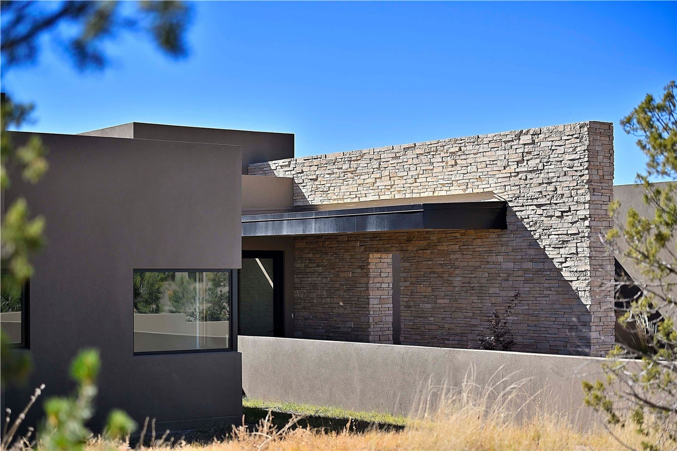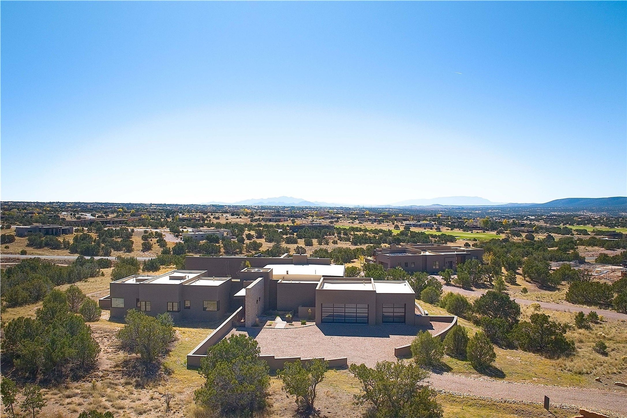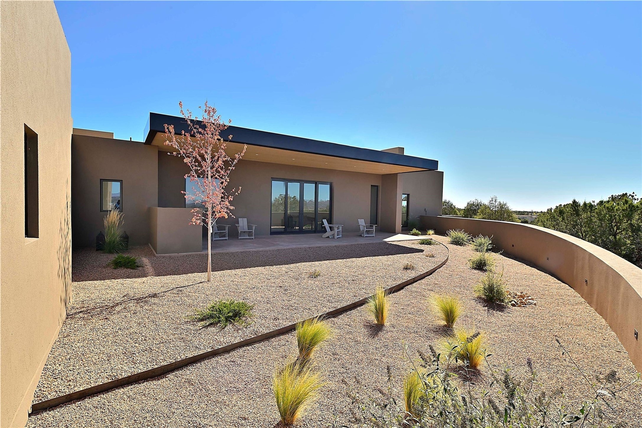 Exceptional single-level contemporary masterpiece built in 2024 by the award-winning Boss Builders. Designed to maximize stunning views of both the Sangre de Cristo and Jemez Mountains, this residence features luxury designer finishes throughout, including beautiful wood and natural stone flooring, soft white plaster walls in the main living areas, and striking custom steel accents. The exquisite finishes were handpicked by renowned local designer Yuki Murata. The open-concept living room and dining area seamlessly connect to a state-of-the-art island kitchen, perfect for entertaining. This culinary haven includes custom cabinetry, walk-in pantry, and top-of-the-line Wolf/Subzero appliances, all framed by panoramic mountain vistas. The generous primary suite, with its own private outdoor area, contains a spa-like bathroom with a walk-in shower, a tranquil soaking tub encased in glass, and an expansive walk-in closet. Adjacent to the owner's suite is a private media room or office.The thoughtfully designed independent guest wing features three en-suite bedrooms that share a cozy living room, ensuring privacy for guests. Two generous outdoor living areas embrace the ultimate indoor-outdoor lifestyle. Located within proximity to The Club at Las Campanas and BLM land.