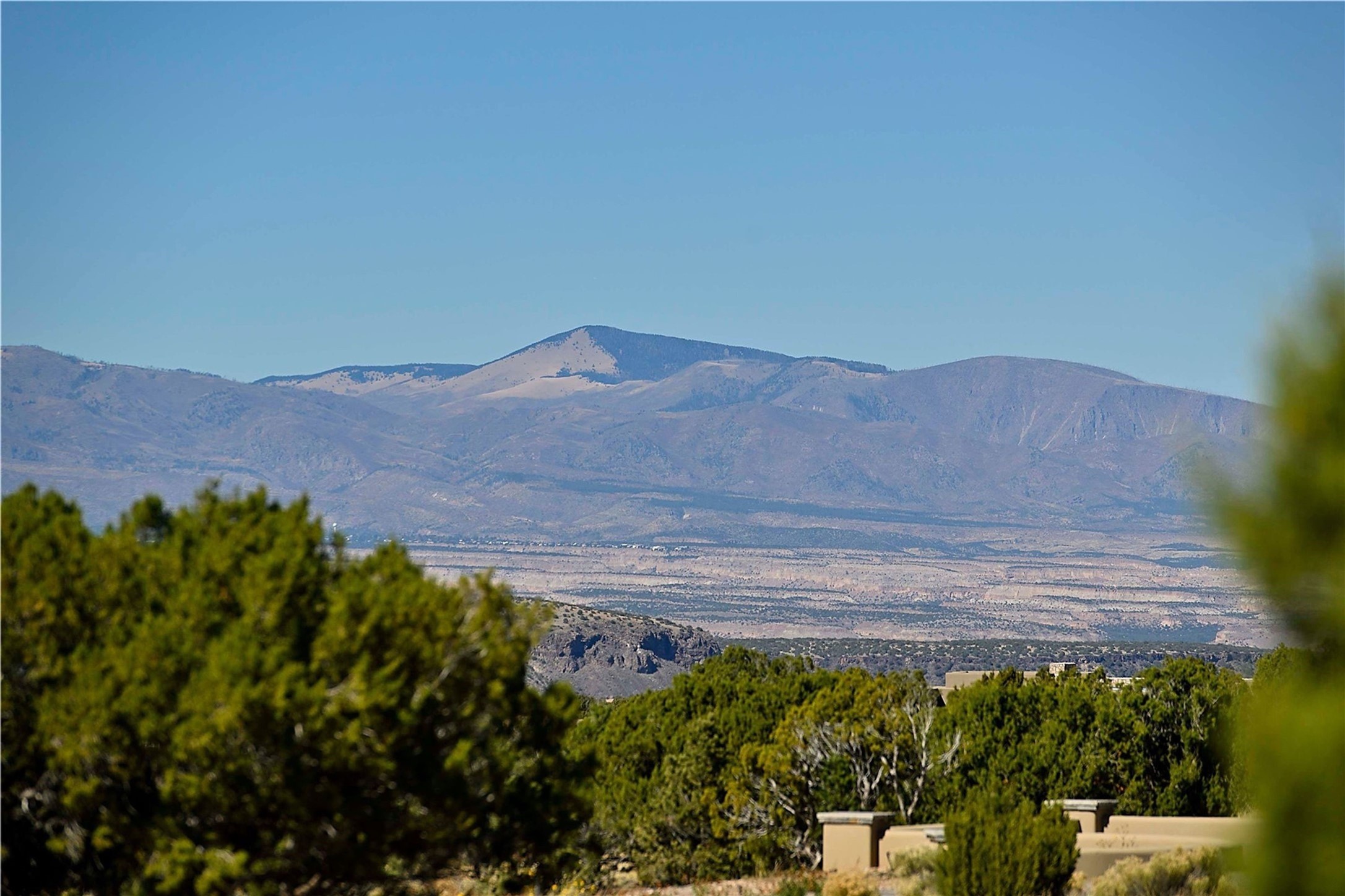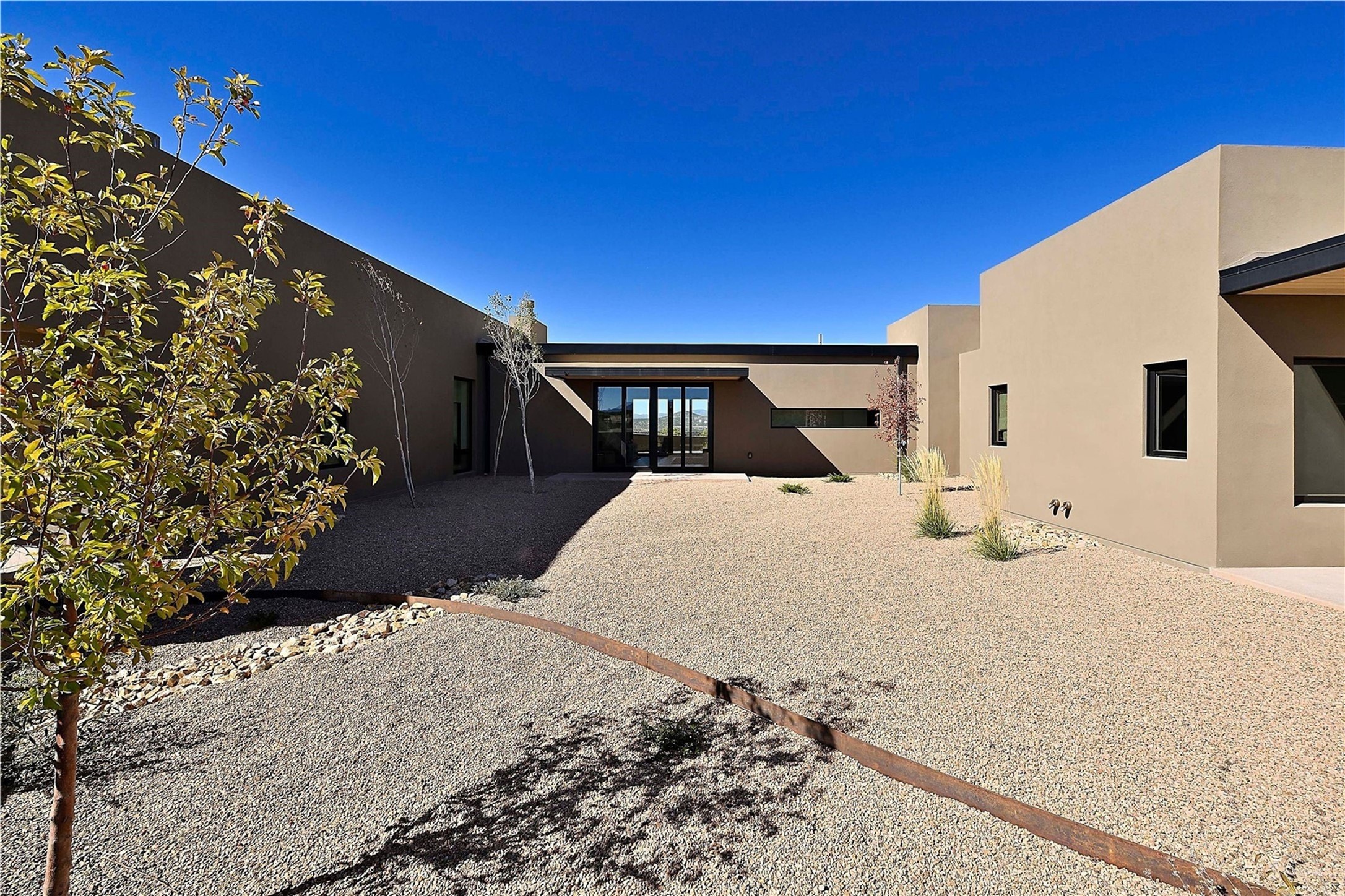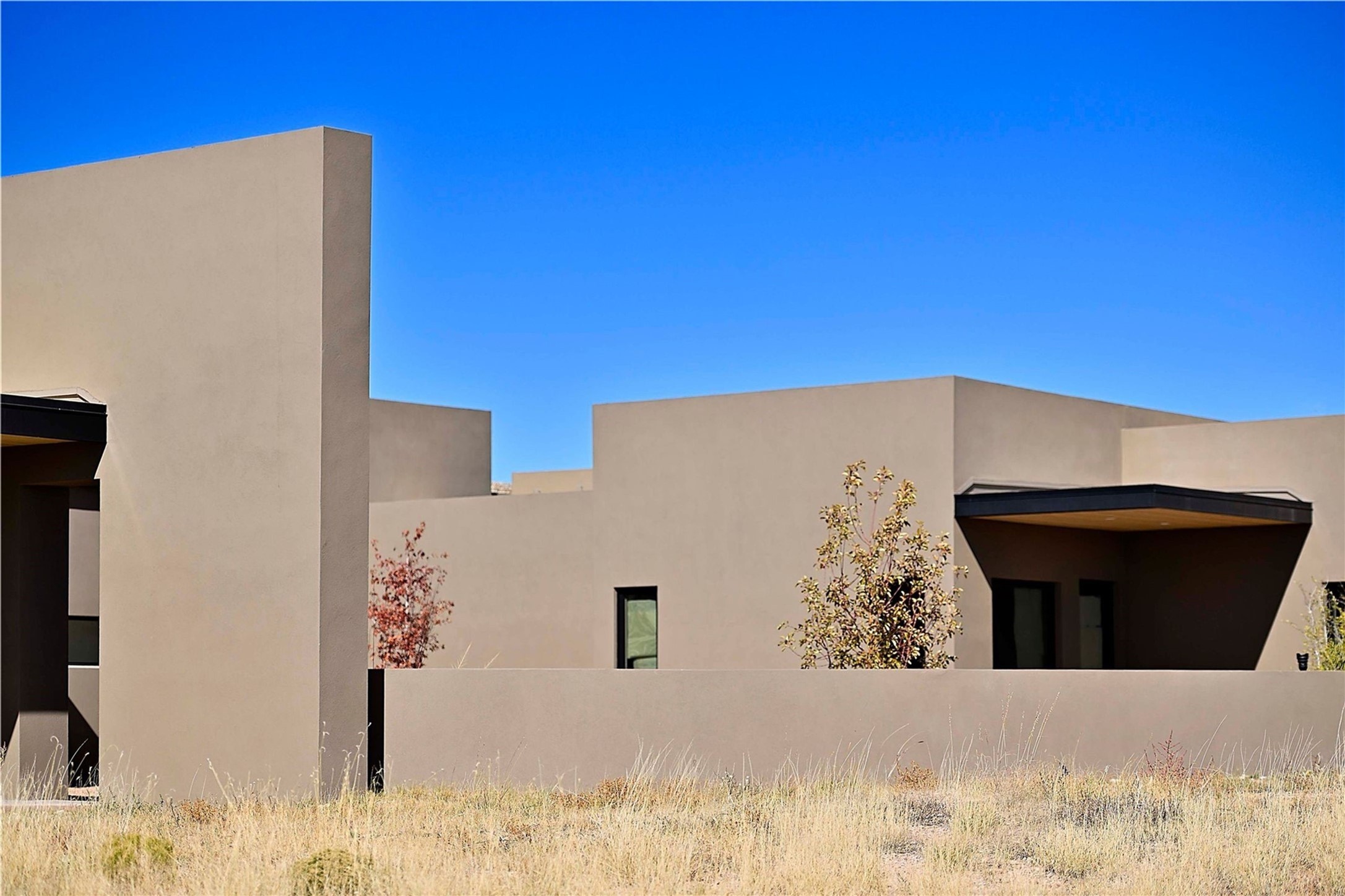 Exceptional single-level contemporary masterpiece built in 2024 by the award-winning Boss Builders. Designed to maximize stunning views of both the Sangre de Cristo and Jemez Mountains, this residence features luxury designer finishes throughout, including beautiful wood and natural stone flooring, soft white plaster walls in the main living areas, and striking custom steel accents. The exquisite finishes were handpicked by renowned local designer Yuki Murata. The open-concept living room and dining area seamlessly connect to a state-of-the-art island kitchen, perfect for entertaining. This culinary haven includes custom cabinetry, walk-in pantry, and top-of-the-line Wolf/Subzero appliances, all framed by panoramic mountain vistas. The generous primary suite, with its own private outdoor area, contains a spa-like bathroom with a walk-in shower, a tranquil soaking tub encased in glass, and an expansive walk-in closet. Adjacent to the owner's suite is a private media room or office.The thoughtfully designed independent guest wing features three en-suite bedrooms that share a cozy living room, ensuring privacy for guests. Two generous outdoor living areas embrace the ultimate indoor-outdoor lifestyle. Located within proximity to The Club at Las Campanas and BLM land.