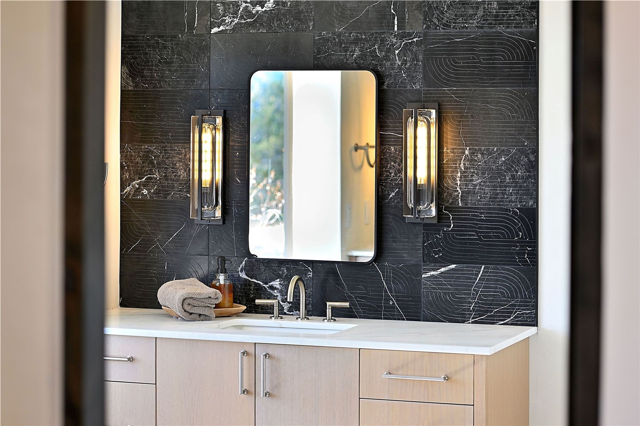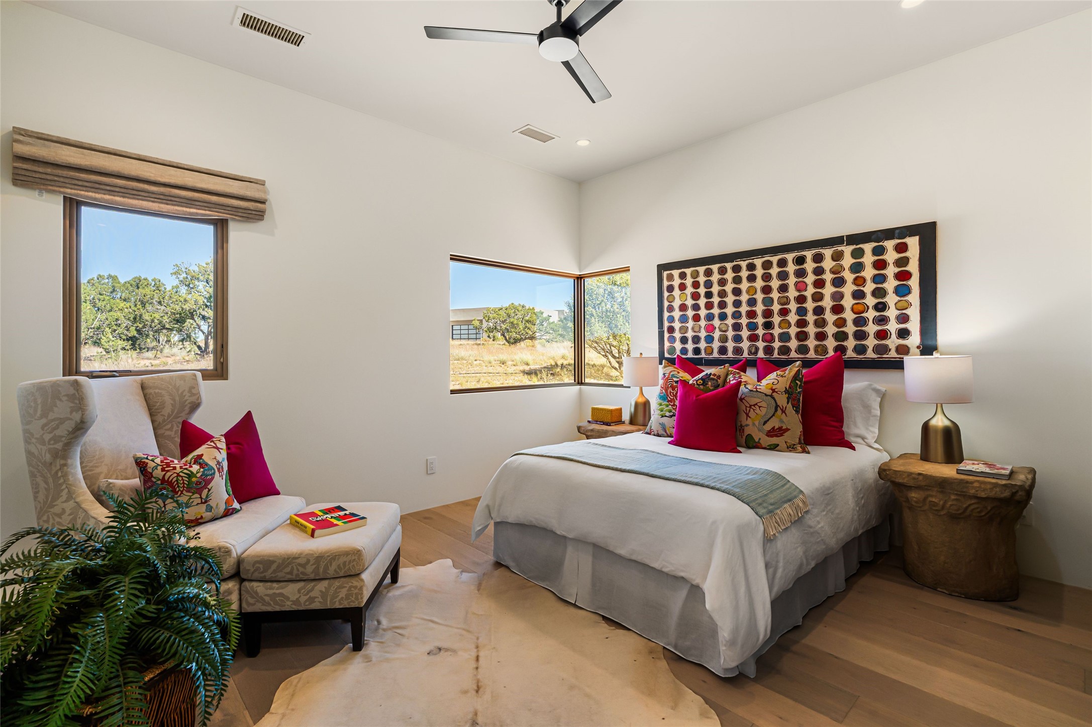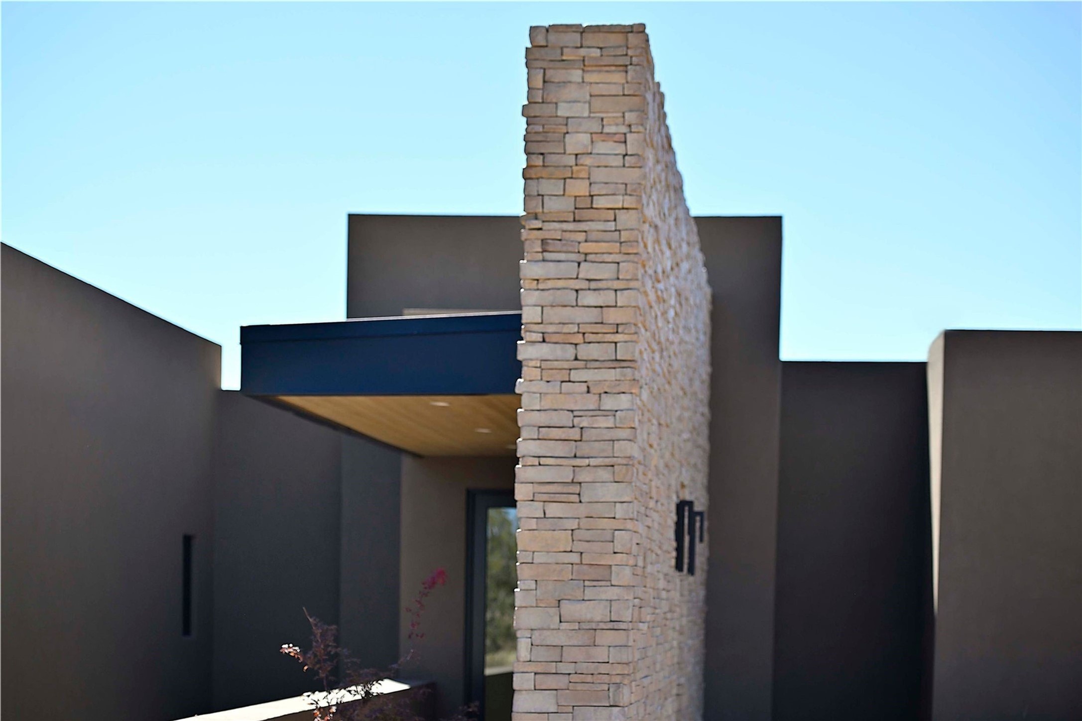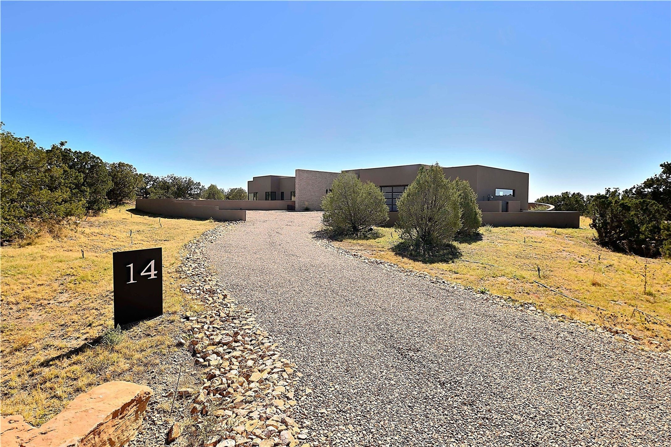Exceptional single-level contemporary masterpiece built in 2024 by the award-winning Boss Builders. Designed to maximize stunning views of both the Sangre de Cristo and Jemez Mountains, this residence features luxury designer finishes throughout, including beautiful wood and natural stone flooring, soft white plaster walls in the main living areas, and striking custom steel accents. The exquisite finishes were handpicked by renowned local designer Yuki Murata. The open-concept living room and dining area seamlessly connect to a state-of-the-art island kitchen, perfect for entertaining. This culinary haven includes custom cabinetry, walk-in pantry, and top-of-the-line Wolf/Subzero appliances, all framed by panoramic mountain vistas. The generous primary suite, with its own private outdoor area, contains a spa-like bathroom with a walk-in shower, a tranquil soaking tub encased in glass, and an expansive walk-in closet. Adjacent to the owner's suite is a private media room or office.The thoughtfully designed independent guest wing features three en-suite bedrooms that share a cozy living room, ensuring privacy for guests. Two generous outdoor living areas embrace the ultimate indoor-outdoor lifestyle. Located within proximity to The Club at Las Campanas and BLM land.