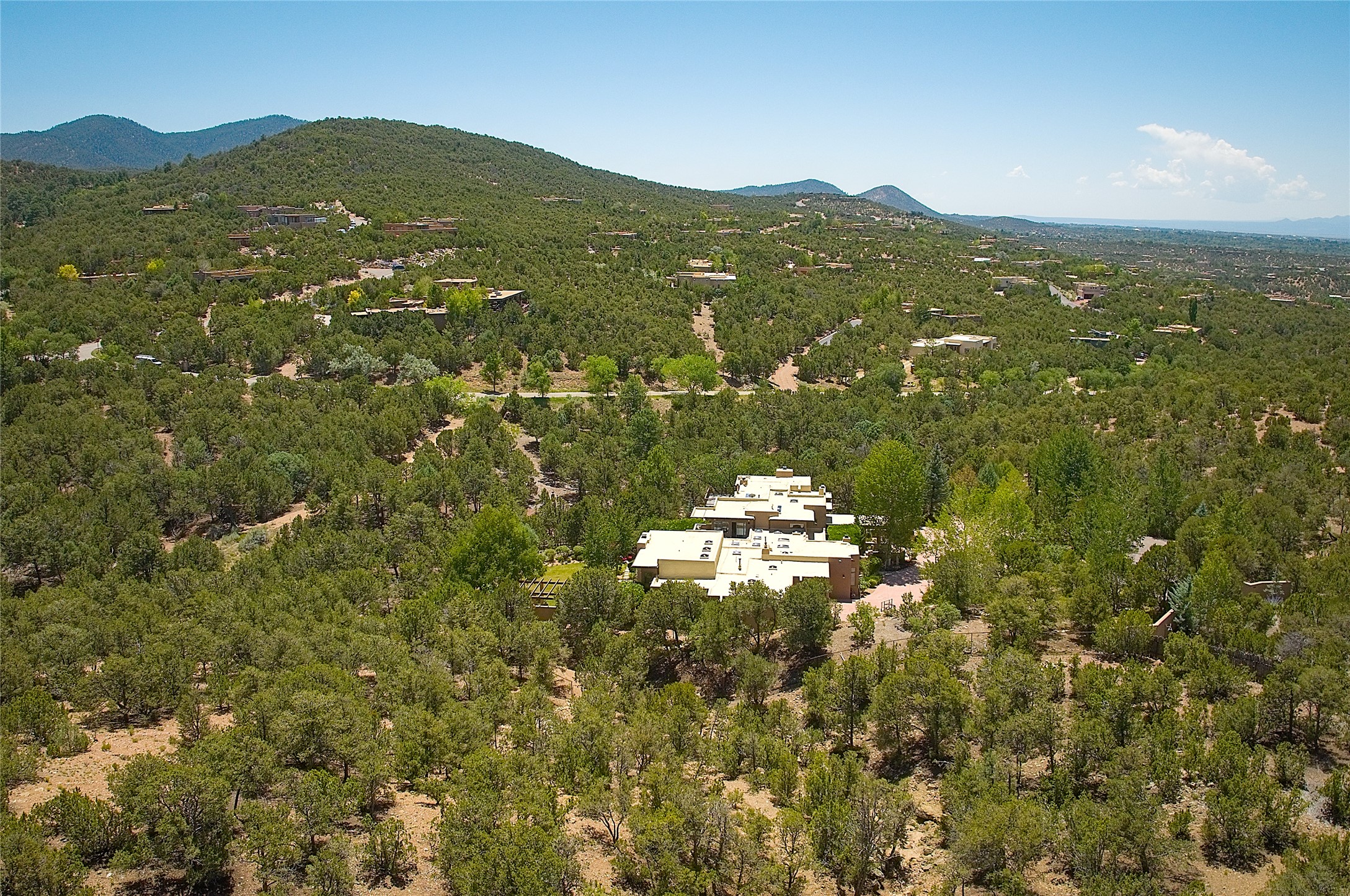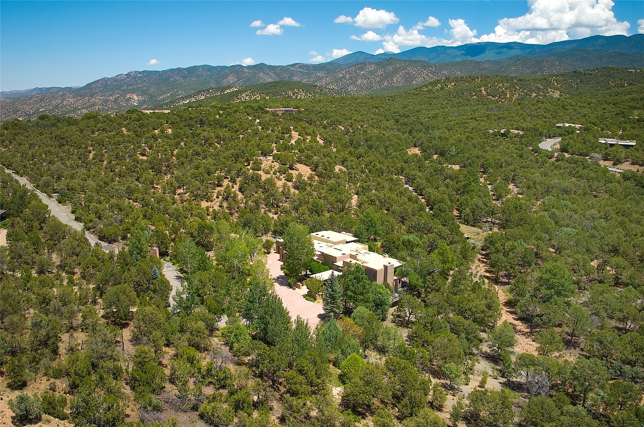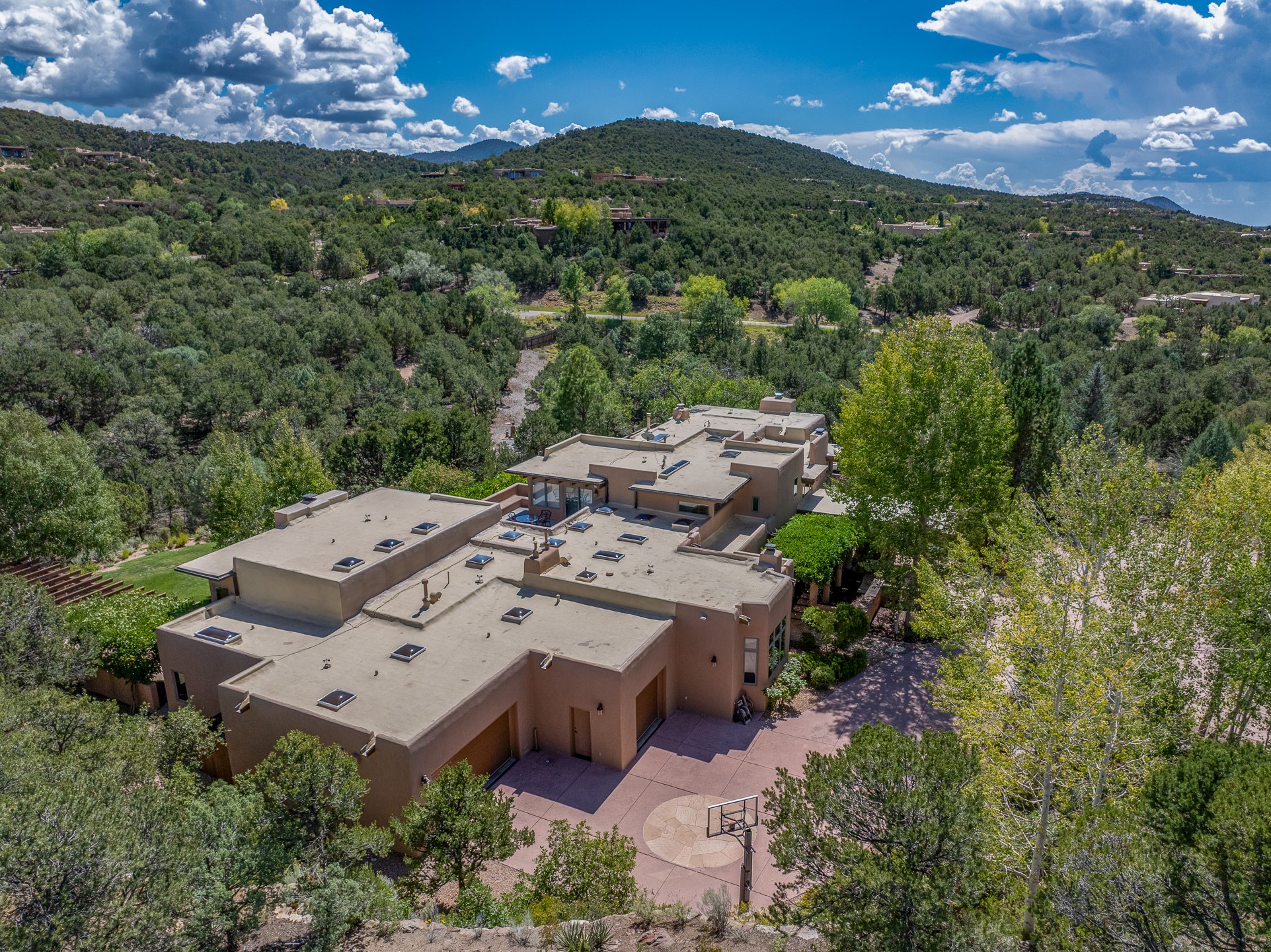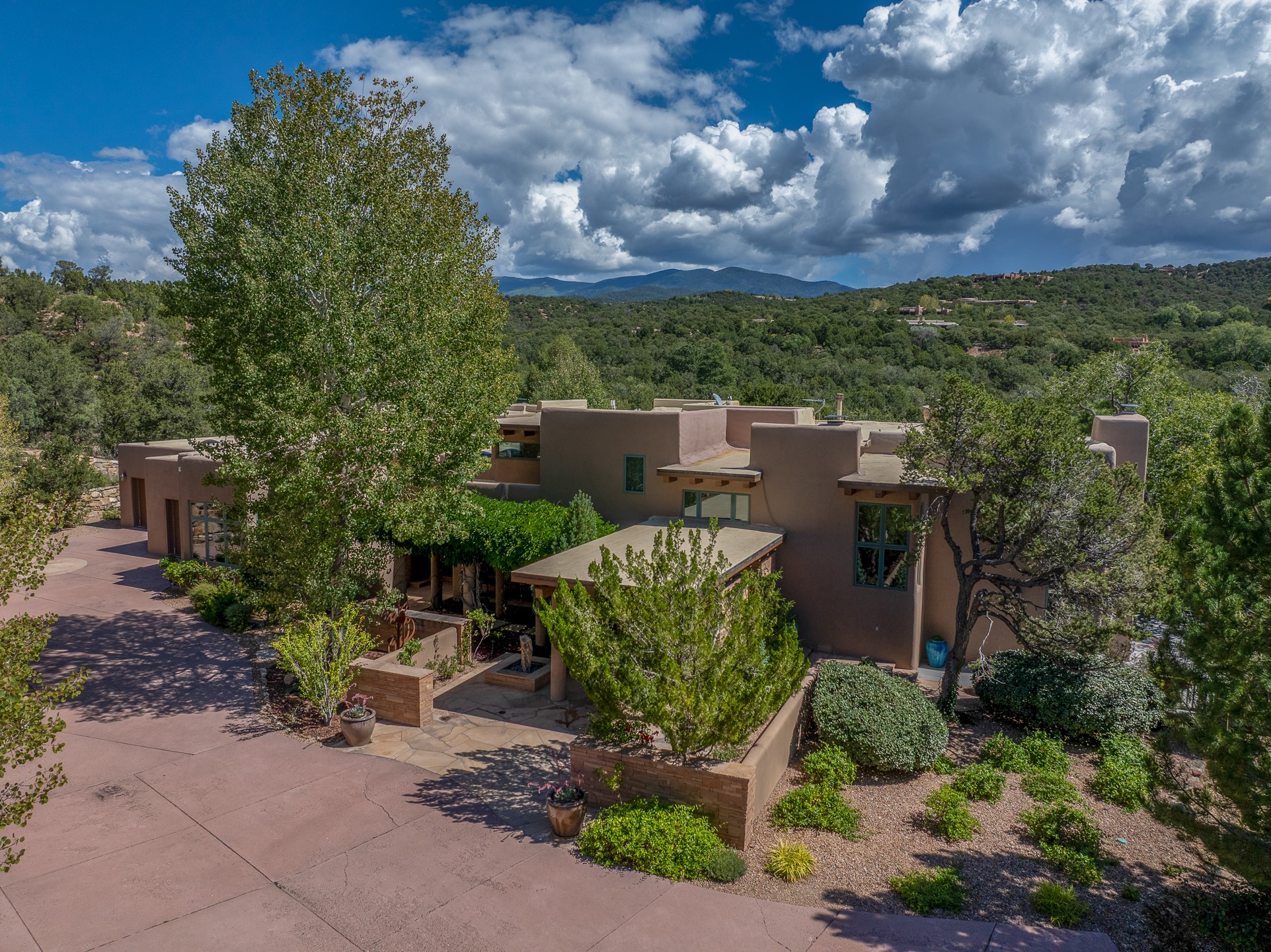Perched on over 3 lush acres in one of Santa Fe's most coveted enclaves, this exceptional estate offers a rare synthesis of space, serenity, and natural beauty. It is less than 10 minutes from the plaza and the city's extensive mountain hiking trails are only a short walk away. Designed with both privacy and flexibility in mind, the residence unfolds across two thoughtfully connected wings, encompassing five bedrooms and a range of inviting communal and intimate spaces. It is ideally suited for multigenerational living, entertaining, or even a creative retreat.The main level is tailored for effortless single-level living, featuring expansive formal and informal gathering areas, two nicely equipped kitchens, three bedrooms (one of which is a grand suite with a private entrance), a game room and 2 car garage. A sauna and steamroom are situated in the guest bath on the main level. Seamless indoor-outdoor living is made possible through multiple portals, decks, and lawn spaces, framed by towering Aspens, Ponderosa Pines and Pinons, with manicured lawn and gardens, tranquil water features, and sweeping mountain views.Upstairs, two spacious en-suite bedrooms each open to their own private view decks, offering peaceful havens for rest, reading, or quiet contemplation. The home is connected to city utilities, has central air conditioning and heat and has been meticulously maintained, ensuring comfort, durability, and modern ease.Properties of this caliber, combining architectural versatility, natural grace, and premier location, are seldom available. Additional contiguous parcels totaling over 11 acres with commanding hilltop views may be acquired separately, offering a rare opportunity to expand and create an even more secluded private compound.