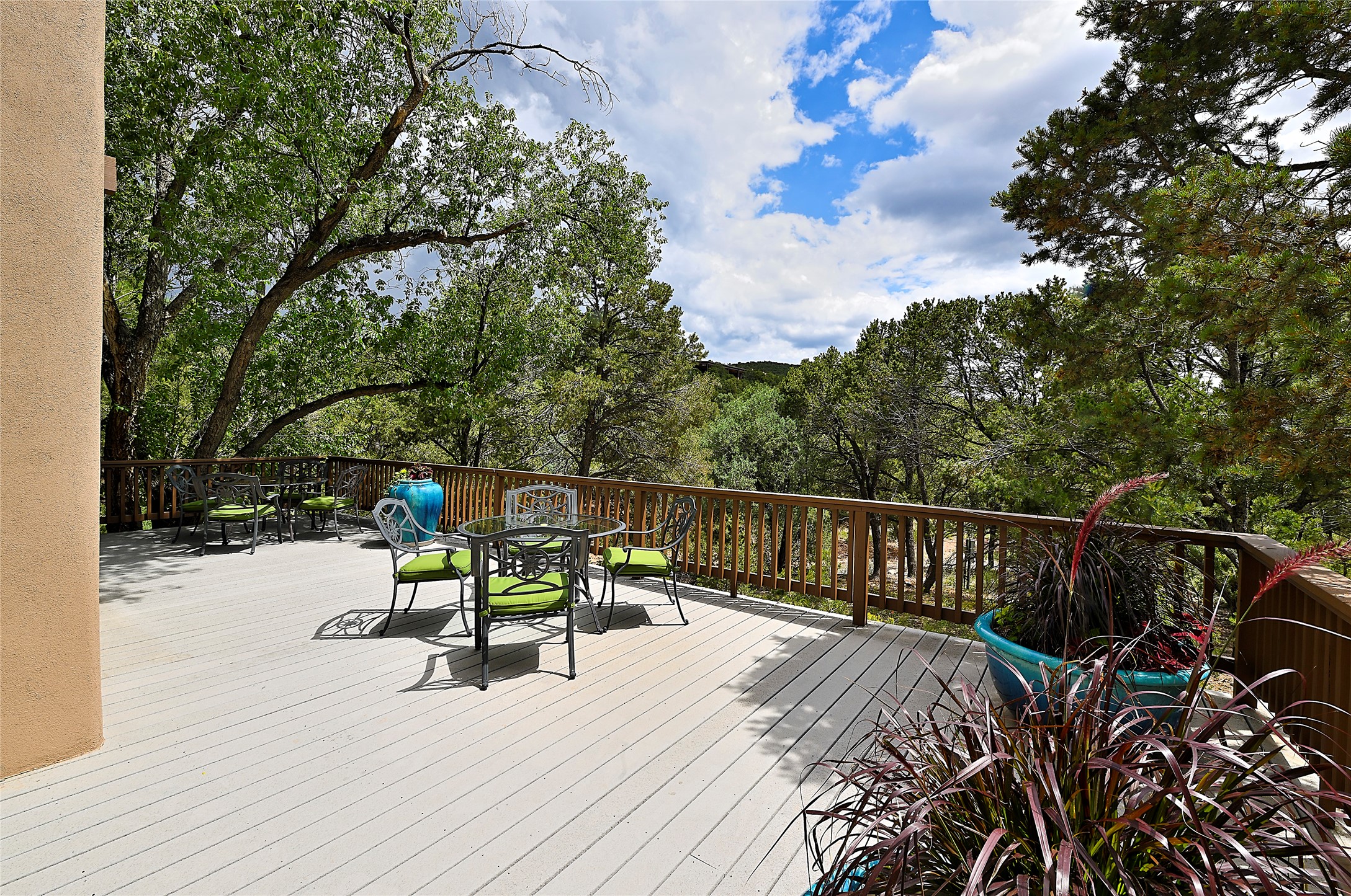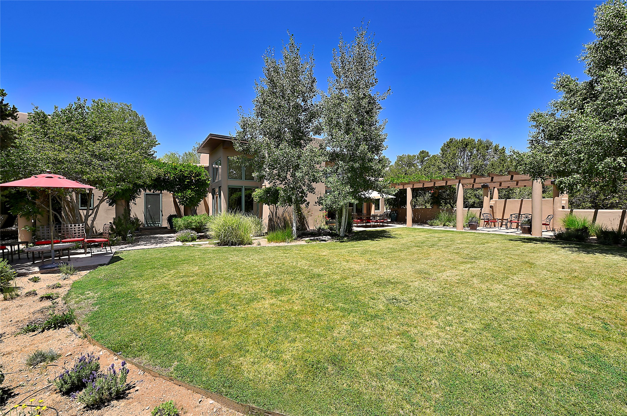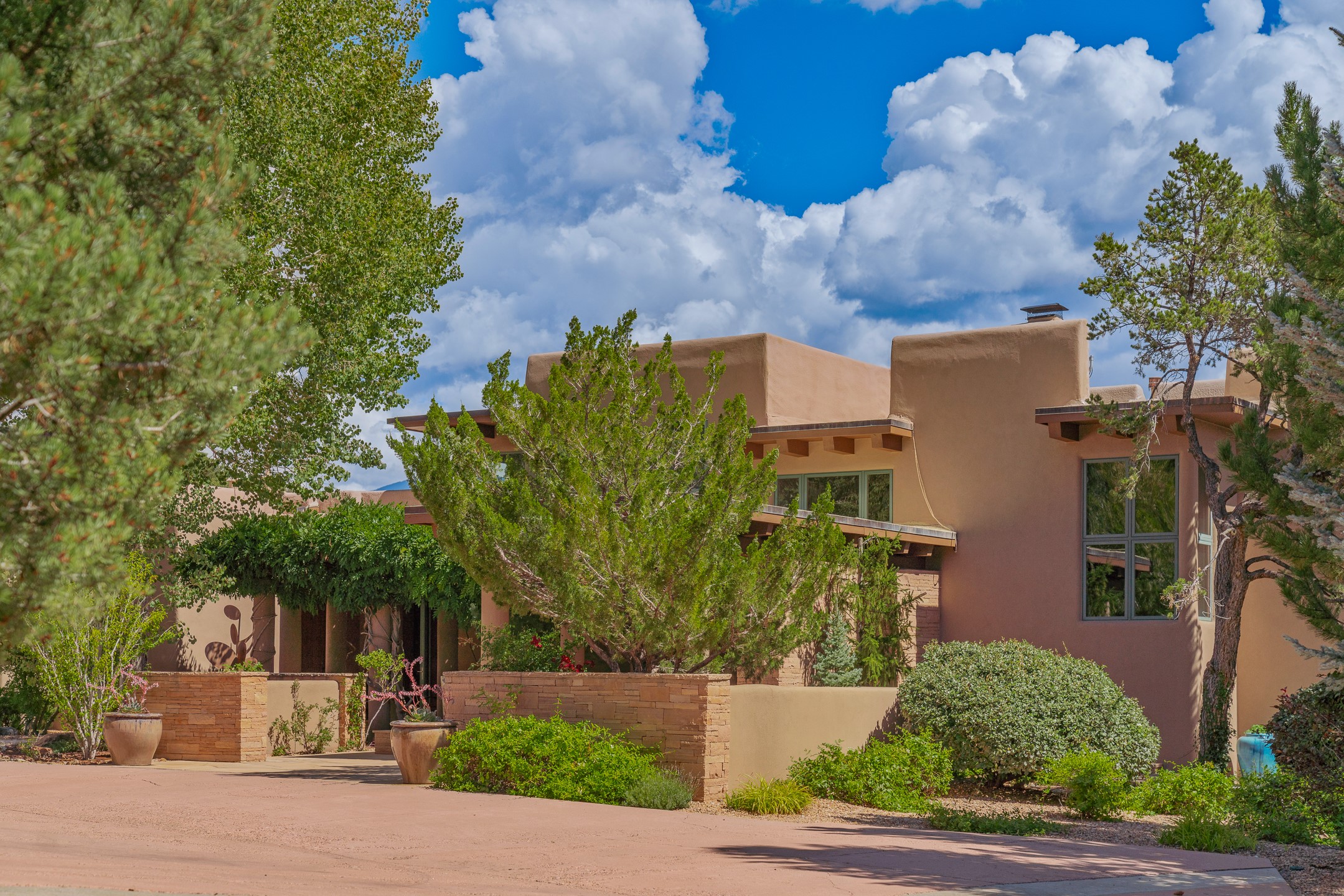 Perched on over 3 lush acres in one of Santa Fe's most coveted enclaves, this exceptional estate offers a rare synthesis of space, serenity, and natural beauty. It is less than 10 minutes from the plaza and the city's extensive mountain hiking trails are only a short walk away. Designed with both privacy and flexibility in mind, the residence unfolds across two thoughtfully connected wings, encompassing five bedrooms and a range of inviting communal and intimate spaces. It is ideally suited for multigenerational living, entertaining, or even a creative retreat.The main level is tailored for effortless single-level living, featuring expansive formal and informal gathering areas, two nicely equipped kitchens, three bedrooms (one of which is a grand suite with a private entrance), a game room and 2 car garage. A sauna and steamroom are situated in the guest bath on the main level. Seamless indoor-outdoor living is made possible through multiple portals, decks, and lawn spaces, framed by towering Aspens, Ponderosa Pines and Pinons, with manicured lawn and gardens, tranquil water features, and sweeping mountain views.Upstairs, two spacious en-suite bedrooms each open to their own private view decks, offering peaceful havens for rest, reading, or quiet contemplation. The home is connected to city utilities, has central air conditioning and heat and has been meticulously maintained, ensuring comfort, durability, and modern ease.Properties of this caliber, combining architectural versatility, natural grace, and premier location, are seldom available. Additional contiguous parcels totaling over 11 acres with commanding hilltop views may be acquired separately, offering a rare opportunity to expand and create an even more secluded private compound.