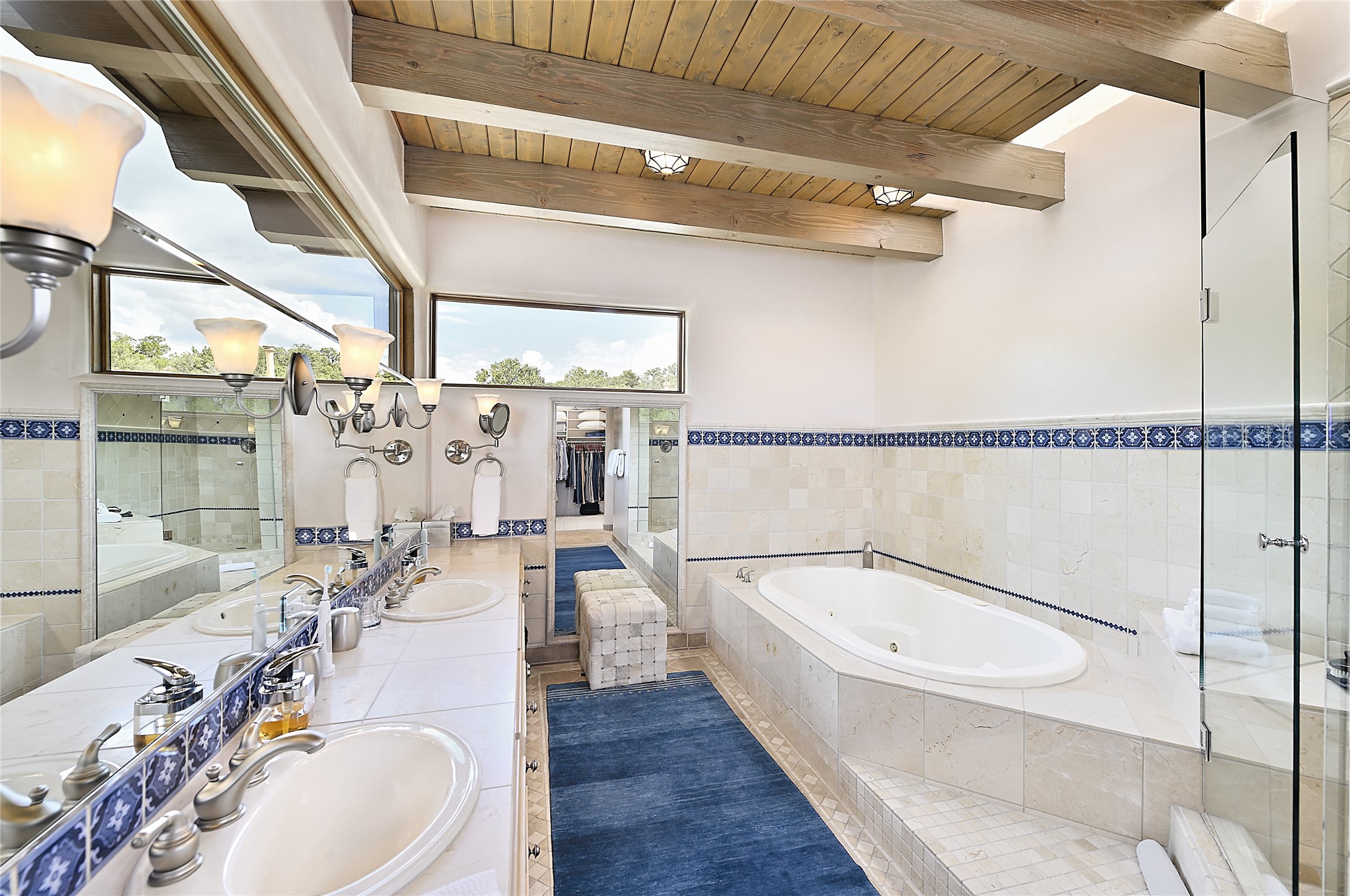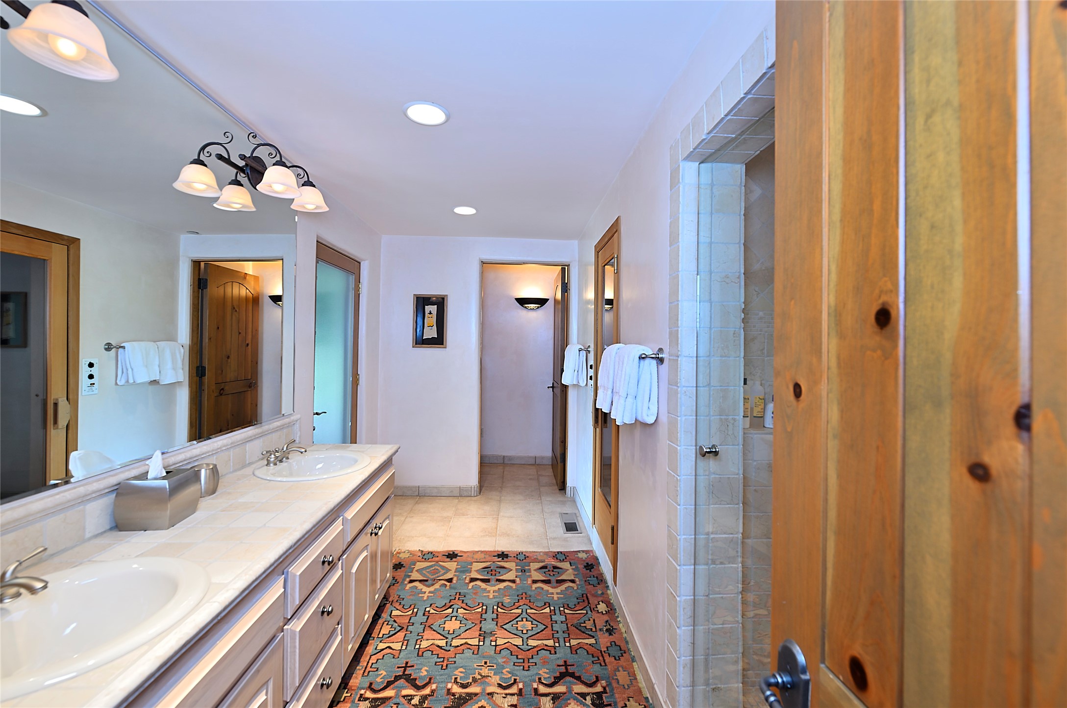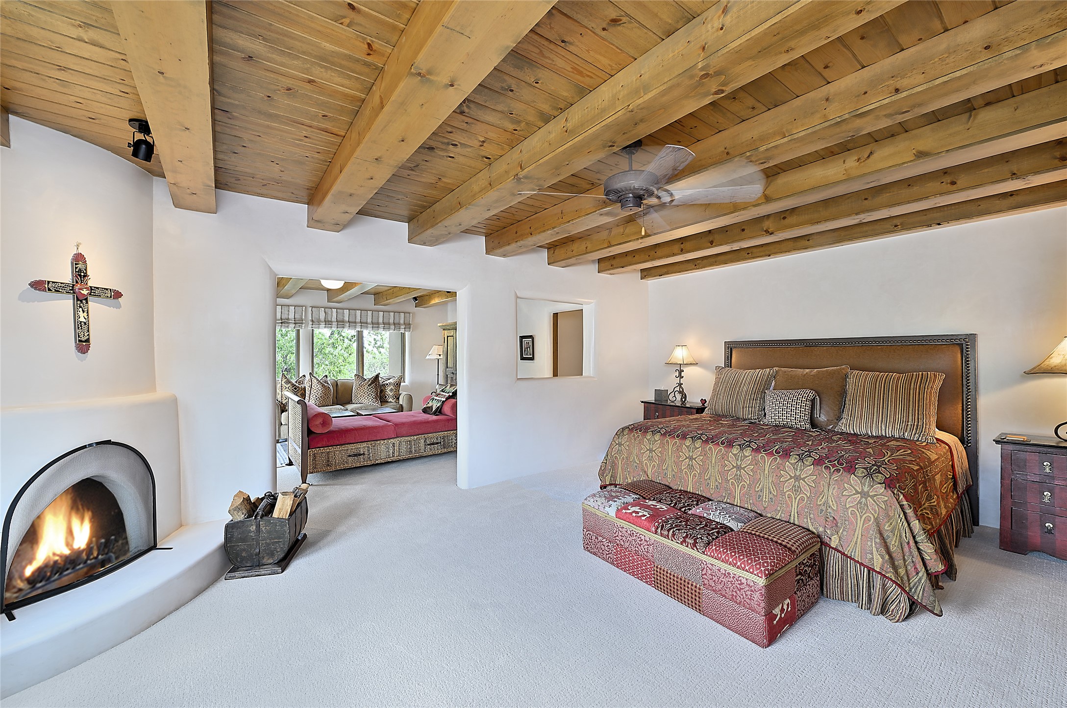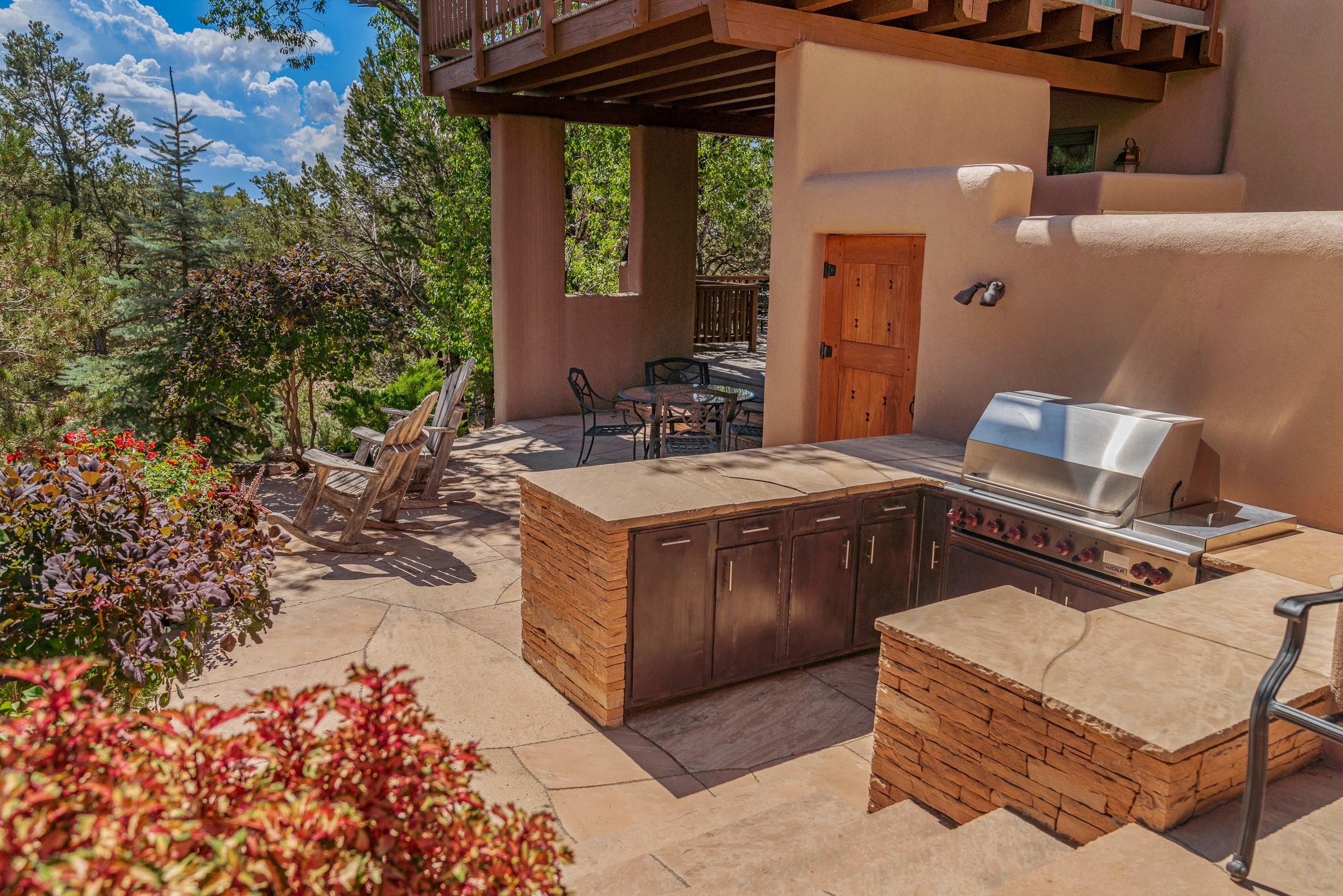 Perched on over 3 lush acres in one of Santa Fe's most coveted enclaves, this exceptional estate offers a rare synthesis of space, serenity, and natural beauty. It is less than 10 minutes from the plaza and the city's extensive mountain hiking trails are only a short walk away. Designed with both privacy and flexibility in mind, the residence unfolds across two thoughtfully connected wings, encompassing five bedrooms and a range of inviting communal and intimate spaces. It is ideally suited for multigenerational living, entertaining, or even a creative retreat.The main level is tailored for effortless single-level living, featuring expansive formal and informal gathering areas, two nicely equipped kitchens, three bedrooms (one of which is a grand suite with a private entrance), a game room and 2 car garage. A sauna and steamroom are situated in the guest bath on the main level. Seamless indoor-outdoor living is made possible through multiple portals, decks, and lawn spaces, framed by towering Aspens, Ponderosa Pines and Pinons, with manicured lawn and gardens, tranquil water features, and sweeping mountain views.Upstairs, two spacious en-suite bedrooms each open to their own private view decks, offering peaceful havens for rest, reading, or quiet contemplation. The home is connected to city utilities, has central air conditioning and heat and has been meticulously maintained, ensuring comfort, durability, and modern ease.Properties of this caliber, combining architectural versatility, natural grace, and premier location, are seldom available. Additional contiguous parcels totaling over 11 acres with commanding hilltop views may be acquired separately, offering a rare opportunity to expand and create an even more secluded private compound.