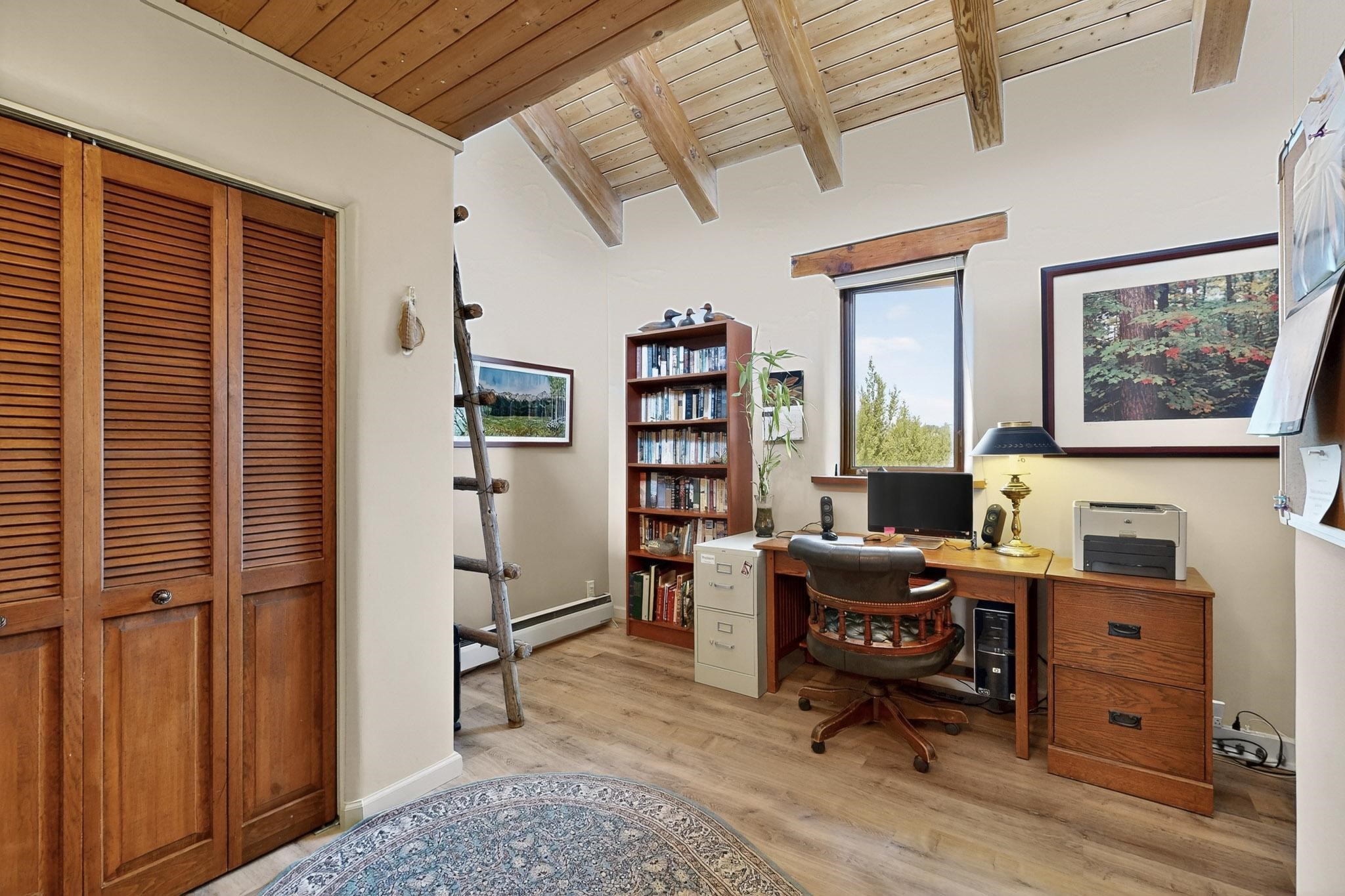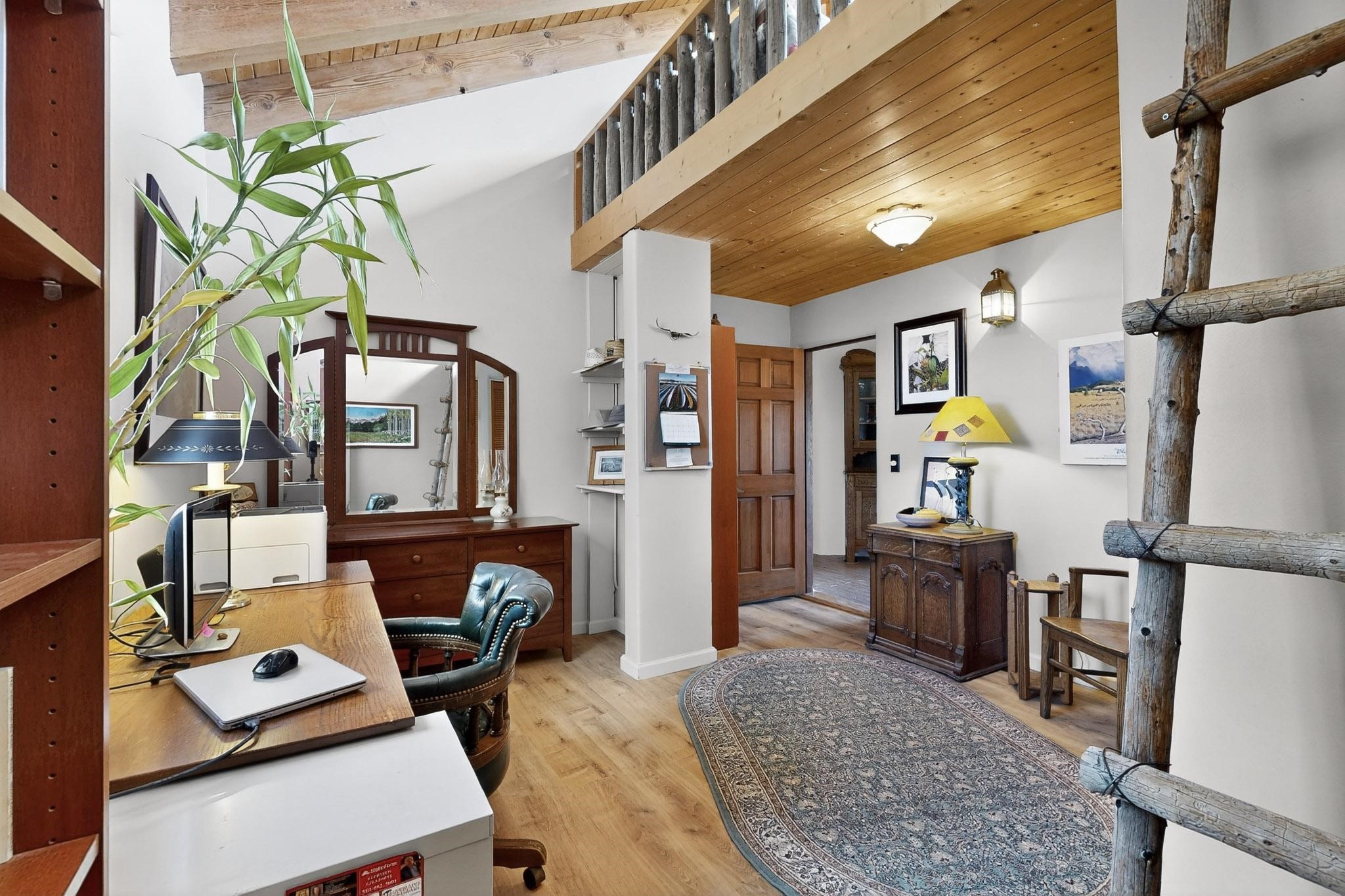 Surrounded by lush perennial gardens, sitting back from the road this lovely traditional pueblo home built by R.J. McMillan in 1984 provides a private oasis. Many upgrades have enhanced it including a new roof in 2015 maintained annually, electric baseboard heating with Daikin mini splits in 2022, reroofed the pitched area with propanel in 2021, reroofed the overhangs with new rain gutters, mostly new windows, upgraded kitchen and appliances in 2023 and new stucco in 2024. Delightful Santa Fe style details creating an ambient charm throughout, even vigas in the garage. The garage currently has a glass door not a garage door on one side, as it was used as a studio. A garden shed, plus productive raised beds, and on the greenbelt, this lovingly maintained home and gardens is special. Close to Eldorado amenities, local shopping, schools, library and senior center, it is only minutes into Santa Fe.