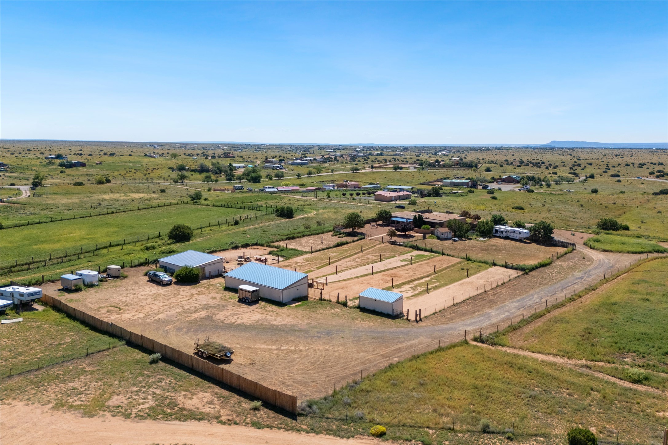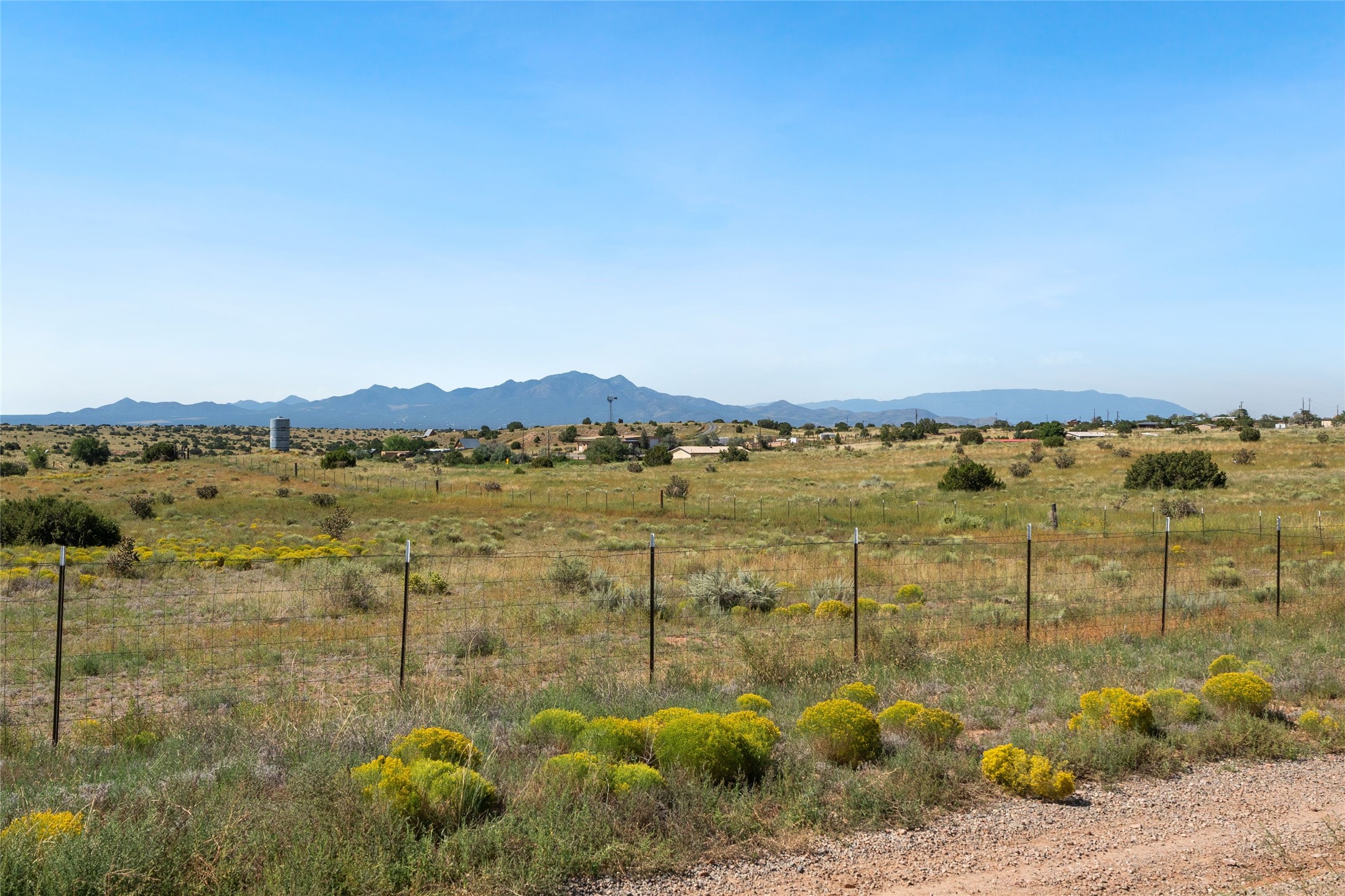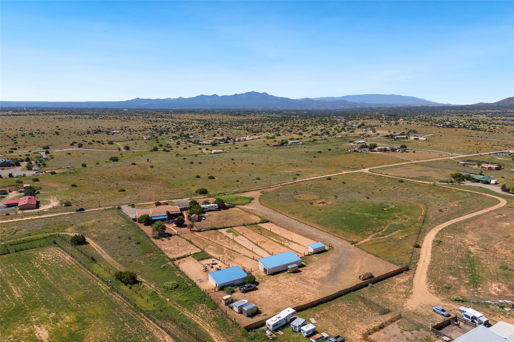 Set on 5.19 fully fenced acres with Sandia and Ortiz mountain views, this 3-bedroom, 2-bath single-level home combines Southwestern character with equestrian-ready facilities and thoughtful upgrades. The 2,645-square-foot residence features a light-filled open floor plan, tile and wood flooring, and expansive south-facing windows that frame mountain views. The circular living room with wood stove flows into the dining area and kitchen, while two covered portals extend the living space outdoors. The attached two-car garage with direct entry was insulated and finished in 2023. Horse facilities include two barns with stalls and turnouts for up to 12 horses, water, power, and lighting, a 60' round pen, and a four-acre no-climb fenced field. Recent improvements include solar electric fencing (2019), new barn siding (2020), gutters (2021), water spigots and conduits (2022), chicken wire installation in barn ceilings (2023), RV hookups (2023), and a solar-powered gate opener (2024). Additional enhancements include new kitchen lighting and interior paint (2023) and a 12' x 14' storage shed (2022). With no HOA restrictions, this property offers flexibility for horse enthusiasts and hobbyists alike. Located just 4 minutes from San Marcos Caf & Feed, 12 minutes from Cerrillos, 16 minutes from Madrid, and 22 minutes from Santa Fe shopping and dining, this peaceful property offers mountain views, extensive infrastructure, and a quintessential Santa Fe lifestyle.