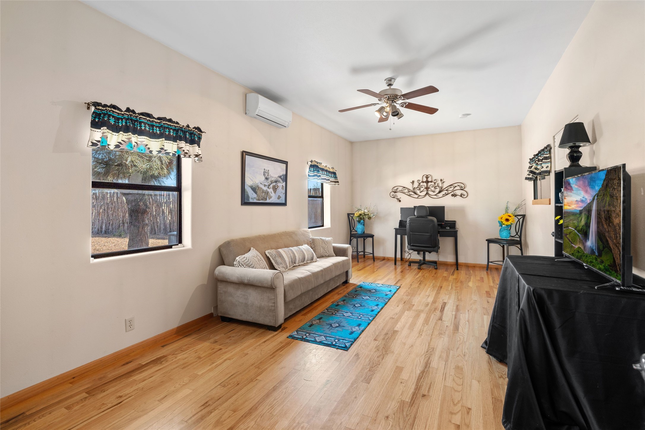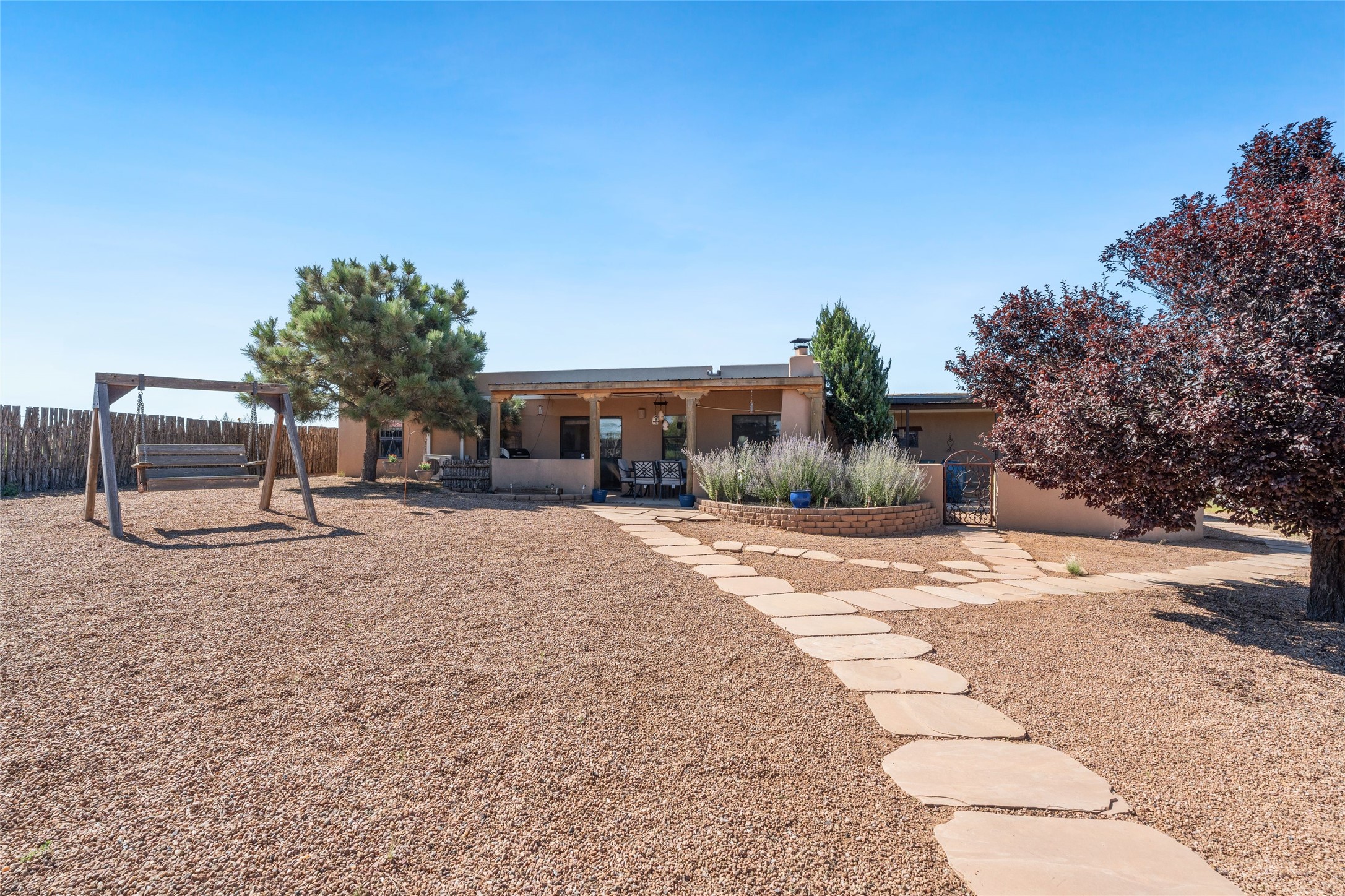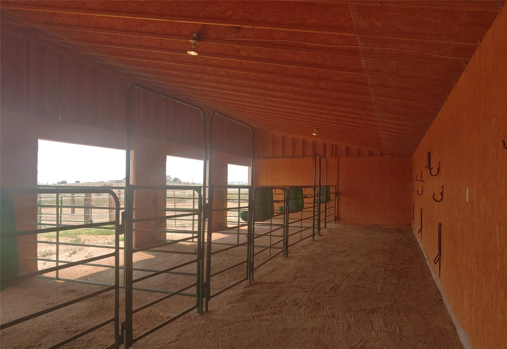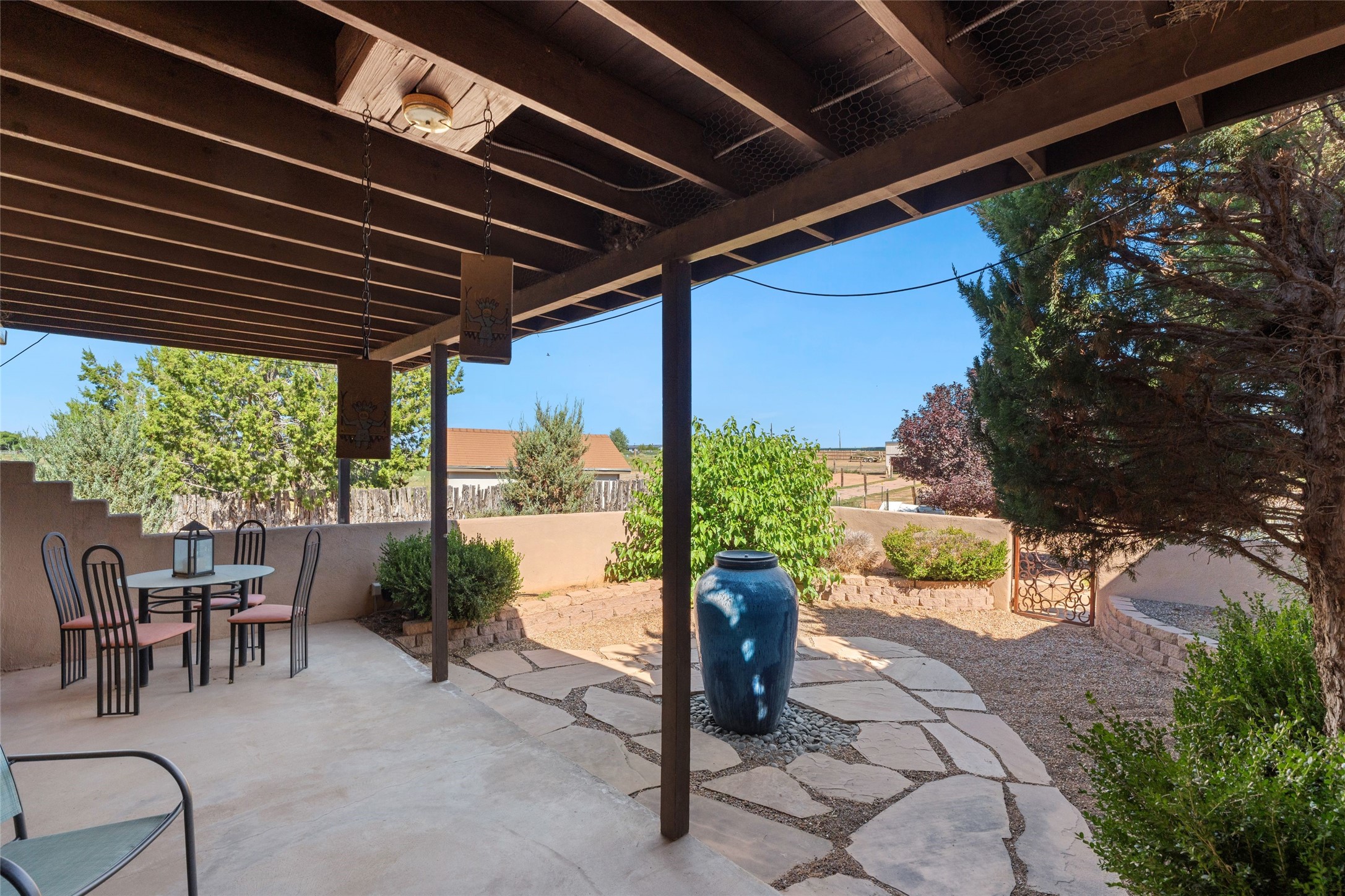 Set on 5.19 fully fenced acres with Sandia and Ortiz mountain views, this 3-bedroom, 2-bath single-level home combines Southwestern character with equestrian-ready facilities and thoughtful upgrades. The 2,645-square-foot residence features a light-filled open floor plan, tile and wood flooring, and expansive south-facing windows that frame mountain views. The circular living room with wood stove flows into the dining area and kitchen, while two covered portals extend the living space outdoors. The attached two-car garage with direct entry was insulated and finished in 2023. Horse facilities include two barns with stalls and turnouts for up to 12 horses, water, power, and lighting, a 60' round pen, and a four-acre no-climb fenced field. Recent improvements include solar electric fencing (2019), new barn siding (2020), gutters (2021), water spigots and conduits (2022), chicken wire installation in barn ceilings (2023), RV hookups (2023), and a solar-powered gate opener (2024). Additional enhancements include new kitchen lighting and interior paint (2023) and a 12' x 14' storage shed (2022). With no HOA restrictions, this property offers flexibility for horse enthusiasts and hobbyists alike. Located just 4 minutes from San Marcos Caf & Feed, 12 minutes from Cerrillos, 16 minutes from Madrid, and 22 minutes from Santa Fe shopping and dining, this peaceful property offers mountain views, extensive infrastructure, and a quintessential Santa Fe lifestyle.