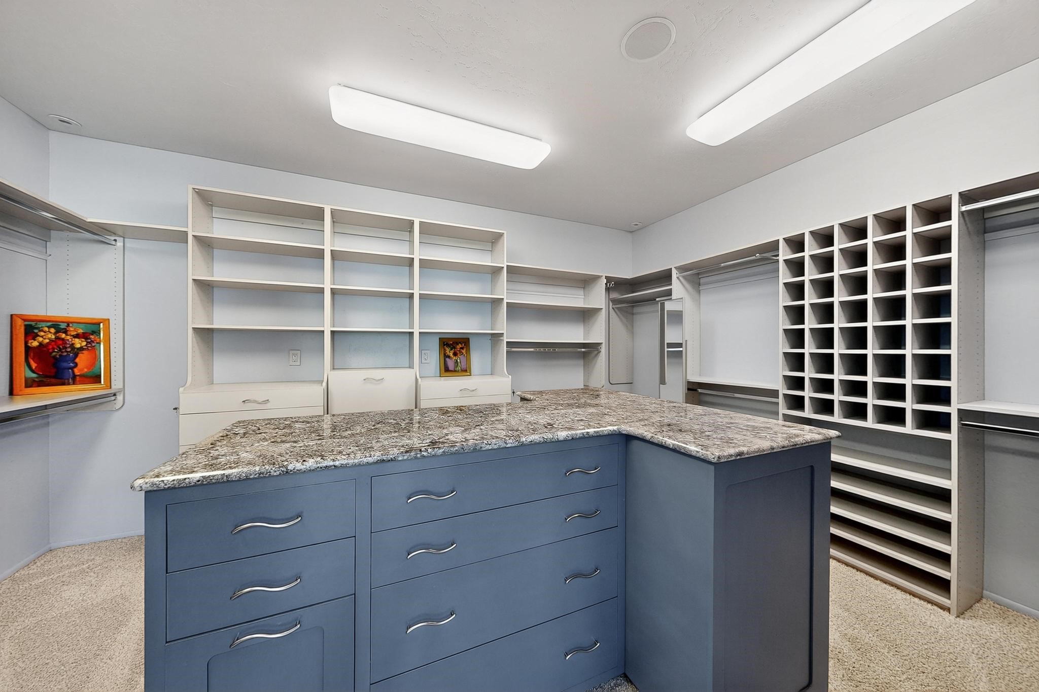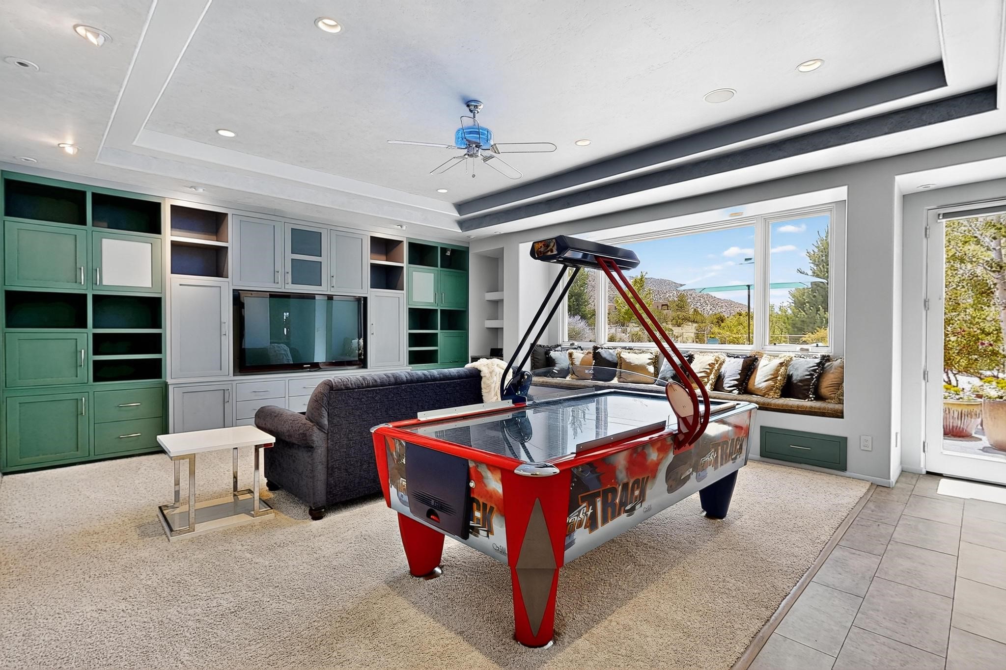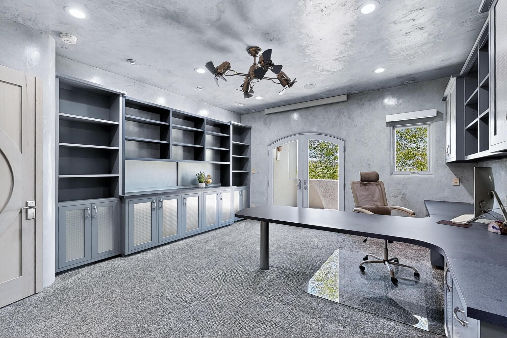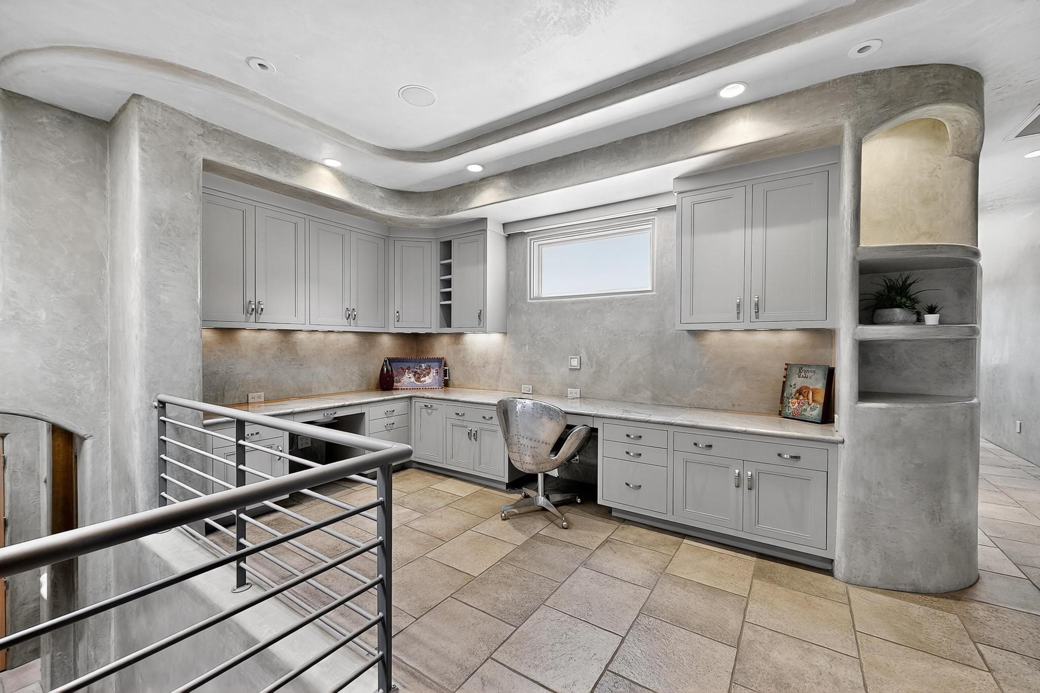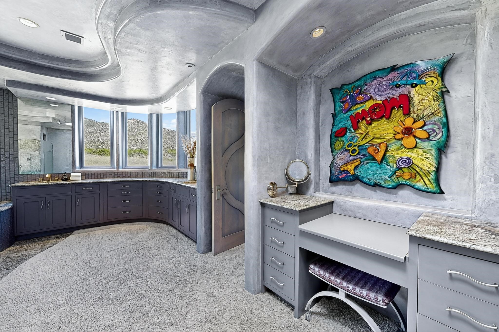 Perched at the pinnacle of High Desert, this extraordinary Custom Built luxury home sits on a private 2.37 acres lot and offers National Forest Views, unmatched privacy, and masterful design throughout. With 4 dedicated bedrooms, including a self-contained guest suite, plus two flexible rooms perfect for a home office and craft space, this home blends spacious living with thoughtful functionality. As you approach the home, you're greeted by an elegant water feature that flows beside a custom fire pit, creating a stunning and serene entry experience that sets the tone for the rest of the property. Bedrooms/Office all have window and balcony views. creating indoor-outdoor living and maximizing the incredible vistas. Designed for both elegance and practicality. Designed for both elegance and practicality, the home features 8 bathrooms (including 3 half baths and 2 three-quarter baths) and is adorned with hand-applied plaster walls by Frank D'Angelico that lend warmth and sophistication. The floor plan was thoughtfully crafted to provide ample wall space for showcasing art, ideal for collectors and design enthusiasts. Enjoy a dedicated theater room with a custom star ceiling designed to replicate a starry Albuquerque night in September, offering a truly immersive cinematic experience. Outside, a private pool serves as a tranquil escape, featuring an automatic cover and custom water features, including a bespoke downspout inspired by European spa architecture all operable at the touch of a button. Separate pool rooms provide convenient storage for pool toys and house the mechanical equipment. Comfort meets control with radiant floor heating and five refrigerated cooling units, all designed for efficiency and luxury. Each bedroom has independent climate controls, allowing for personalized heating and cooling throughout the home. A built-in, bank-grade safe offers secure storage for your most valuable possessions, while the chef's kitchen is outfitted with premium Wolf and Sub-Zero appliances, making it a culinary dream. From its elevated position with sweeping panoramic views to its impeccable craftsmanship and resort-style amenities, this is truly one of High Desert's most distinguished homes.