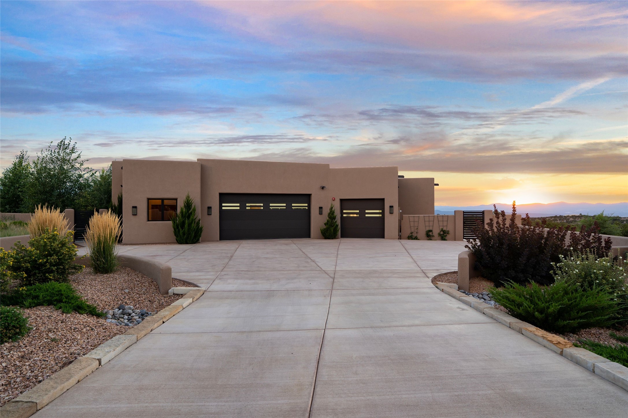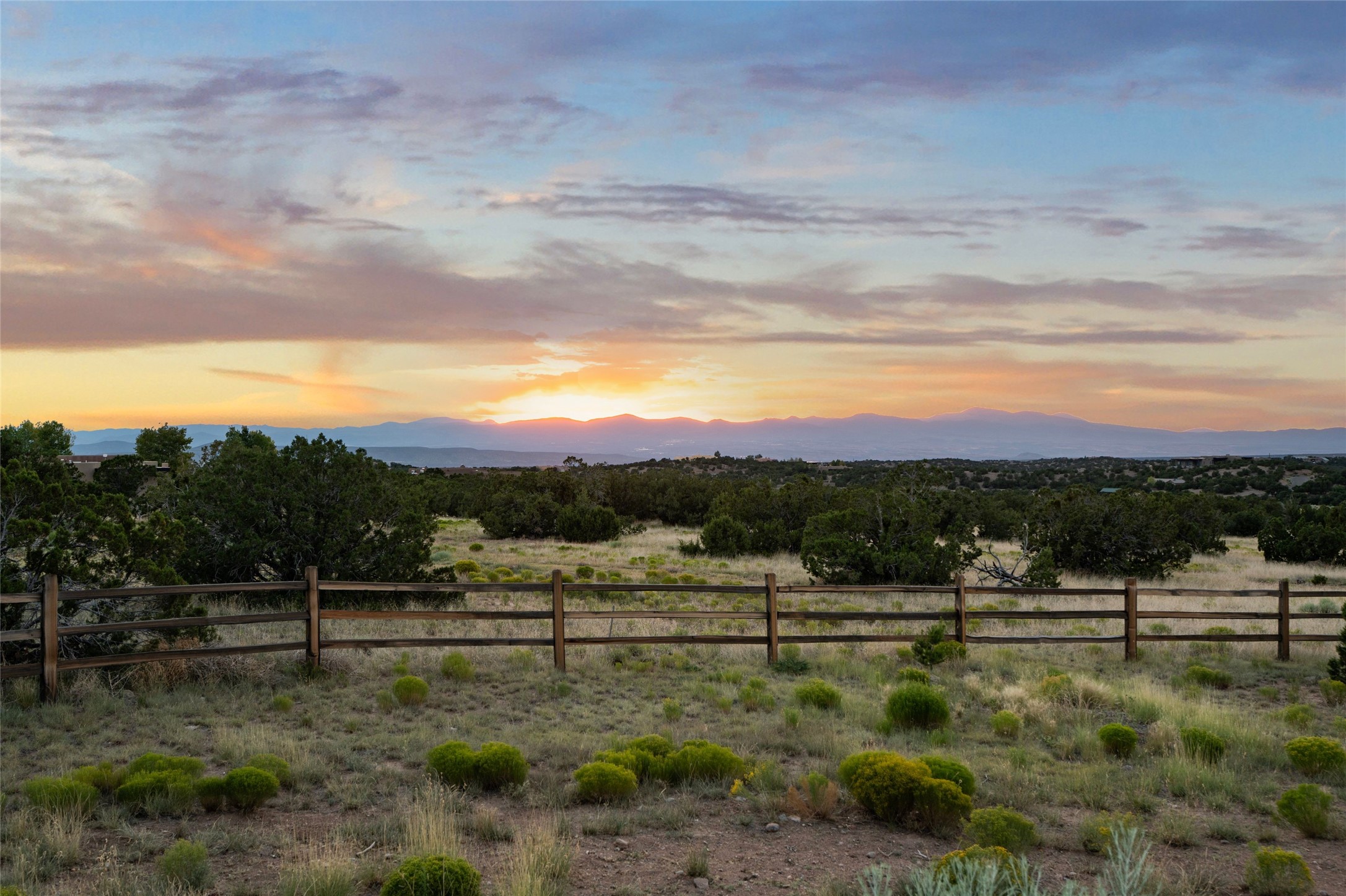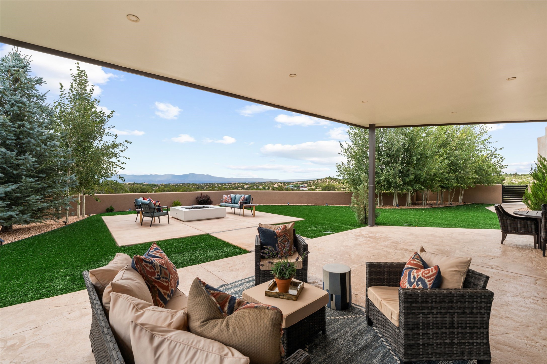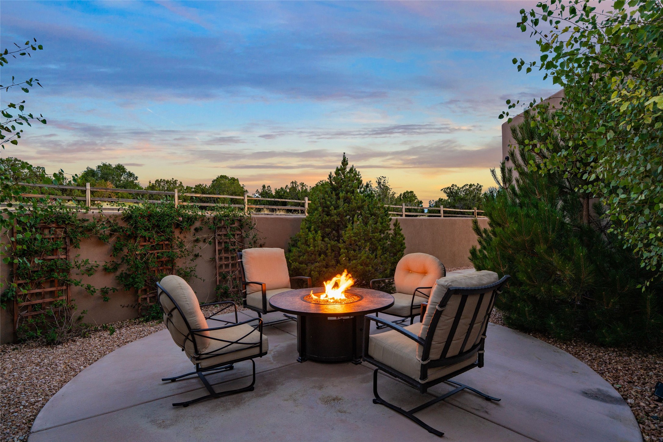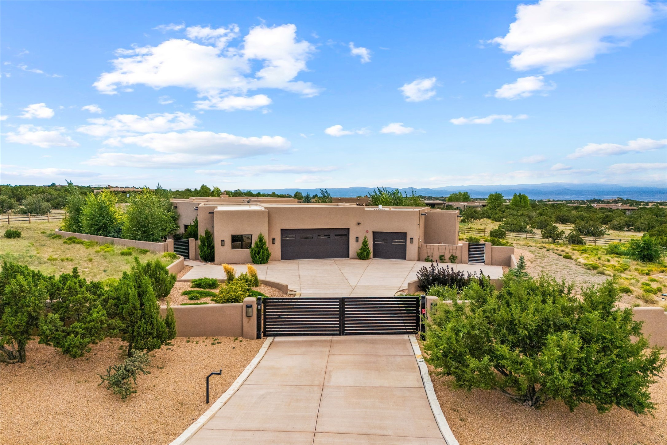 Santa Fe is a vibrant city and this is the home to enjoy it in. Nestled in one of the most sought after neighborhoods, this exceptional custom built home offers the perfect blend of luxury, tranquility, and design. Not far from the downtown, yet situated on 2.5 acres with breathtaking views in all directions. Not too grandiose but just the right amount of wonderful with tall beamed ceilings, tasteful wood floors and an impressive open concept that accommodates flawlessly while continually framing the captivating West views Santa Fe is famous for. Spend your mornings on the south of the home with a delightful seating area amongst fabulously landscaped outdoor spaces with mature spruce and aspen trees and fire pit but be sure to take in the evenings on the rear portal with the custom 65" Cubo Fire Table situated to capture the unparalleled views of the Jemez Mountains. With over a thousand sq ft of covered outdoor spaces, this is the ideal place to enjoy; as beautiful on the inside as on the outside and perfect for entertaining. Heated oversized three car garage, den/bedroom with extra soundproofing great for music enthusiasts or a media room, nicely appointed kitchen, bedrooms en suite, gated entry, Tpo roof, nearby trail systems, no dirt roads, Level 3 ev charger, whole home humidification system and more. If you're looking for a property that combines privacy, elegance, and a connection to the natural beauty of this incredible city, look no further. Come and experience this serene and tranquil beauty, and oh those outdoor spaces!