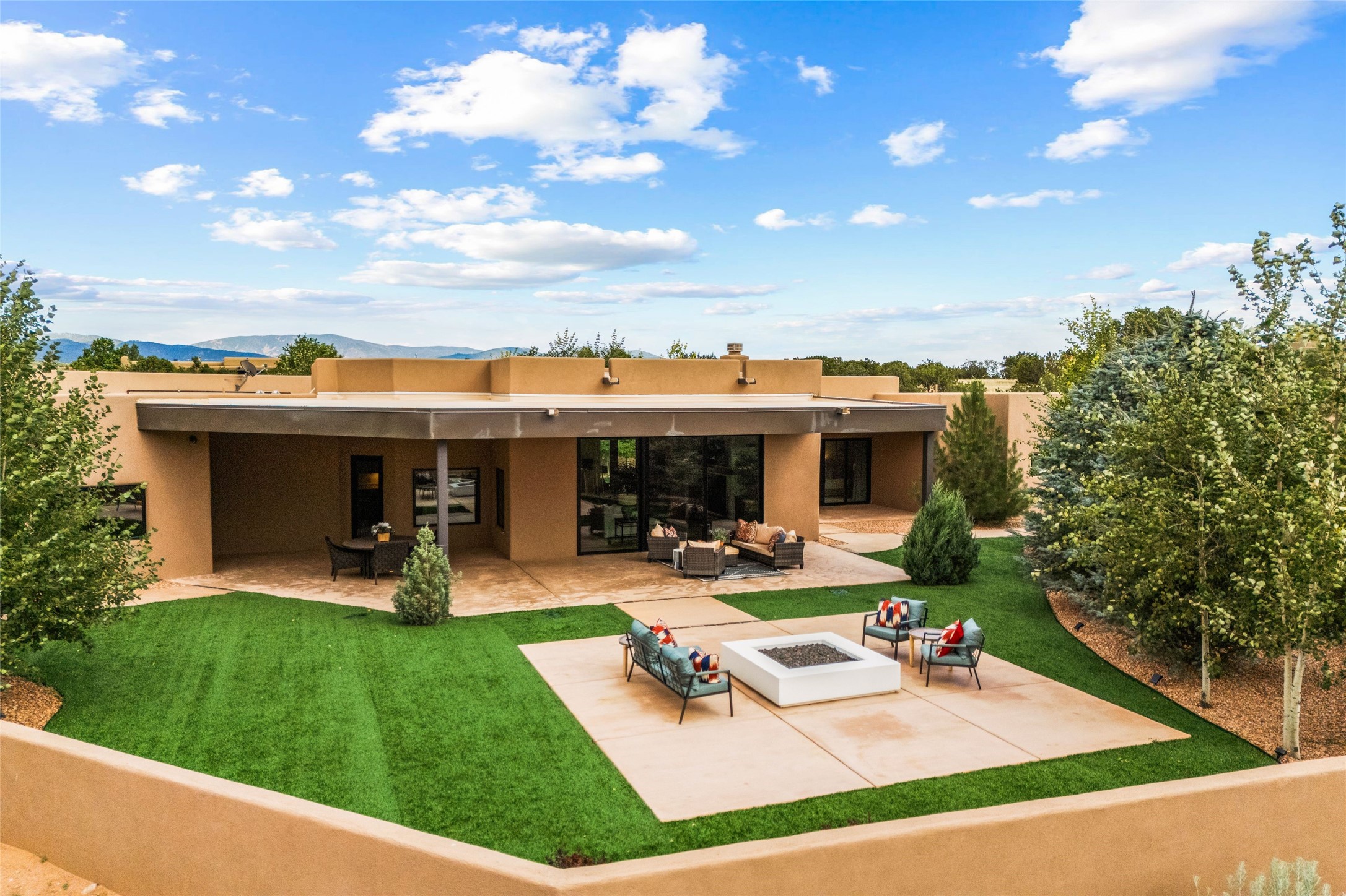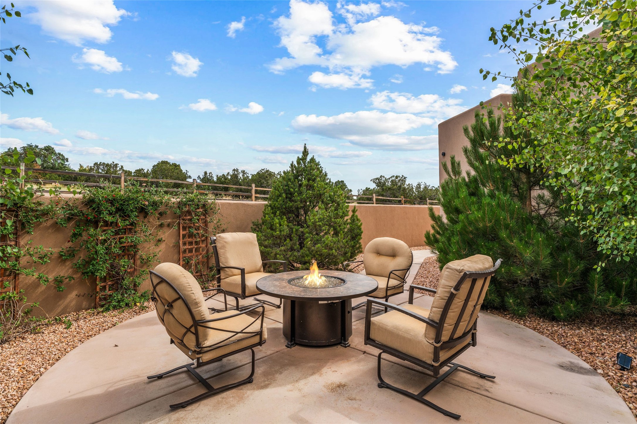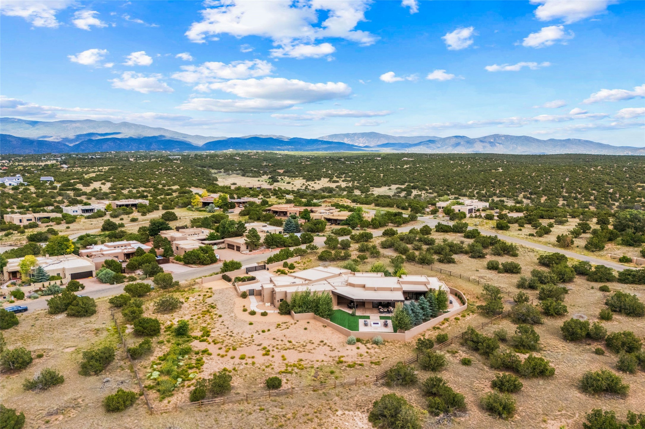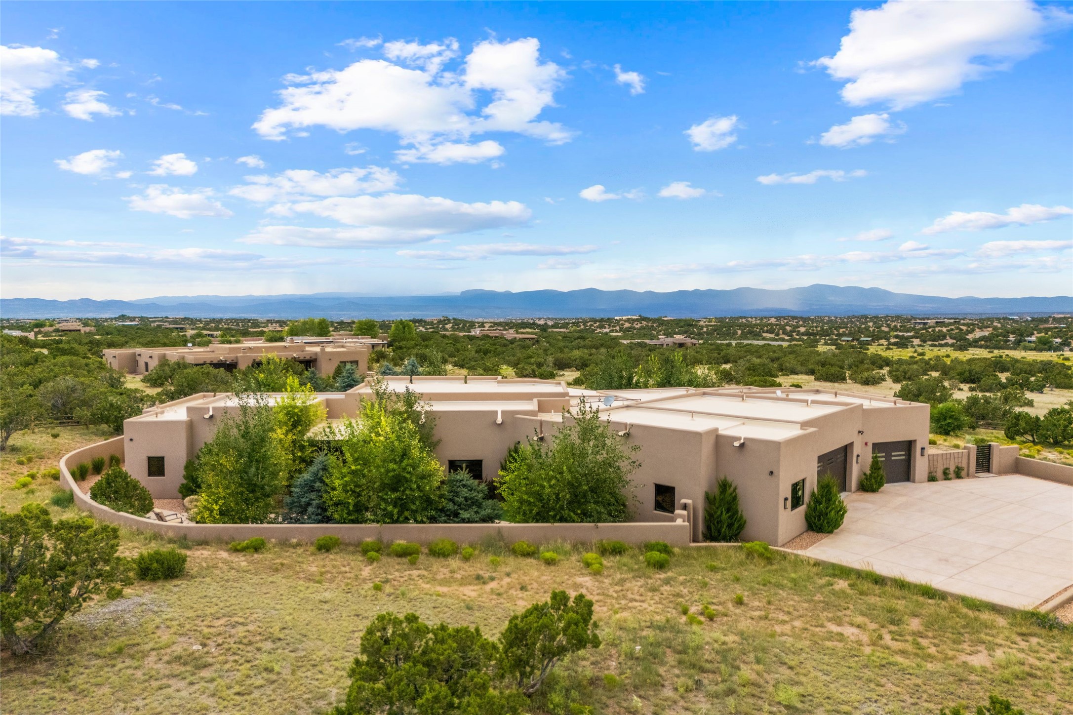 Santa Fe is a vibrant city and this is the home to enjoy it in. Nestled in one of the most sought after neighborhoods, this exceptional custom built home offers the perfect blend of luxury, tranquility, and design. Not far from the downtown, yet situated on 2.5 acres with breathtaking views in all directions. Not too grandiose but just the right amount of wonderful with tall beamed ceilings, tasteful wood floors and an impressive open concept that accommodates flawlessly while continually framing the captivating West views Santa Fe is famous for. Spend your mornings on the south of the home with a delightful seating area amongst fabulously landscaped outdoor spaces with mature spruce and aspen trees and fire pit but be sure to take in the evenings on the rear portal with the custom 65" Cubo Fire Table situated to capture the unparalleled views of the Jemez Mountains. With over a thousand sq ft of covered outdoor spaces, this is the ideal place to enjoy; as beautiful on the inside as on the outside and perfect for entertaining. Heated oversized three car garage, den/bedroom with extra soundproofing great for music enthusiasts or a media room, nicely appointed kitchen, bedrooms en suite, gated entry, Tpo roof, nearby trail systems, no dirt roads, Level 3 ev charger, whole home humidification system and more. If you're looking for a property that combines privacy, elegance, and a connection to the natural beauty of this incredible city, look no further. Come and experience this serene and tranquil beauty, and oh those outdoor spaces!