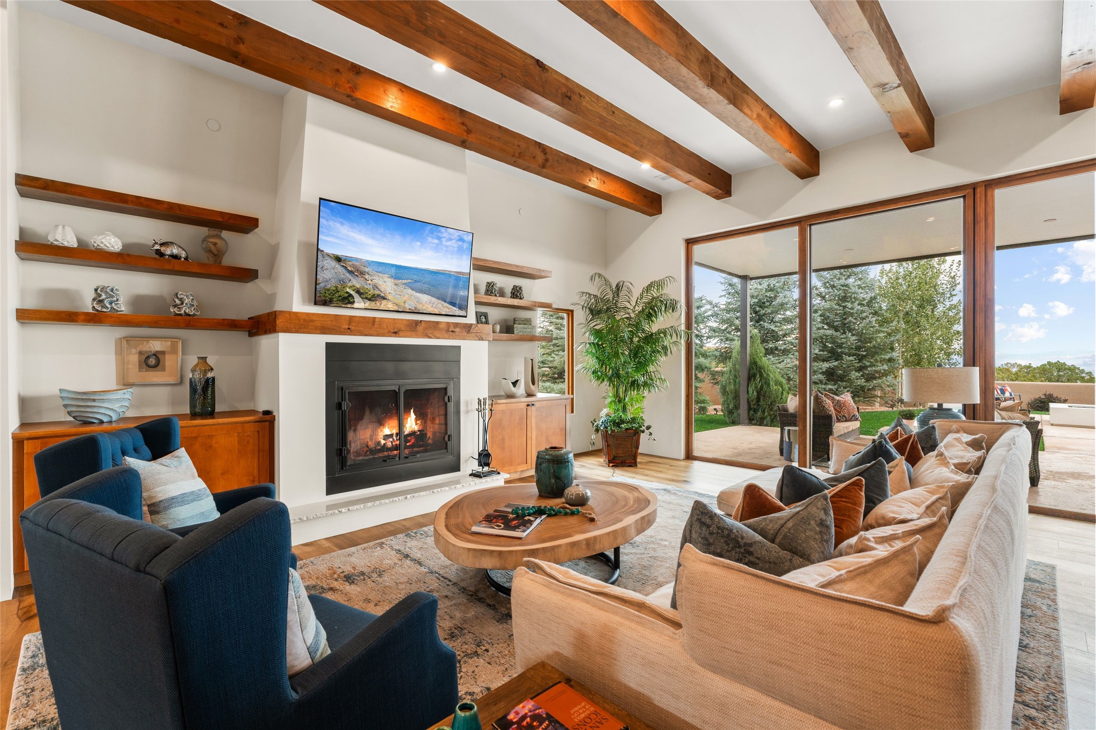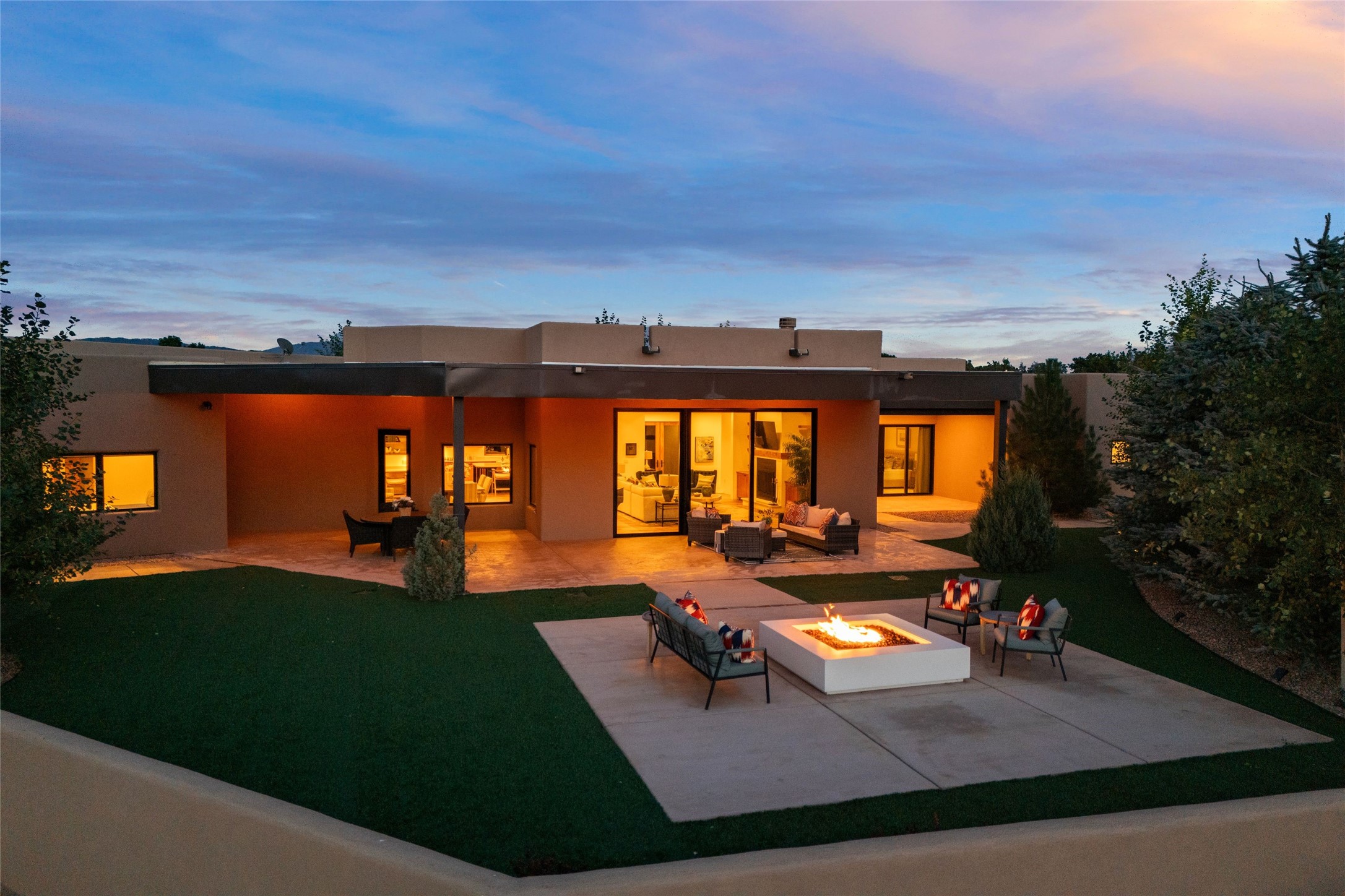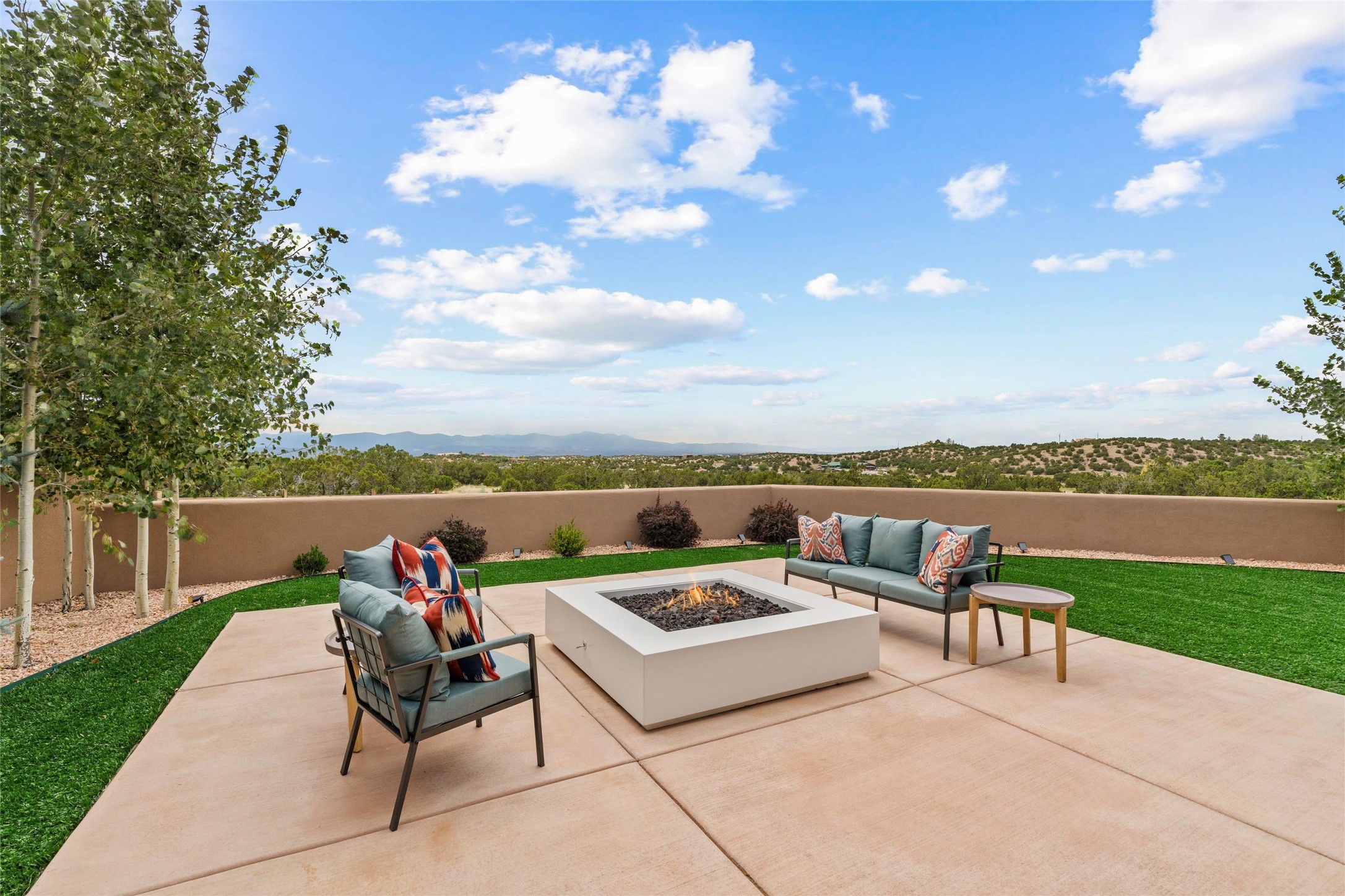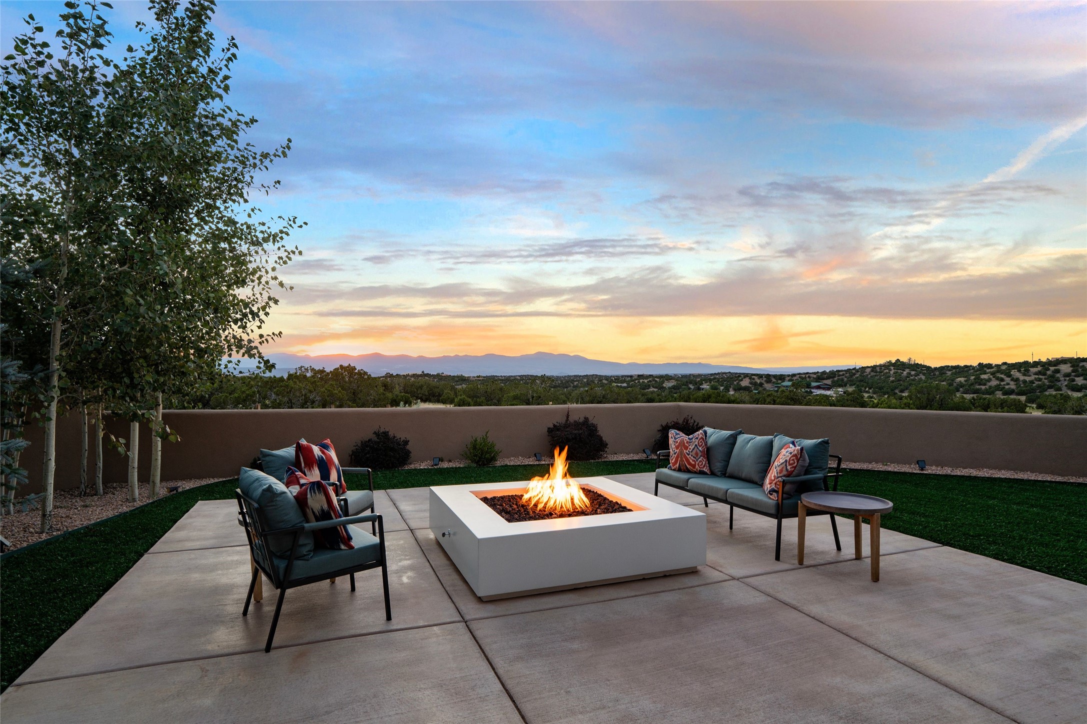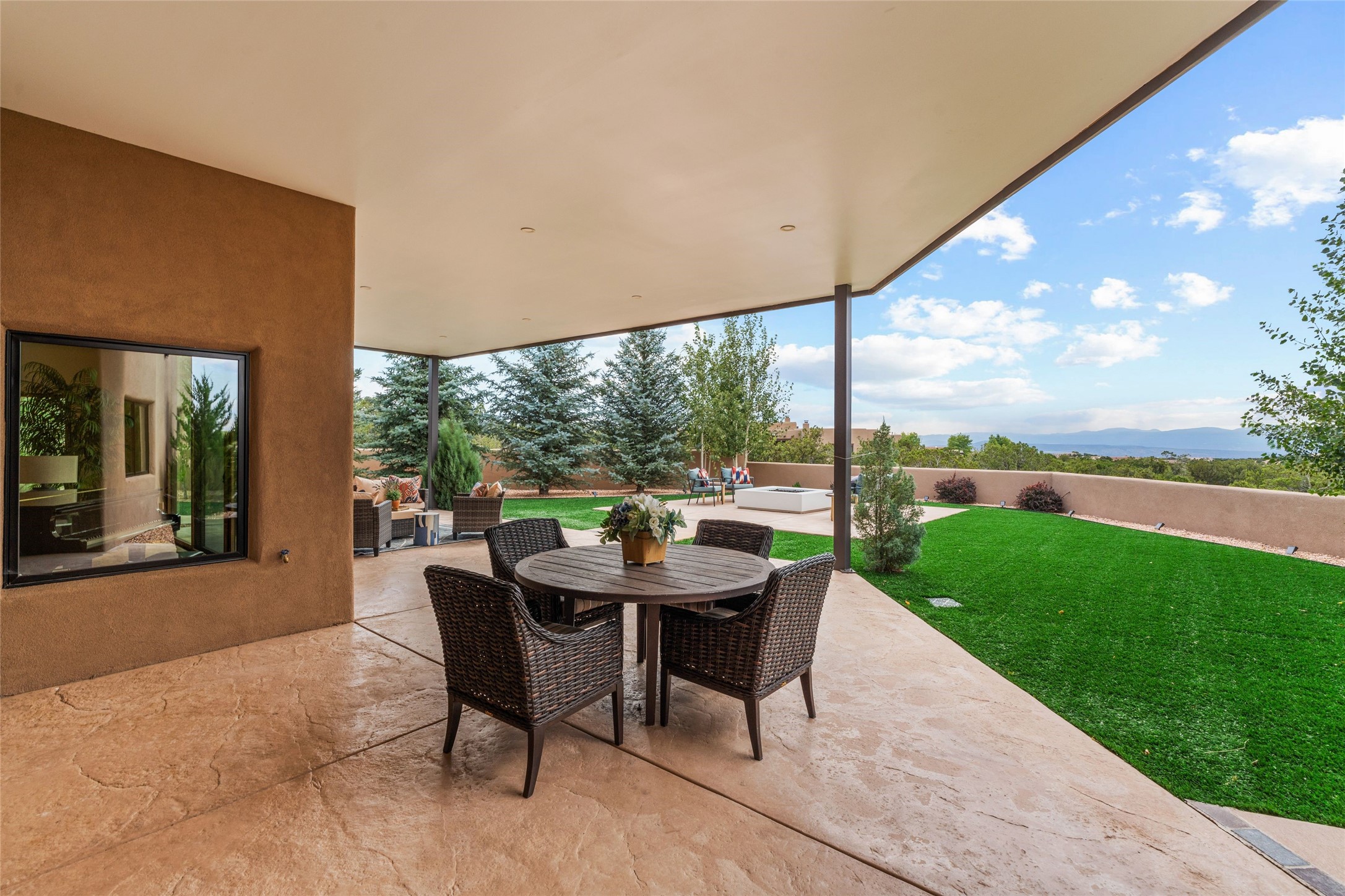 Santa Fe is a vibrant city and this is the home to enjoy it in. Nestled in one of the most sought after neighborhoods, this exceptional custom built home offers the perfect blend of luxury, tranquility, and design. Not far from the downtown, yet situated on 2.5 acres with breathtaking views in all directions. Not too grandiose but just the right amount of wonderful with tall beamed ceilings, tasteful wood floors and an impressive open concept that accommodates flawlessly while continually framing the captivating West views Santa Fe is famous for. Spend your mornings on the south of the home with a delightful seating area amongst fabulously landscaped outdoor spaces with mature spruce and aspen trees and fire pit but be sure to take in the evenings on the rear portal with the custom 65" Cubo Fire Table situated to capture the unparalleled views of the Jemez Mountains. With over a thousand sq ft of covered outdoor spaces, this is the ideal place to enjoy; as beautiful on the inside as on the outside and perfect for entertaining. Heated oversized three car garage, den/bedroom with extra soundproofing great for music enthusiasts or a media room, nicely appointed kitchen, bedrooms en suite, gated entry, Tpo roof, nearby trail systems, no dirt roads, Level 3 ev charger, whole home humidification system and more. If you're looking for a property that combines privacy, elegance, and a connection to the natural beauty of this incredible city, look no further. Come and experience this serene and tranquil beauty, and oh those outdoor spaces!
