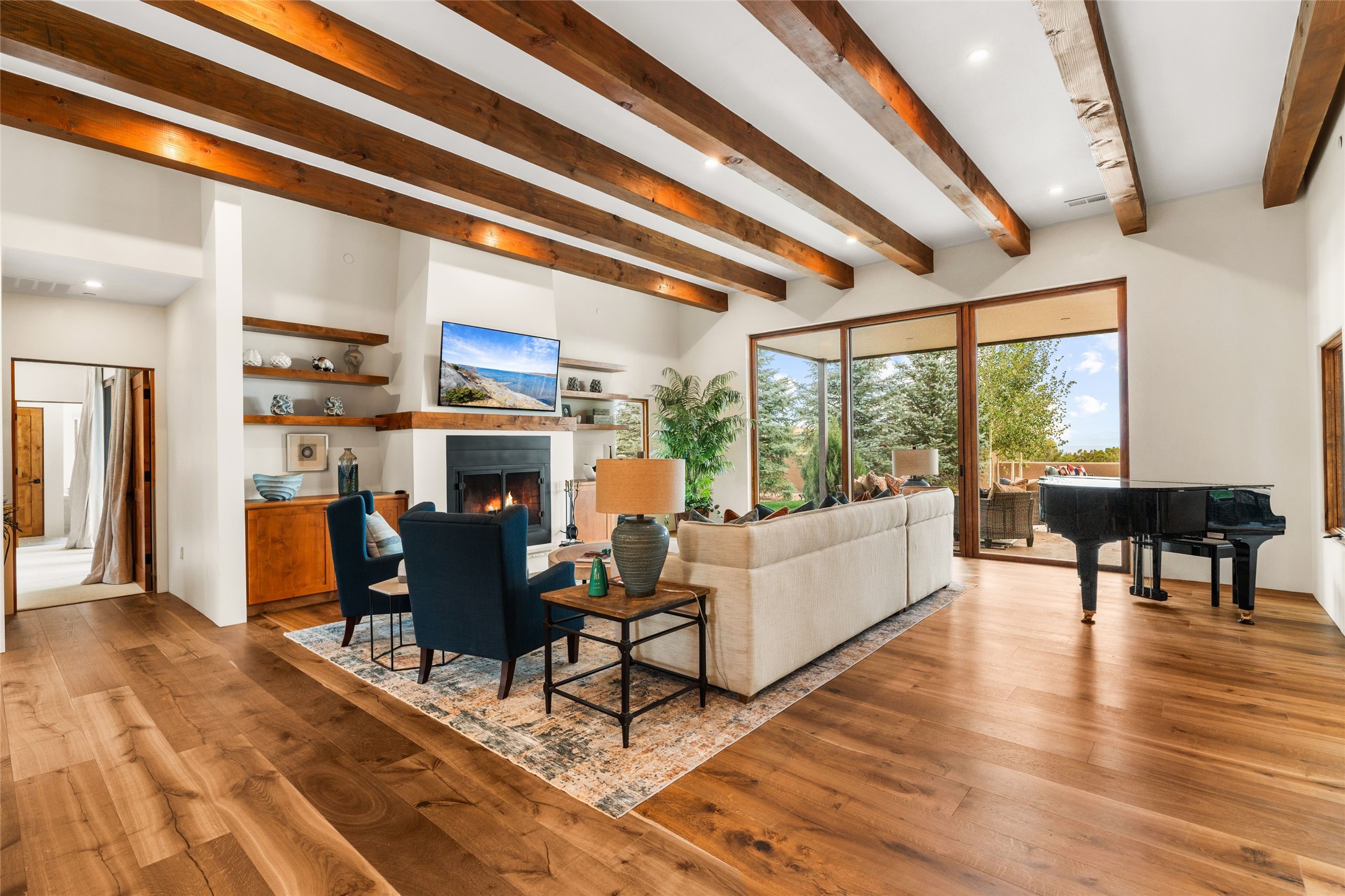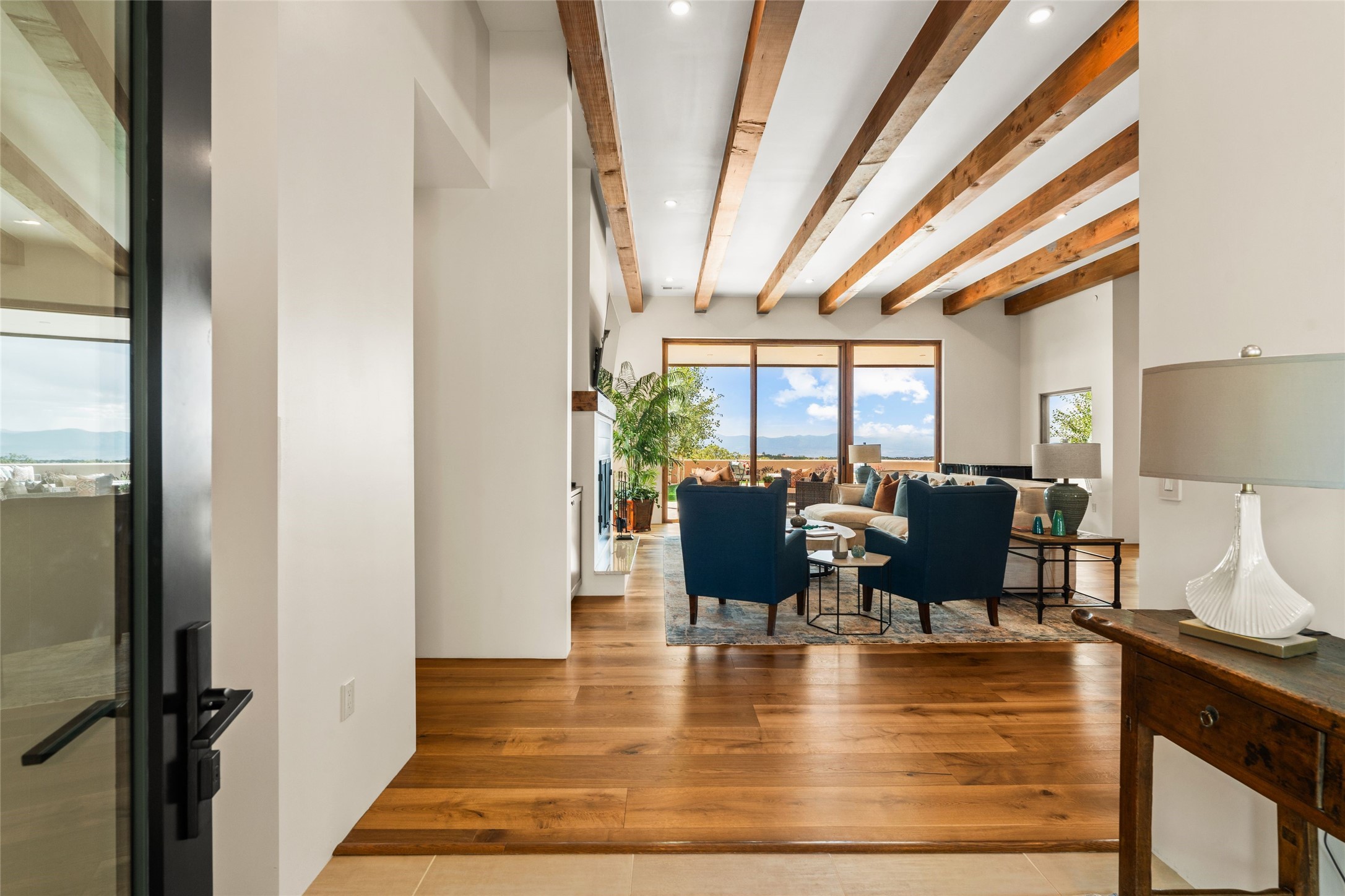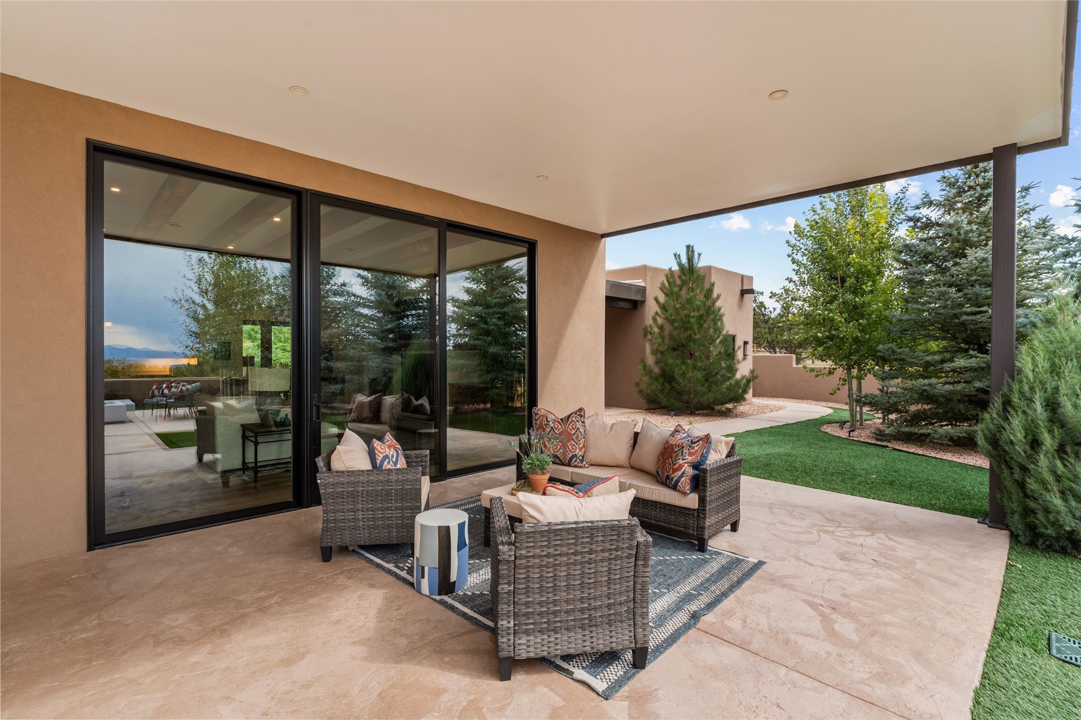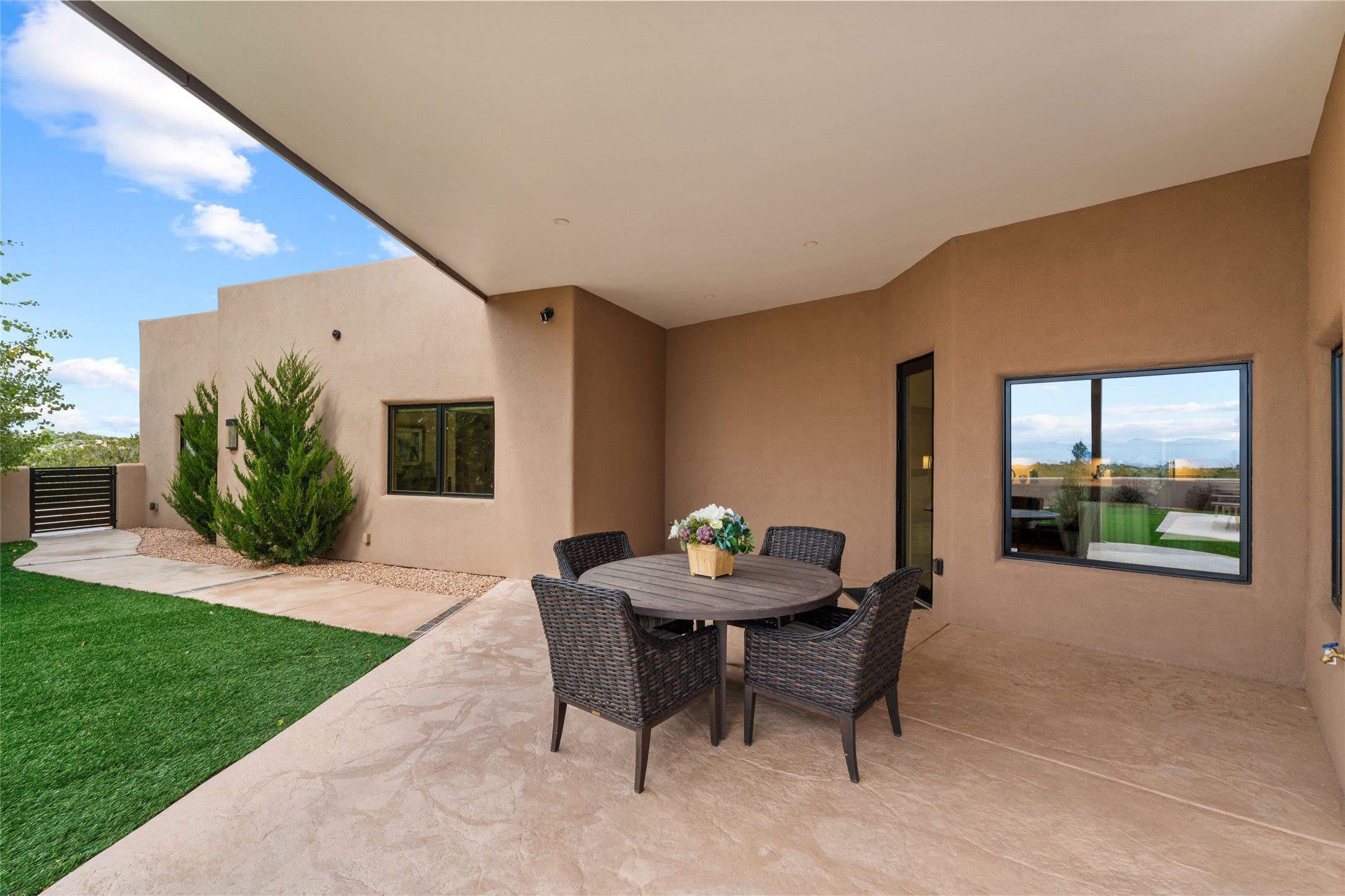 Santa Fe is a vibrant city and this is the home to enjoy it in. Nestled in one of the most sought after neighborhoods, this exceptional custom built home offers the perfect blend of luxury, tranquility, and design. Not far from the downtown, yet situated on 2.5 acres with breathtaking views in all directions. Not too grandiose but just the right amount of wonderful with tall beamed ceilings, tasteful wood floors and an impressive open concept that accommodates flawlessly while continually framing the captivating West views Santa Fe is famous for. Spend your mornings on the south of the home with a delightful seating area amongst fabulously landscaped outdoor spaces with mature spruce and aspen trees and fire pit but be sure to take in the evenings on the rear portal with the custom 65" Cubo Fire Table situated to capture the unparalleled views of the Jemez Mountains. With over a thousand sq ft of covered outdoor spaces, this is the ideal place to enjoy; as beautiful on the inside as on the outside and perfect for entertaining. Heated oversized three car garage, den/bedroom with extra soundproofing great for music enthusiasts or a media room, nicely appointed kitchen, bedrooms en suite, gated entry, Tpo roof, nearby trail systems, no dirt roads, Level 3 ev charger, whole home humidification system and more. If you're looking for a property that combines privacy, elegance, and a connection to the natural beauty of this incredible city, look no further. Come and experience this serene and tranquil beauty, and oh those outdoor spaces!