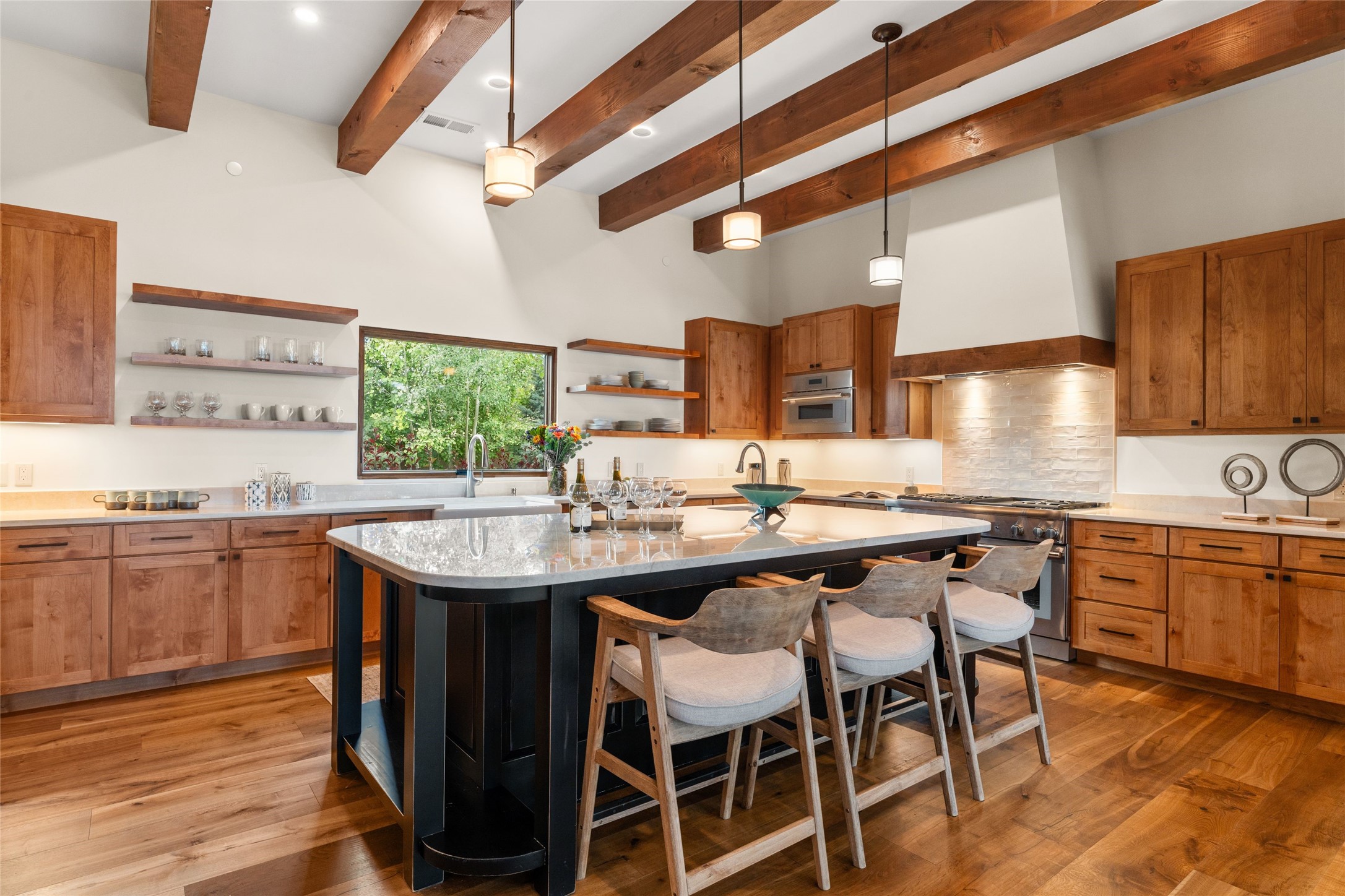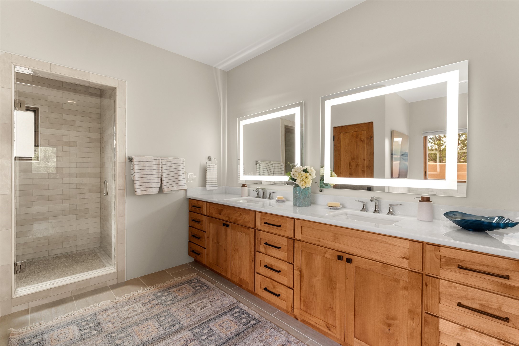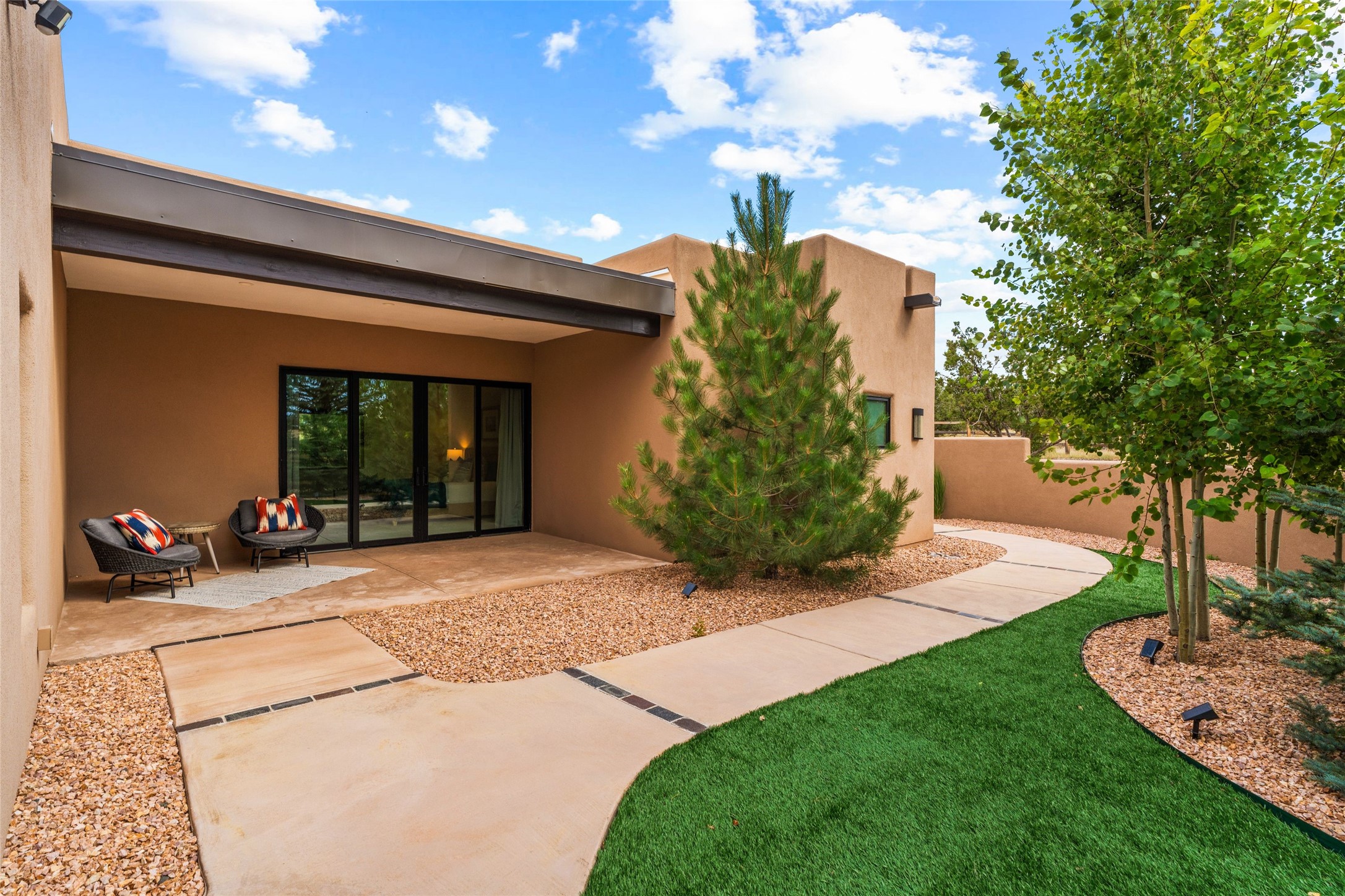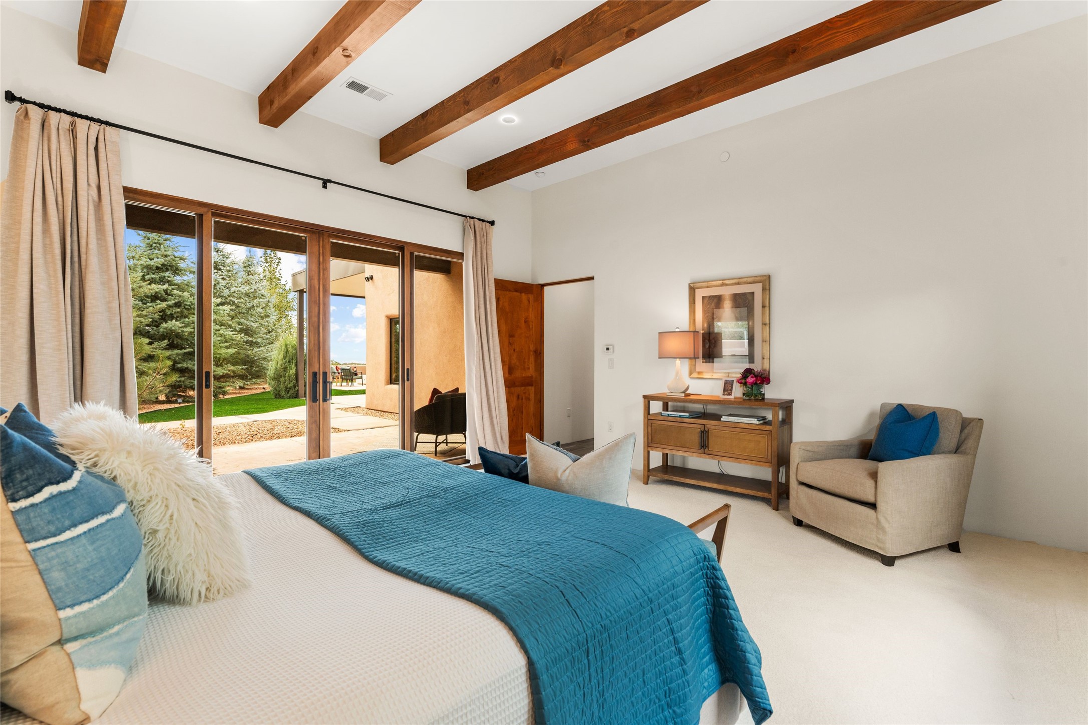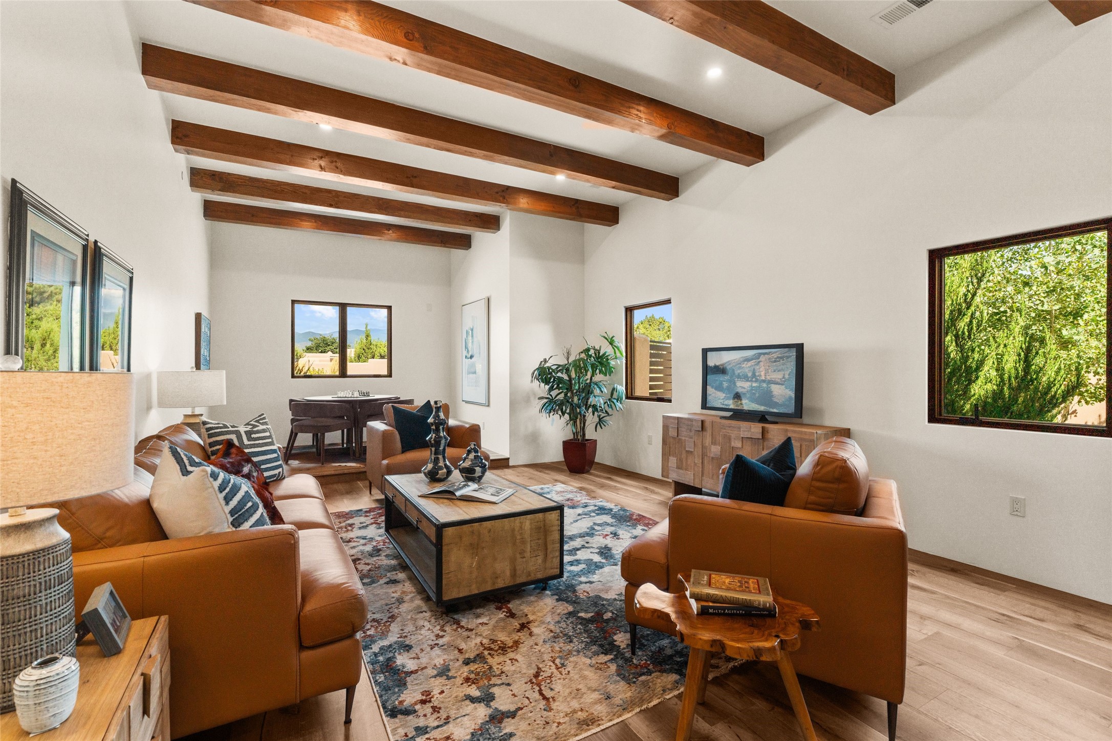 Santa Fe is a vibrant city and this is the home to enjoy it in. Nestled in one of the most sought after neighborhoods, this exceptional custom built home offers the perfect blend of luxury, tranquility, and design. Not far from the downtown, yet situated on 2.5 acres with breathtaking views in all directions. Not too grandiose but just the right amount of wonderful with tall beamed ceilings, tasteful wood floors and an impressive open concept that accommodates flawlessly while continually framing the captivating West views Santa Fe is famous for. Spend your mornings on the south of the home with a delightful seating area amongst fabulously landscaped outdoor spaces with mature spruce and aspen trees and fire pit but be sure to take in the evenings on the rear portal with the custom 65" Cubo Fire Table situated to capture the unparalleled views of the Jemez Mountains. With over a thousand sq ft of covered outdoor spaces, this is the ideal place to enjoy; as beautiful on the inside as on the outside and perfect for entertaining. Heated oversized three car garage, den/bedroom with extra soundproofing great for music enthusiasts or a media room, nicely appointed kitchen, bedrooms en suite, gated entry, Tpo roof, nearby trail systems, no dirt roads, Level 3 ev charger, whole home humidification system and more. If you're looking for a property that combines privacy, elegance, and a connection to the natural beauty of this incredible city, look no further. Come and experience this serene and tranquil beauty, and oh those outdoor spaces!