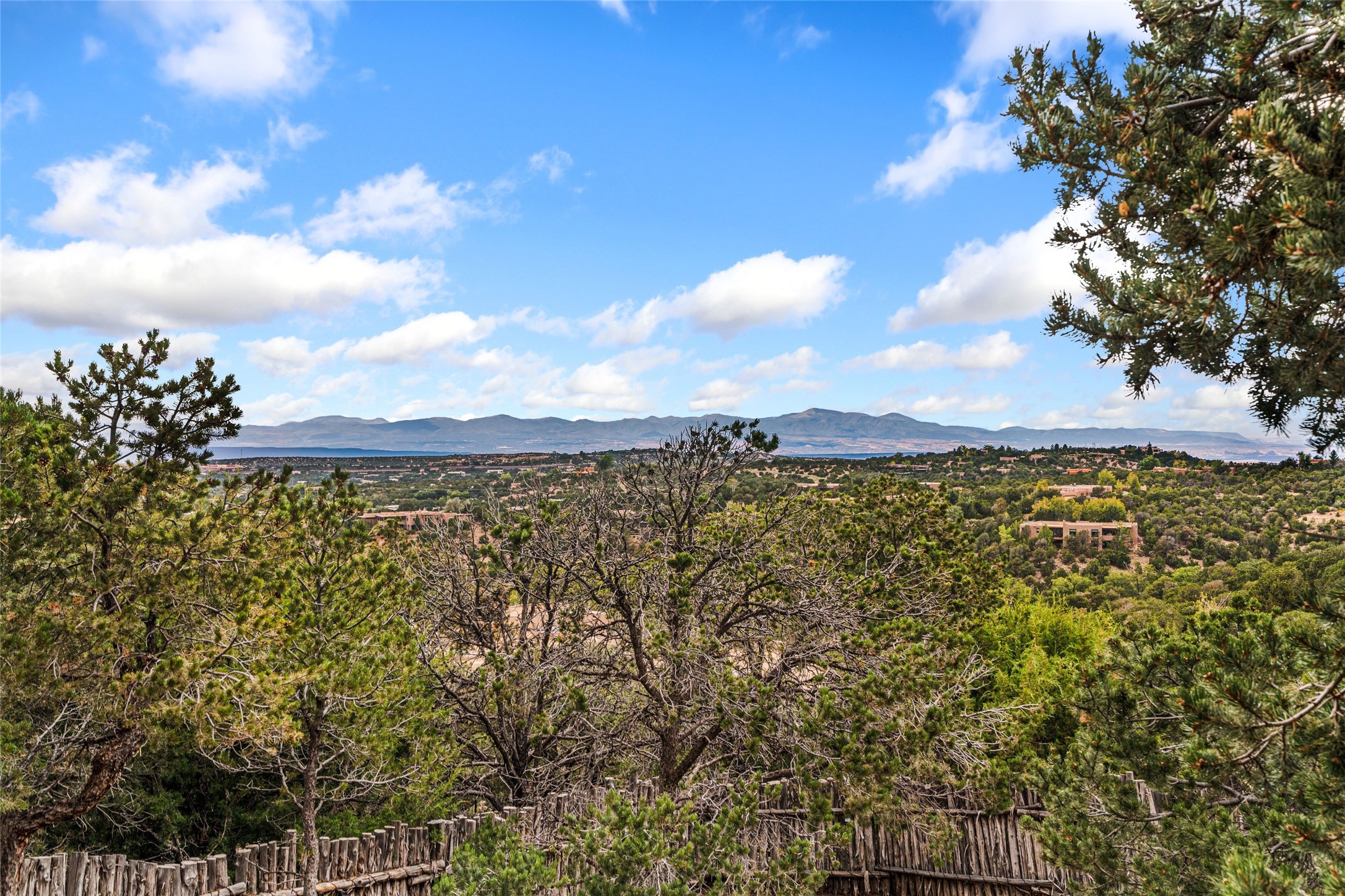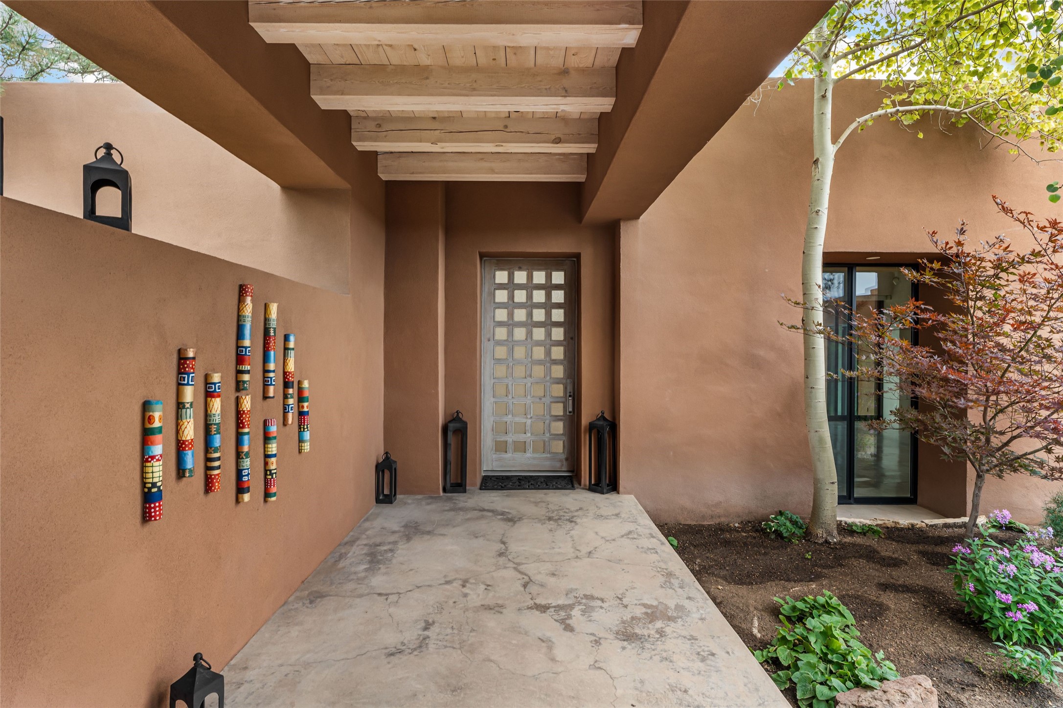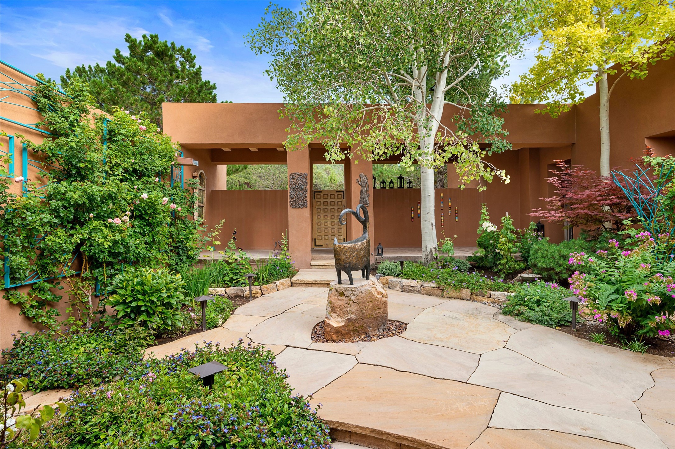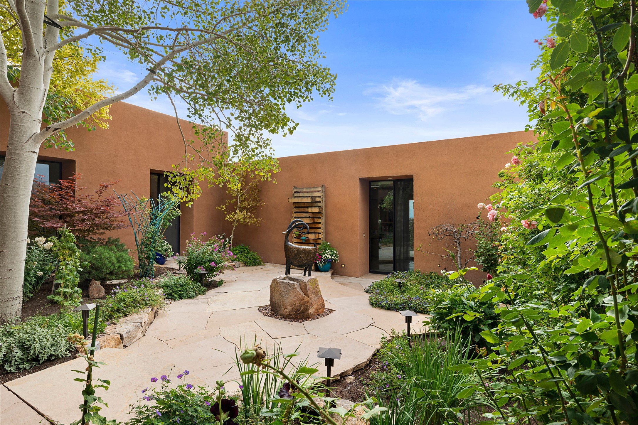 This distinctive Fred-Kline-designed contemporary home in the desirable Sierra de Norte neighborhood was thoughtfully sited to enjoy sweeping views of the Jemez and Sandia Mountains and Santa Fe city lights form its location on 1.29 rugged high-desert acres. A serene central courtyard strewn with aspens, evergreens, thriving perennials, and colorful roses and other flowering plants introduces the pervasive alluring style. Sophisticated and streamlined, the generous interiors begin with an elegant living room featuring soaring beamed ceilings, a Rumford fireplace, and a wall of floor-to ceiling windows admitting wonderful light and outlooks. Beyond are a formal dining room with doors to a portal designed for alfresco outdoor entertaining and a kitchen featuring an island, top-caliber stainless-steel appliances, stunning views, and a comfortable breakfast or sitting area with a fireplace. One of three bedrooms, the primary suite gazes south and west and includes a fireplace in the bedroom and an elegant bath with dual vanities and walk-in closets, a glass-enclosed shower, and a soaking tub with a picturesque view. Each of the two guest bedrooms-well separated for quiet privacy- is accompanied by an en suite bath; one benefits from a kitchenette, a kiva fireplace, and easy access to a relaxing sauna room. On the eastern side of the home is an office with a wraparound built-in desk as well as abundant cabinets, drawers, and bookshelves. Other highlights include walls and lighting ideal for displaying an art collection, a built-in grilling area and an outdoor fireplace on one of the portales, an oversized two car-garage, a versatile studio or workshop with an overhead door, and a large lower-level area ideal for storage, a recreation room, or additional work space. This singular offering is a rare opportunity not to be missed by the eager, discerning buyer.