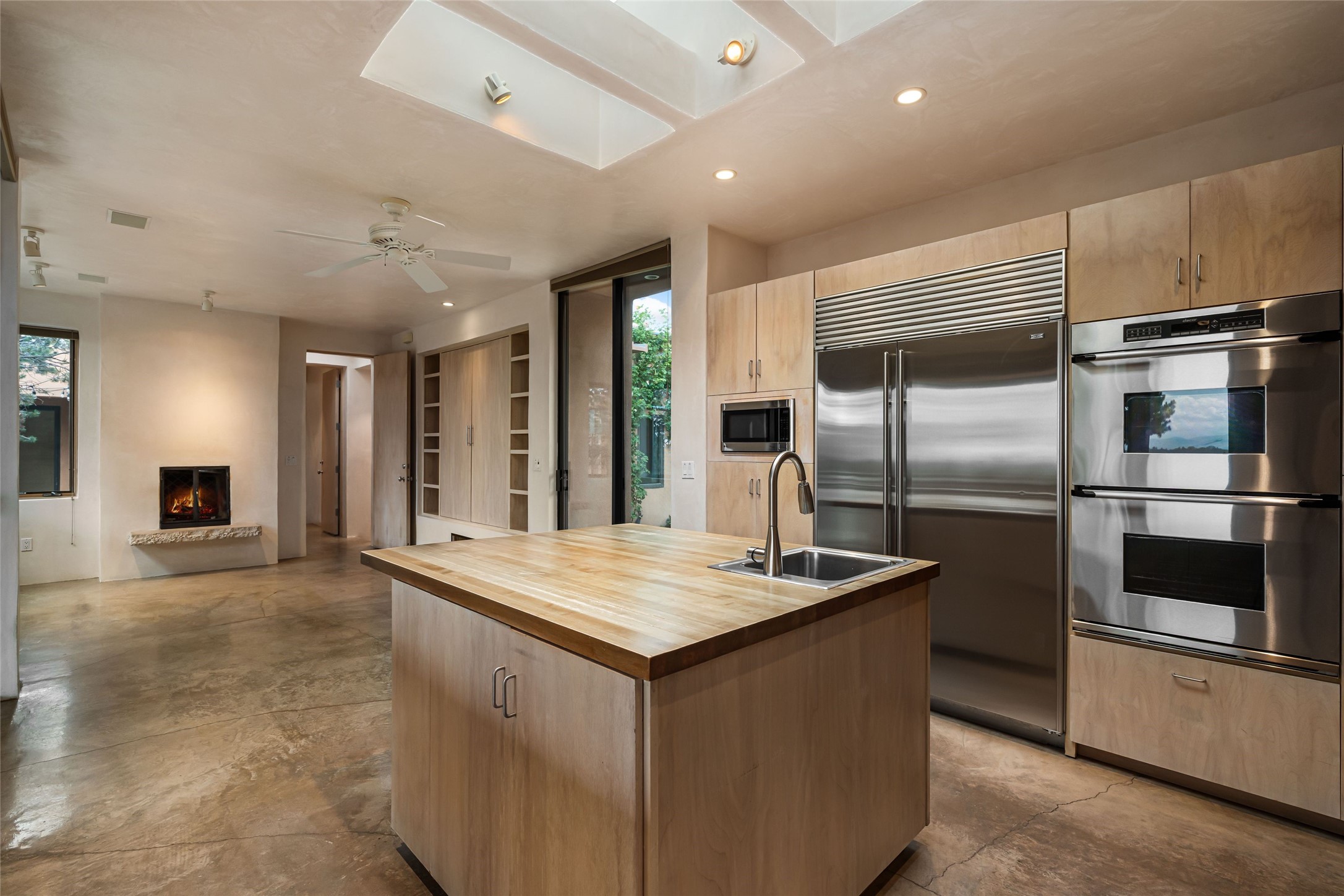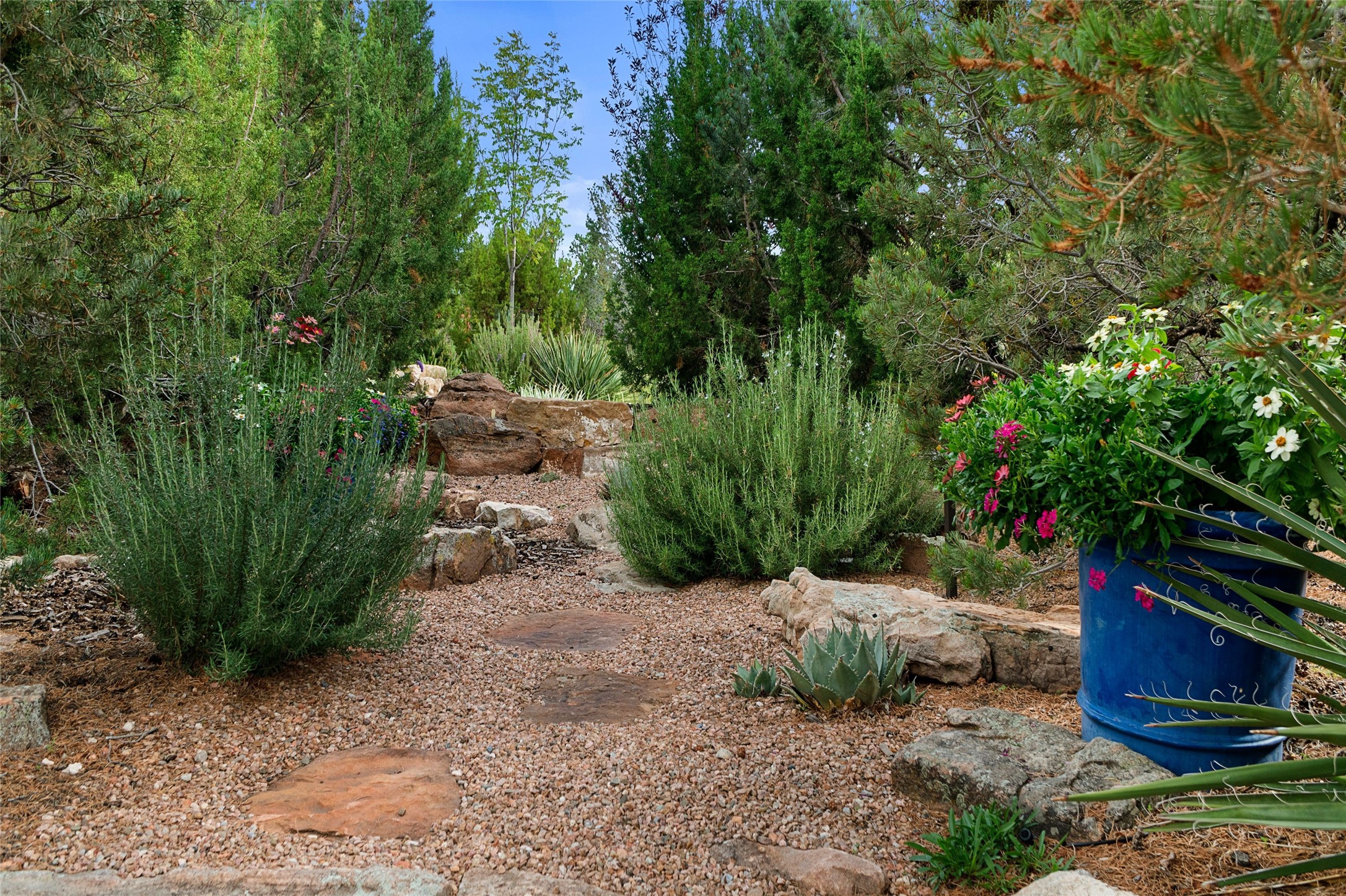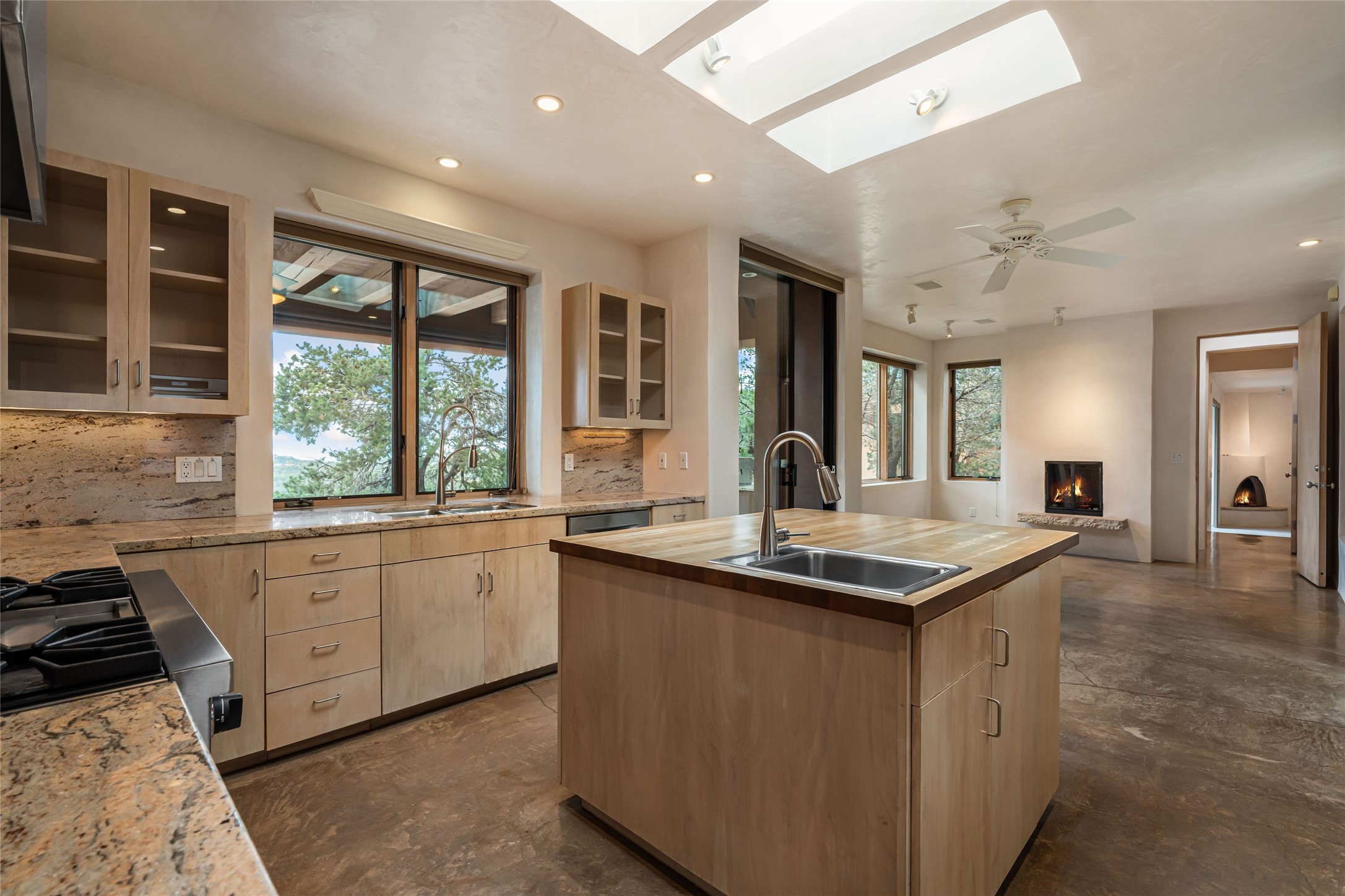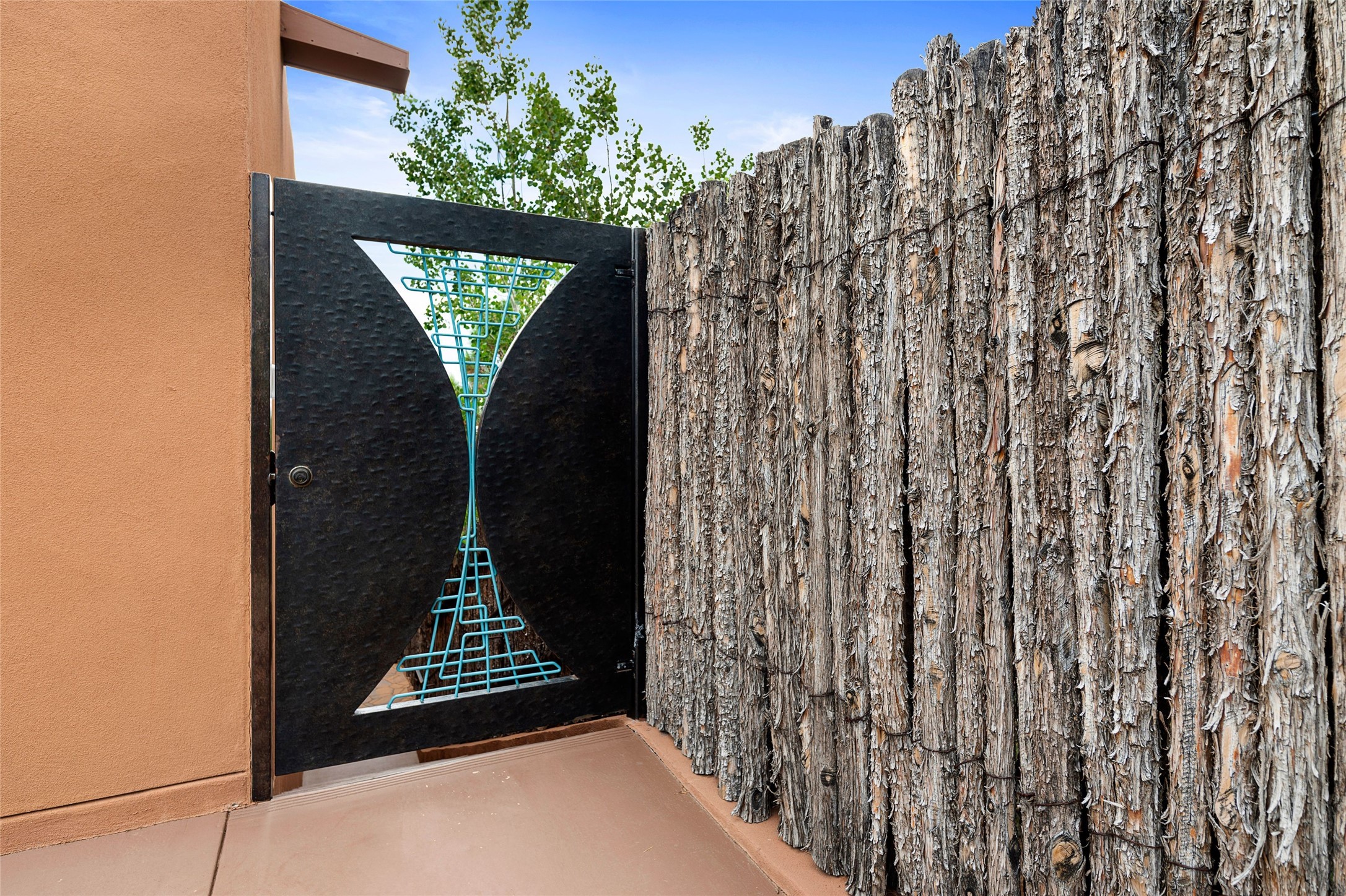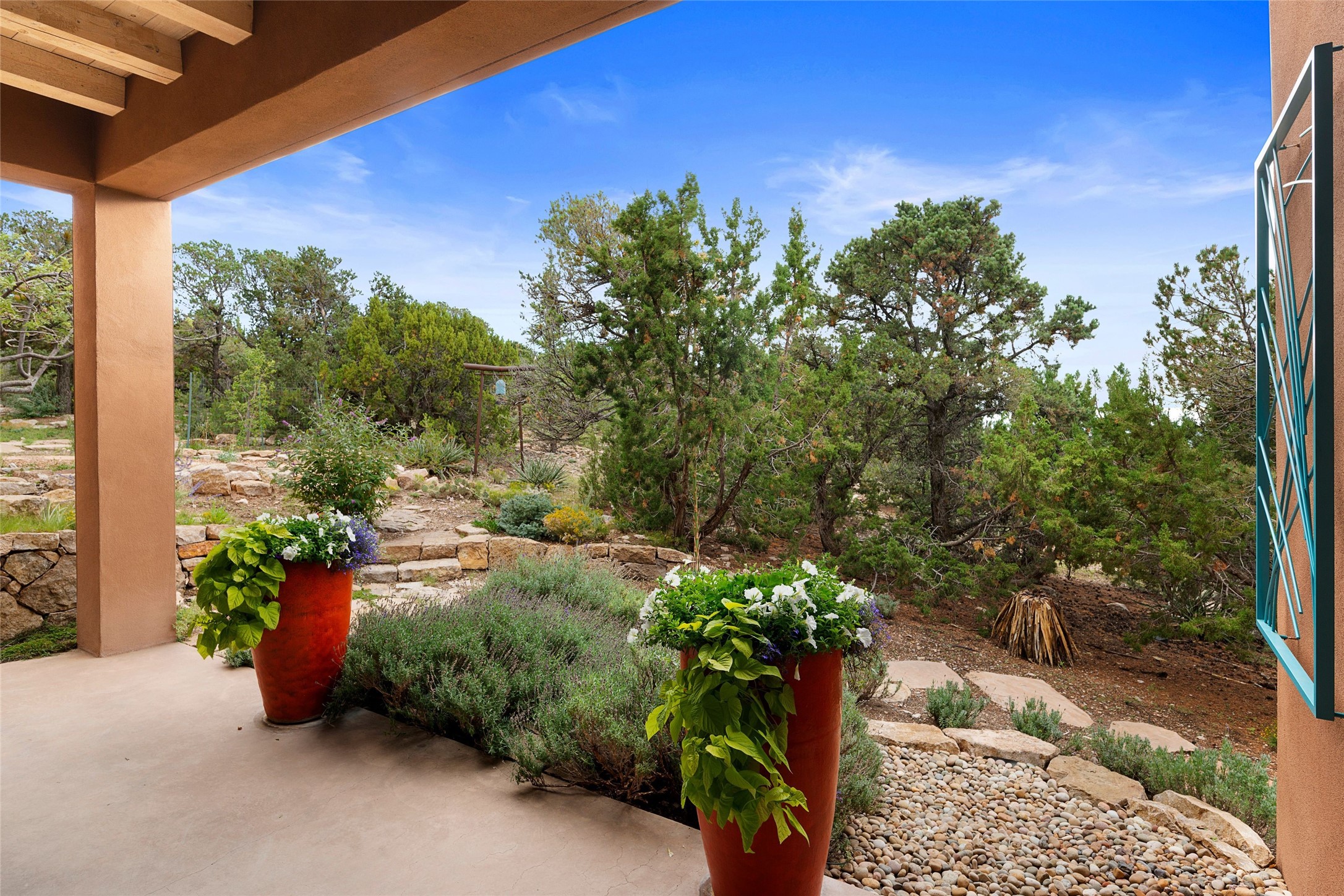 This distinctive Fred-Kline-designed contemporary home in the desirable Sierra de Norte neighborhood was thoughtfully sited to enjoy sweeping views of the Jemez and Sandia Mountains and Santa Fe city lights form its location on 1.29 rugged high-desert acres. A serene central courtyard strewn with aspens, evergreens, thriving perennials, and colorful roses and other flowering plants introduces the pervasive alluring style. Sophisticated and streamlined, the generous interiors begin with an elegant living room featuring soaring beamed ceilings, a Rumford fireplace, and a wall of floor-to ceiling windows admitting wonderful light and outlooks. Beyond are a formal dining room with doors to a portal designed for alfresco outdoor entertaining and a kitchen featuring an island, top-caliber stainless-steel appliances, stunning views, and a comfortable breakfast or sitting area with a fireplace. One of three bedrooms, the primary suite gazes south and west and includes a fireplace in the bedroom and an elegant bath with dual vanities and walk-in closets, a glass-enclosed shower, and a soaking tub with a picturesque view. Each of the two guest bedrooms-well separated for quiet privacy- is accompanied by an en suite bath; one benefits from a kitchenette, a kiva fireplace, and easy access to a relaxing sauna room. On the eastern side of the home is an office with a wraparound built-in desk as well as abundant cabinets, drawers, and bookshelves. Other highlights include walls and lighting ideal for displaying an art collection, a built-in grilling area and an outdoor fireplace on one of the portales, an oversized two car-garage, a versatile studio or workshop with an overhead door, and a large lower-level area ideal for storage, a recreation room, or additional work space. This singular offering is a rare opportunity not to be missed by the eager, discerning buyer.