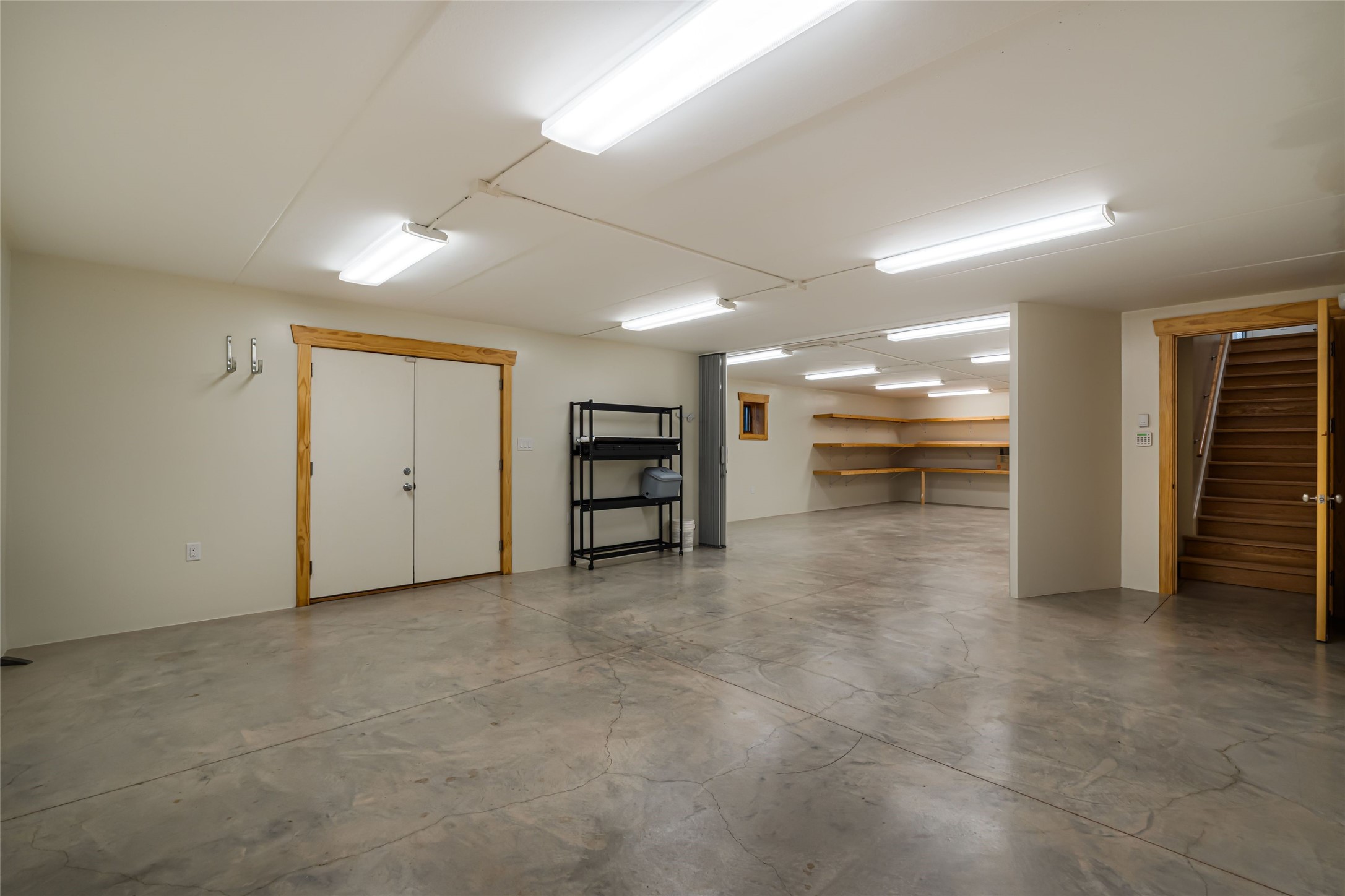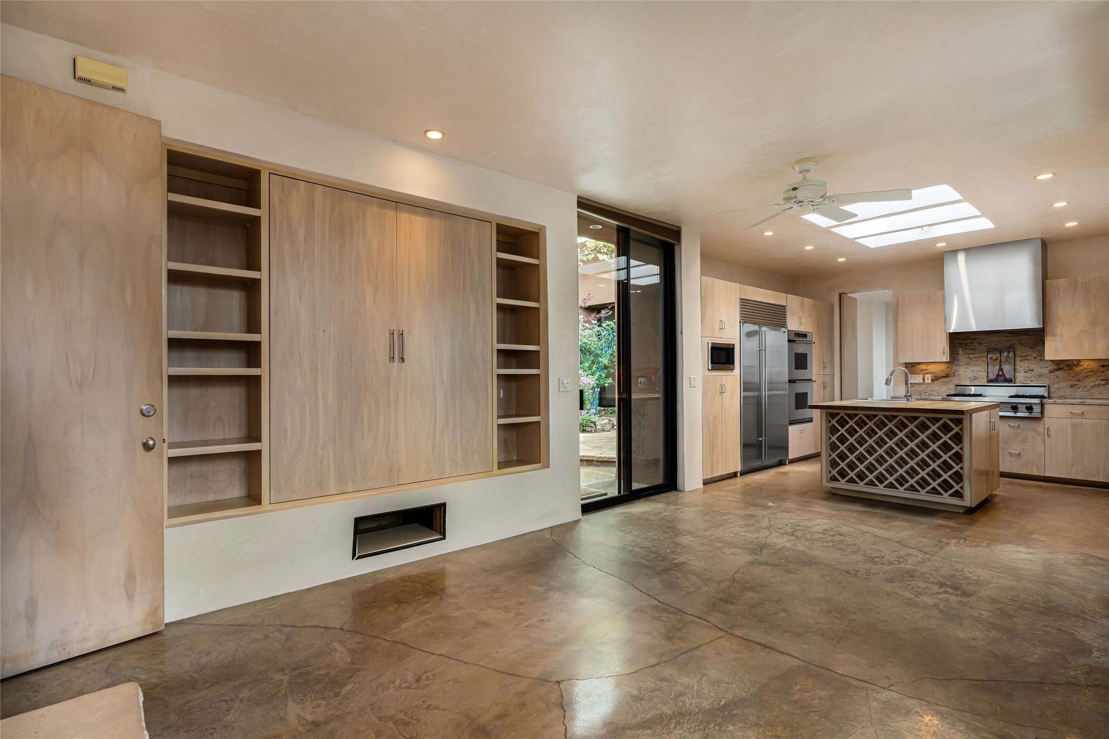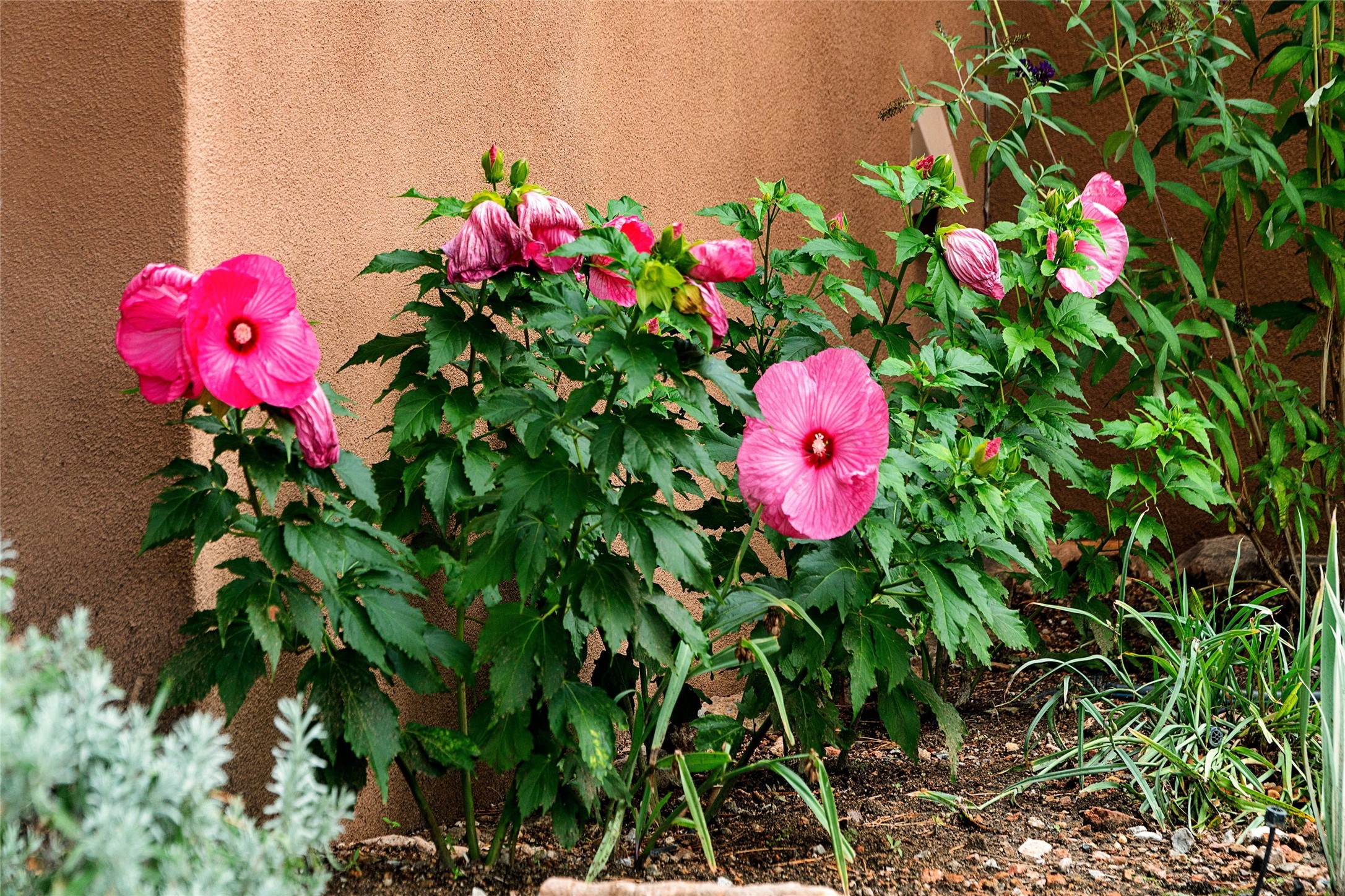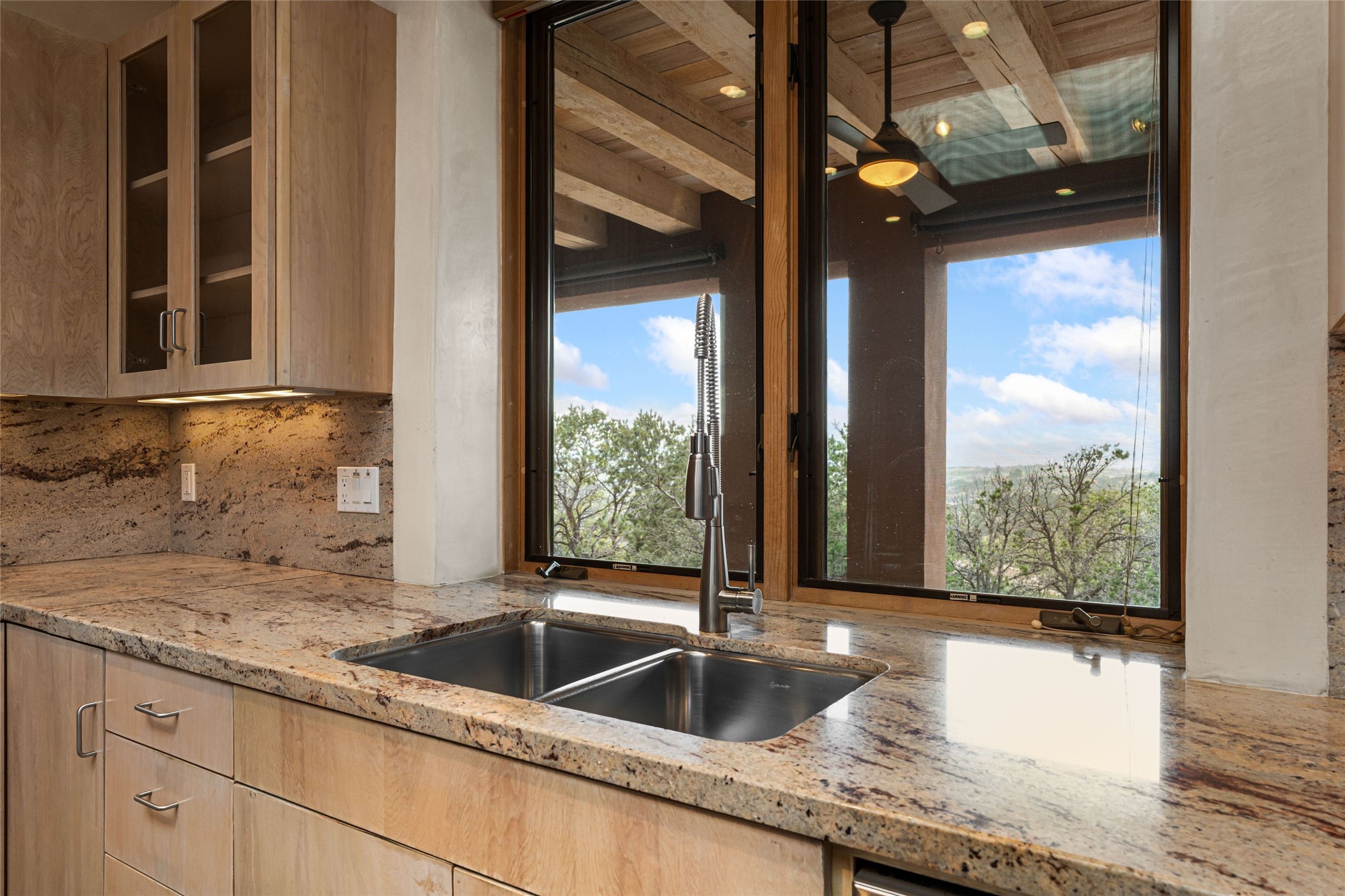 This distinctive Fred-Kline-designed contemporary home in the desirable Sierra de Norte neighborhood was thoughtfully sited to enjoy sweeping views of the Jemez and Sandia Mountains and Santa Fe city lights form its location on 1.29 rugged high-desert acres. A serene central courtyard strewn with aspens, evergreens, thriving perennials, and colorful roses and other flowering plants introduces the pervasive alluring style. Sophisticated and streamlined, the generous interiors begin with an elegant living room featuring soaring beamed ceilings, a Rumford fireplace, and a wall of floor-to ceiling windows admitting wonderful light and outlooks. Beyond are a formal dining room with doors to a portal designed for alfresco outdoor entertaining and a kitchen featuring an island, top-caliber stainless-steel appliances, stunning views, and a comfortable breakfast or sitting area with a fireplace. One of three bedrooms, the primary suite gazes south and west and includes a fireplace in the bedroom and an elegant bath with dual vanities and walk-in closets, a glass-enclosed shower, and a soaking tub with a picturesque view. Each of the two guest bedrooms-well separated for quiet privacy- is accompanied by an en suite bath; one benefits from a kitchenette, a kiva fireplace, and easy access to a relaxing sauna room. On the eastern side of the home is an office with a wraparound built-in desk as well as abundant cabinets, drawers, and bookshelves. Other highlights include walls and lighting ideal for displaying an art collection, a built-in grilling area and an outdoor fireplace on one of the portales, an oversized two car-garage, a versatile studio or workshop with an overhead door, and a large lower-level area ideal for storage, a recreation room, or additional work space. This singular offering is a rare opportunity not to be missed by the eager, discerning buyer.