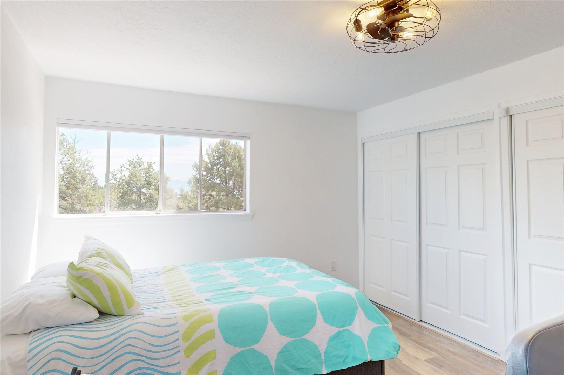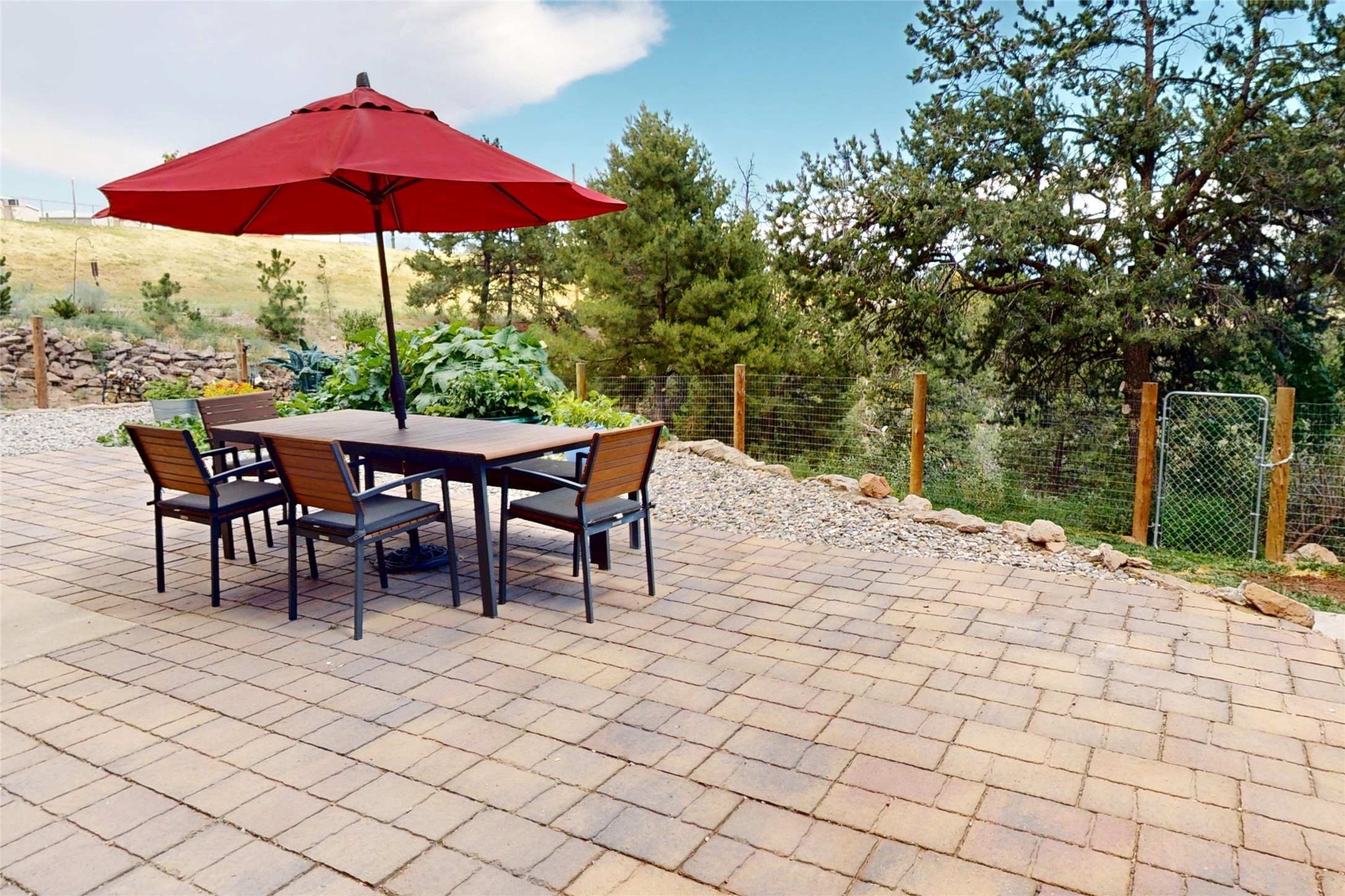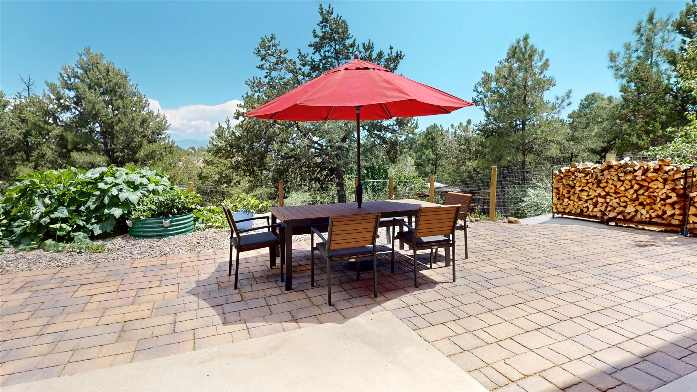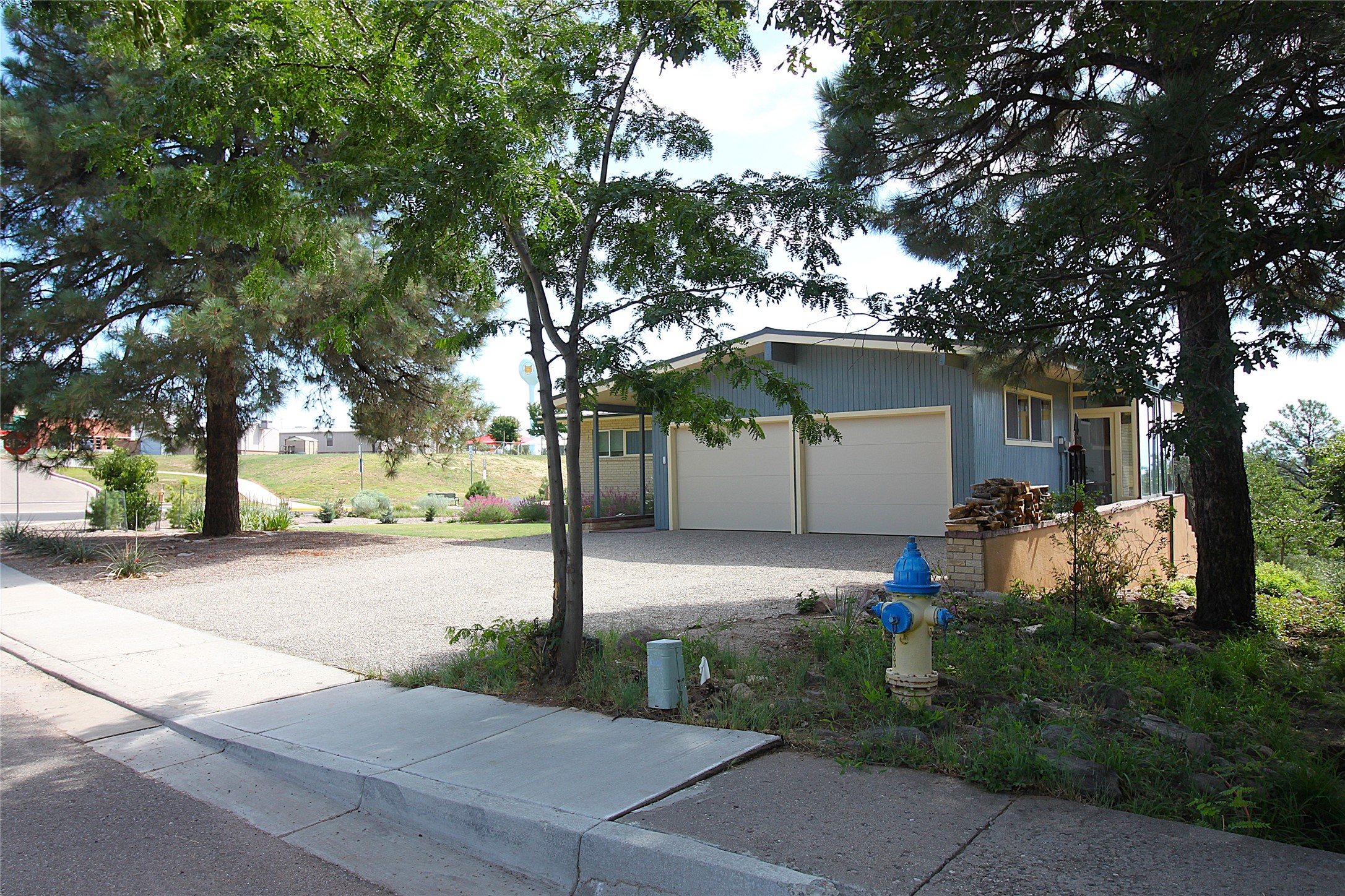 Perched on the canyon's edge, this 3,200+ sq. ft. home offers sweeping canyon and mountain views. The sun-filled entry atrium, with expansive windows and flagstone flooring, welcomes you into the home with a versatile space that offers so many options. Through French doors, the spacious living room features vaulted ceilings with exposed beams, a cozy fireplace, and picture windows that frame the stunning scenery. The living area opens to the kitchen, complete with updated cabinetry, quartz countertops, and stainless-steel appliances, including a Bosch dishwasher and a Caf dual-oven induction stove. Just off the kitchen is a deck where you can enjoy spectacular sunrises or evening shade with canyon breezes. The main level hosts a primary suite with an ensuite bath featuring shaker style cabinets and a curved-glass shower. A second bedroom with deck access and a full bath complete this level. Downstairs, a large den with brick fireplace opens to the fully fenced backyard, joined by a third bedroom, full bath, generous laundry room, and abundant storage. Mini splits create year-round comfort, complemented by gas hot water heat and two fireplace inserts. Outdoor amenities include terraced landscaping, a covered patio, and a backyard with access to the historic Gonzales Road Trail, connecting to the Bayo Canyon Trail system. Barranca Elementary, community pool, tennis courts, soccer fields, and a park with pavilion are all close by. Upgrades include: 2025: Quartz countertop, sink, disposal, ceiling fans, and entry door, 2024: South side re-stuccoed, new gutters/guard rails, refrigerator, and microwave, 2023: dishwasher, dual oven stove, vinyl plank flooring in living room/bedrooms, xeriscaping, and backyard patio 2022: Metal roof, mini splits, garage doors, fencing, water heater, washer/dryer and bathroom updates. With so many recent improvements, this home feels fresh, modern. Don't miss this one. Schedule your showing today!
