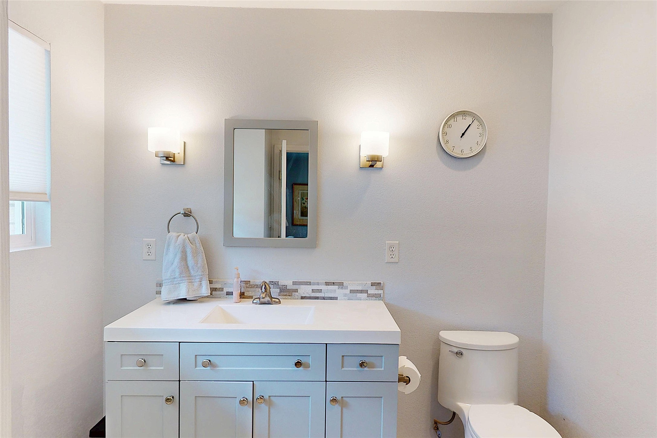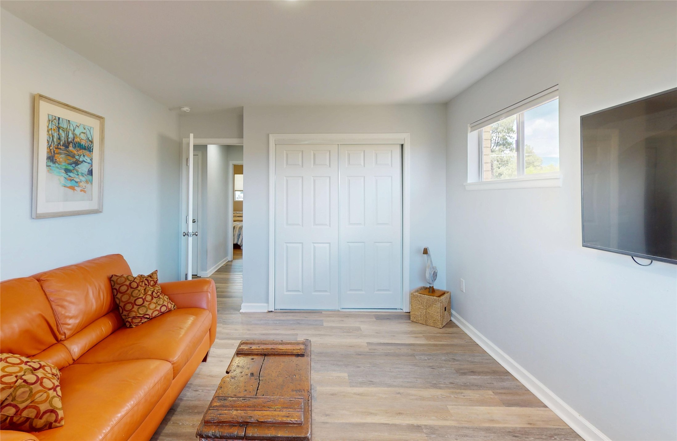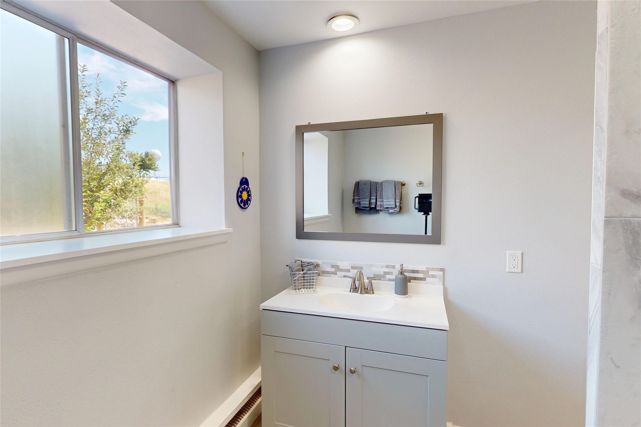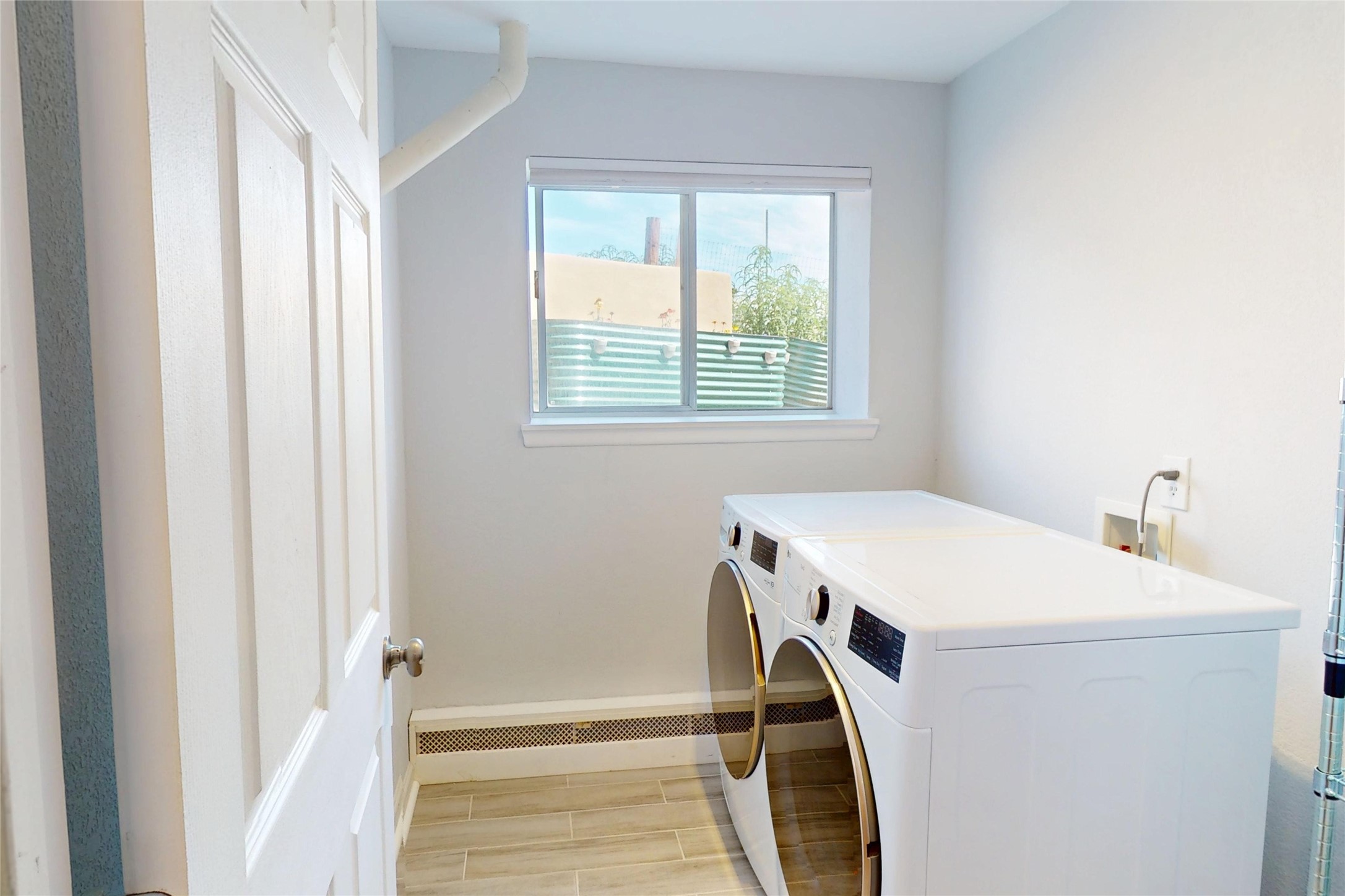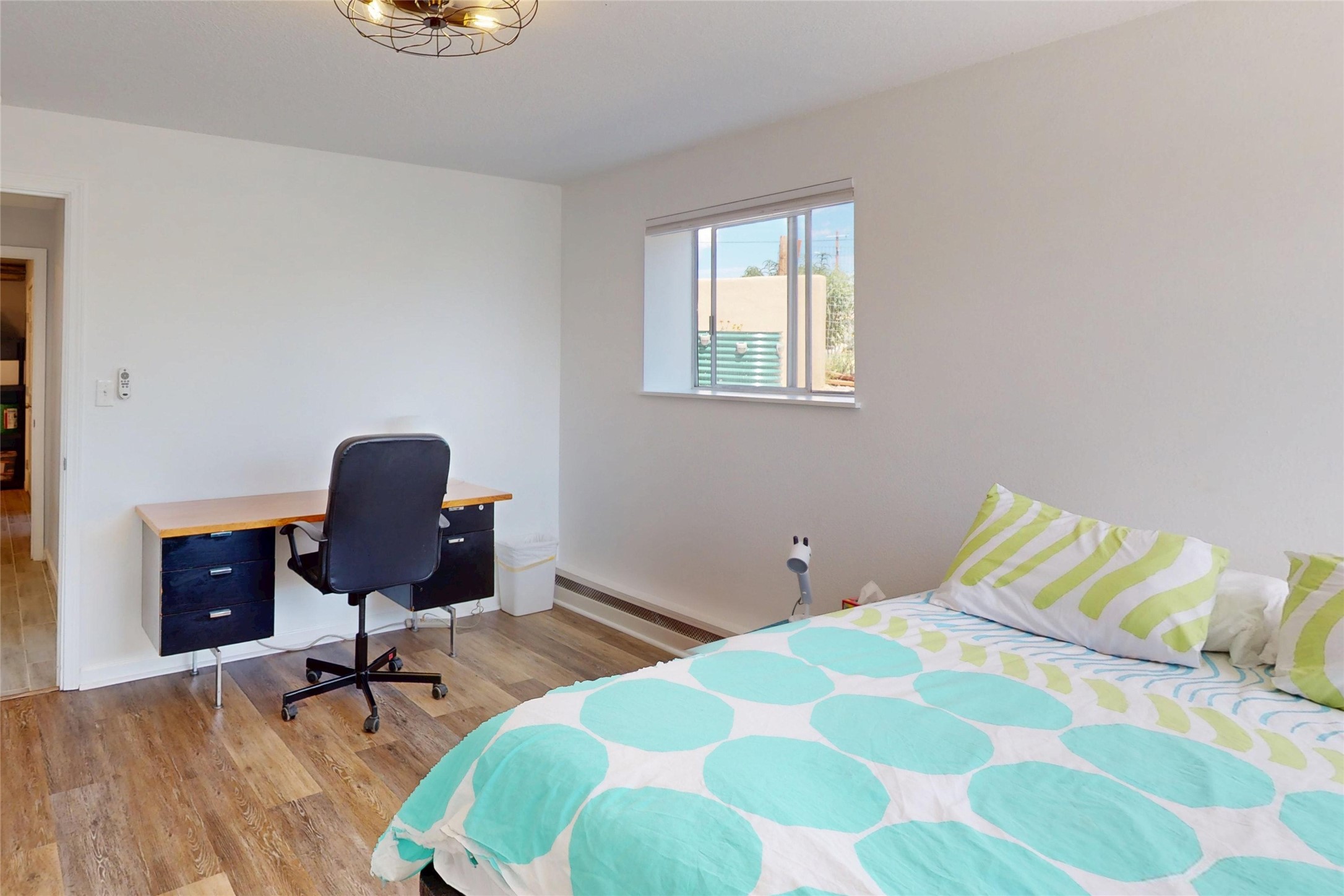 Perched on the canyon's edge, this 3,200+ sq. ft. home offers sweeping canyon and mountain views. The sun-filled entry atrium, with expansive windows and flagstone flooring, welcomes you into the home with a versatile space that offers so many options. Through French doors, the spacious living room features vaulted ceilings with exposed beams, a cozy fireplace, and picture windows that frame the stunning scenery. The living area opens to the kitchen, complete with updated cabinetry, quartz countertops, and stainless-steel appliances, including a Bosch dishwasher and a Caf dual-oven induction stove. Just off the kitchen is a deck where you can enjoy spectacular sunrises or evening shade with canyon breezes. The main level hosts a primary suite with an ensuite bath featuring shaker style cabinets and a curved-glass shower. A second bedroom with deck access and a full bath complete this level. Downstairs, a large den with brick fireplace opens to the fully fenced backyard, joined by a third bedroom, full bath, generous laundry room, and abundant storage. Mini splits create year-round comfort, complemented by gas hot water heat and two fireplace inserts. Outdoor amenities include terraced landscaping, a covered patio, and a backyard with access to the historic Gonzales Road Trail, connecting to the Bayo Canyon Trail system. Barranca Elementary, community pool, tennis courts, soccer fields, and a park with pavilion are all close by. Upgrades include: 2025: Quartz countertop, sink, disposal, ceiling fans, and entry door, 2024: South side re-stuccoed, new gutters/guard rails, refrigerator, and microwave, 2023: dishwasher, dual oven stove, vinyl plank flooring in living room/bedrooms, xeriscaping, and backyard patio 2022: Metal roof, mini splits, garage doors, fencing, water heater, washer/dryer and bathroom updates. With so many recent improvements, this home feels fresh, modern. Don't miss this one. Schedule your showing today!