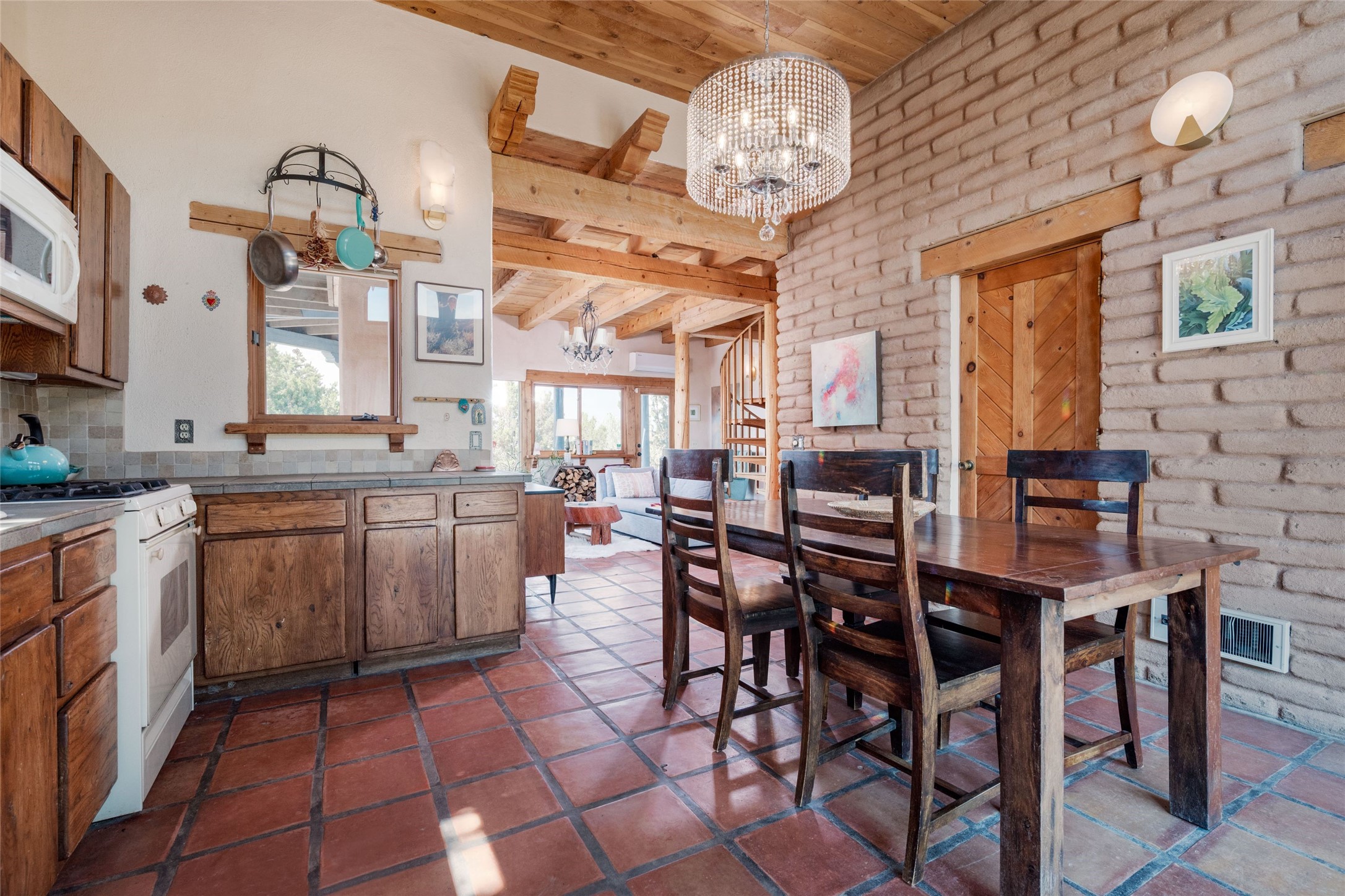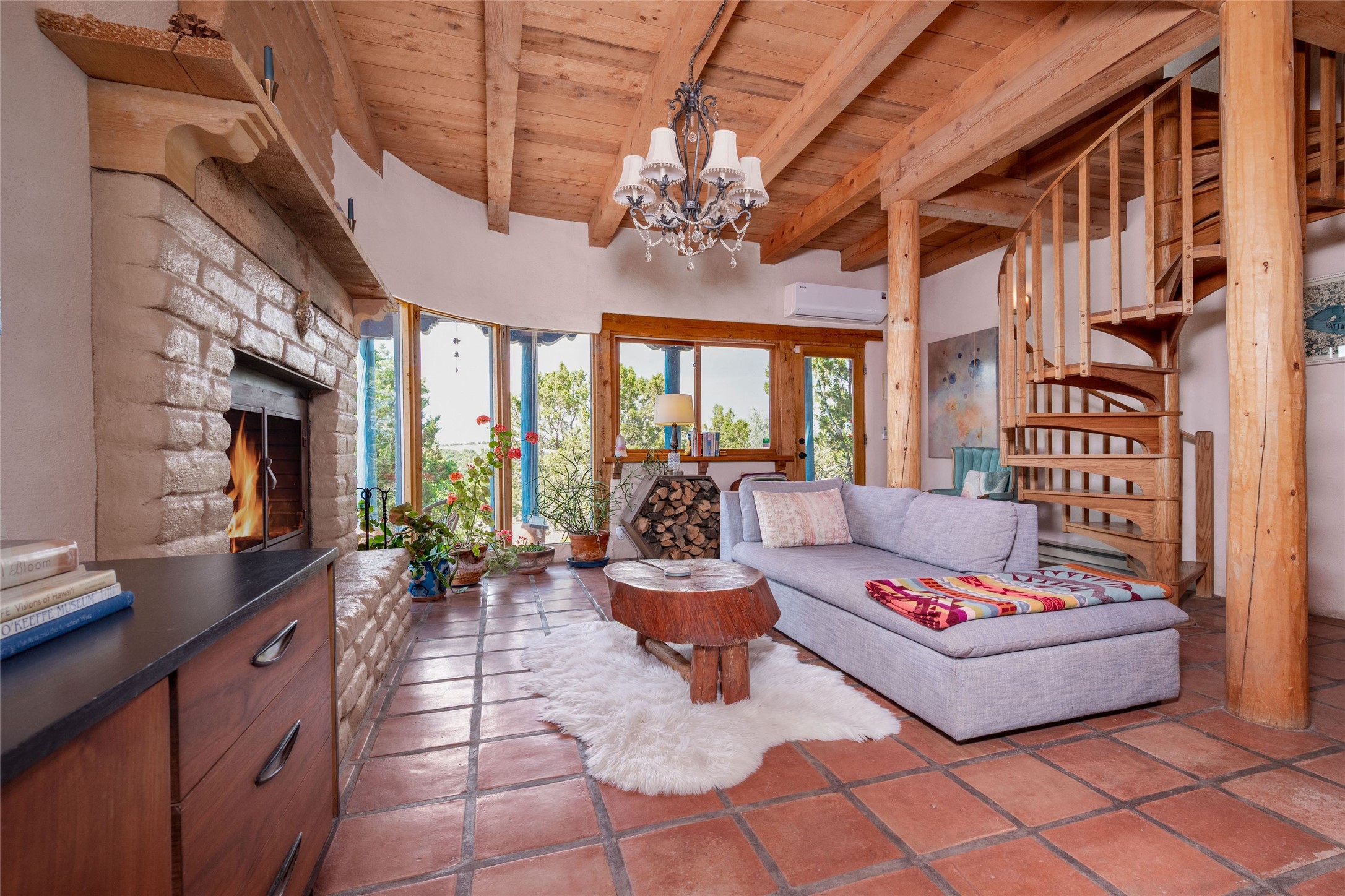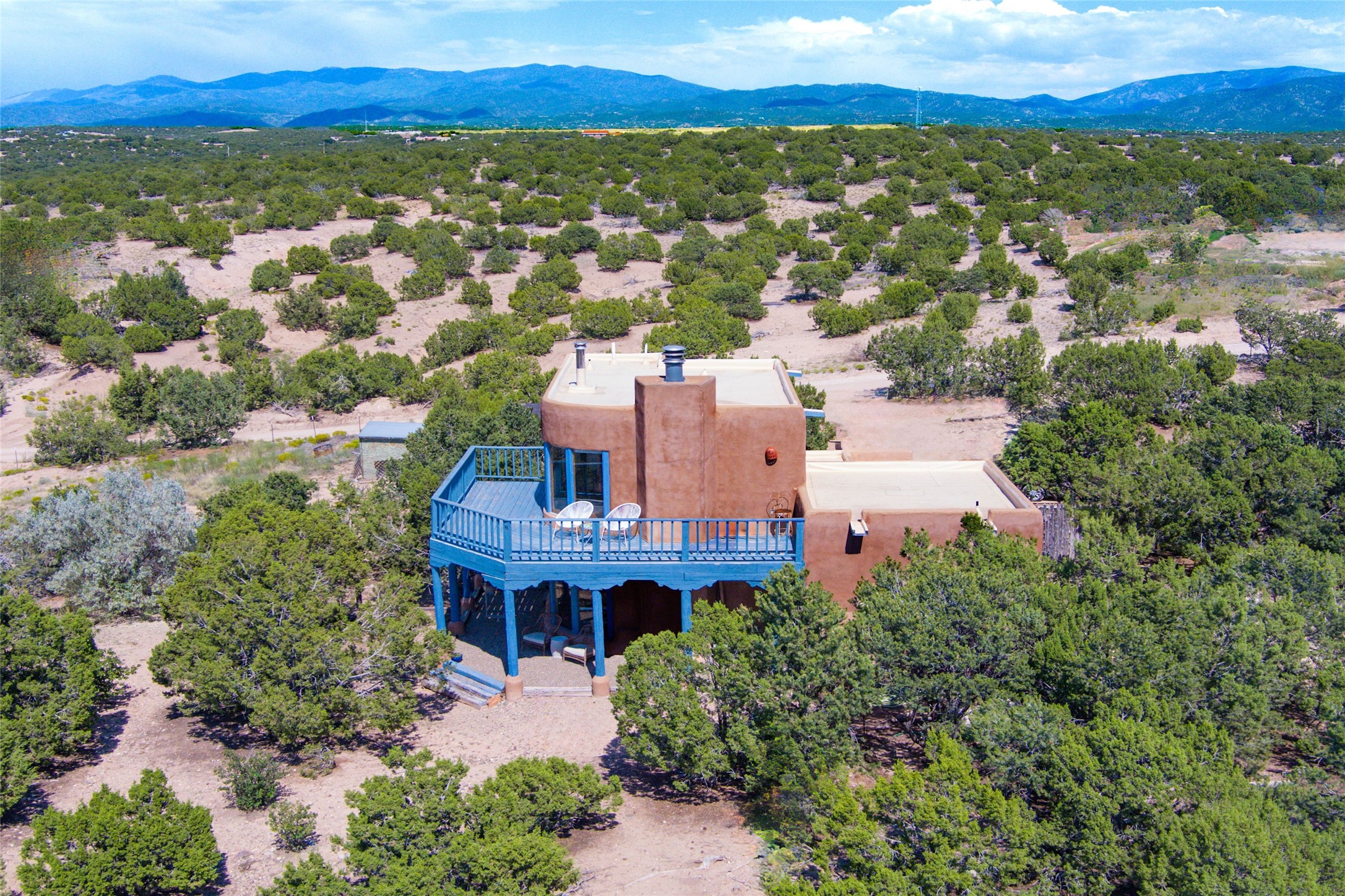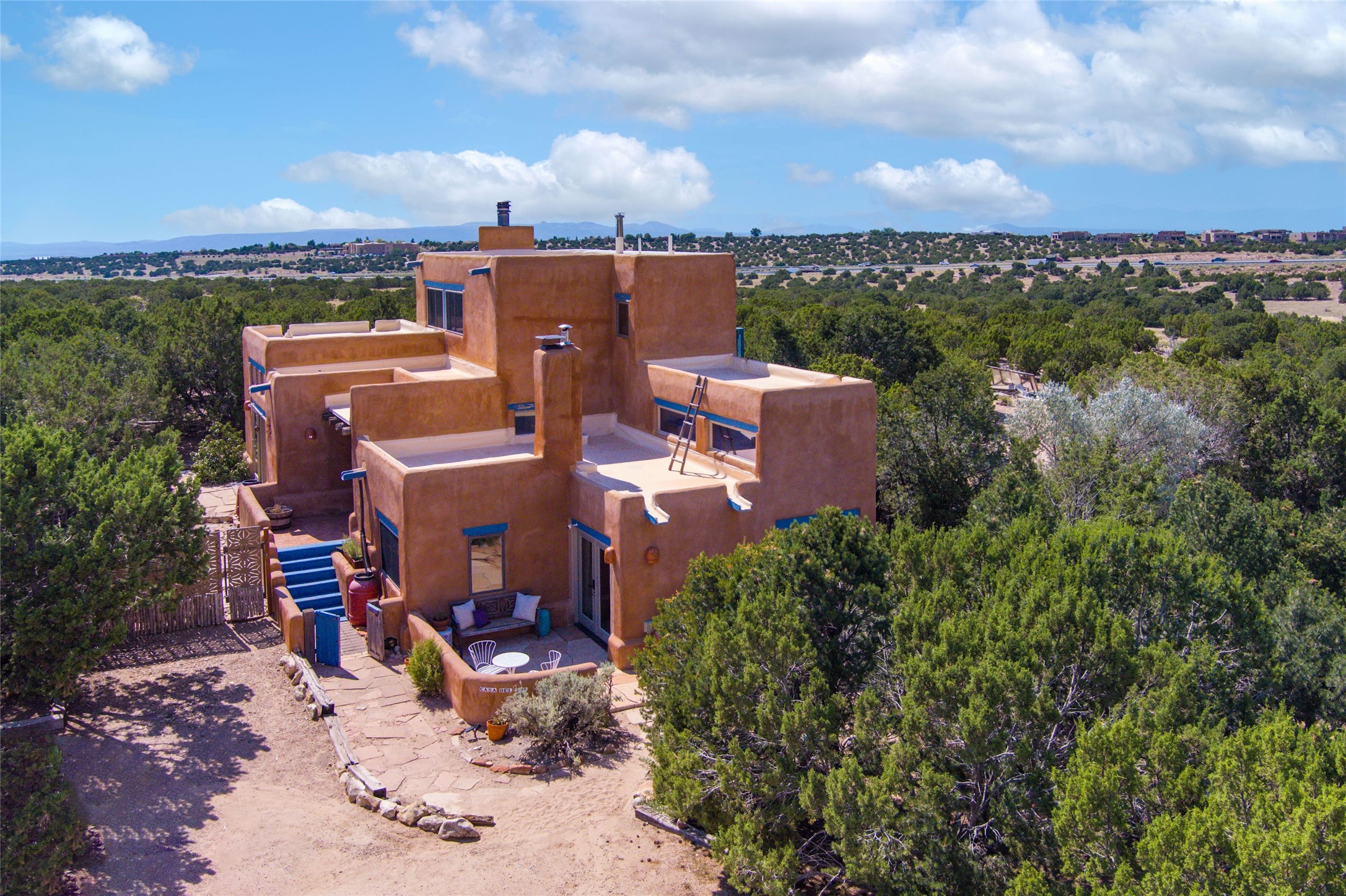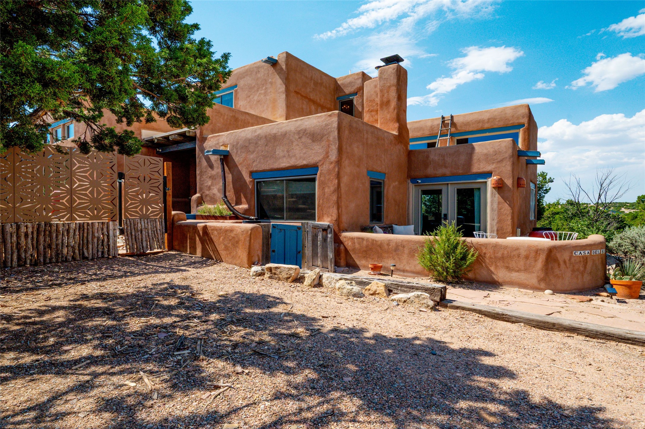 Located on 1.25 acres, a mere 4 miles from the Plaza, Casa del Sol feels like country living ten minutes from town. The Casa has 3 bedrooms and 2 full baths, ample privacy, stunning mountain views, and fantastic light. This classic Pueblo style adobe home was built by hand by artist Paul Glickman with careful attention to detail. You'll find all the classic finishes - vigas and beams, high ceilings, corbels, pretty wood doors, Saltillo tile floors, nichos and 4 fireplaces- kivas and 2 wood burning stoves. The main living areas have an open feel between kitchen, dining and living, as well as high ceilings with clerestory windows for added light and passive solar gain. The South-facing flagstone patio off the kitchen, as well as the Northwest outdoor area off the living room, are perfect for indoor and outdoor living and entertaining. A highlight of this home is the Loretto-inspired wooden spiral staircase to the second-floor primary bedroom, with custom bamboo floors, a wood-burning stove, and an ensuite bath. Outside the upstairs bedroom, a wrap-around deck makes it easy to enjoy big sunset and sunrise views. Down a few steps from the front entry is the guest bedroom, offering good separation and privacy, as well as a cozy corner kiva fireplace. The third bedroom, with its separate entry, can serve several functions: home office, guest suite, den, or studio, and has a wood stove insert in the fireplace as well as a sink. With the adobe construction and a mini split for cooling, the house stays comfortable in winter and summer. A ground-mount solar array provides a surplus of energy almost every month. The property is zoned for livestock, with space for a corral. Brand new roof fall of 2025, with 10 year transferrable warranty! This home is a special retreat, with its charm, exquisite craftsmanship, and stunning views in a tranquil, beautiful, and natural setting. Casa del Sol is one of a kind.