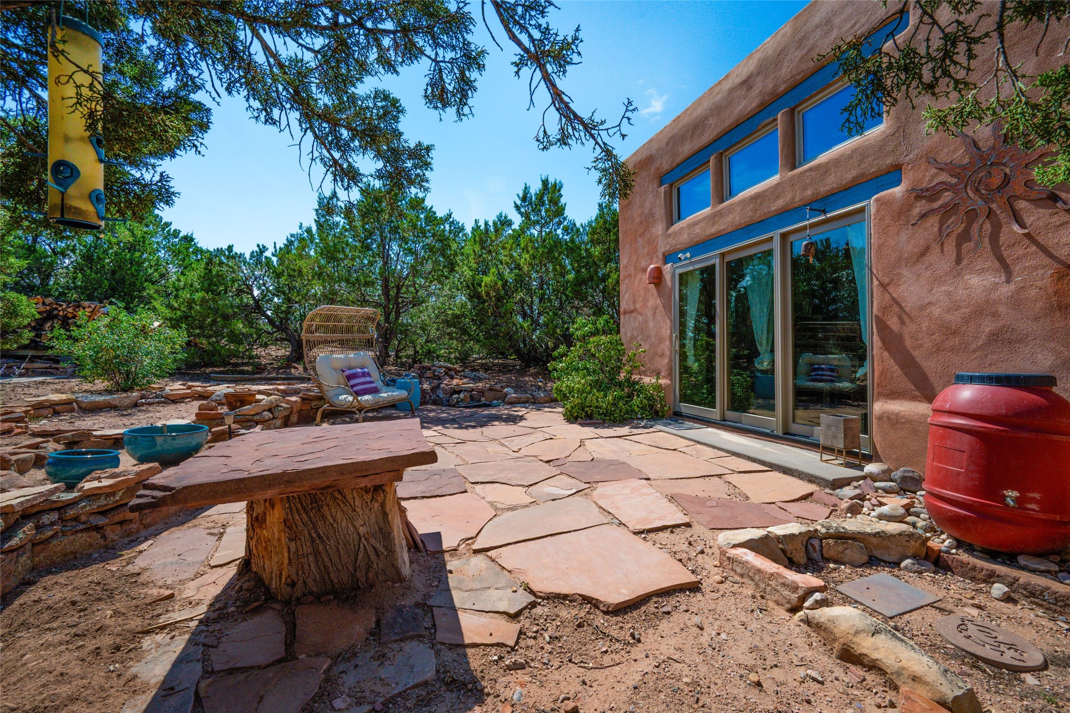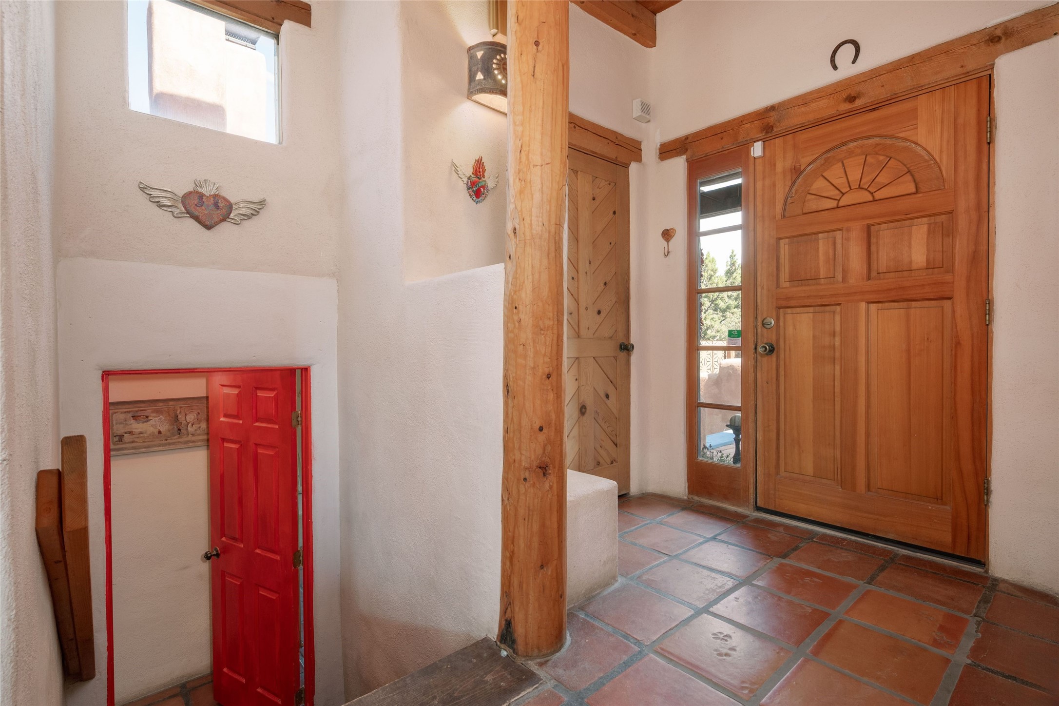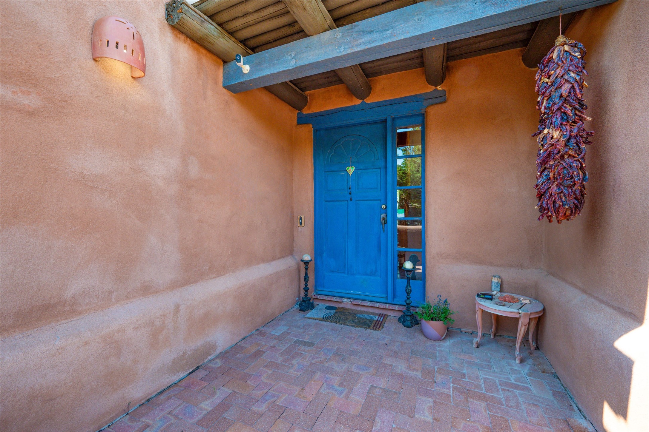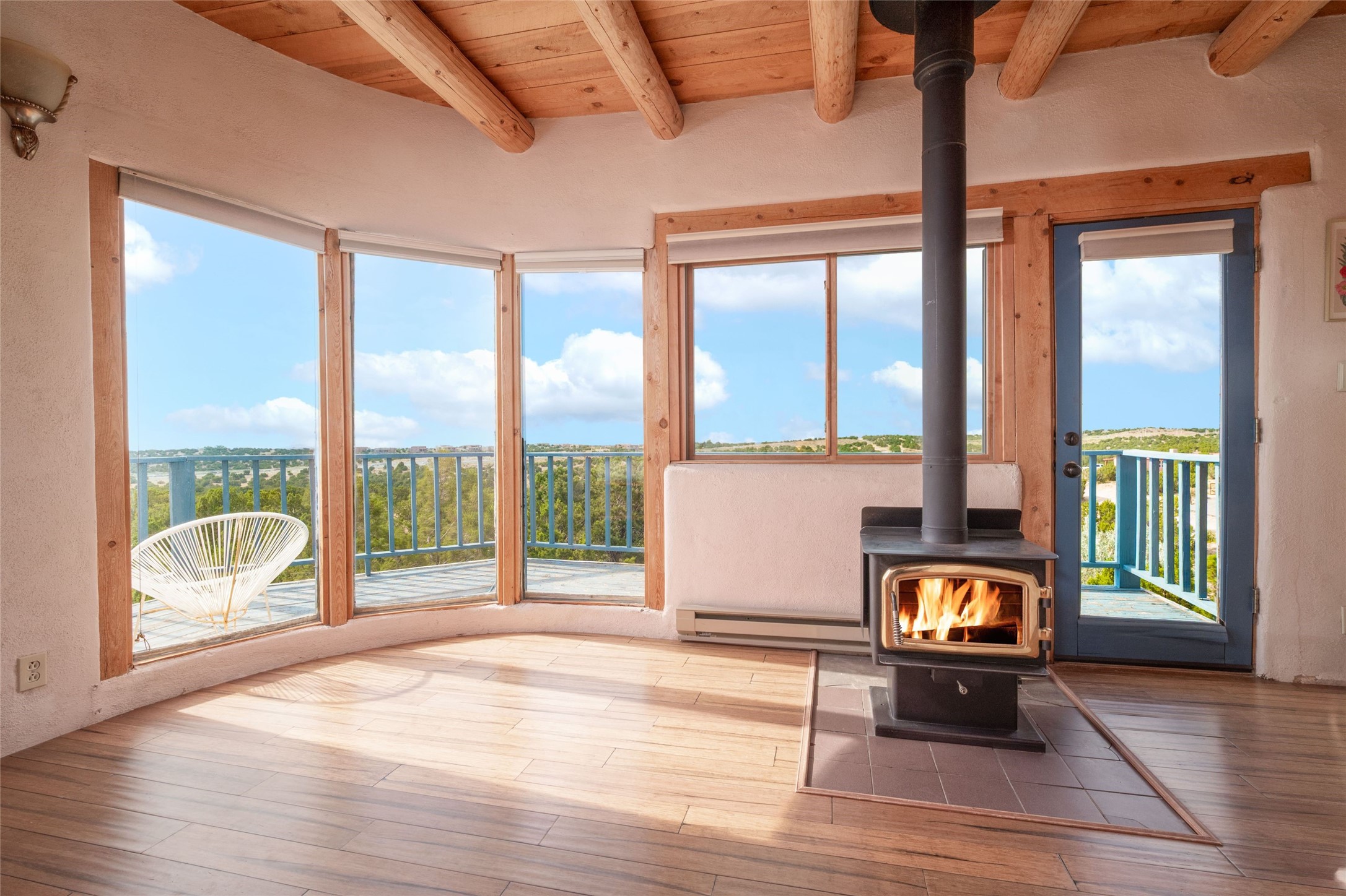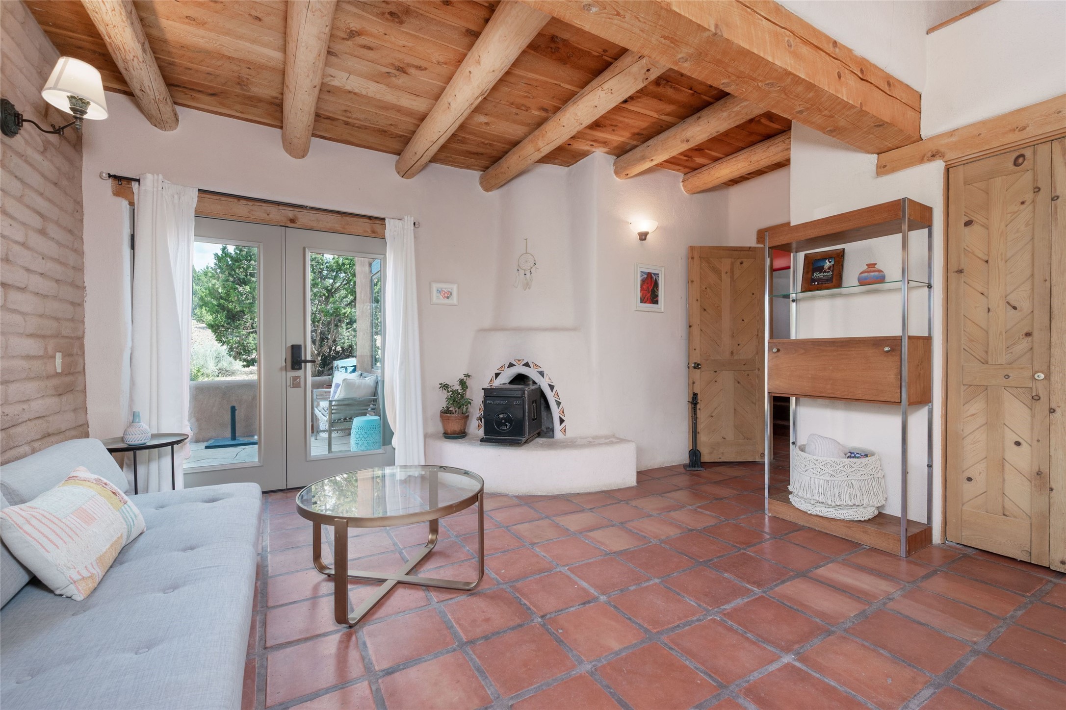 Located on 1.25 acres, a mere 4 miles from the Plaza, Casa del Sol feels like country living ten minutes from town. The Casa has 3 bedrooms and 2 full baths, ample privacy, stunning mountain views, and fantastic light. This classic Pueblo style adobe home was built by hand by artist Paul Glickman with careful attention to detail. You'll find all the classic finishes - vigas and beams, high ceilings, corbels, pretty wood doors, Saltillo tile floors, nichos and 4 fireplaces- kivas and 2 wood burning stoves. The main living areas have an open feel between kitchen, dining and living, as well as high ceilings with clerestory windows for added light and passive solar gain. The South-facing flagstone patio off the kitchen, as well as the Northwest outdoor area off the living room, are perfect for indoor and outdoor living and entertaining. A highlight of this home is the Loretto-inspired wooden spiral staircase to the second-floor primary bedroom, with custom bamboo floors, a wood-burning stove, and an ensuite bath. Outside the upstairs bedroom, a wrap-around deck makes it easy to enjoy big sunset and sunrise views. Down a few steps from the front entry is the guest bedroom, offering good separation and privacy, as well as a cozy corner kiva fireplace. The third bedroom, with its separate entry, can serve several functions: home office, guest suite, den, or studio, and has a wood stove insert in the fireplace as well as a sink. With the adobe construction and a mini split for cooling, the house stays comfortable in winter and summer. A ground-mount solar array provides a surplus of energy almost every month. The property is zoned for livestock, with space for a corral. Brand new roof fall of 2025, with 10 year transferrable warranty! This home is a special retreat, with its charm, exquisite craftsmanship, and stunning views in a tranquil, beautiful, and natural setting. Casa del Sol is one of a kind.