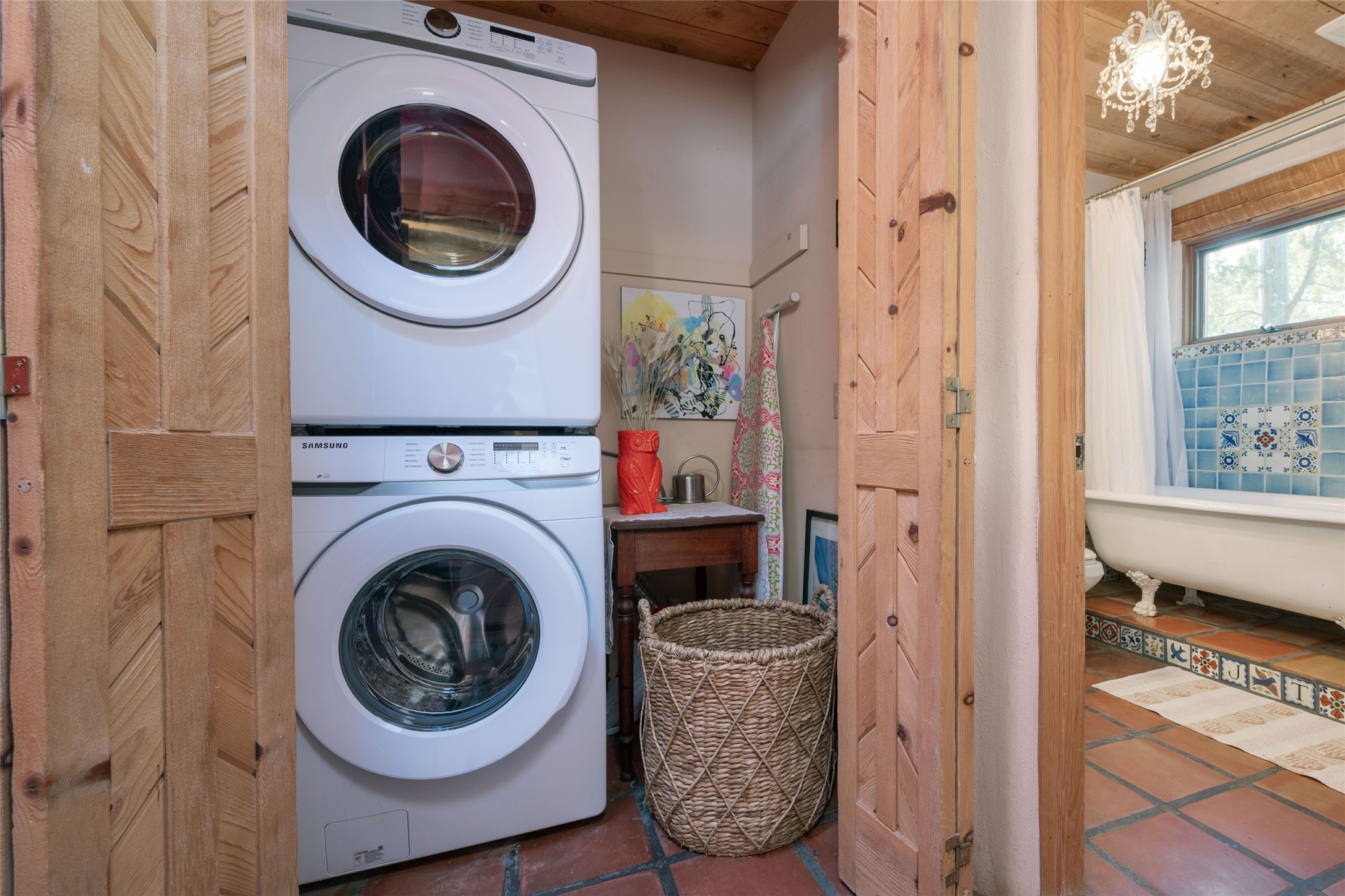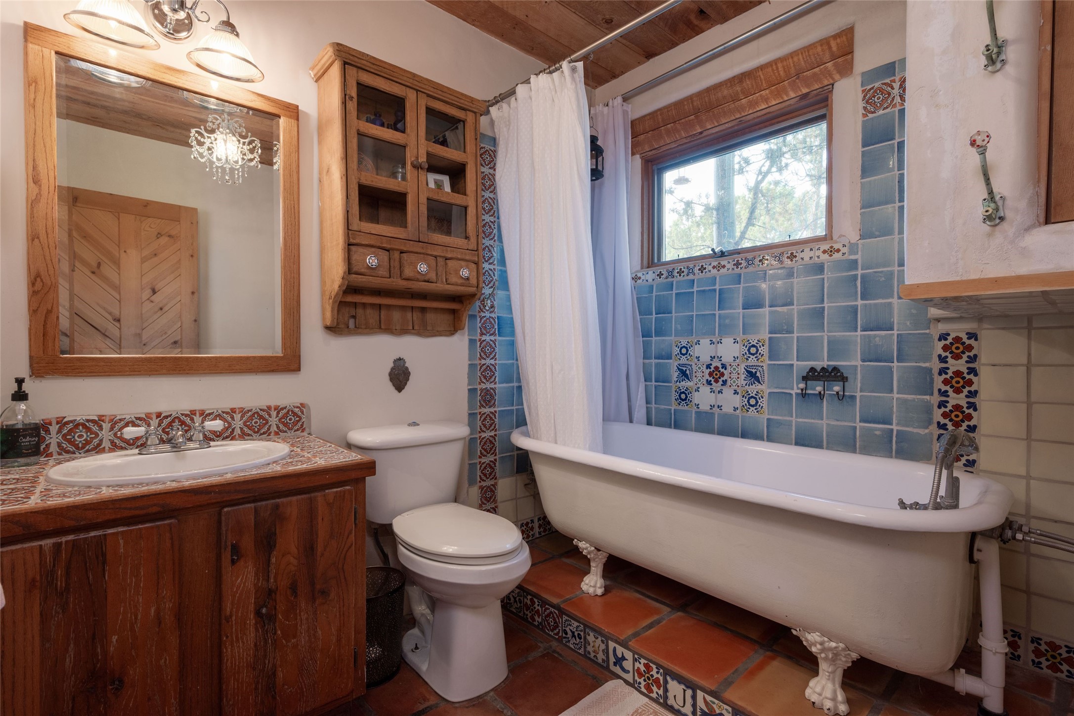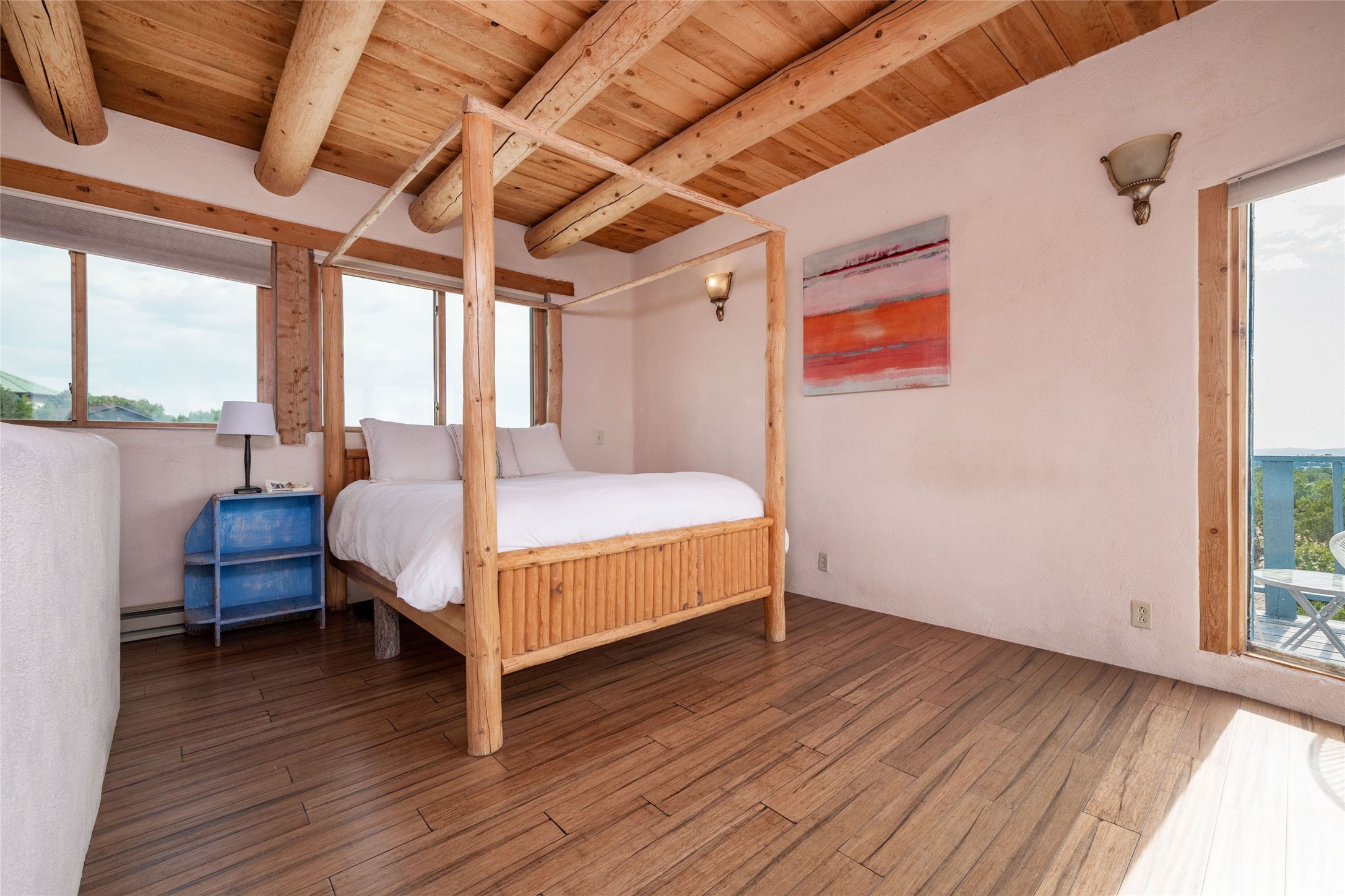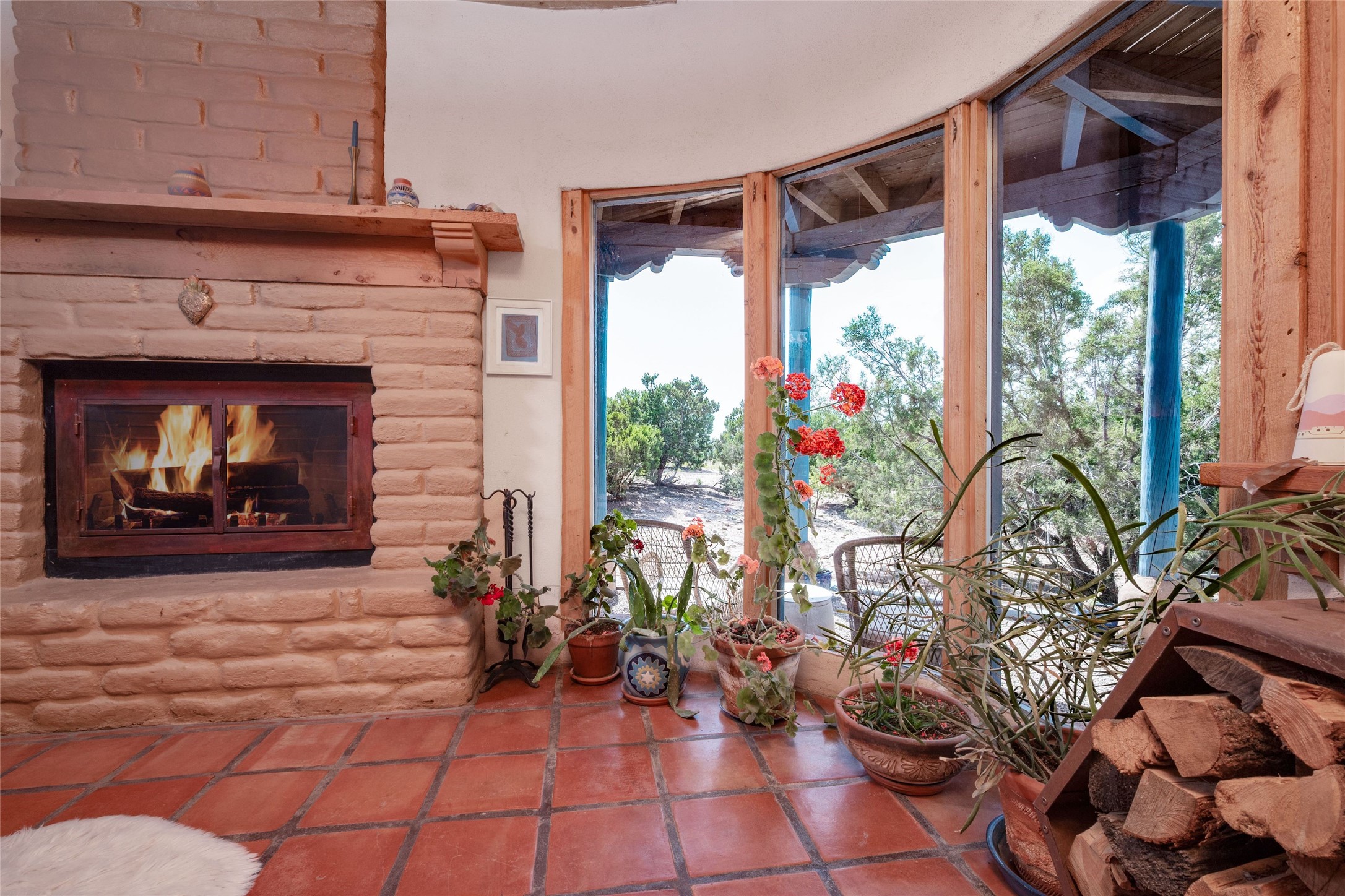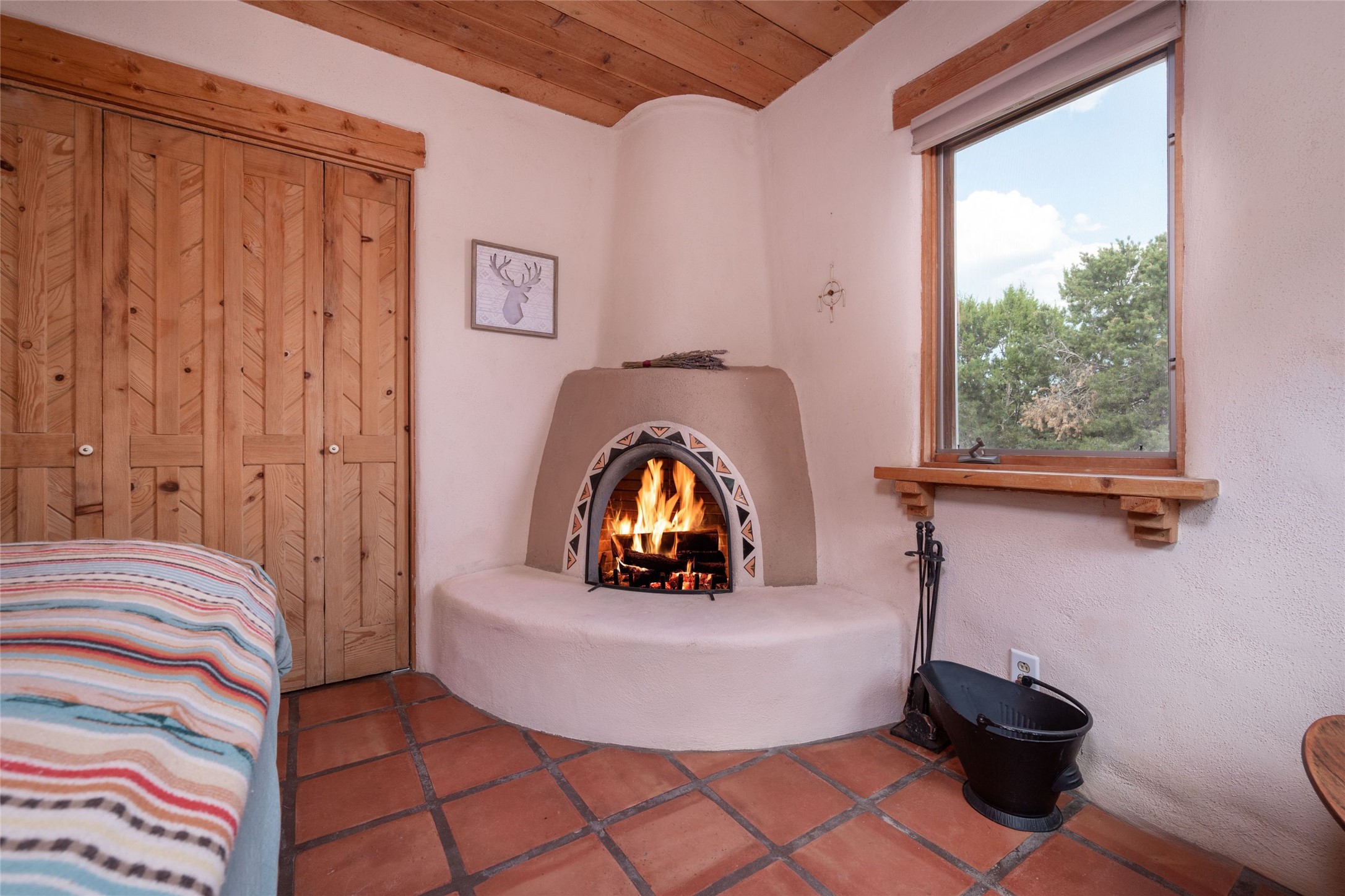 Located on 1.25 acres, a mere 4 miles from the Plaza, Casa del Sol feels like country living ten minutes from town. The Casa has 3 bedrooms and 2 full baths, ample privacy, stunning mountain views, and fantastic light. This classic Pueblo style adobe home was built by hand by artist Paul Glickman with careful attention to detail. You'll find all the classic finishes - vigas and beams, high ceilings, corbels, pretty wood doors, Saltillo tile floors, nichos and 4 fireplaces- kivas and 2 wood burning stoves. The main living areas have an open feel between kitchen, dining and living, as well as high ceilings with clerestory windows for added light and passive solar gain. The South-facing flagstone patio off the kitchen, as well as the Northwest outdoor area off the living room, are perfect for indoor and outdoor living and entertaining. A highlight of this home is the Loretto-inspired wooden spiral staircase to the second-floor primary bedroom, with custom bamboo floors, a wood-burning stove, and an ensuite bath. Outside the upstairs bedroom, a wrap-around deck makes it easy to enjoy big sunset and sunrise views. Down a few steps from the front entry is the guest bedroom, offering good separation and privacy, as well as a cozy corner kiva fireplace. The third bedroom, with its separate entry, can serve several functions: home office, guest suite, den, or studio, and has a wood stove insert in the fireplace as well as a sink. With the adobe construction and a mini split for cooling, the house stays comfortable in winter and summer. A ground-mount solar array provides a surplus of energy almost every month. The property is zoned for livestock, with space for a corral. Brand new roof fall of 2025, with 10 year transferrable warranty! This home is a special retreat, with its charm, exquisite craftsmanship, and stunning views in a tranquil, beautiful, and natural setting. Casa del Sol is one of a kind.