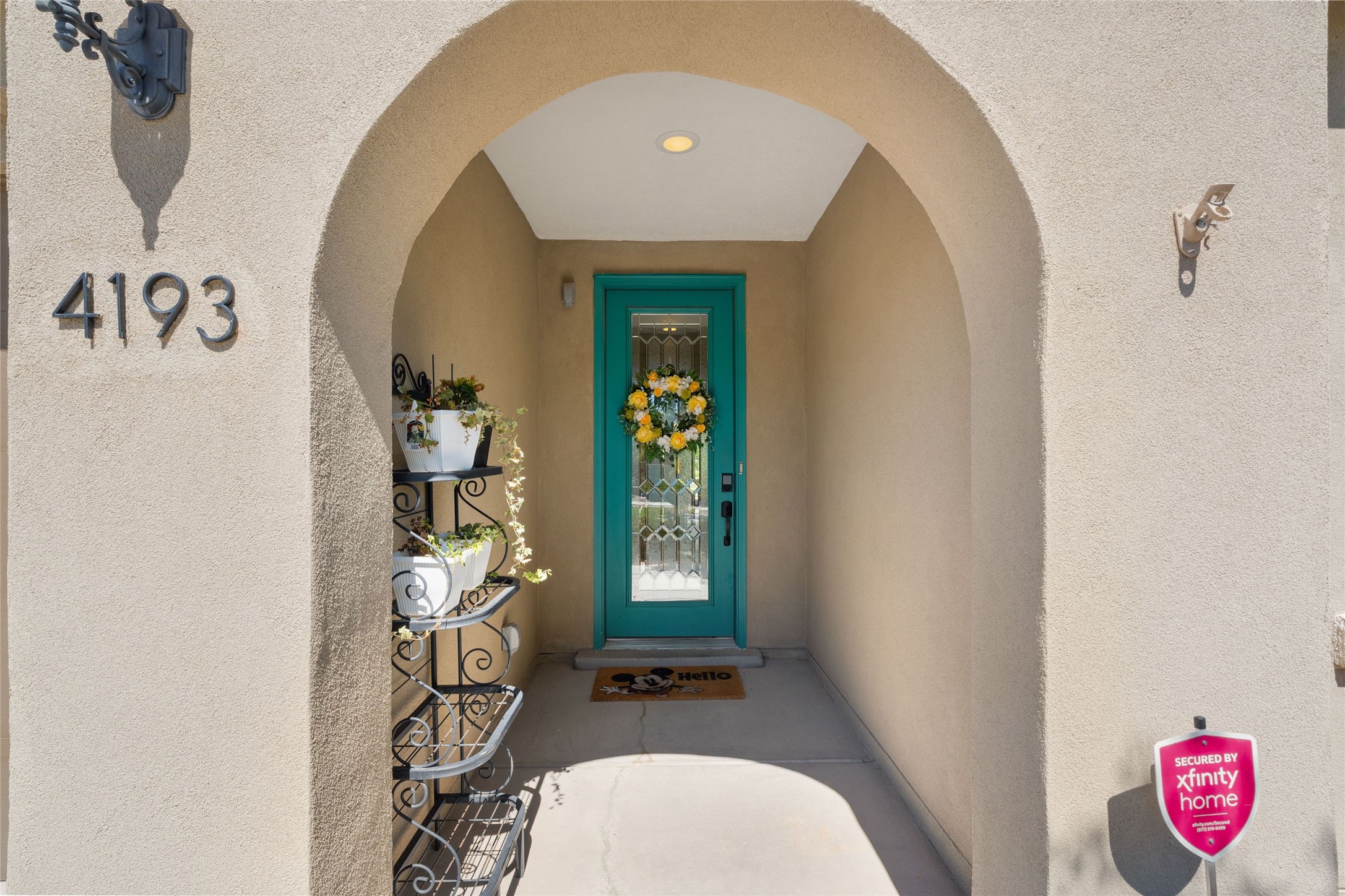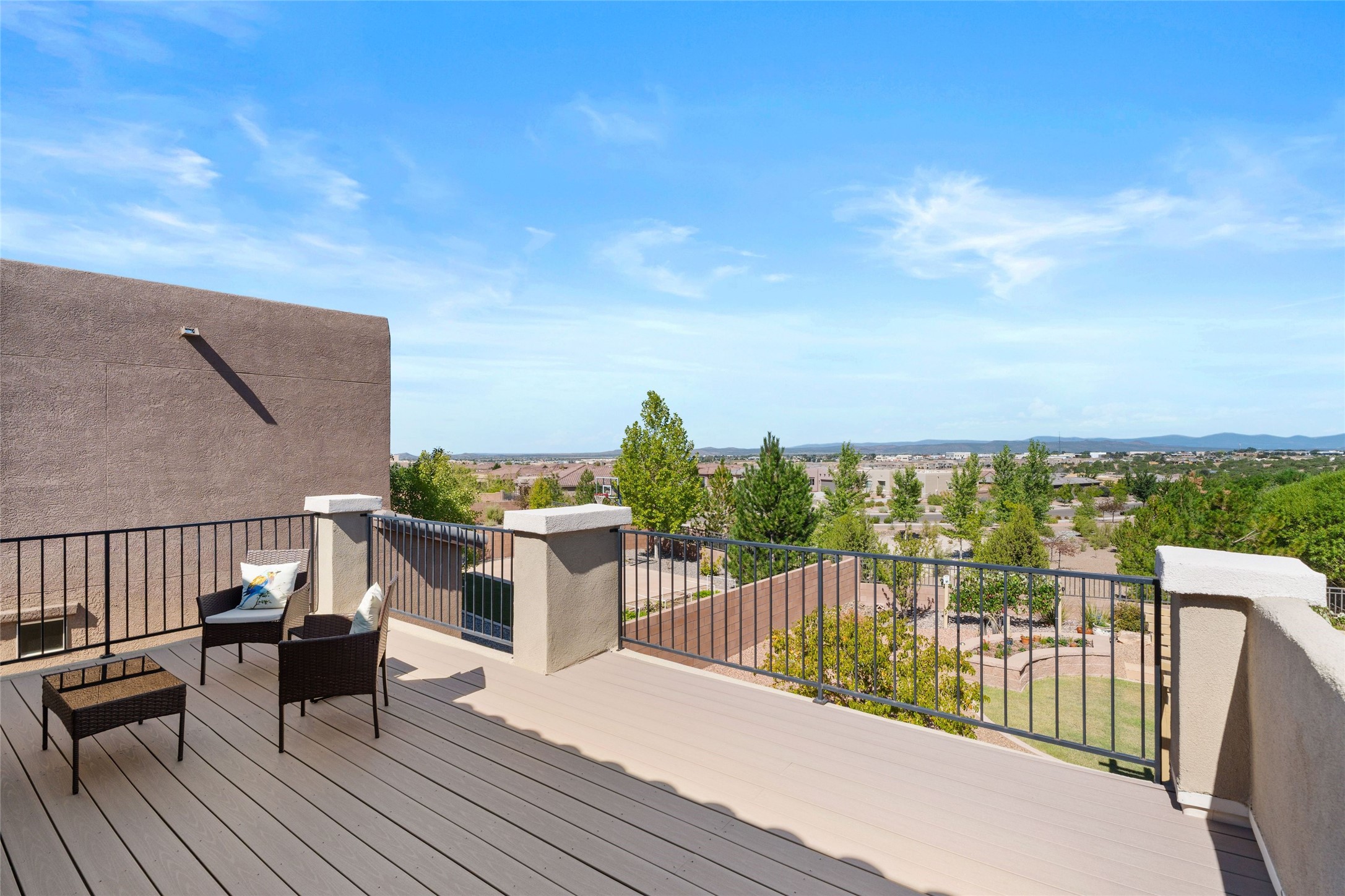 5-bedroom 3 bath residence with captivating mountain and garden views located in Vista de las Solares neighborhood. This thoughtfully designed home provides plenty of space for comfortable living. The upgraded kitchen includes a modern cabinet system, perfect for culinary enthusiasts, while two inviting fireplaces enhance the warmth and charm of the living areas. The primary bedroom serves as a private sanctuary, offering a spacious walk-in closet, a relaxing soaking tub, and access to a private deck--ideal for enjoying the serene surroundings. The third and fourth bedrooms present flexible options, easily transforming into an office, studio, or exercise room based on your needs. A guest bedroom and bath are conveniently situated on the first floor, ensuring comfort for visitors. 2 bathrooms come with grab bars for safety and convenience. Step outside to discover a large backyard featuring grapevines, peach and plum trees, and raised garden beds, ideal for gardening aficionados. This outdoor space is equipped with two irrigation systems, a freeze-proof hydrant, and outdoor lighting, creating an inviting atmosphere for gatherings or quiet evenings. Landscaped yard with drought resistant garden with buffalo grass. Energy efficiency is a highlight of this property with photovoltaic solar panels, SMART home upgrades and wired garage for an EV charger, all promoting sustainable living. Conveniently located near the Santa Fe Regional Airport, Santa Fe Place Mall, and Presbyterian Medical Center.