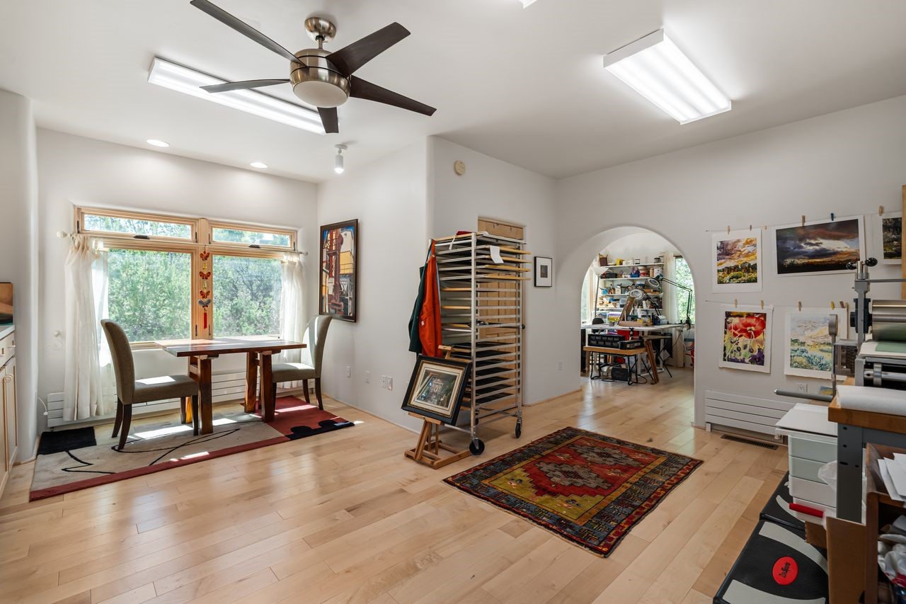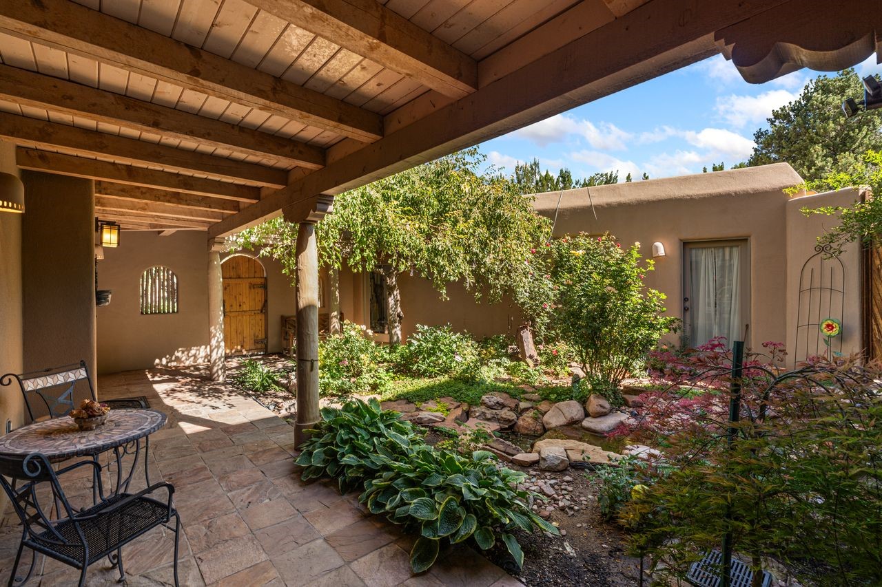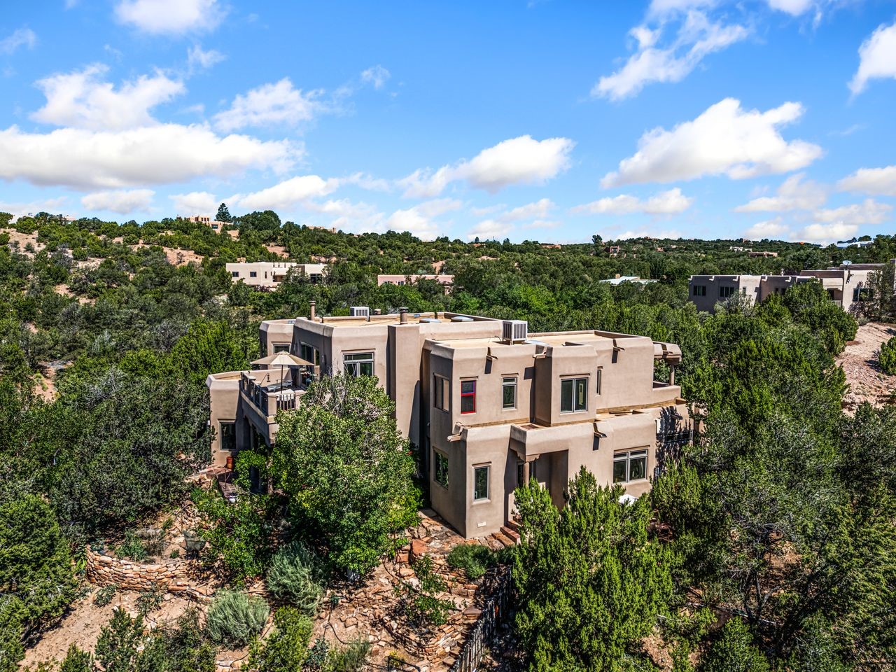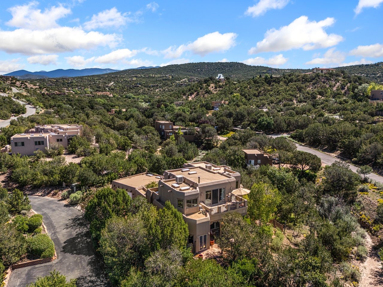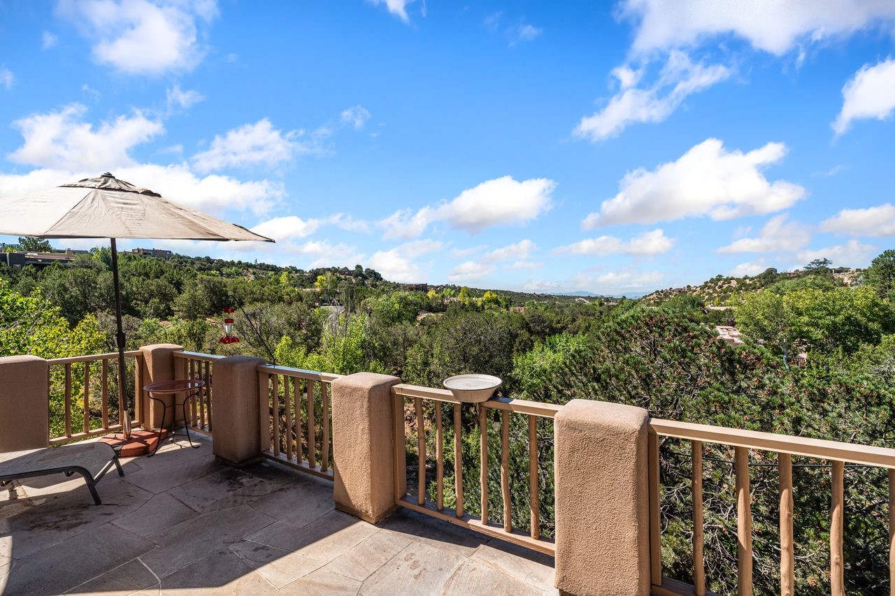 Beautifully built home overlooking the arroyo and with stellar views over downtown Santa Fe to the south! The home has a lovely private courtyard with water feature greeting you as you step in. All the living areas on the first floor: Living room, dining room, kitchen, full bathroom, and laundry room. the back of the home has a full suite that is currently being used as a working artist studio. This space is easily converted and designed to be a one-bedroom suite on the first floor. Upstairs is the primary suite with two walk-in closets and primary bath. There are two more bedrooms with a full bath. The two-car garage is off the courtyard. There are two 2nd story balconies, and lovely portal off the living room, and wonderful landscaping around the home. Bonus** full unfinished basement! Four off-street parking spots available for your guests. Please make sure you make plans to see this lovely home is Seirra Del Norte!