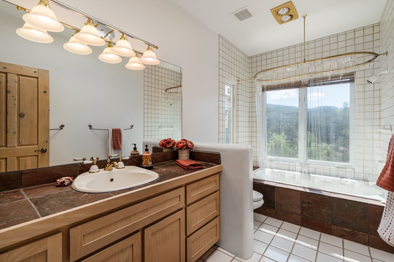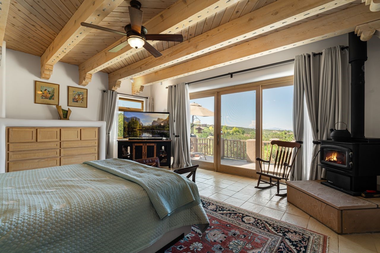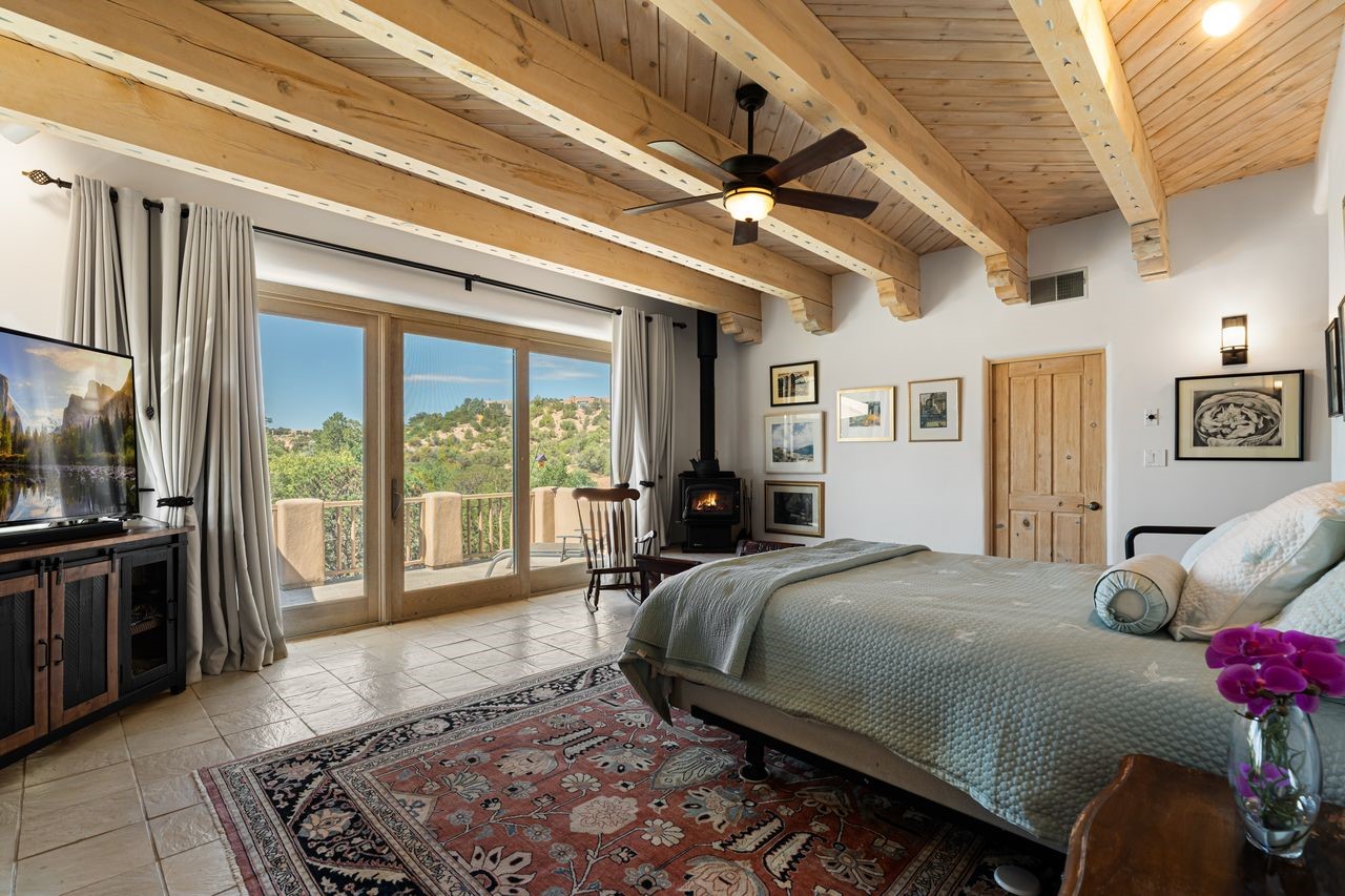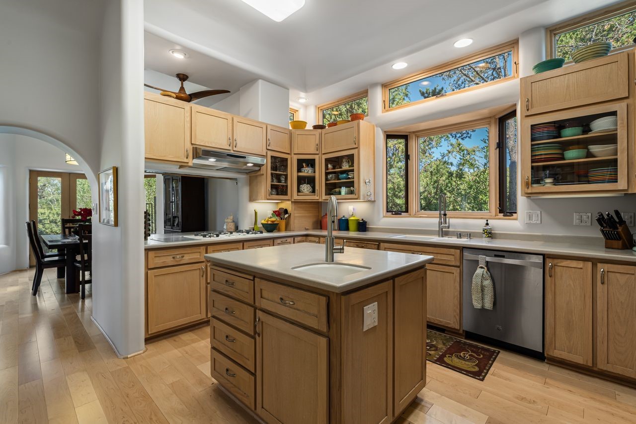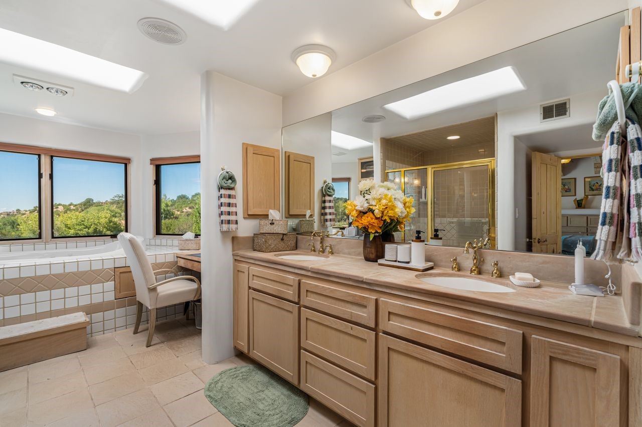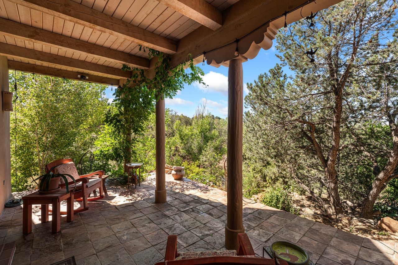 Beautifully built home overlooking the arroyo and with stellar views over downtown Santa Fe to the south! The home has a lovely private courtyard with water feature greeting you as you step in. All the living areas on the first floor: Living room, dining room, kitchen, full bathroom, and laundry room. the back of the home has a full suite that is currently being used as a working artist studio. This space is easily converted and designed to be a one-bedroom suite on the first floor. Upstairs is the primary suite with two walk-in closets and primary bath. There are two more bedrooms with a full bath. The two-car garage is off the courtyard. There are two 2nd story balconies, and lovely portal off the living room, and wonderful landscaping around the home. Bonus** full unfinished basement! Four off-street parking spots available for your guests. Please make sure you make plans to see this lovely home is Seirra Del Norte!