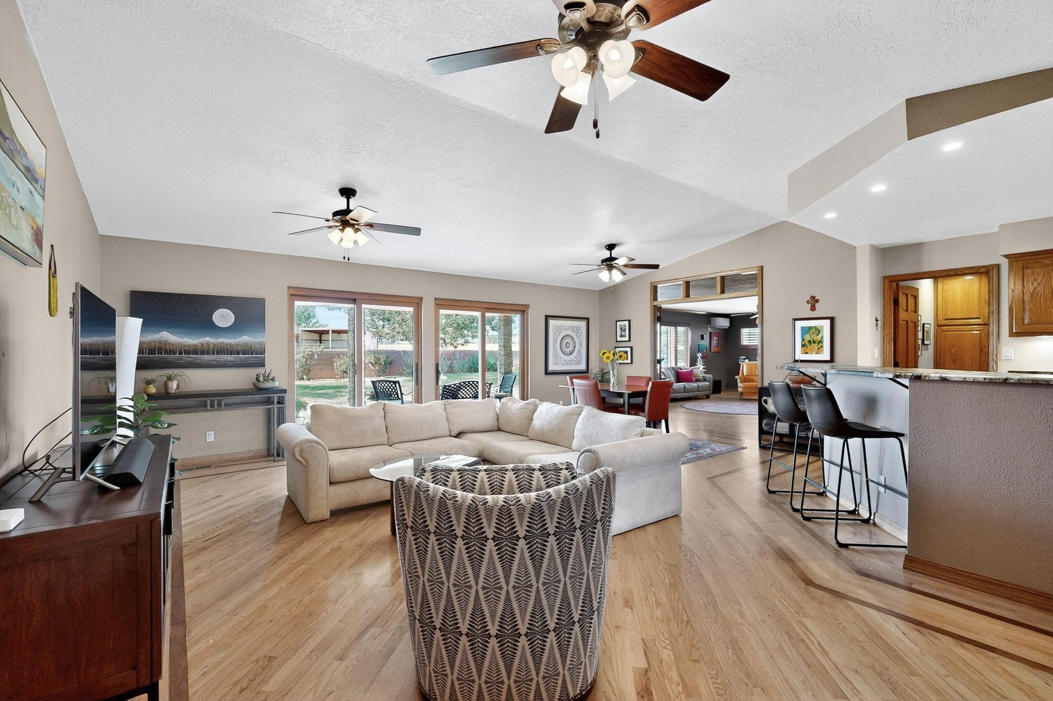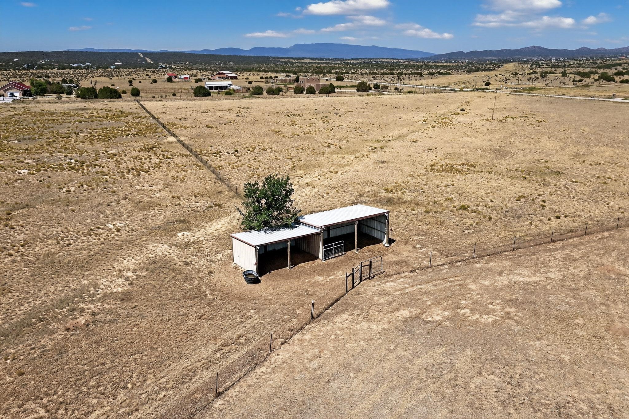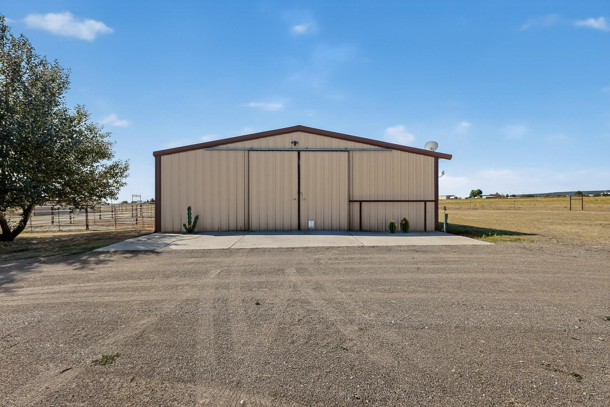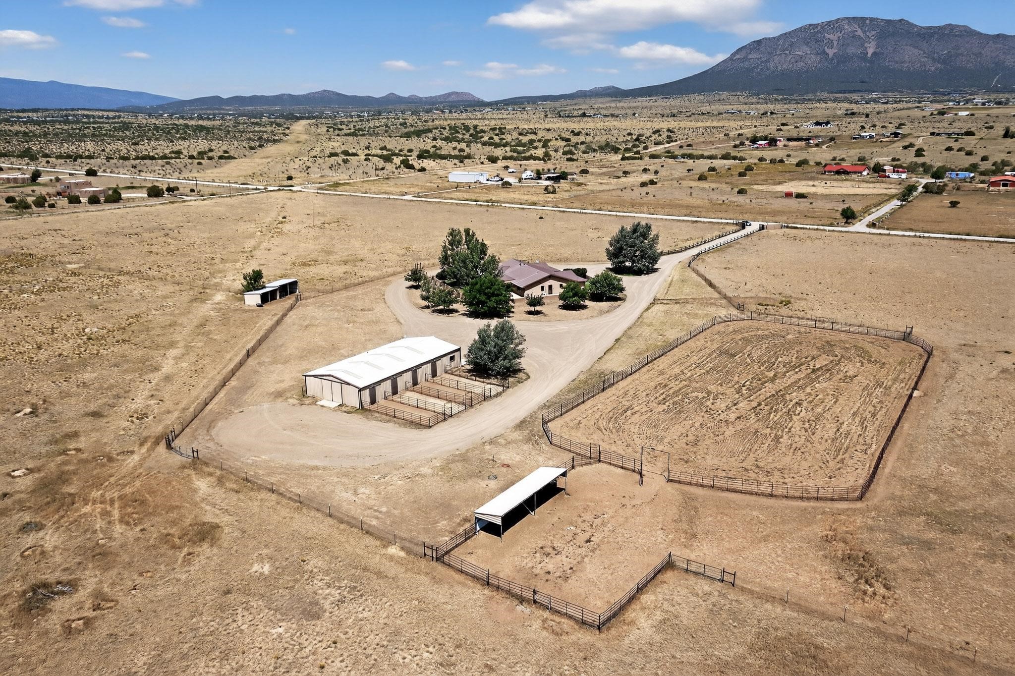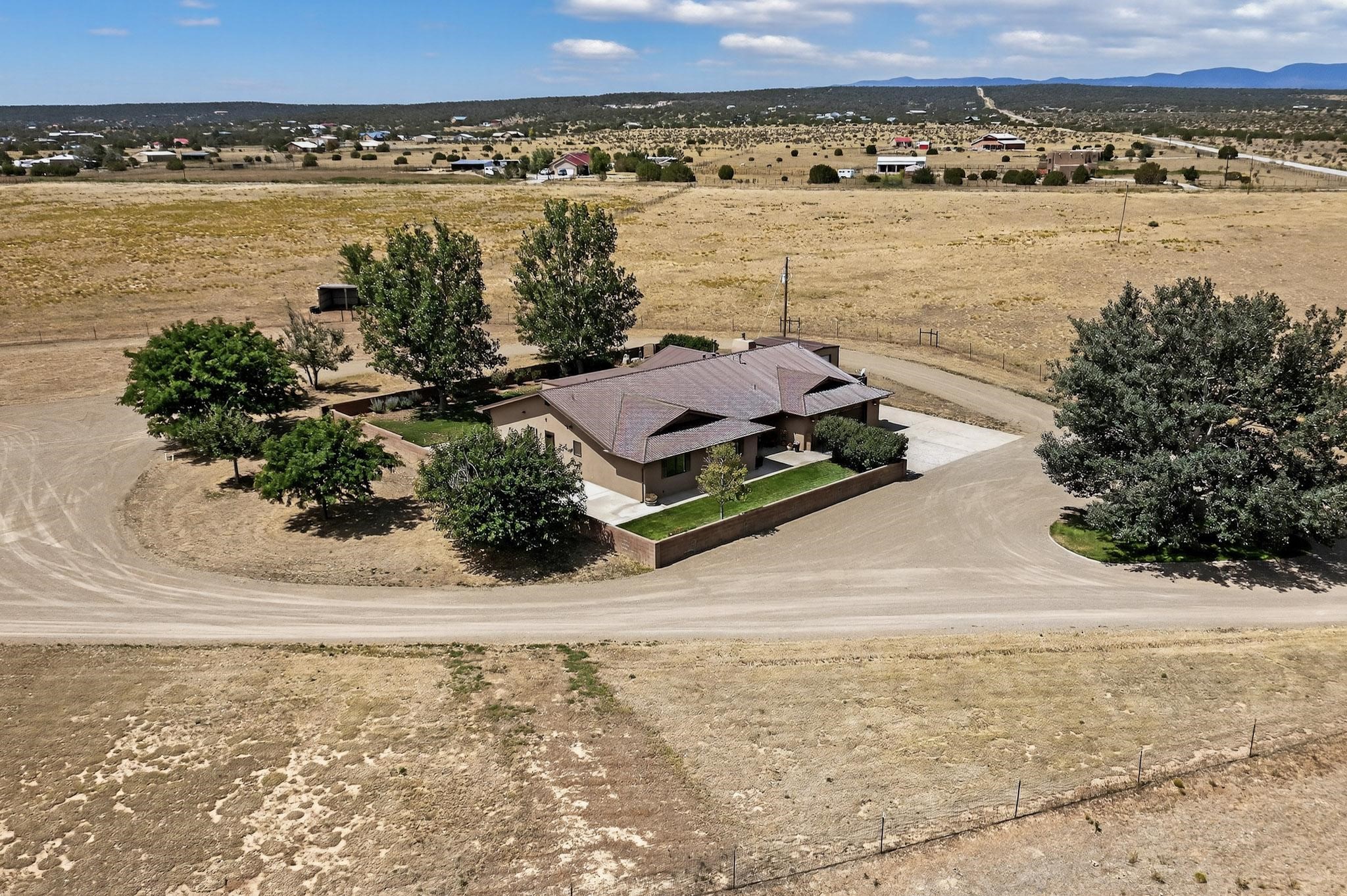This true equine estate has finally come on the market so don't miss your opportunity to own this amazing property. 38.8 acres fully fenced and cross fenced! 3051 heated sqft of main home and guest suite. This estate home boasts hardwood floors throughout, with custom touches, large spacious open floor plan with great room and kitchen for entertaining, primary bedroom suite with wall to wall closets, double vanities, and exterior access. 3bed 2bath main home, 2 living areas, gourmet stainless steel kitchen, laundry room with storage. There are so many built in storage and closets the possibilities are endless on how you use it. Oversized finished 2 car garage with built in storage. 4 stall barn with finished tack room, and 1 bedroom, 1 bath, kitchenette, walk in closet: guest suite.Not only are you going to love this estate, but your animals will love it too! Full sized arena for your use and three cross fenced pastures all with barn loafing sheds. Water has been run throughout the property to the barns for the convenience of keeping the critters taken care of. The approx. 2300 sqft barn has pull through capability, a finished tack room, 4 walk out stalls, hay storage, rubber floor mats, and a 363 sqft guest living quarters! A large equine estate like this doesn't come up for sale in the East Mountains/Southern Santa Fe County area too often, and none are as nice and custom as this property. If you are needing a place to kick up your boots, let your critters stretch their legs, and for yourself to relax from dawn to dusk, you have found your 38.8 acre slice of paradise with this equine estate.