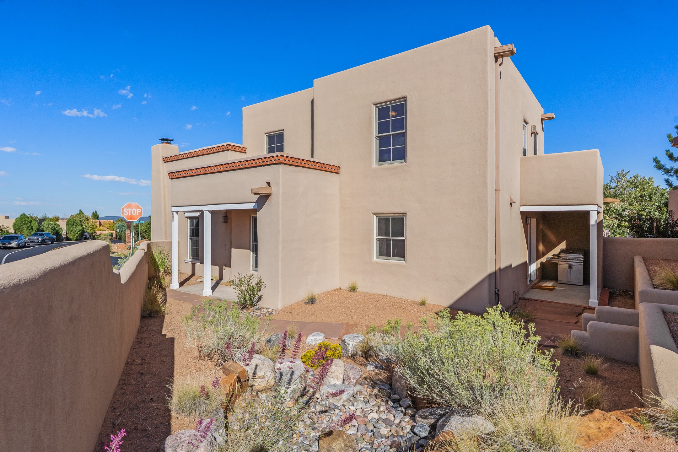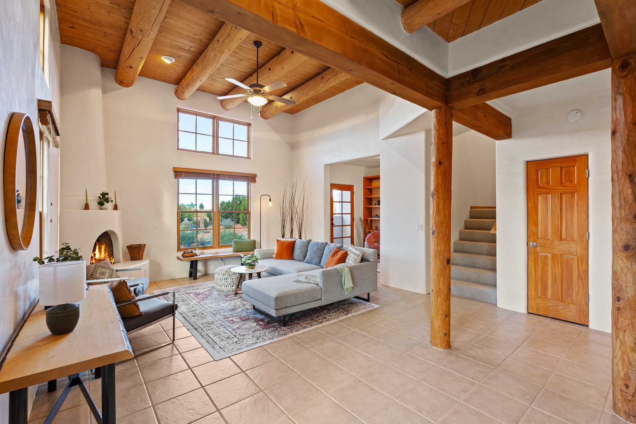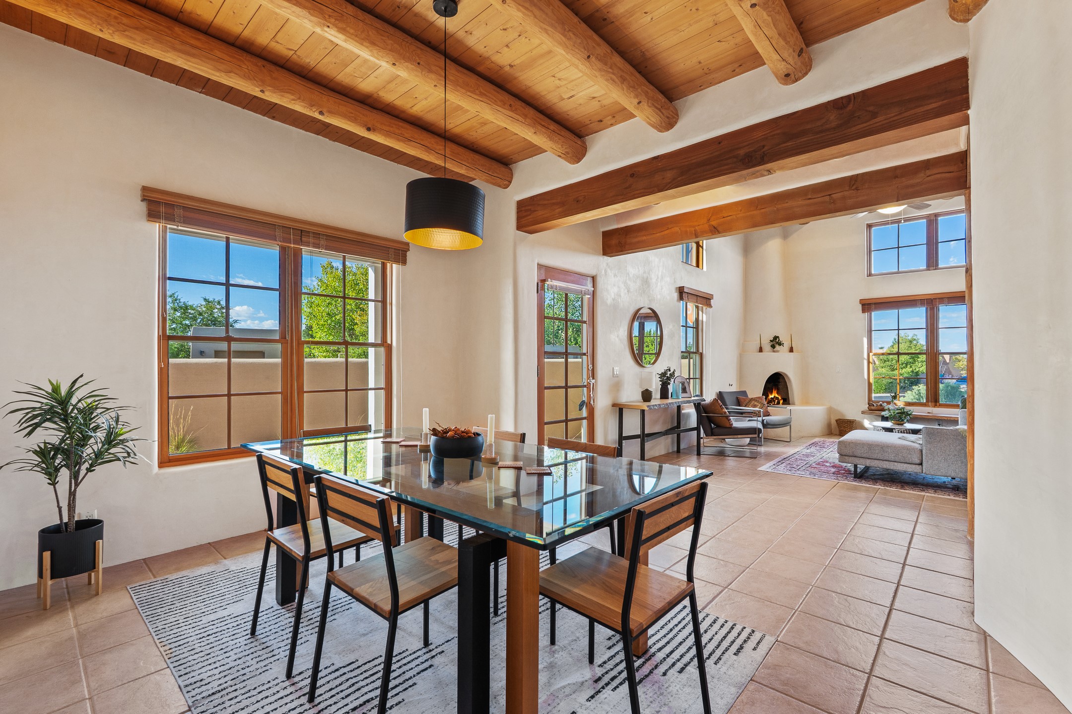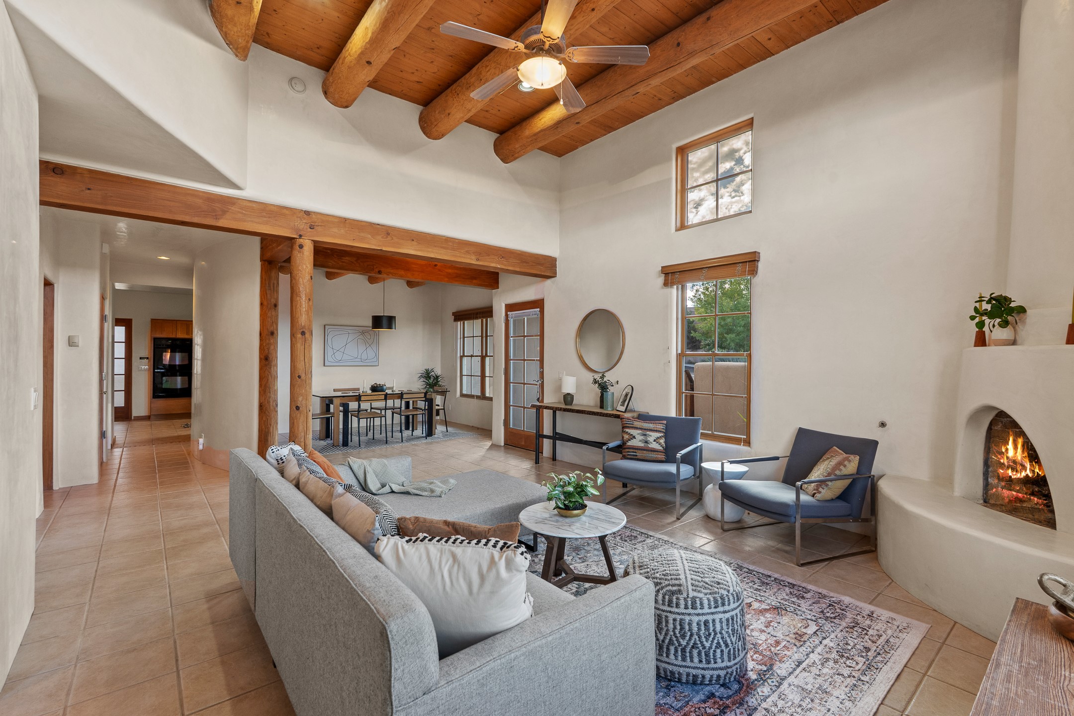First time on the market in Santa Fe's Aldea de Santa Fe community! Built in 2003 by Bruce Thompson, this wonderfully flexible configuration offers a three-bedroom main house and detached casita perfectly suited to serve creative pursuits and hosting-needs. The main home's central living and dining spaces are adorned with Santa Fe-classics: plaster walls, viga-accented ceilings, and a cozy wood-burning kiva fireplace. Adjacent to the light-filled living room is a private nook, finished with built-in bookcases, that functions effortlessly as an office/study, secondary seating area, or creative space. The kitchen is complete with abundant countertop space, ample cabinetry/storage and an informal dining area. Upstairs, the primary bedroom is a relaxing retreat with its own private deck. Outside, the patio area is a serene setting to unwind and the surrounding yard is well-suited for low-fuss flower and garden beds. The detached 345+/- sqft casita is a work-from-home dream, or a comfortable arrangement for hosting friends and family. Sensibility and style collide in one of Santa Fe's vibrant and well-cared for communities. Aldea is an active community with miles of walking trails, a community center and other amenities--all just 15 minutes from downtown Santa Fe.