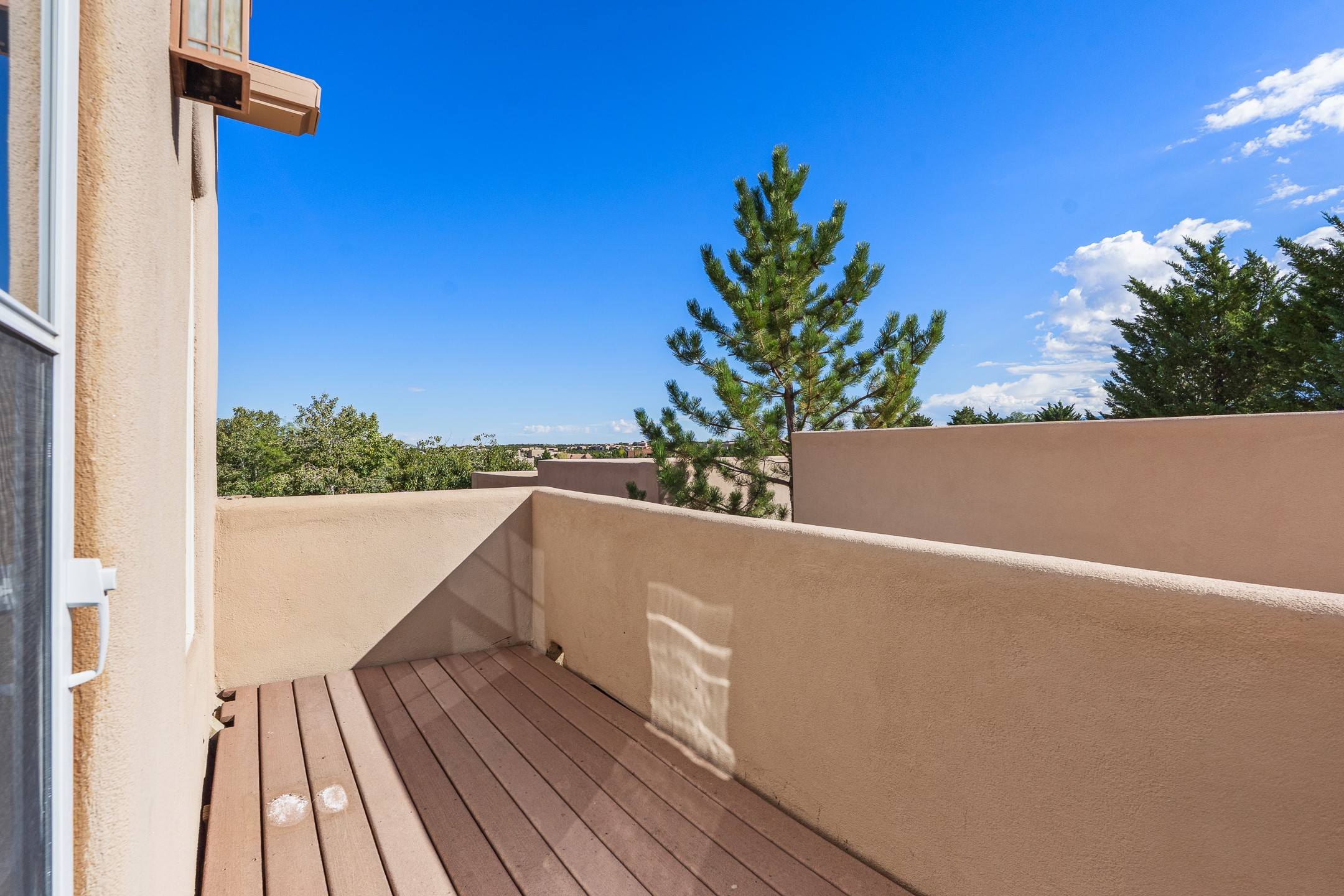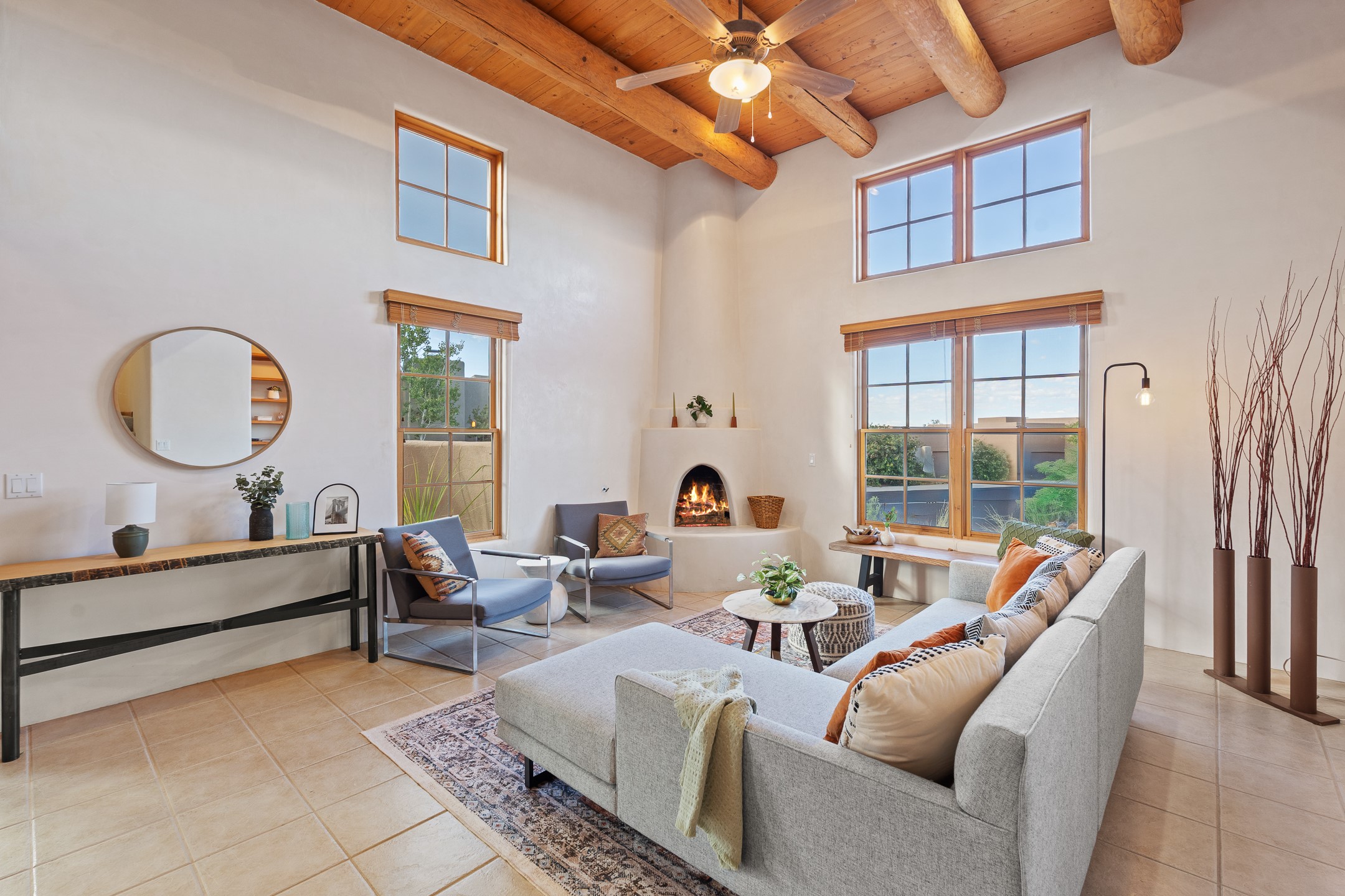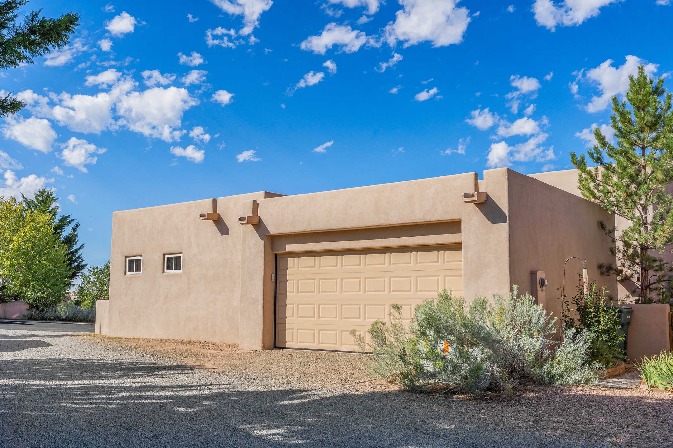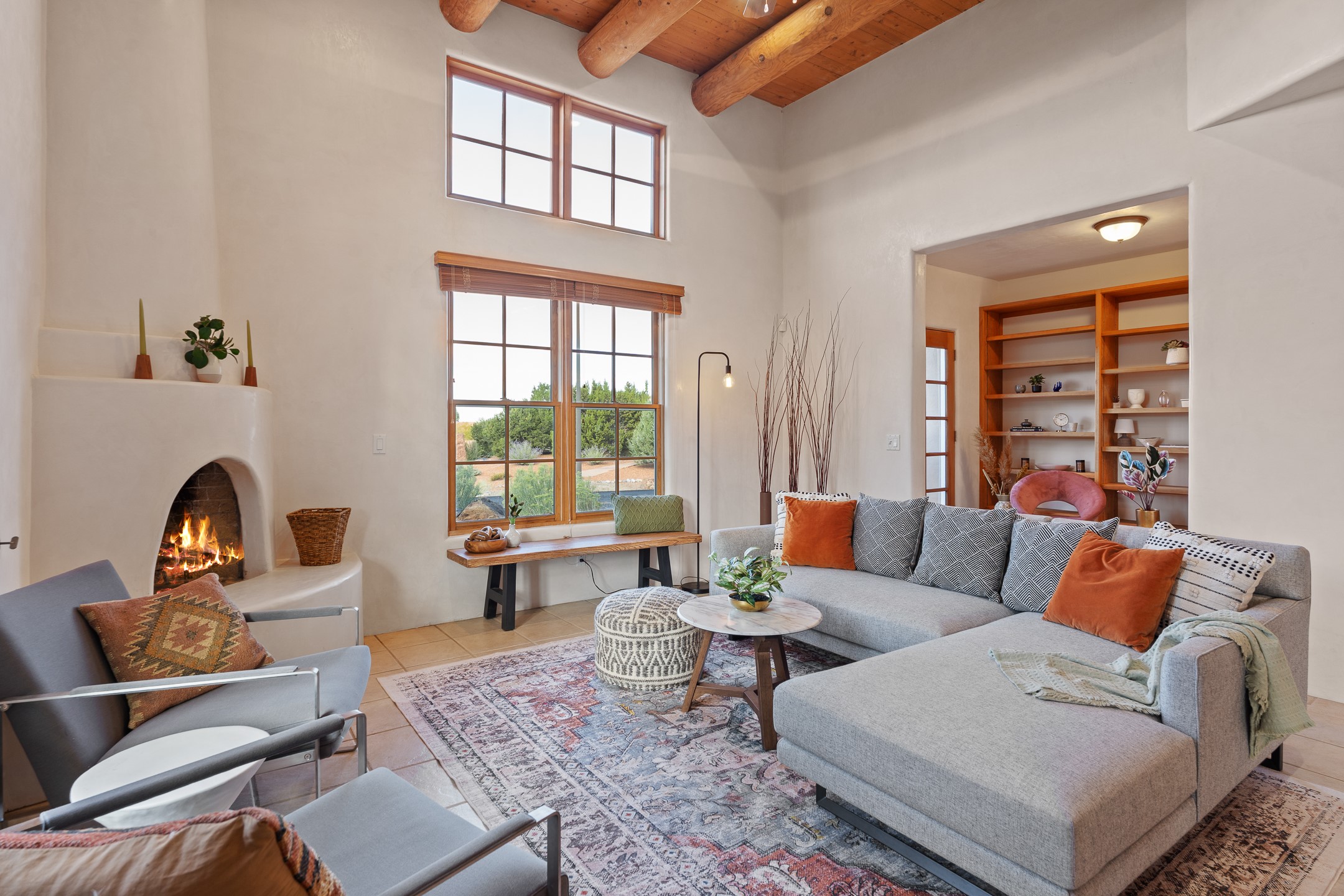 First time on the market in Santa Fe's Aldea de Santa Fe community! Built in 2003 by Bruce Thompson, this wonderfully flexible configuration offers a three-bedroom main house and detached casita perfectly suited to serve creative pursuits and hosting-needs. The main home's central living and dining spaces are adorned with Santa Fe-classics: plaster walls, viga-accented ceilings, and a cozy wood-burning kiva fireplace. Adjacent to the light-filled living room is a private nook, finished with built-in bookcases, that functions effortlessly as an office/study, secondary seating area, or creative space. The kitchen is complete with abundant countertop space, ample cabinetry/storage and an informal dining area. Upstairs, the primary bedroom is a relaxing retreat with its own private deck. Outside, the patio area is a serene setting to unwind and the surrounding yard is well-suited for low-fuss flower and garden beds. The detached 345+/- sqft casita is a work-from-home dream, or a comfortable arrangement for hosting friends and family. Sensibility and style collide in one of Santa Fe's vibrant and well-cared for communities. Aldea is an active community with miles of walking trails, a community center and other amenities--all just 15 minutes from downtown Santa Fe.