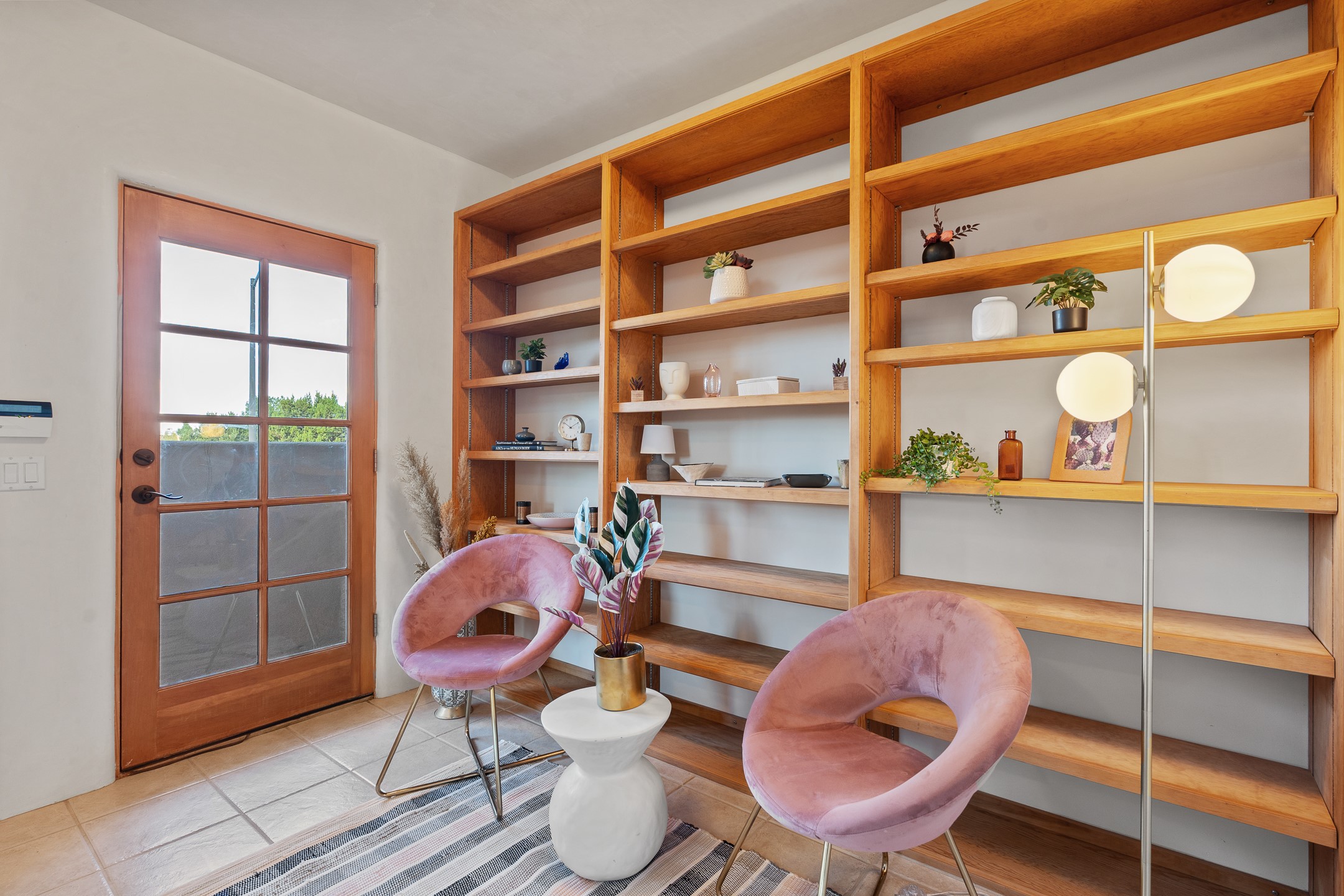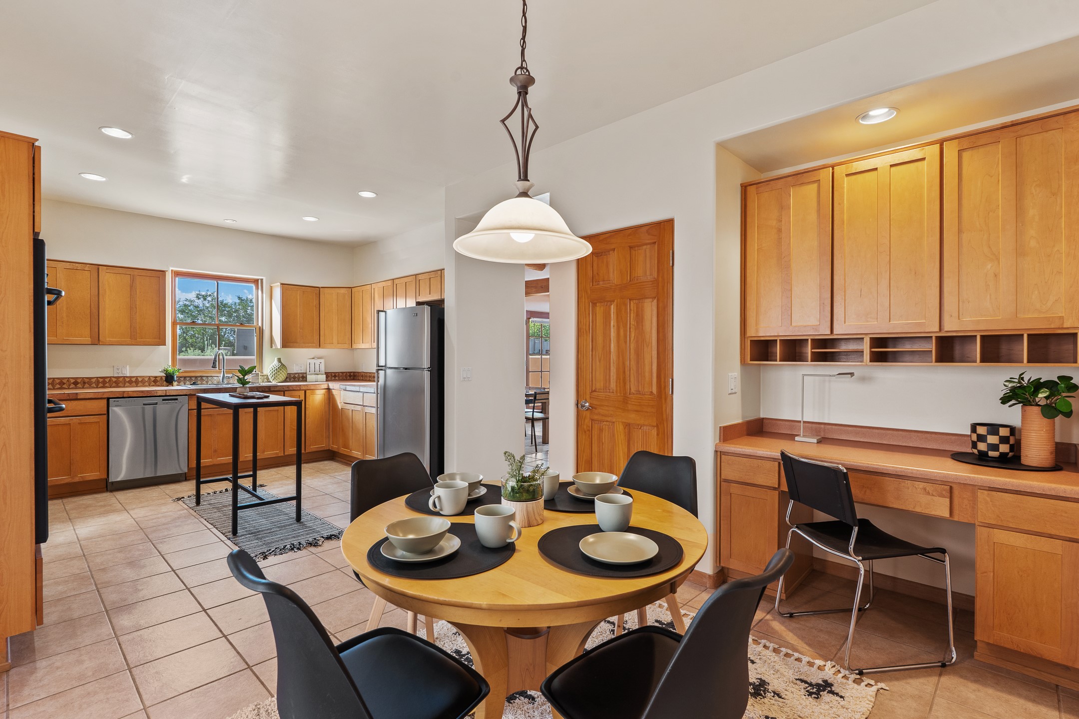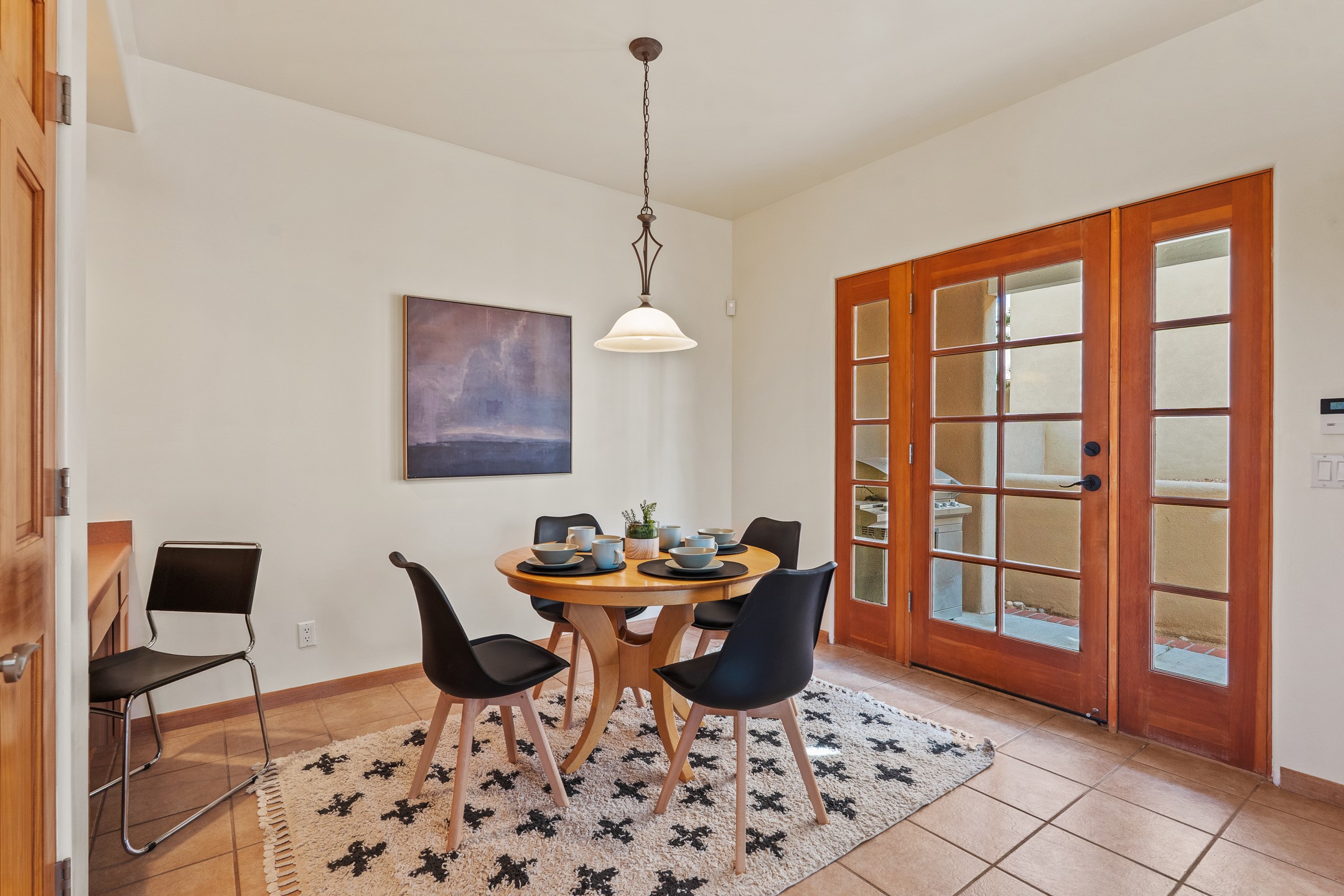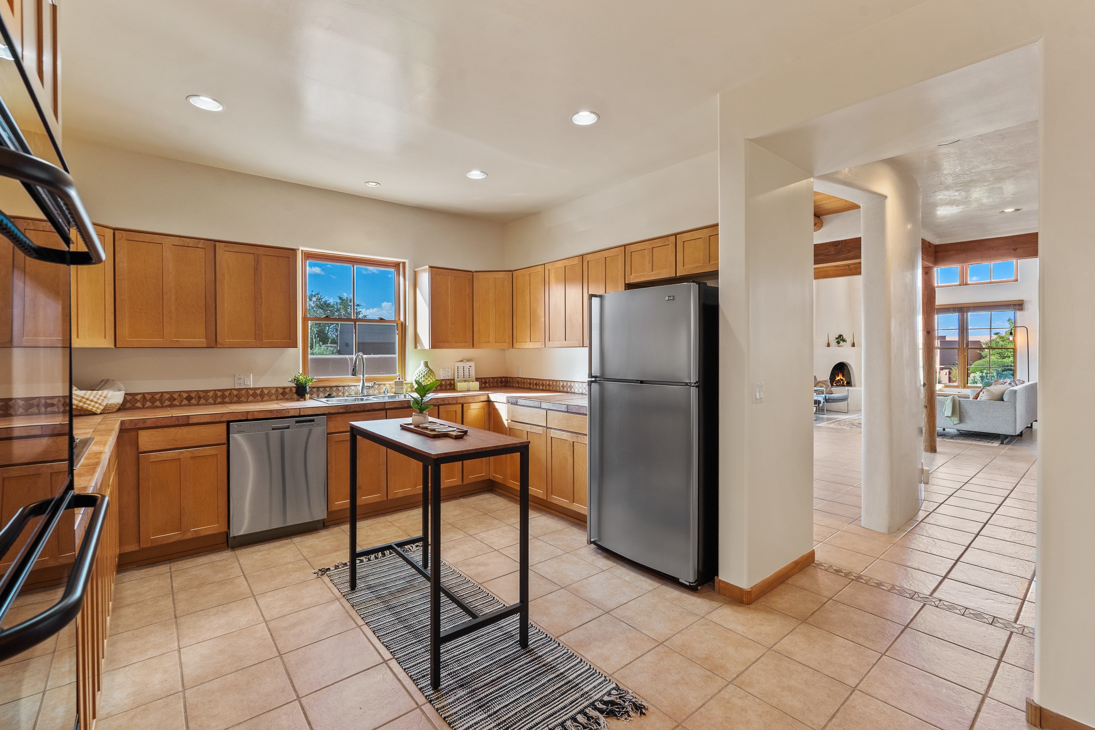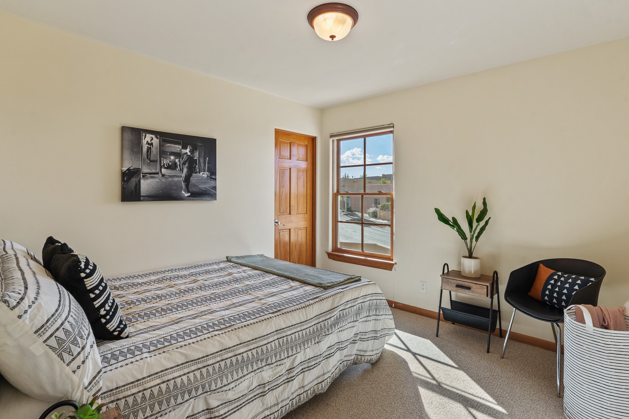 First time on the market in Santa Fe's Aldea de Santa Fe community! Built in 2003 by Bruce Thompson, this wonderfully flexible configuration offers a three-bedroom main house and detached casita perfectly suited to serve creative pursuits and hosting-needs. The main home's central living and dining spaces are adorned with Santa Fe-classics: plaster walls, viga-accented ceilings, and a cozy wood-burning kiva fireplace. Adjacent to the light-filled living room is a private nook, finished with built-in bookcases, that functions effortlessly as an office/study, secondary seating area, or creative space. The kitchen is complete with abundant countertop space, ample cabinetry/storage and an informal dining area. Upstairs, the primary bedroom is a relaxing retreat with its own private deck. Outside, the patio area is a serene setting to unwind and the surrounding yard is well-suited for low-fuss flower and garden beds. The detached 345+/- sqft casita is a work-from-home dream, or a comfortable arrangement for hosting friends and family. Sensibility and style collide in one of Santa Fe's vibrant and well-cared for communities. Aldea is an active community with miles of walking trails, a community center and other amenities--all just 15 minutes from downtown Santa Fe.
