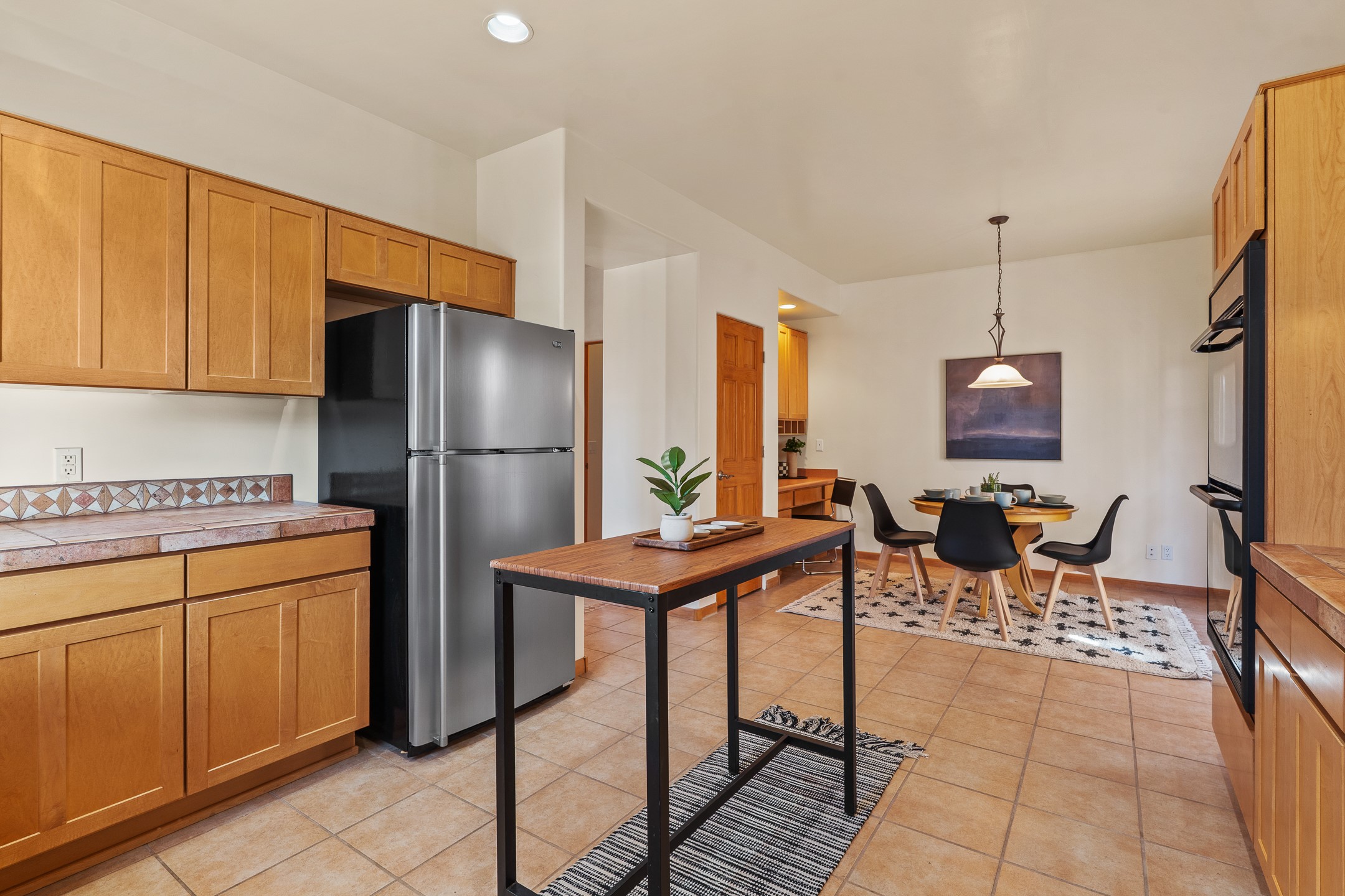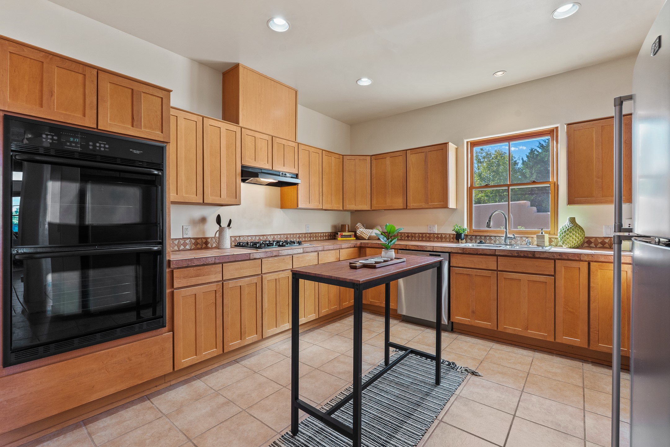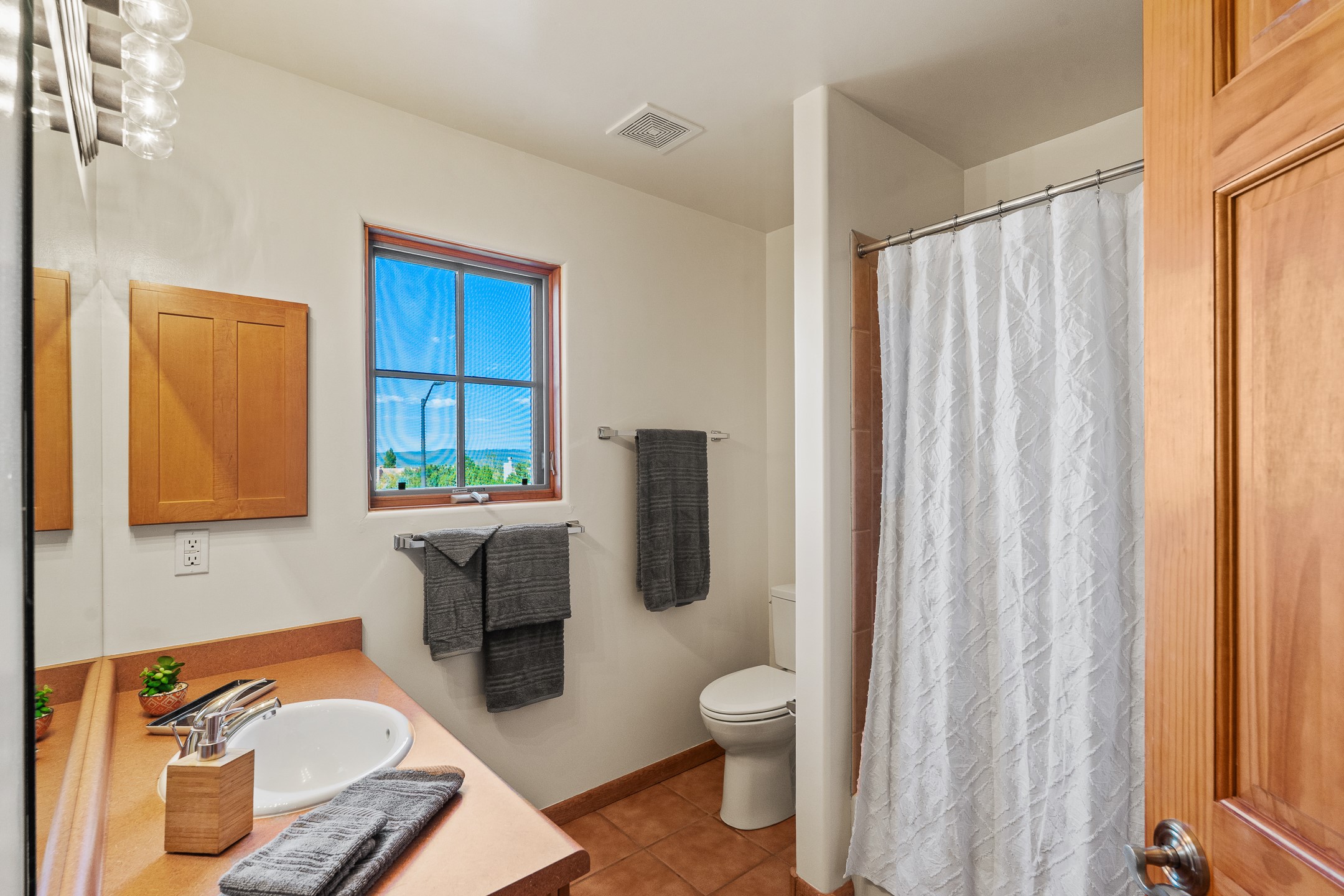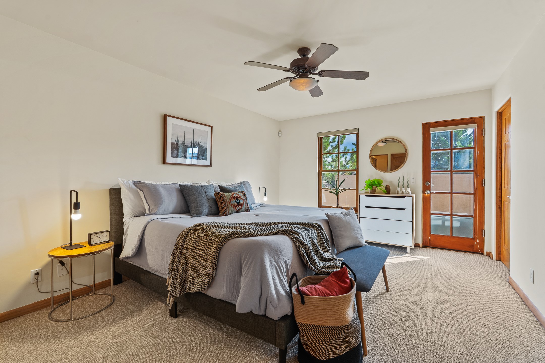 First time on the market in Santa Fe's Aldea de Santa Fe community! Built in 2003 by Bruce Thompson, this wonderfully flexible configuration offers a three-bedroom main house and detached casita perfectly suited to serve creative pursuits and hosting-needs. The main home's central living and dining spaces are adorned with Santa Fe-classics: plaster walls, viga-accented ceilings, and a cozy wood-burning kiva fireplace. Adjacent to the light-filled living room is a private nook, finished with built-in bookcases, that functions effortlessly as an office/study, secondary seating area, or creative space. The kitchen is complete with abundant countertop space, ample cabinetry/storage and an informal dining area. Upstairs, the primary bedroom is a relaxing retreat with its own private deck. Outside, the patio area is a serene setting to unwind and the surrounding yard is well-suited for low-fuss flower and garden beds. The detached 345+/- sqft casita is a work-from-home dream, or a comfortable arrangement for hosting friends and family. Sensibility and style collide in one of Santa Fe's vibrant and well-cared for communities. Aldea is an active community with miles of walking trails, a community center and other amenities--all just 15 minutes from downtown Santa Fe.