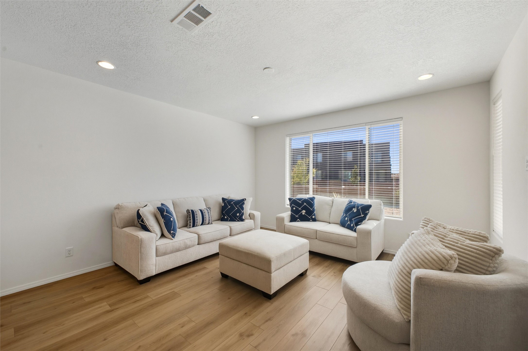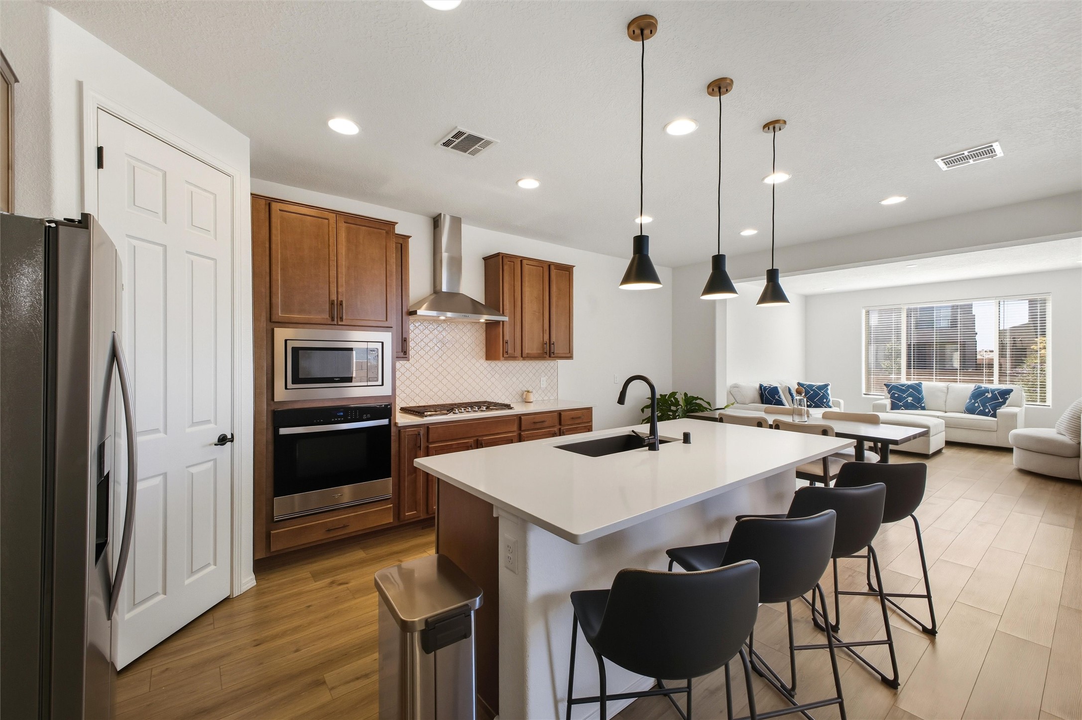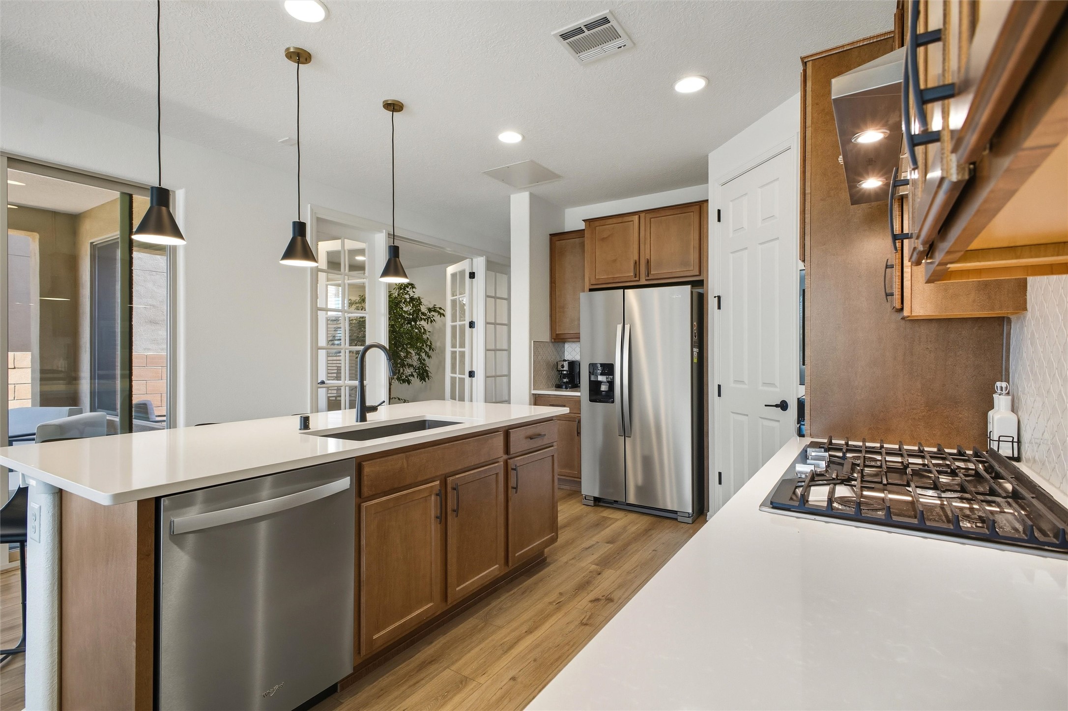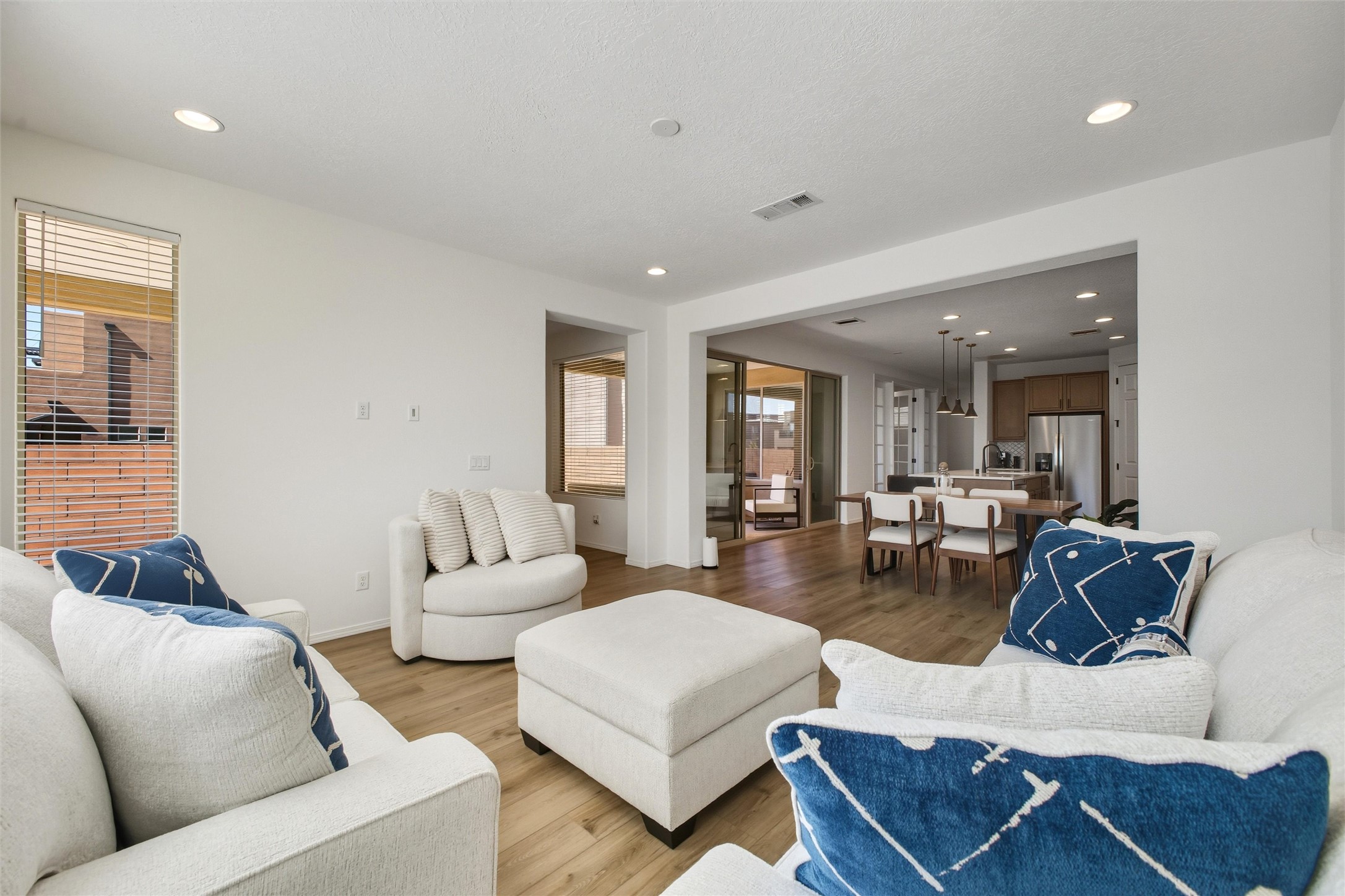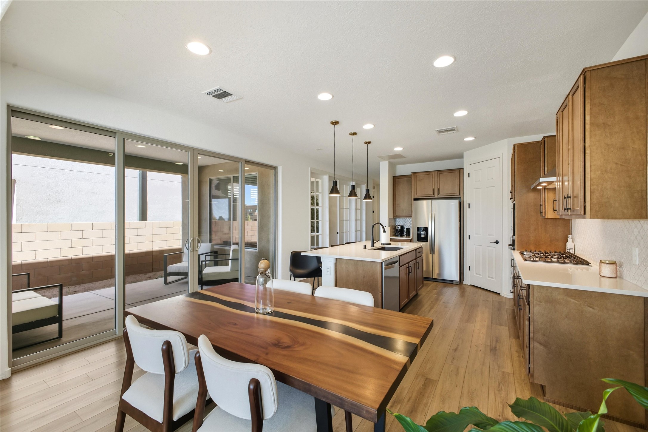 Welcome to your nearly new, 2023 Pulte home, the lovely covered entry portal provides protection from the weather, inside you'll be surprised by the double door closet providing ample storage space. The light and bright floor plan begins with a spacious living room that blends well with the open-concept kitchen and dining space, luxury vinyl flooring throughout. Your well-equipped kitchen features a generous island with seating, spacious pantry, wall oven, 5-burner gas cooktop, modern finishes, newer stainless-steel appliances, custom cabinets, and beautiful quartz countertops. Two sliding doors across from the island offer you easy access to enjoy the lovely Santa Fe weather while you lounge under your covered patio in your private-side courtyard. Just off the kitchen, adorned with beautiful French doors, you'll find a dedicated flex space that you could use as an office, den, or media room, centrally located but separate. The first floor also features a full-sized laundry room, below stair closet/storage and easy access to your two-car garage, all providing you more storage spaces. Upstairs, you'll discover your versatile bonus room, perfect for a kids' playroom, home gym, media space, the opportunities are endless. Your home comes complete with two bedrooms that share a full bath in the hallway, and a spacious primary owner's suite. The primary en-suite bath features double vanities, a generous glass-enclosed tiled shower, and a private water closet, all connected to a large walk-in closet. Your home features an on-demand, energy efficient, tankless hot water heater, central heat and refrigerated A/C, all designed to provide hours of indoor comfort. The Las Soleras community is located just minutes from I-25, the 599, medical facilities, and a plethora of shopping and dining options. Bordering the Las Soleras community you'll find a large open space featuring a park that offers a basketball court, playground, dog run, walking trial and a cabana for entertaining.