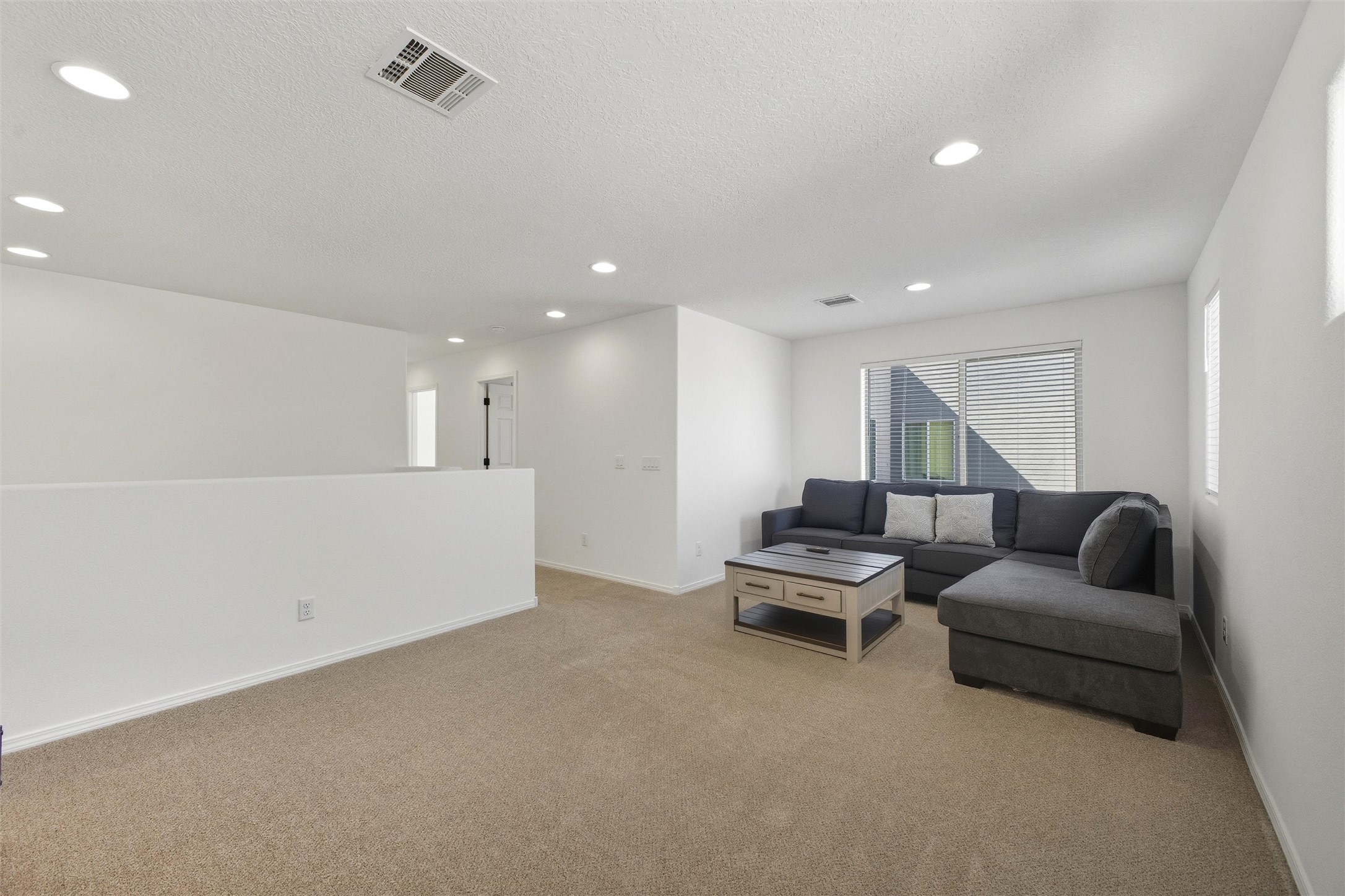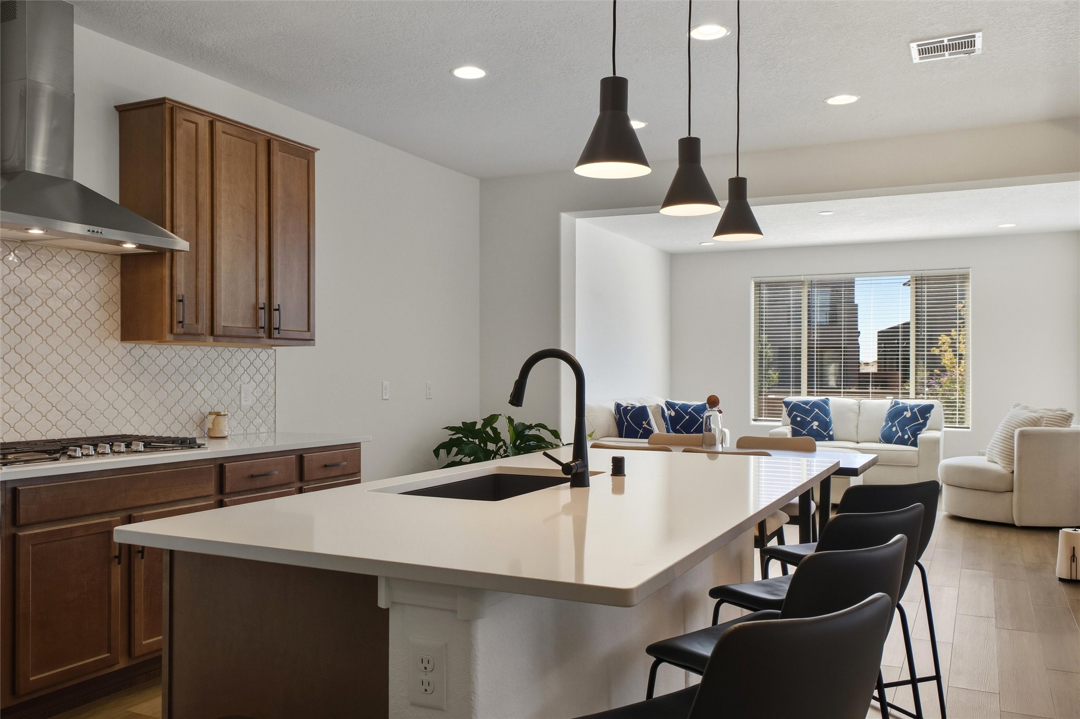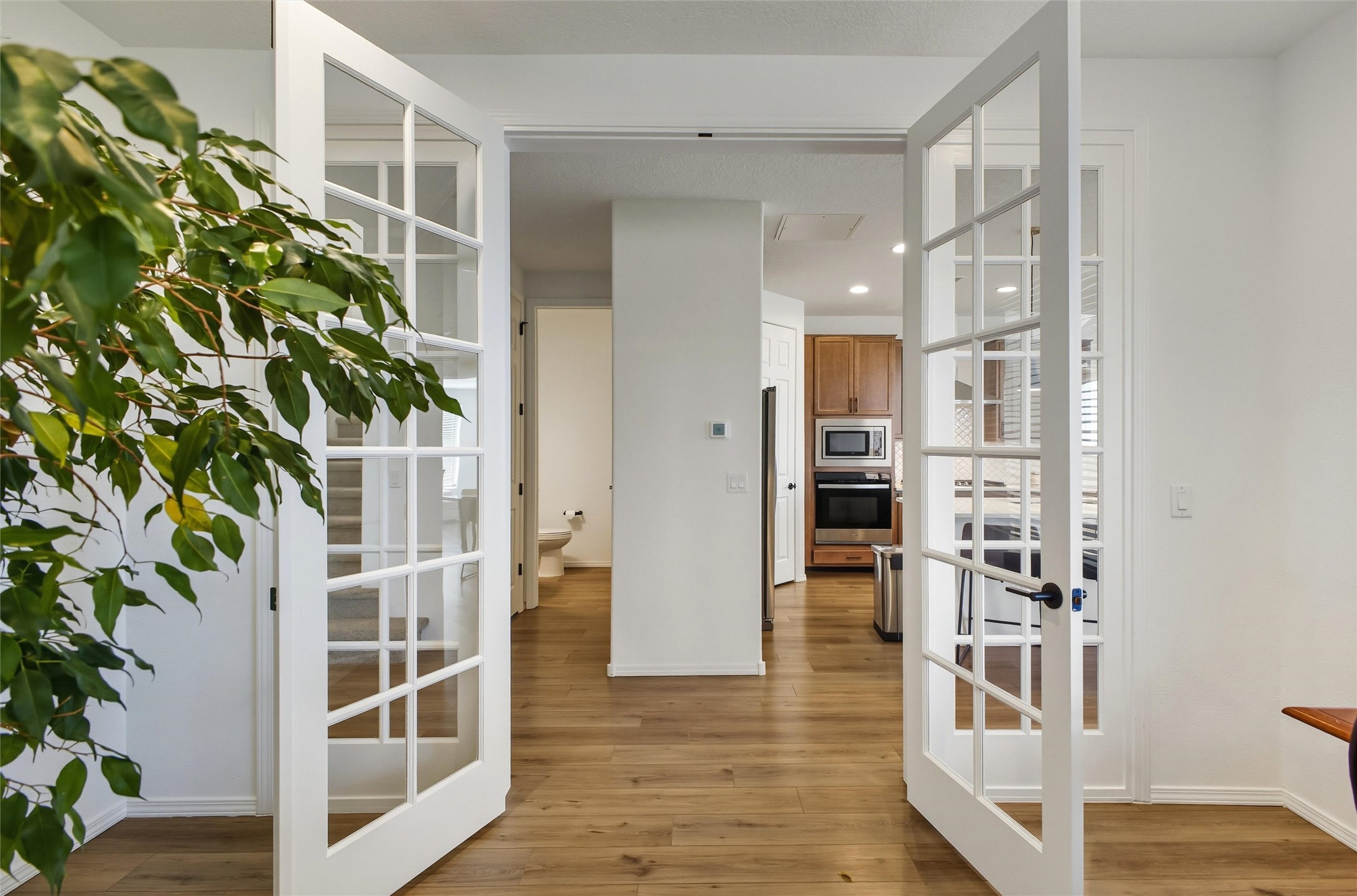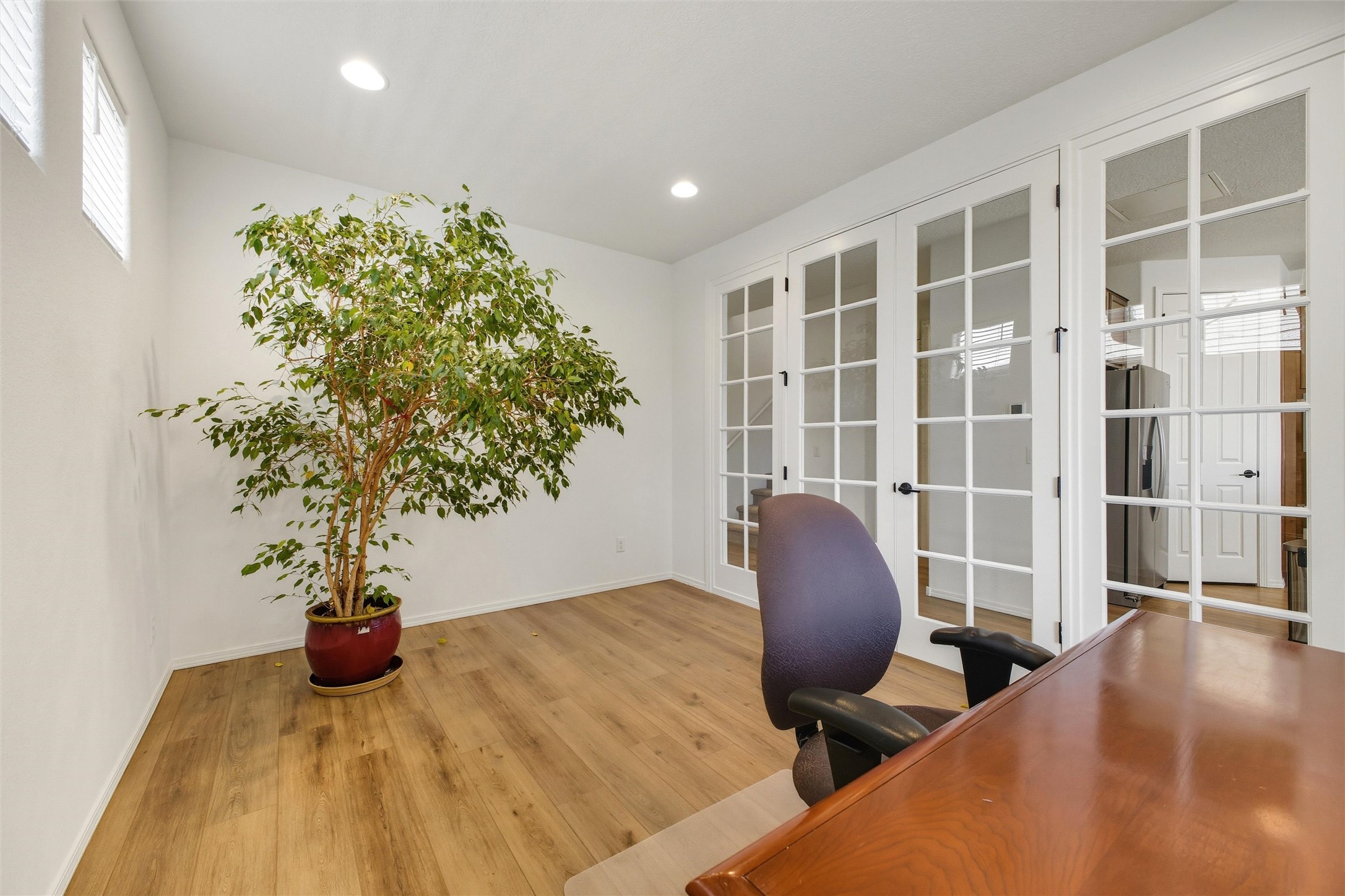 Welcome to your nearly new, 2023 Pulte home, the lovely covered entry portal provides protection from the weather, inside you'll be surprised by the double door closet providing ample storage space. The light and bright floor plan begins with a spacious living room that blends well with the open-concept kitchen and dining space, luxury vinyl flooring throughout. Your well-equipped kitchen features a generous island with seating, spacious pantry, wall oven, 5-burner gas cooktop, modern finishes, newer stainless-steel appliances, custom cabinets, and beautiful quartz countertops. Two sliding doors across from the island offer you easy access to enjoy the lovely Santa Fe weather while you lounge under your covered patio in your private-side courtyard. Just off the kitchen, adorned with beautiful French doors, you'll find a dedicated flex space that you could use as an office, den, or media room, centrally located but separate. The first floor also features a full-sized laundry room, below stair closet/storage and easy access to your two-car garage, all providing you more storage spaces. Upstairs, you'll discover your versatile bonus room, perfect for a kids' playroom, home gym, media space, the opportunities are endless. Your home comes complete with two bedrooms that share a full bath in the hallway, and a spacious primary owner's suite. The primary en-suite bath features double vanities, a generous glass-enclosed tiled shower, and a private water closet, all connected to a large walk-in closet. Your home features an on-demand, energy efficient, tankless hot water heater, central heat and refrigerated A/C, all designed to provide hours of indoor comfort. The Las Soleras community is located just minutes from I-25, the 599, medical facilities, and a plethora of shopping and dining options. Bordering the Las Soleras community you'll find a large open space featuring a park that offers a basketball court, playground, dog run, walking trial and a cabana for entertaining.