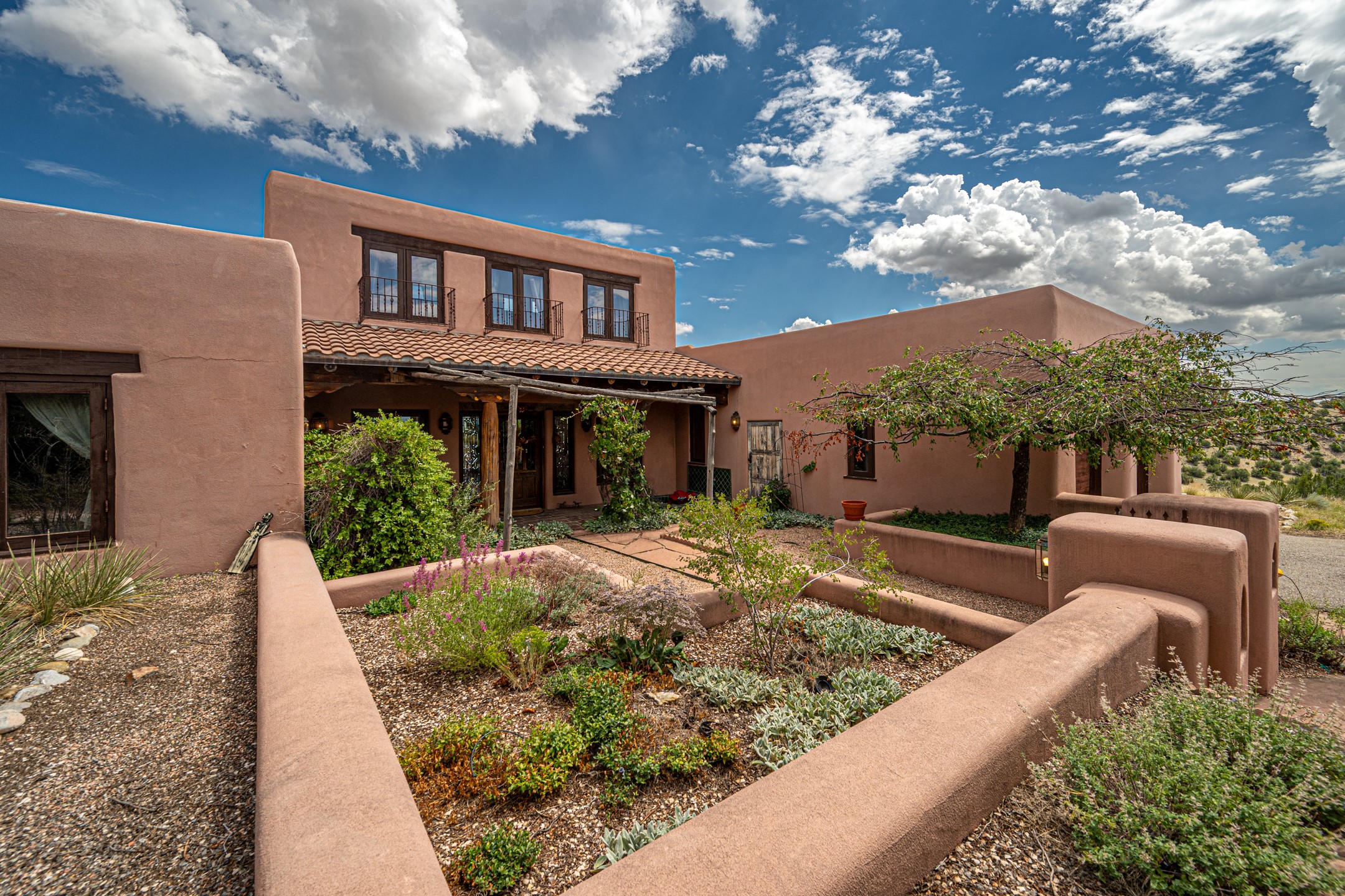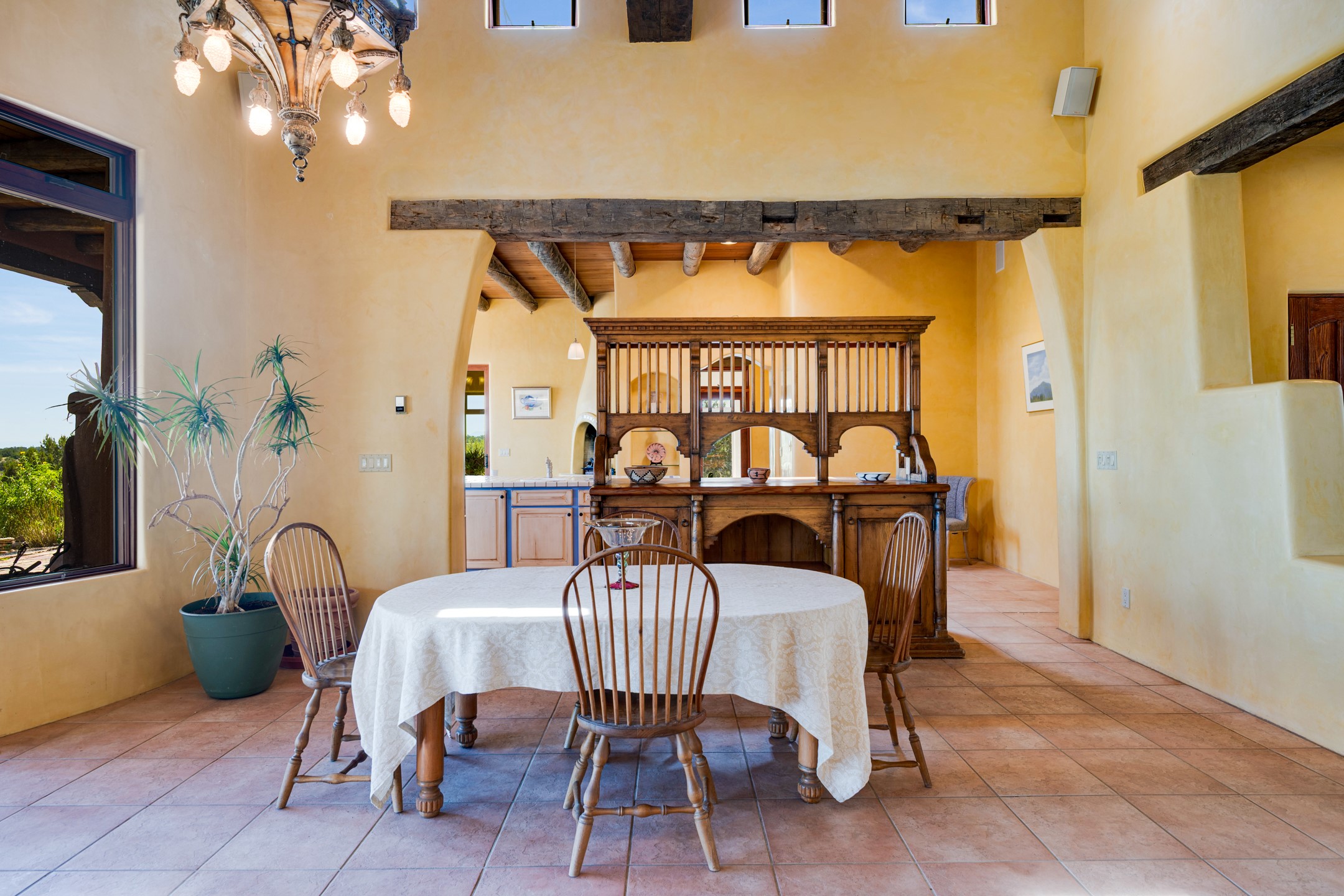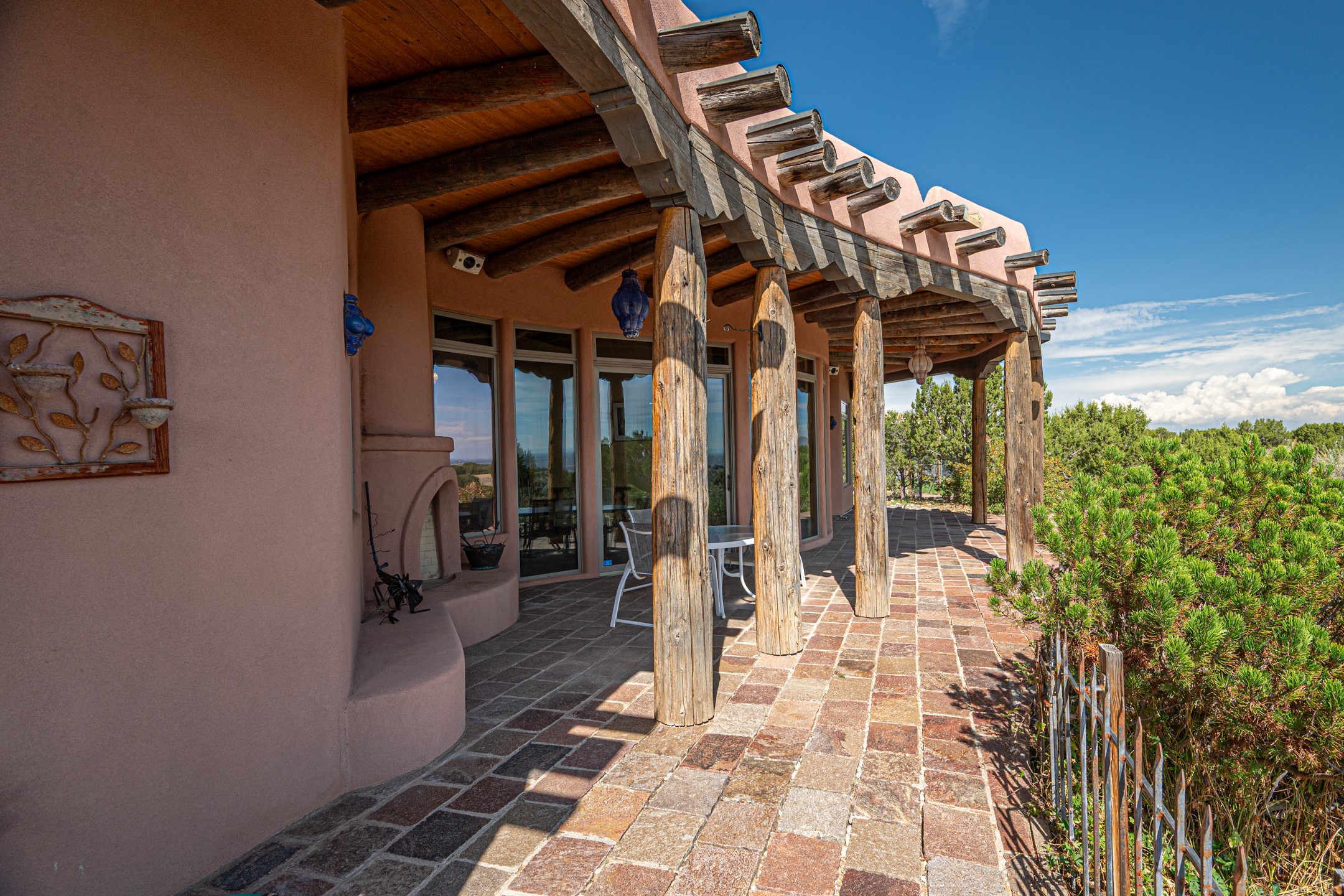 Oro Viejo Ranch is a timeless sanctuary on 106 acres. A harmonious blend of natural splendor, meticulous craftsmanship, and modern convenience. There are breathtaking panoramic views of the Sangre de Cristo, Ortiz Mountains, Cerrillos Hills, and the iconic Lone Butte. The main residence showcases authentic Southwest style, adobe and rastra construction. It features intricate plasterwork, recycled wood vigas, and a heated indoor pool, the rooftop deck offers truly unobstructed views. The solid oak cabin adds rustic charm, originally owned by the Hoover family, and rebuilt on-site. Horse enthusiasts will appreciate the six-stall, barn, tack room, workshop, covered hay storage, electric, and hot water, and protected outdoor runs. An insulated chicken coop provides the perfect setup for fresh eggs, while a private well with a large storage tank ensures a reliable water source.A convenient RV hookup is also available on the property.