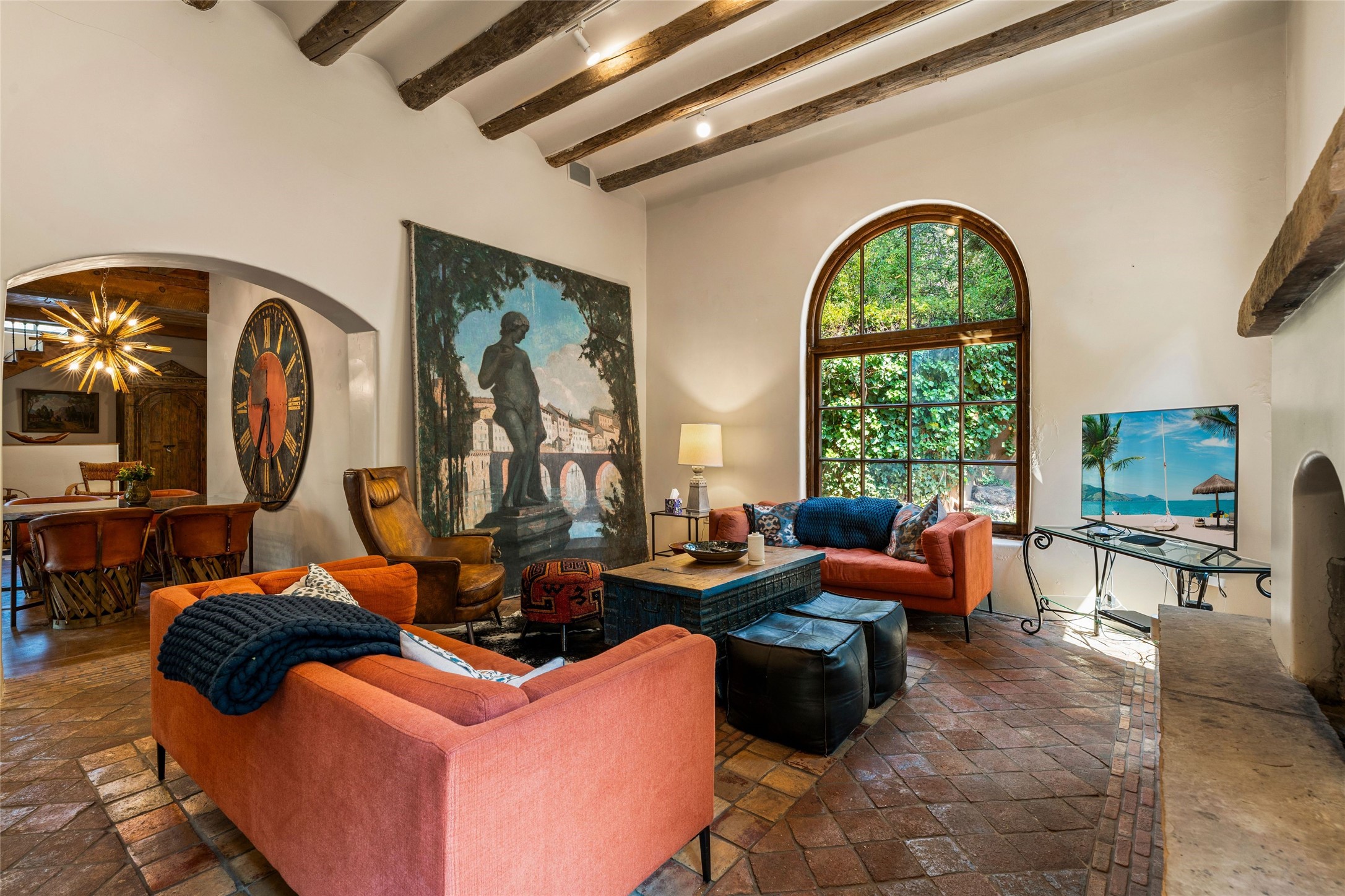 Exquisite 3-bedroom, 3.5-bath vacation rental or primary home and guest house. Excellent on Hyde Park Road situated in a tranquil, gated forest setting, just 10 miles from the Santa Fe Ski Basin. Additionally, the world-famous Ten Thousand Waves spa is right across the road, providing a serene escape for relaxation and rejuvenation. Elegantly designed property featuring imported floor tiles and windows from France. The layout is thoughtfully divided by a foyer, creating the unique opportunity for single family, live/work property or dual living spaces--perfect for families, guests, creative types, or even rental opportunities. The main house has a large living room with stately fireplace, dining room, kitchen, and two bedrooms including one upstairs. The attached guesthouse has a living room, dining room and a generous-sized kitchen with sufficient space for a table for 4-6 and one luxury suite with a glam soaking tub in its bedroom. Recent upgrades enhance the home's appeal, including a new roof, new BBQs, and several new mini splits for comfort in every season. Multiple outdoor areas and portals invite you to enjoy the breathtaking surroundings, whether it's morning coffee on the patio or evening gatherings under the stars. Short drive to the historic Santa Fe Plaza or take public transportation right out your front door.