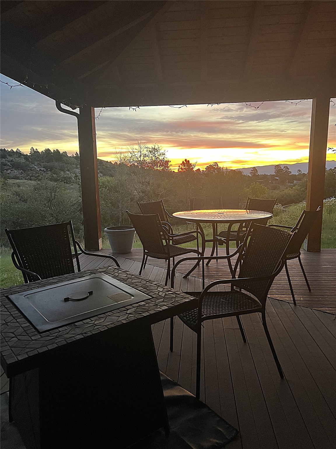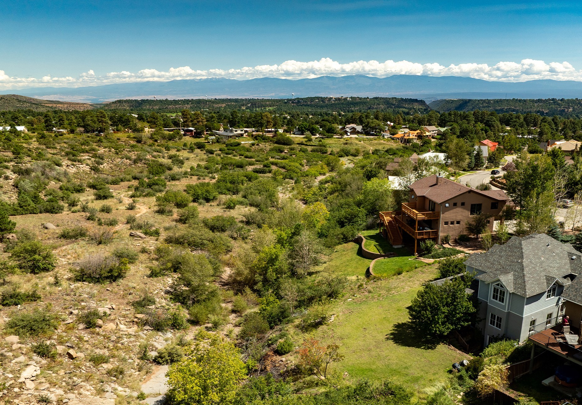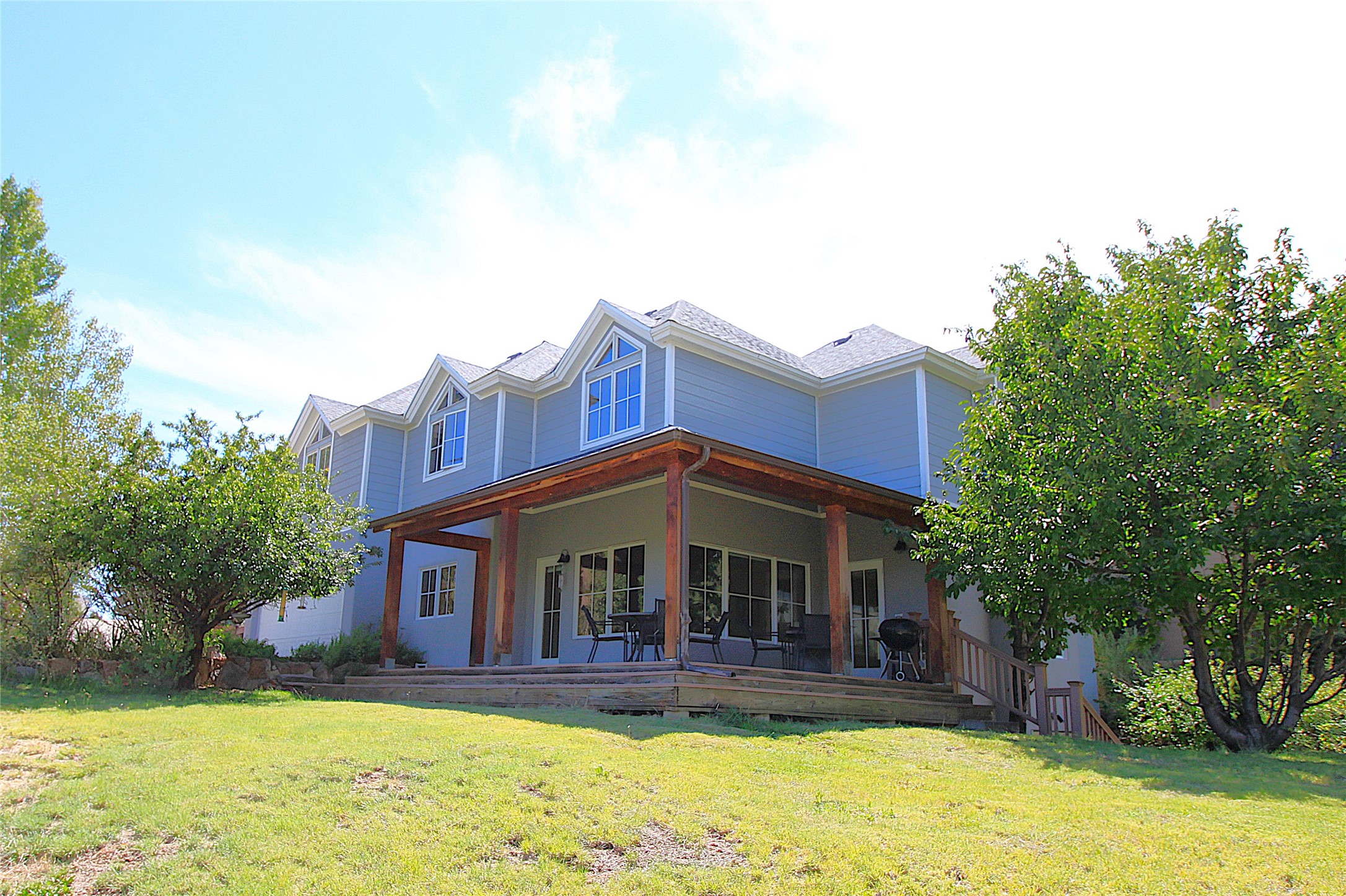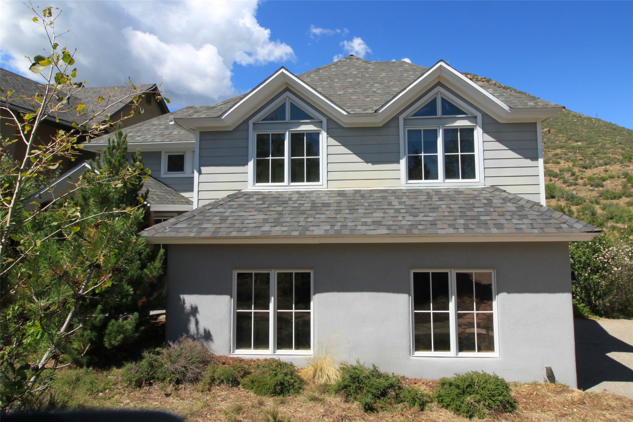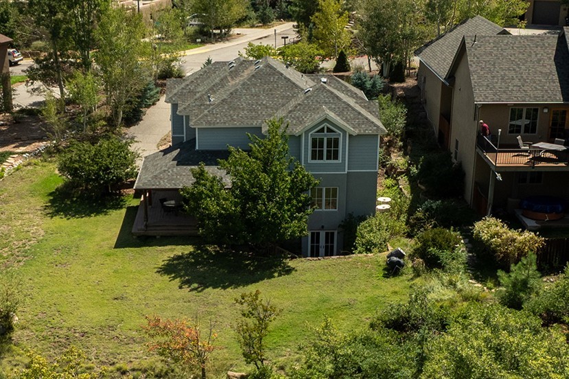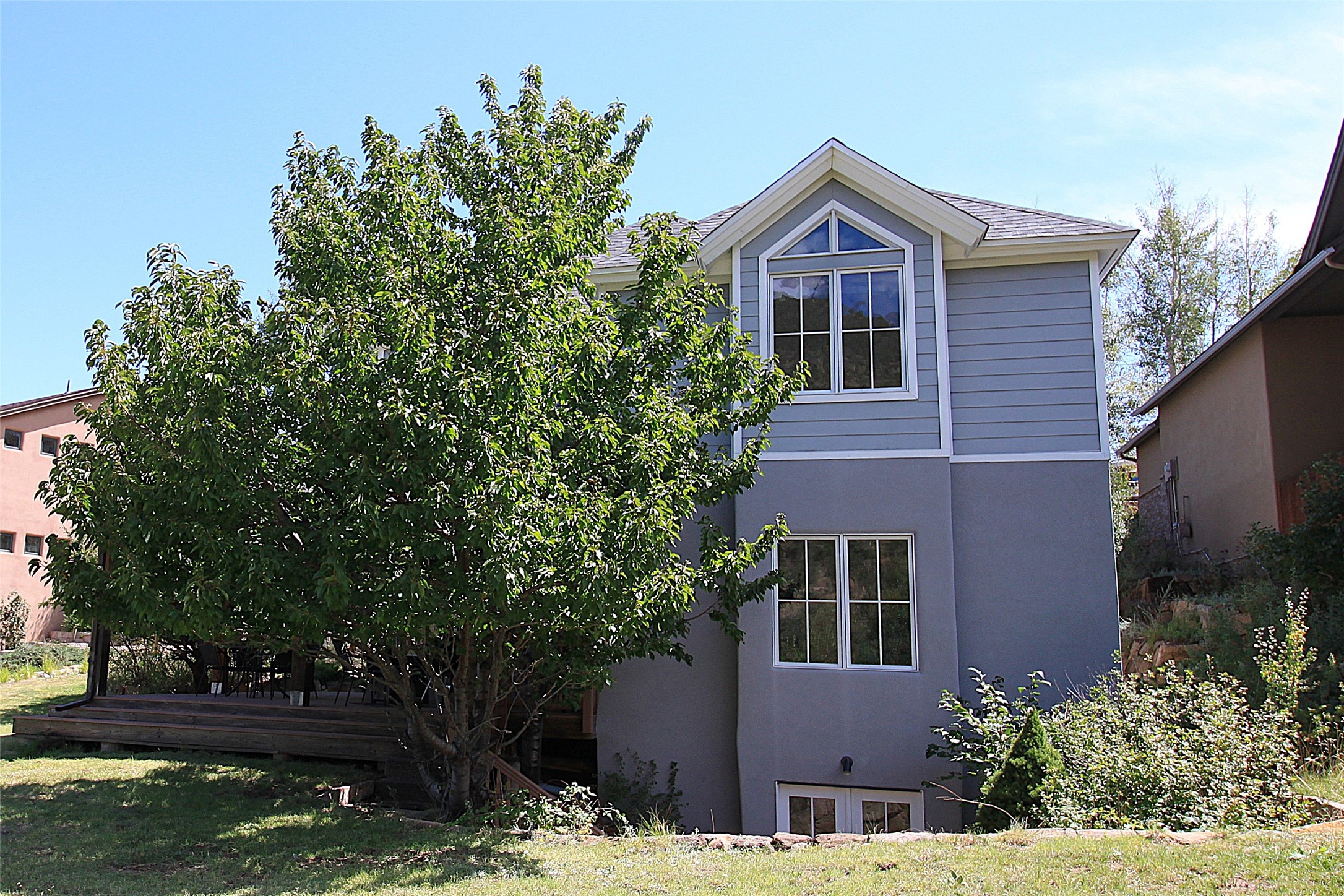 This stunning 4-bedroom, 2.5-bath Quemazon home backs to open space, offering privacy and direct access to the Perimeter Trail. The open floor plan flows seamlessly between the kitchen, dining, and living areas, with easy access to the covered Trex deck--perfect for enjoying mountain and forest views as well as the private backyard. The spacious primary suite includes a private study framed by French doors, dual walk-in closets, and a luxurious en-suite bath with dual sinks and a freestanding tub. Three additional bedrooms and a well-appointed hall bath complete the layout. A walk-out basement with additional living space and a crawl space for storage adds flexibility. Thoughtful details include architectural touches throughout the home, in-floor radiant heat with four zones, WindsorLite windows, six-panel wood doors, ceiling fans in every bedroom and the living room, track lighting, and Kohler fixtures. The kitchen is equipped with a Bosch dishwasher, gas stove/oven, and a newer refrigerator (2022). Major updates include roof replacement in 2009 with a lower-roof update in 2025, and a full stucco renovation in 2019. Outdoors, mature fruit trees--cherry, apple, pear, plum, apricot, nectarine, and peach--along with raspberries, drought-tolerant blue grama grass, and a private front yard with precision-cut stone walls, create a serene retreat. French drains along the west side provide peace of mind. This Quemazon gem blends comfort, thoughtful upgrades, and a premier setting with trails at your doorstep.