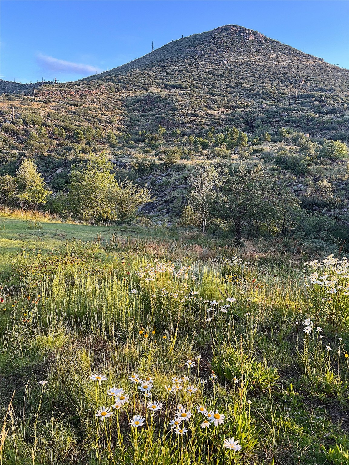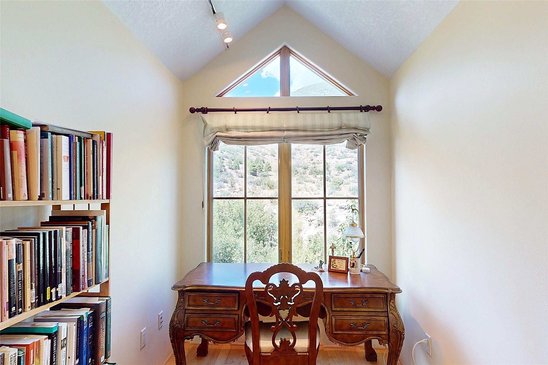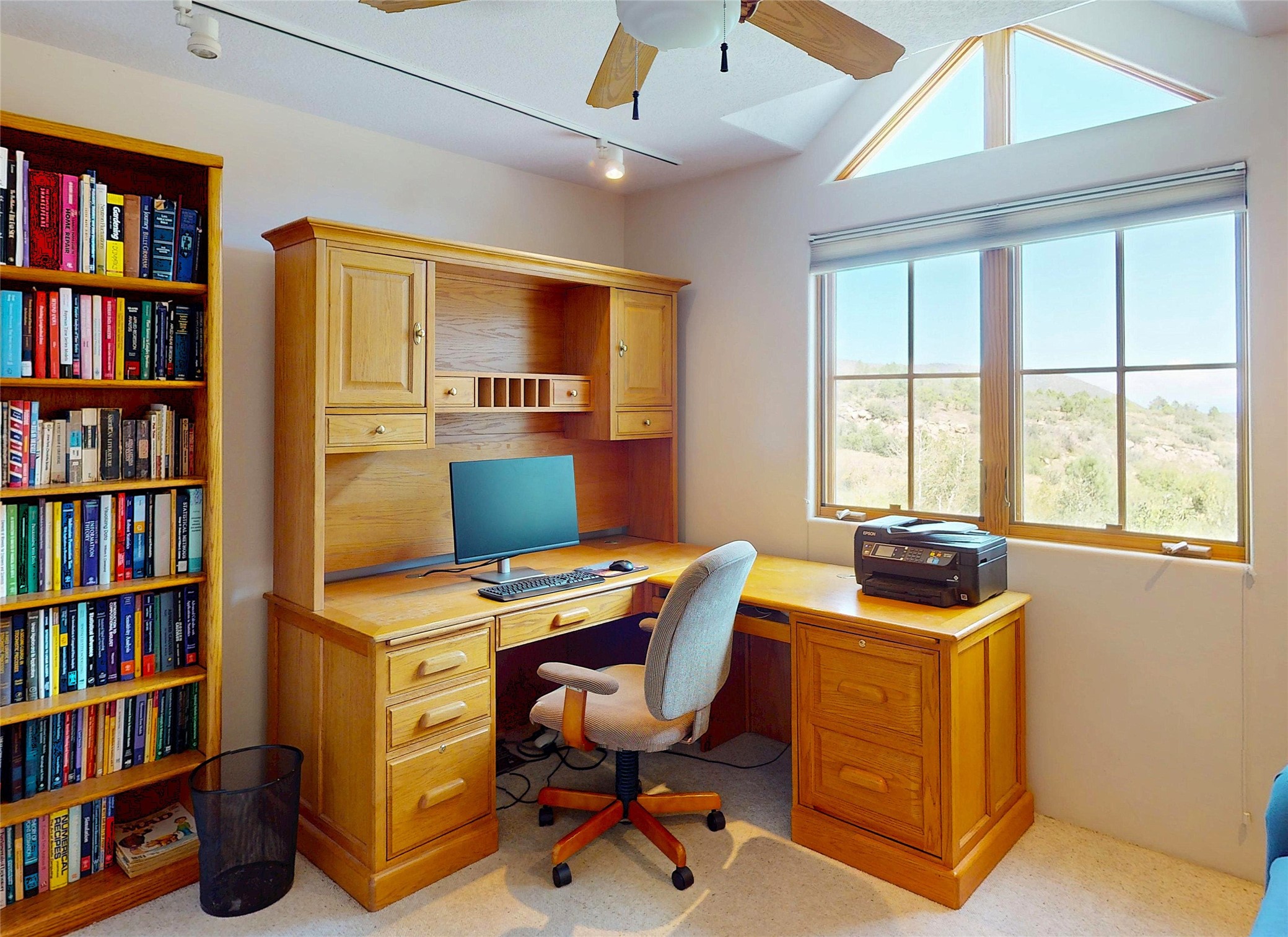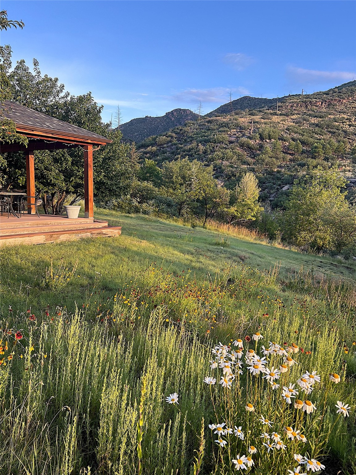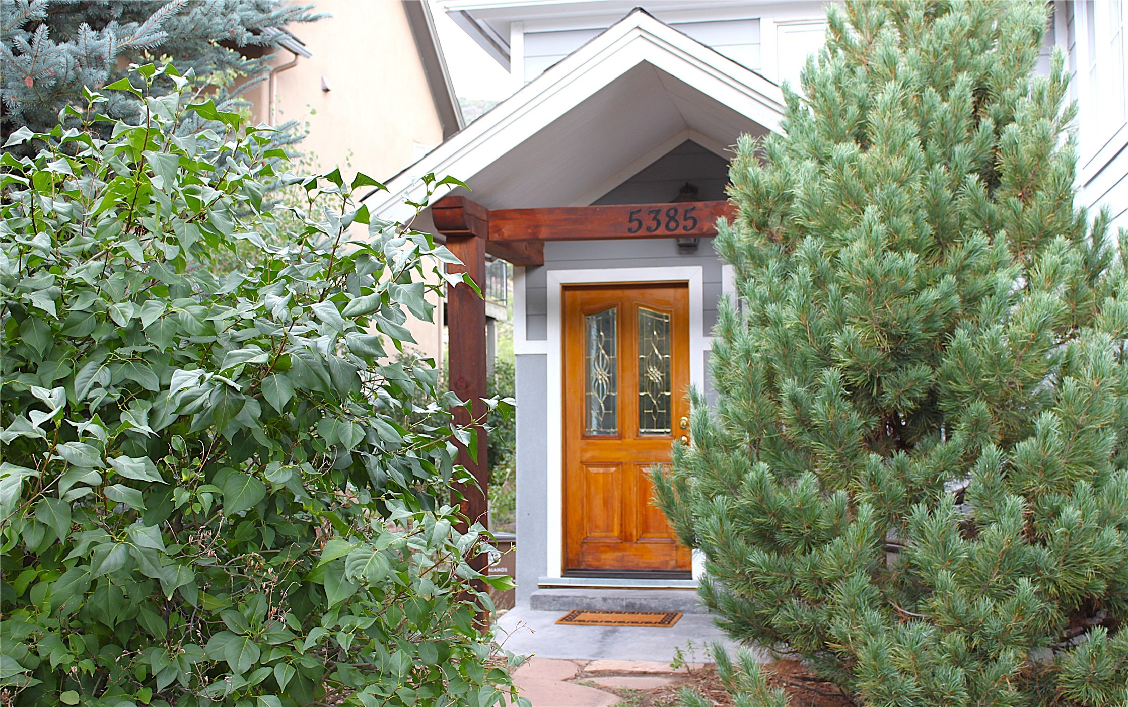 This stunning 4-bedroom, 2.5-bath Quemazon home backs to open space, offering privacy and direct access to the Perimeter Trail. The open floor plan flows seamlessly between the kitchen, dining, and living areas, with easy access to the covered Trex deck--perfect for enjoying mountain and forest views as well as the private backyard. The spacious primary suite includes a private study framed by French doors, dual walk-in closets, and a luxurious en-suite bath with dual sinks and a freestanding tub. Three additional bedrooms and a well-appointed hall bath complete the layout. A walk-out basement with additional living space and a crawl space for storage adds flexibility. Thoughtful details include architectural touches throughout the home, in-floor radiant heat with four zones, WindsorLite windows, six-panel wood doors, ceiling fans in every bedroom and the living room, track lighting, and Kohler fixtures. The kitchen is equipped with a Bosch dishwasher, gas stove/oven, and a newer refrigerator (2022). Major updates include roof replacement in 2009 with a lower-roof update in 2025, and a full stucco renovation in 2019. Outdoors, mature fruit trees--cherry, apple, pear, plum, apricot, nectarine, and peach--along with raspberries, drought-tolerant blue grama grass, and a private front yard with precision-cut stone walls, create a serene retreat. French drains along the west side provide peace of mind. This Quemazon gem blends comfort, thoughtful upgrades, and a premier setting with trails at your doorstep.