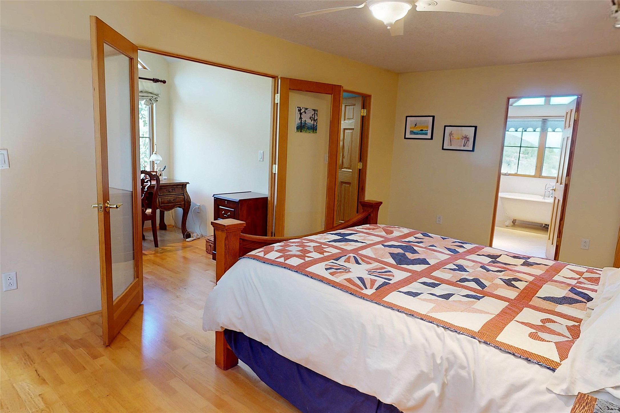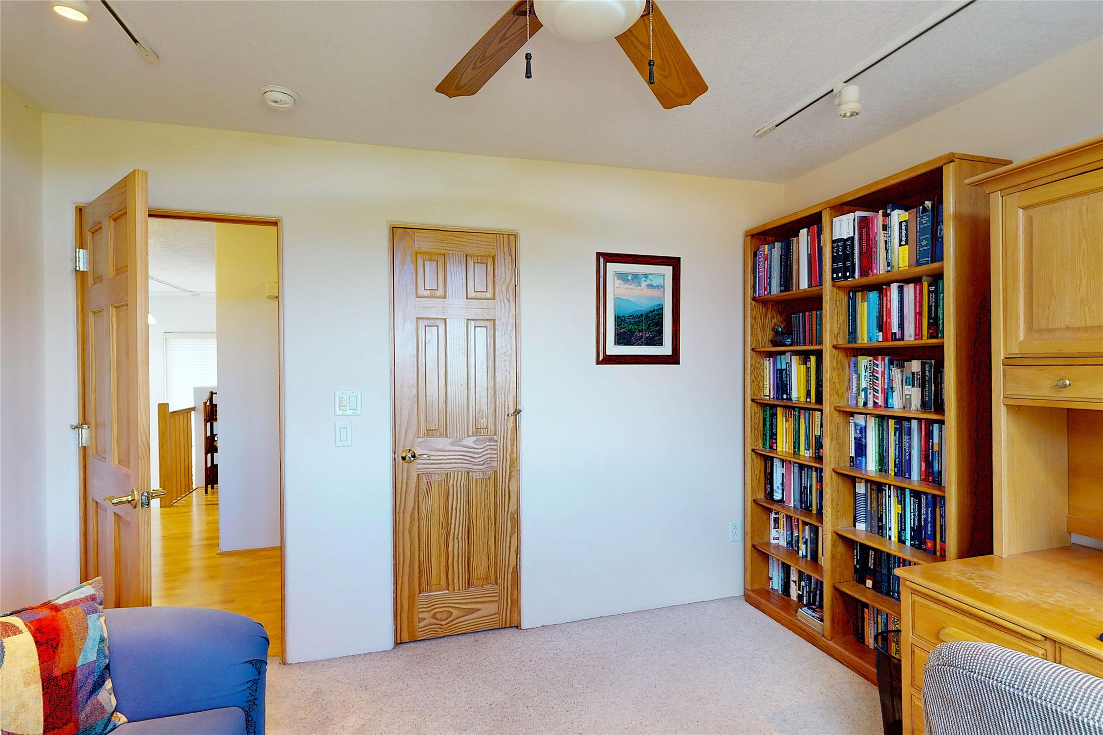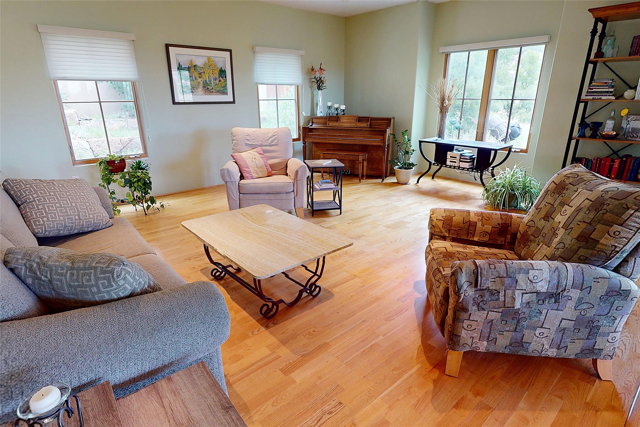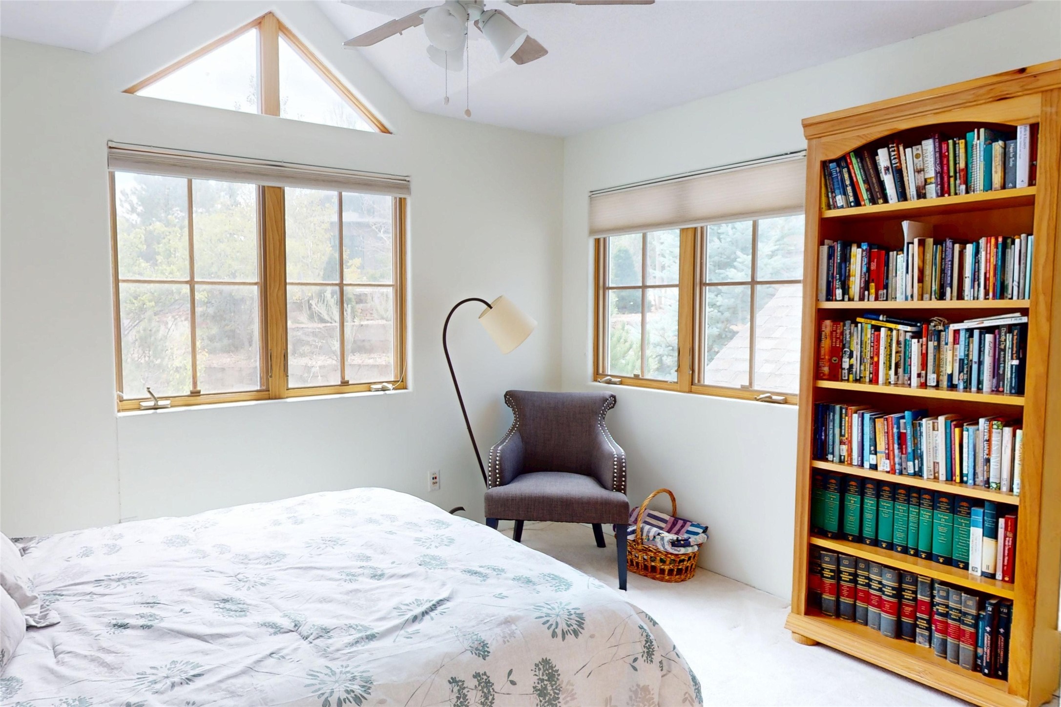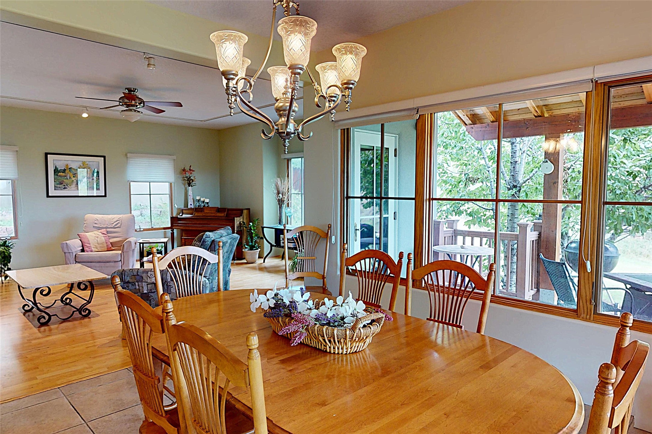 This stunning 4-bedroom, 2.5-bath Quemazon home backs to open space, offering privacy and direct access to the Perimeter Trail. The open floor plan flows seamlessly between the kitchen, dining, and living areas, with easy access to the covered Trex deck--perfect for enjoying mountain and forest views as well as the private backyard. The spacious primary suite includes a private study framed by French doors, dual walk-in closets, and a luxurious en-suite bath with dual sinks and a freestanding tub. Three additional bedrooms and a well-appointed hall bath complete the layout. A walk-out basement with additional living space and a crawl space for storage adds flexibility. Thoughtful details include architectural touches throughout the home, in-floor radiant heat with four zones, WindsorLite windows, six-panel wood doors, ceiling fans in every bedroom and the living room, track lighting, and Kohler fixtures. The kitchen is equipped with a Bosch dishwasher, gas stove/oven, and a newer refrigerator (2022). Major updates include roof replacement in 2009 with a lower-roof update in 2025, and a full stucco renovation in 2019. Outdoors, mature fruit trees--cherry, apple, pear, plum, apricot, nectarine, and peach--along with raspberries, drought-tolerant blue grama grass, and a private front yard with precision-cut stone walls, create a serene retreat. French drains along the west side provide peace of mind. This Quemazon gem blends comfort, thoughtful upgrades, and a premier setting with trails at your doorstep.