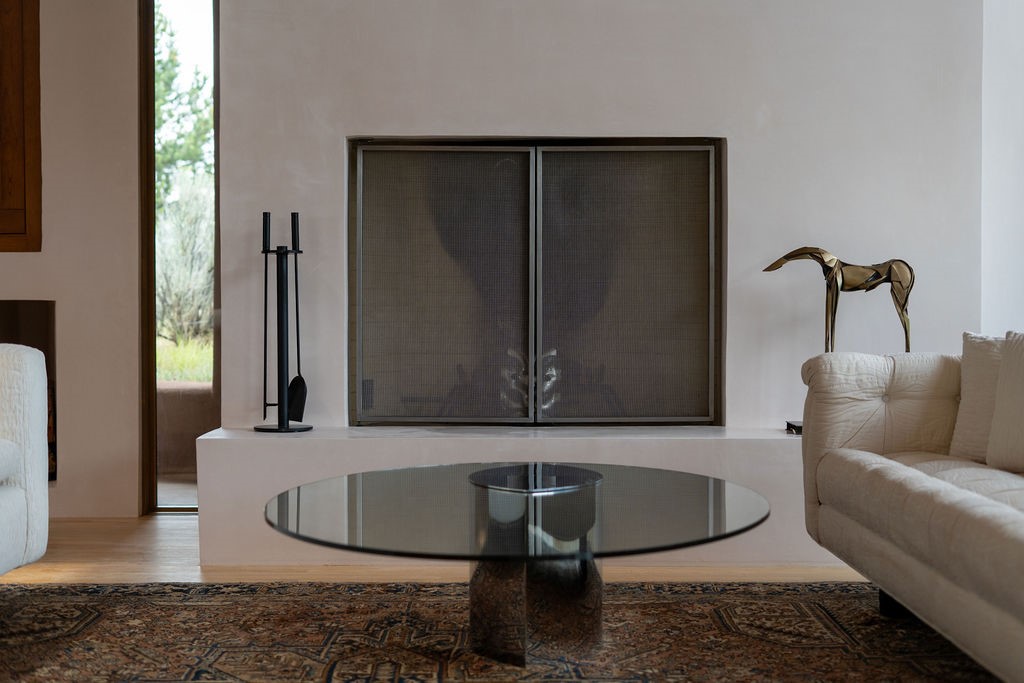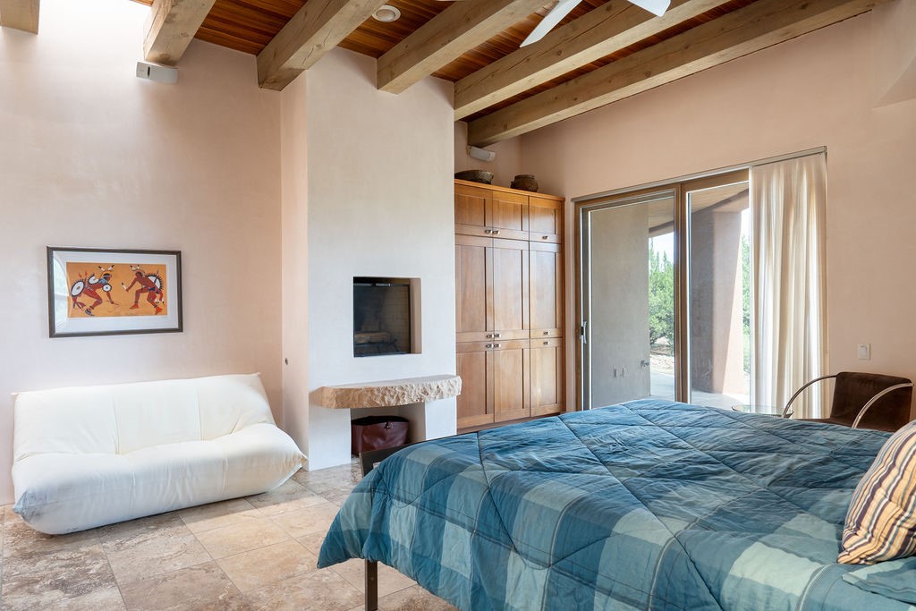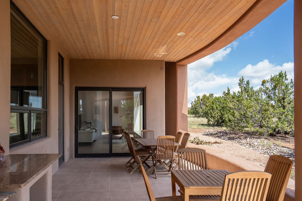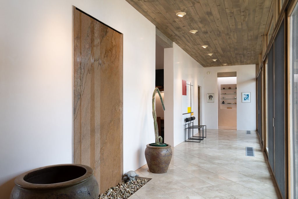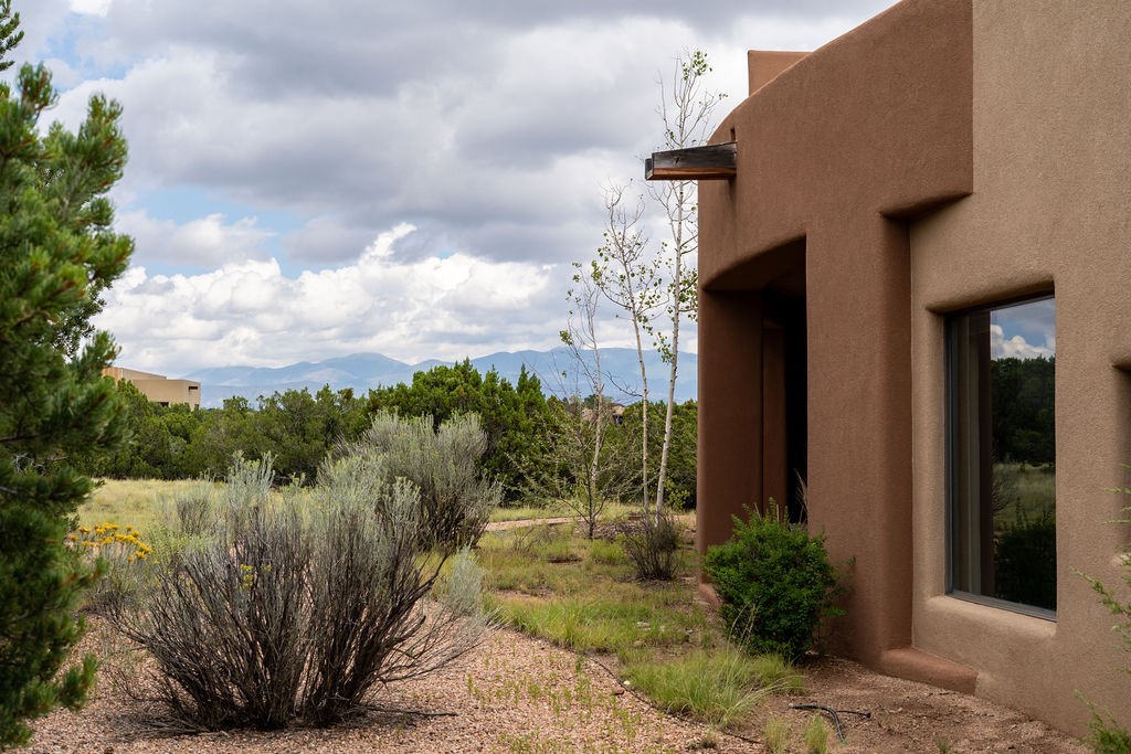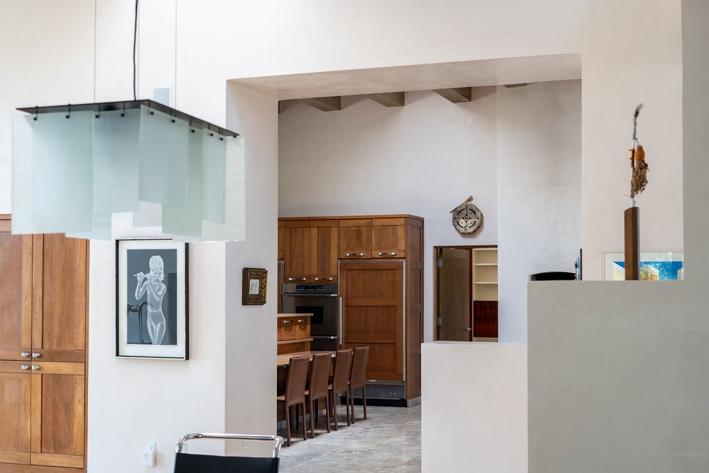 Step into this extraordinary Las Campanas residence where modern design and tranquility adjoin. Nestled on 2.3 acres, this 3-bedroom 3 bath home exemplifies sophistication and style. Upon entering, you are greeted by a dramatic gallery hall with luxurious stone water feature. The main room floods with natural light, highlighting an inviting open-concept floor plan. An expansive gourmet kitchen offers a well-designed central island and cozy sitting area, a footprint that is both spacious and comfortable. High-end appliances and design features throughout the home are accented by tall ceilings and clean lines. The primary bedroom features a fireplace, two expansive walk-in closets, and a luxury bathroom with dual vanities, soaking tub, and walk-in shower. The guest wing contains two spacious guest rooms, each with ensuite bath, providing exceptional comfort and privacy for visitors. Entertaining is effortless with a patio designed for outdoor dining and leisure, framed by courtyard walls with space to dine al fresco while taking in the tranquil surroundings. A spacious 3-car garage adds to the exceptional features of the home. Landscaping is in need of a refresh with an interior courtyard that offers tremendous potential. Seller's golf membership to the Club at Las Campanas is available to the purchaser of the property at an additional cost.
