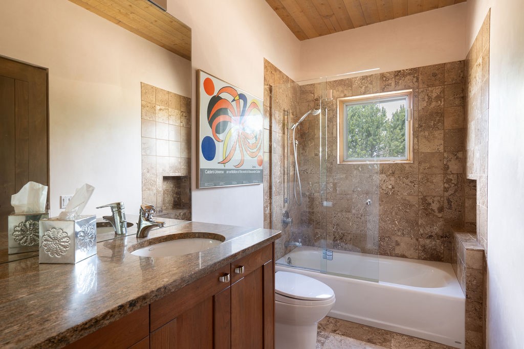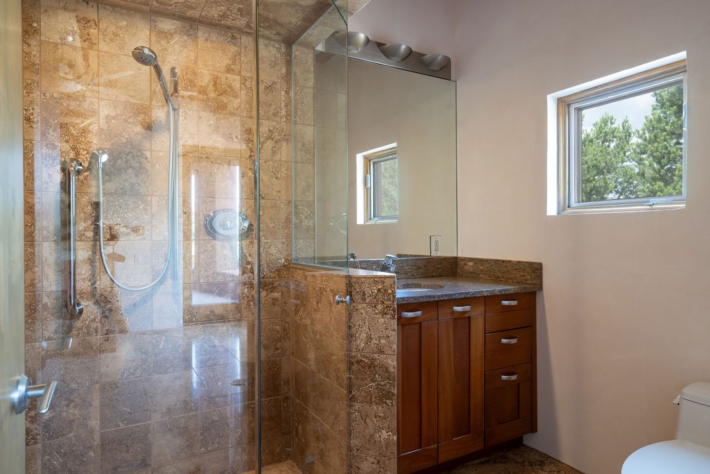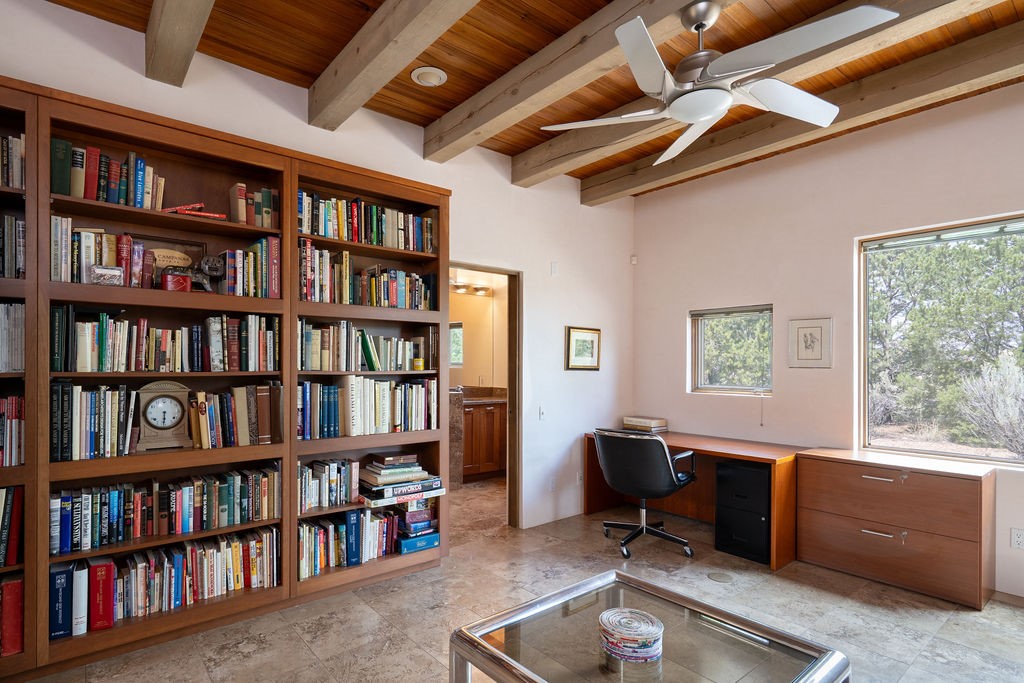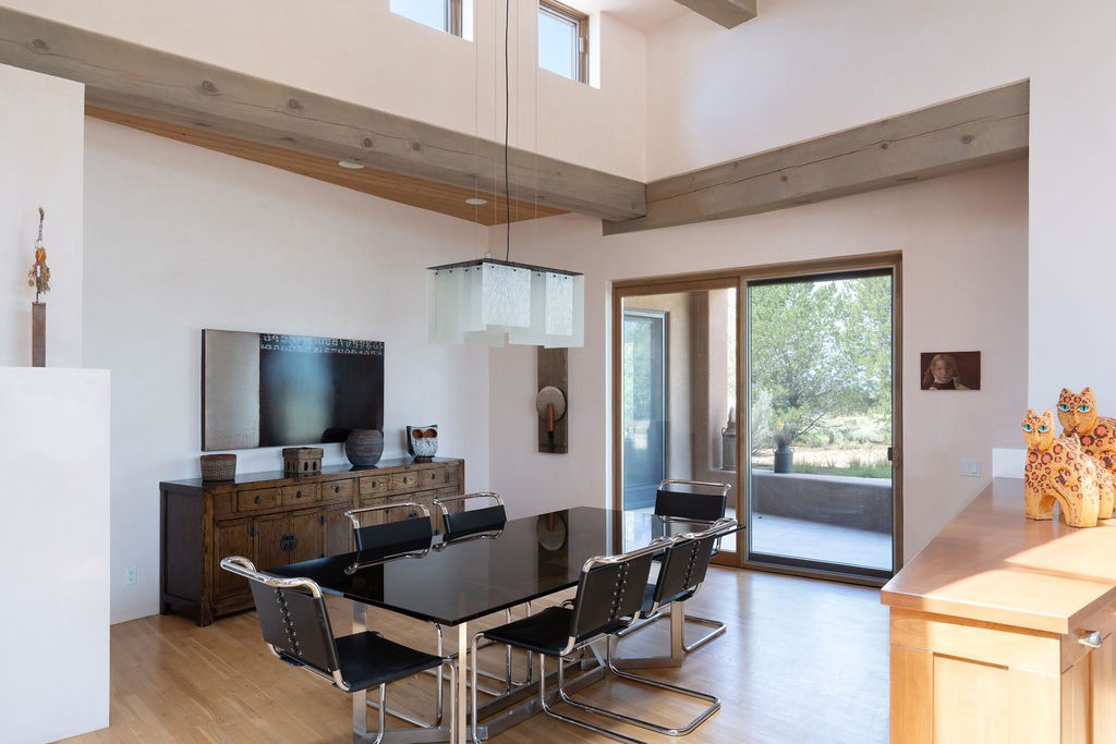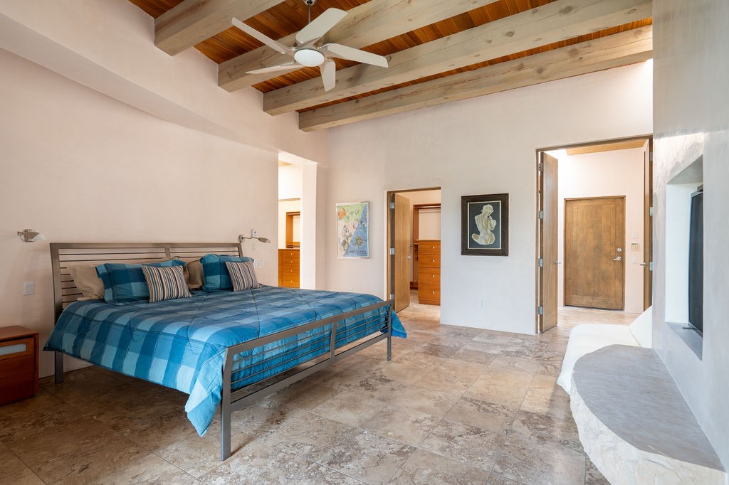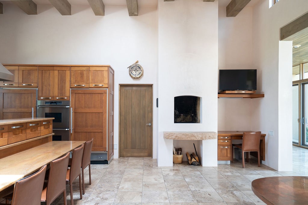 Step into this extraordinary Las Campanas residence where modern design and tranquility adjoin. Nestled on 2.3 acres, this 3-bedroom 3 bath home exemplifies sophistication and style. Upon entering, you are greeted by a dramatic gallery hall with luxurious stone water feature. The main room floods with natural light, highlighting an inviting open-concept floor plan. An expansive gourmet kitchen offers a well-designed central island and cozy sitting area, a footprint that is both spacious and comfortable. High-end appliances and design features throughout the home are accented by tall ceilings and clean lines. The primary bedroom features a fireplace, two expansive walk-in closets, and a luxury bathroom with dual vanities, soaking tub, and walk-in shower. The guest wing contains two spacious guest rooms, each with ensuite bath, providing exceptional comfort and privacy for visitors. Entertaining is effortless with a patio designed for outdoor dining and leisure, framed by courtyard walls with space to dine al fresco while taking in the tranquil surroundings. A spacious 3-car garage adds to the exceptional features of the home. Landscaping is in need of a refresh with an interior courtyard that offers tremendous potential. Seller's golf membership to the Club at Las Campanas is available to the purchaser of the property at an additional cost.
