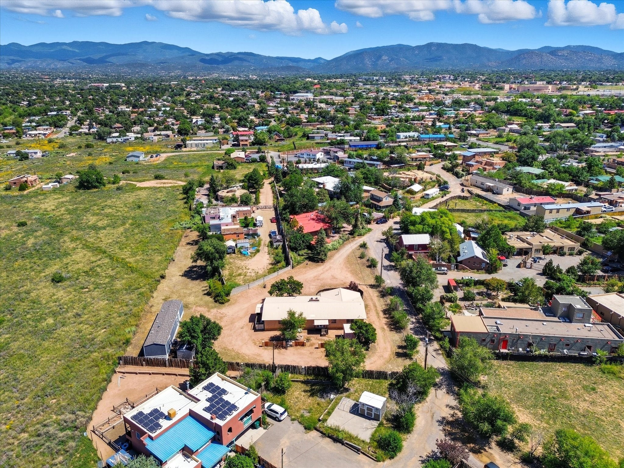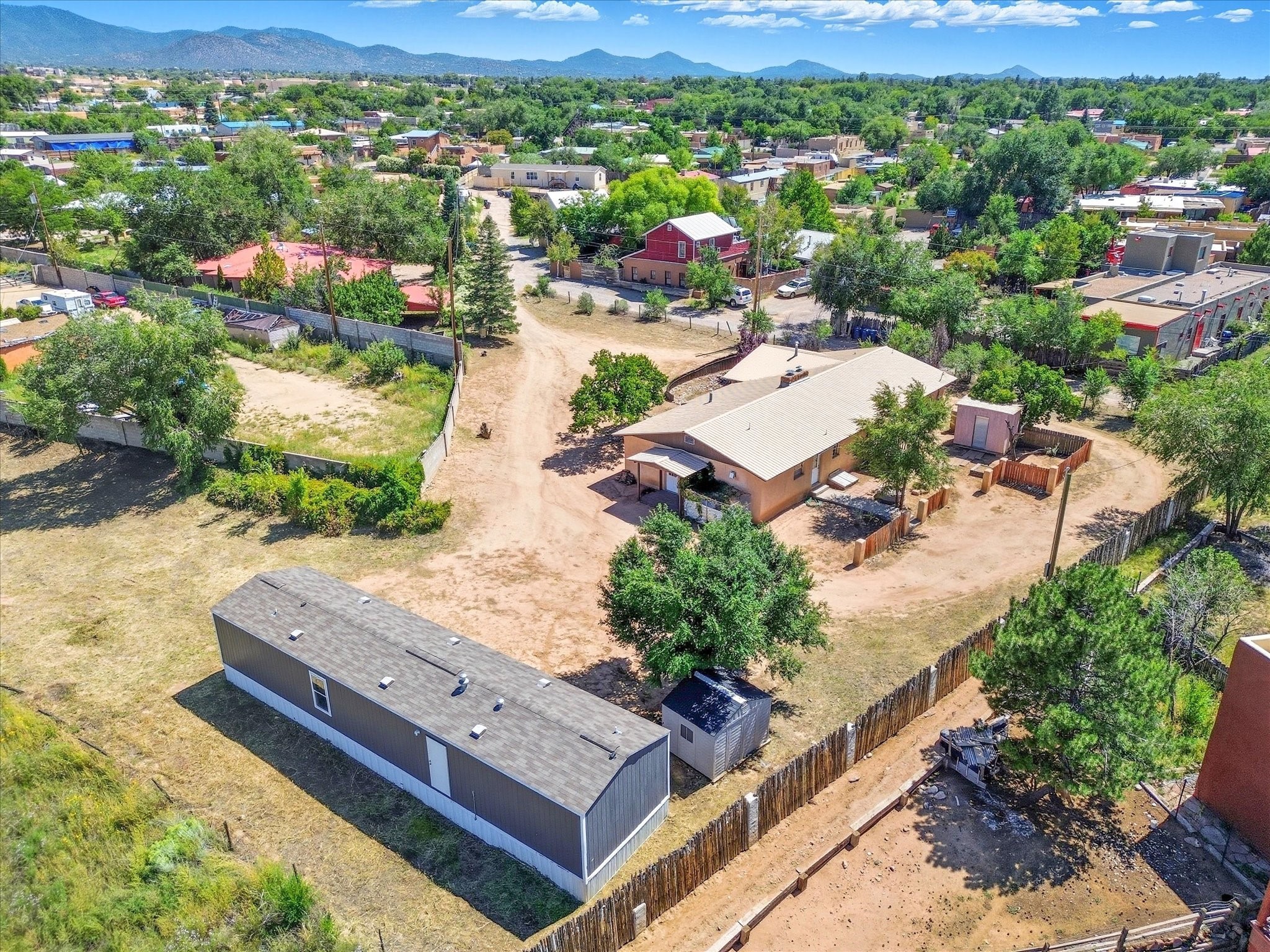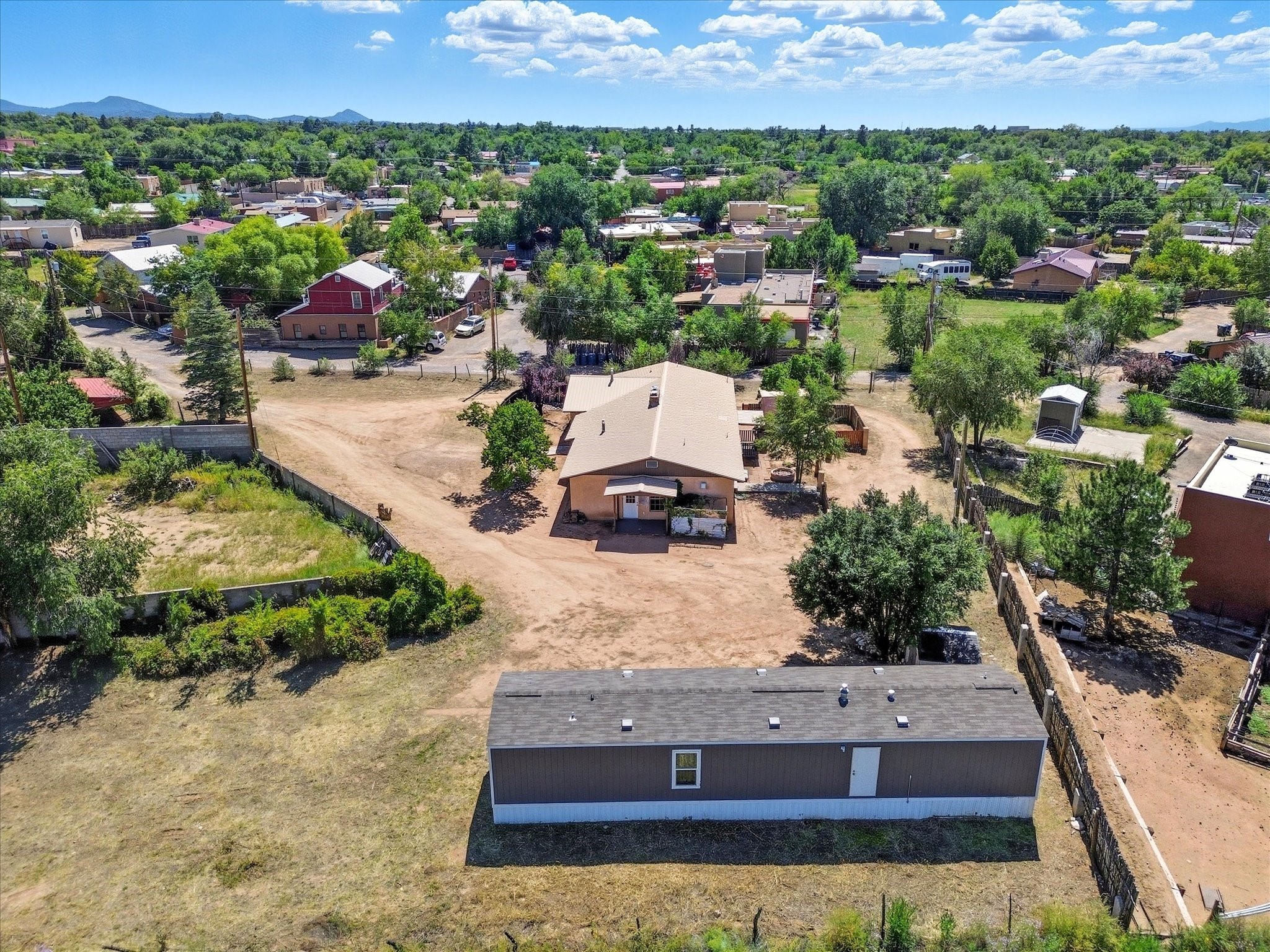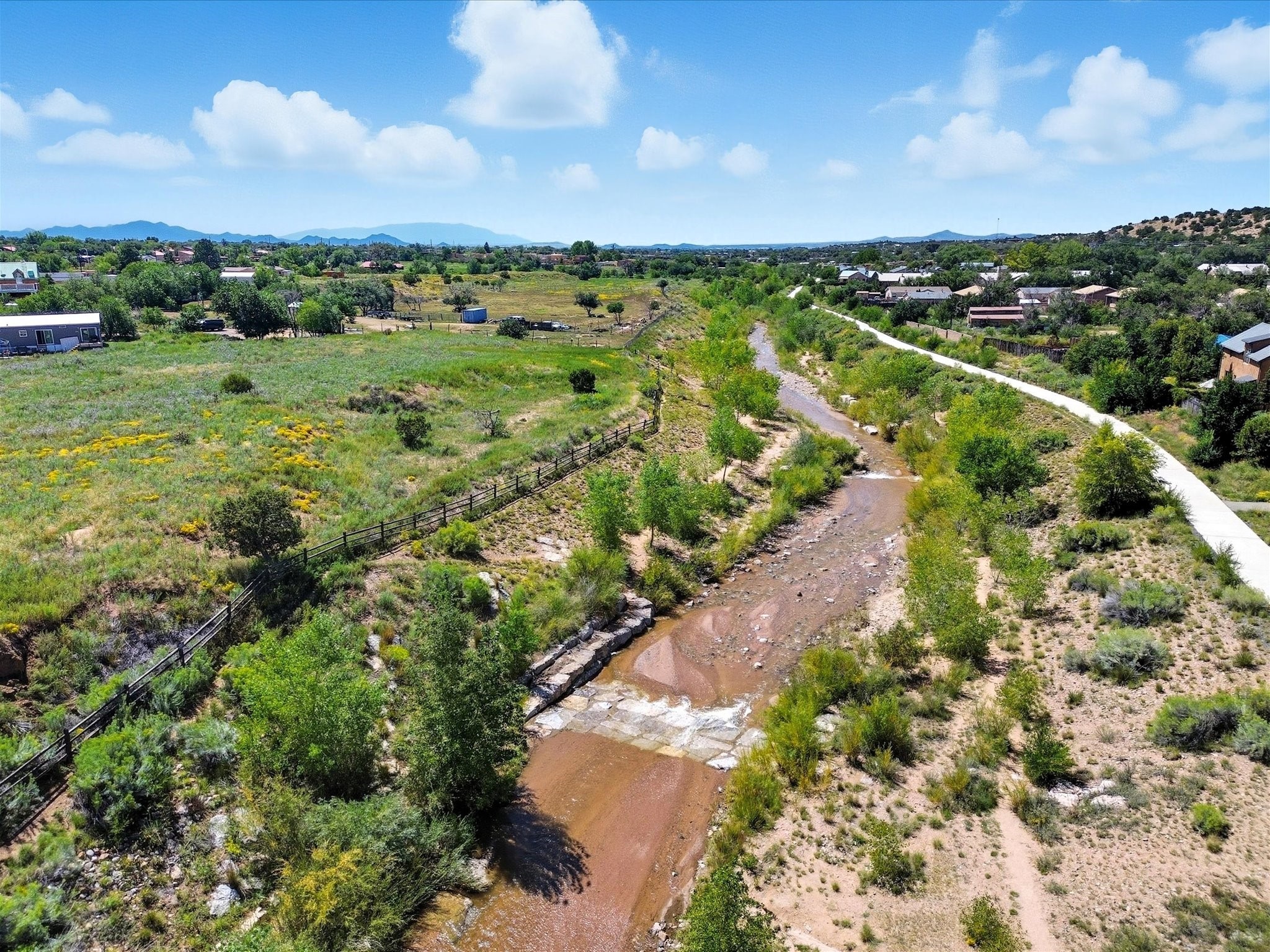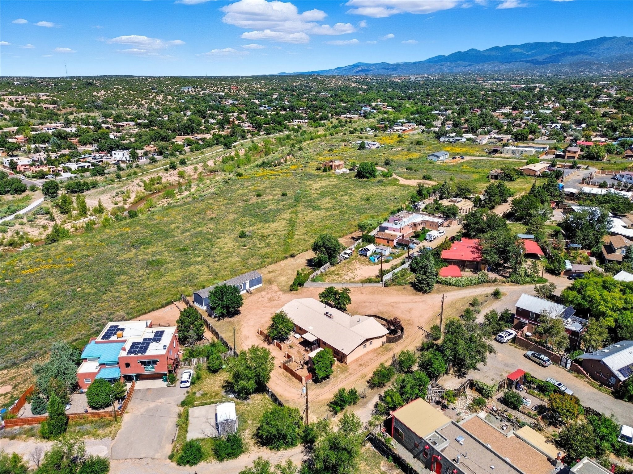 Exceptional opportunity on acre, backing to open land with the Santa Fe River just beyond. This unique property offers a main residence, a private studio apartment, and a manufactured home--ideal for guest quarters, multi-generational living, or income potential. The main house is adobe and has original hardwood floors throughout (under the carpet), a wood burning double-sided fireplace, four bedrooms and two bathrooms. The studio has a large living space, kitchen and full bathroom. The 2019 manufactured home includes two bedrooms, two bathrooms and refrigerated air. Enjoy privacy, space and mountain views, just 3 miles from the Santa Fe plaza and near trails, shopping, dining, parks, and schools.